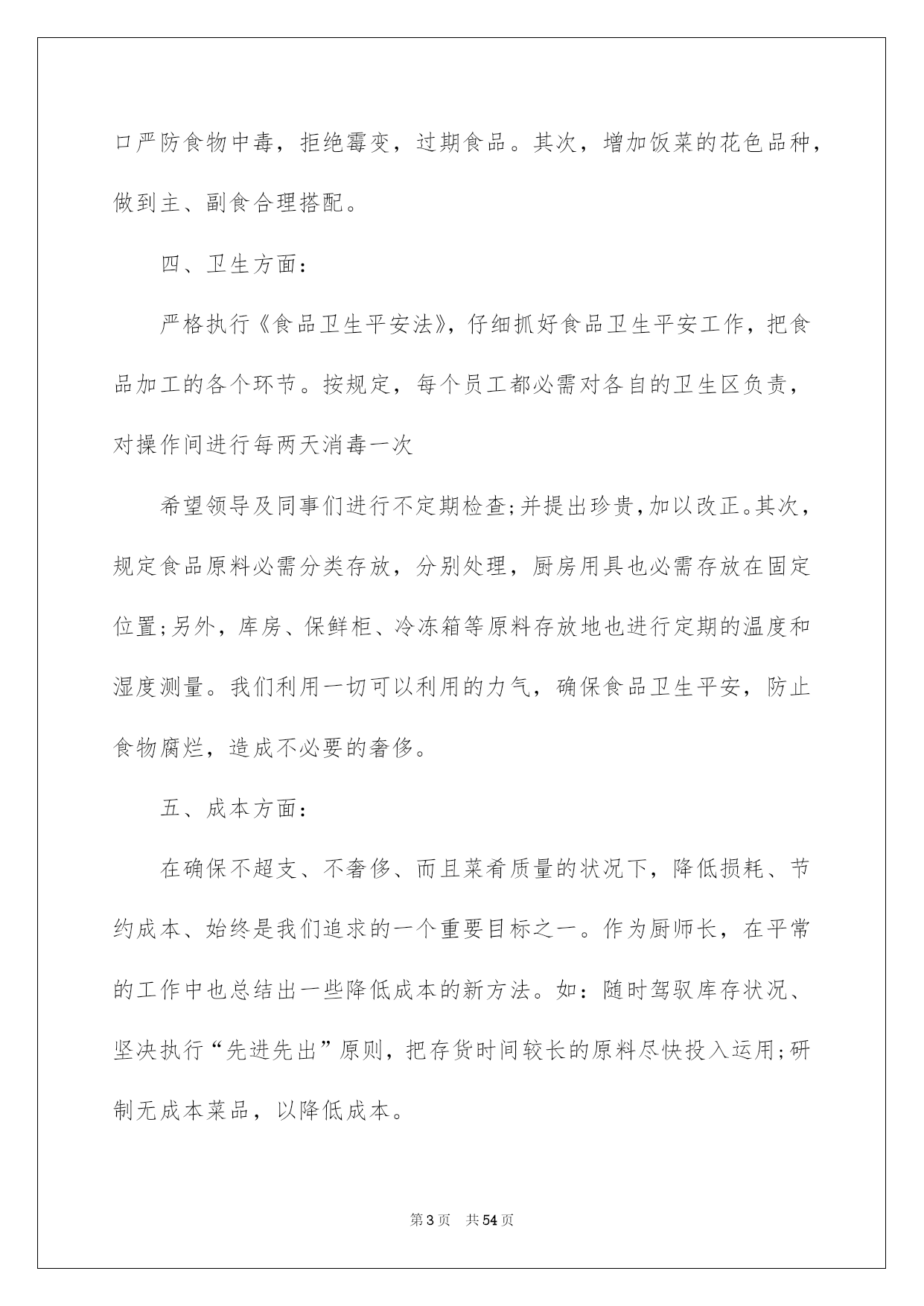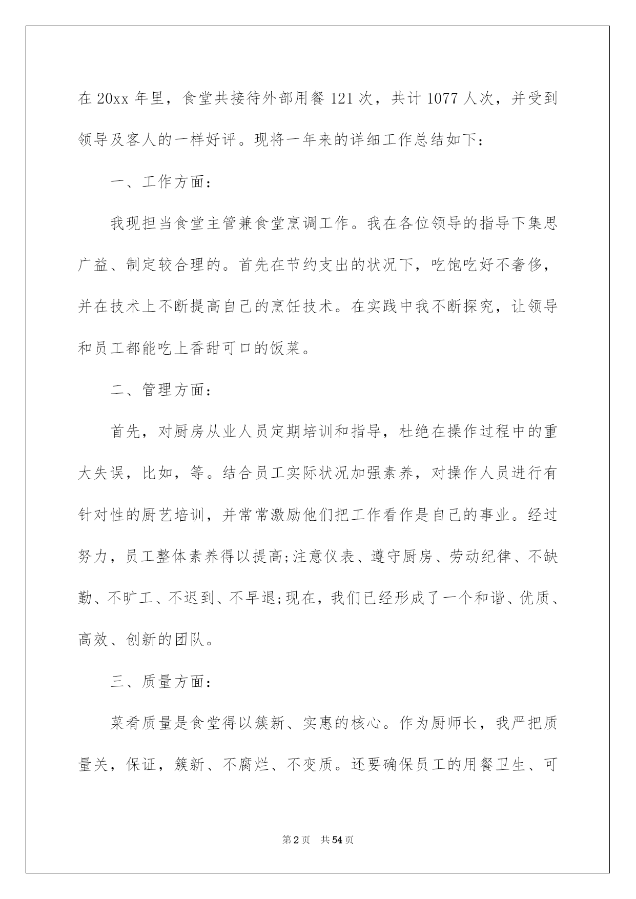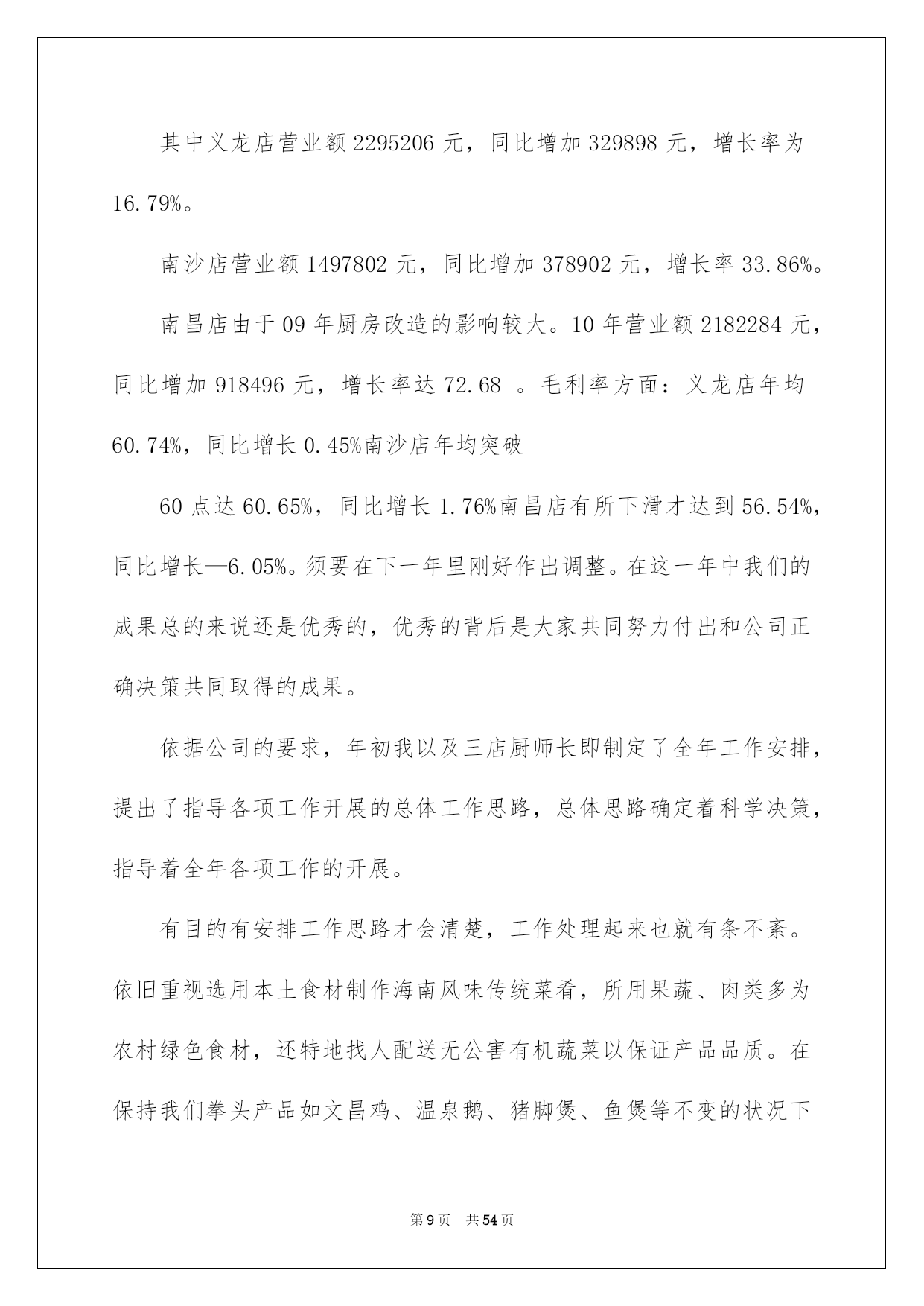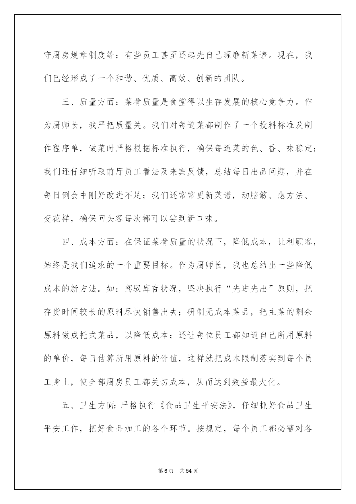 第PAGE\*Arabic\*MERGEFORMAT54页共NUMPAGES\*Arabic\*MERGEFORMAT54页第PAGE\*MERGEFORMAT54页共NUMPAGES\*MERGEFORMAT54页第PAGE\*MERGEFORMAT54页共NUMPAGES\*MERGEFORMAT54页第PAGE\*MERGEFORMAT54页共NUMPAGES\*MERGEFORMAT54页第PAGE\*MERGEFORMAT54页共NUMPAGES\*MERGEFORMAT54页第PAGE\*MERGEFORMAT54页共NUMPAGES\*MERGEFORMAT54页第PAGE\*MERGEFORMAT54页共NUMPAGES\*MERGEFORMAT54页第PAGE\*MERGEFORMAT54页共NUMPAGES\*MERGEFORMAT54页第PAGE\*MERGEFORMAT54页共NUMPAGES\*MERGEFORMAT54页第PAGE\*MERGEFORMAT54页共NUMPAGES\*MERGEFORMAT54页第PAGE\*MERGEFORMAT54页共NUMPAGES\*MERGEFORMAT54页2022厨师年终总结厨师年终总结总结是事后对某一阶段的学习或工作状况作加以回顾检查并分析评价的书面材料,它能够使头脑更加醒悟,目标更加明确,不如我们来制定一份总结吧。总结一般是怎么写的呢?下面是我为大家收集的厨师年终总结,供大家参考借鉴,希望可以帮助到有须要的挚友。厨师年终总结1光阴似箭,日月如梭转瞬间20xx即将接近尾声,立刻伴着的喜庆和的气息,20xx年的钟声即将敲响。首先,我预祝大家新年欢乐、工作顺当!回首20xx年,在各位领导的关怀指导下,在广阔同事的支持下,作为一名厨师长兼厨师,我始终坚持以身作则,高标准、严要求、团结和带领食堂员工,坚持以大局为重,听从组织支配,干一行爱一行,以自己的实际行动抓好食堂管理,保证工作正常动转,为领导和员工供应精致、可口的菜肴和优质的服务,我们还开垦出来好几亩地,蔬菜,牛,羊,鸡,鸭等。加饭菜的花色品种,做到主副食合理搭配,降低损耗,节约成本。暖和服务的理念,一心一意为地雅,紫金服务.在20xx年里,食堂共接待外部用餐121次,共计1077人次,并受到领导及客人的一样好评。现将一年来的详细工作总结如下:一、工作方面:我现担当食堂主管兼食堂烹调工作。我在各位领导的指导下集思广益、制定较合理的。首先在节约支出的状况下,吃饱吃好不奢侈,并在技术上不断提高自己的烹饪技术。在实践中我不断探究,让领导和员工都能吃上香甜可口的饭菜。二、管理方面:首先,对厨房从业人员定期培训和指导,杜绝在操作过程中的重大失误,比如,等。结合员工实际状况加强素养,对操作人员进行有针对性的厨艺培训,并常常激励他们把工作看作是自己的事业。经过努力,员工整体素养得以提高;注意仪表、遵守厨房、劳动纪律、不缺勤、不旷工、不迟到、不早退;现在,我们已经形成了一个和谐、优质、高效、创新的团队。三、质量方面:菜肴质量是食堂得以簇新、实惠的核心。作为厨师长,我严把质量关,保证,簇新、不腐烂、不变质。还要确保员工的用餐卫生、可口严防食物中毒,拒绝霉变,过期食品。其次,增加饭菜的花色品种,做到主、副食合理搭配。四、卫生方面:严格执行《食品卫生平安法》,仔细抓好食品卫生平安工作,把食品加工的各个环节。按规定,每个员工都必需对各自的卫生区负责,对操作间进行每两天消毒一次希望领导及同事们进行不定期检查;并提出珍贵,加以改正。其次,规定食品原料必需分类存放,分别处理,厨房用具也必需存放在固定位置;另外,库房、保鲜柜、冷冻箱等原料存放地也进行定期的温度和湿度测量。我们利用一切可以利用的力气,确保食品卫生平安,防止食物腐烂,造成不必要的奢侈。五、成本方面:在确保不超支、不奢侈、而且菜肴质量的状况下,降低损耗、节约成本、始终是我们追求的一个重要目标之一。作为厨师长,在平常的工作中也总结出一些降低成本的新方法。如:随时驾驭库存状况、坚决执行“先进先出”原则,把存货时间较长的原料尽快投入运用;研制无成本菜品,以降低成本。综上所述,在本年度,通过团队的共同努力,我们在厨房管理方面取得了显著成效;在菜品创新、菜肴质量、成本限制、员工素养提高等方面都取得相当高的成果。当然,我们还存在不足。请领导和同事监督指正,我也深感我肩负工作的挑战性与创新性。经过一年多的努力,在原有的工作基础上,严格要求自己和帮厨人员,在以后的工作中找出不足,保留好的传统。今后,我肯定会带领我们的团队不断努力,接受挑