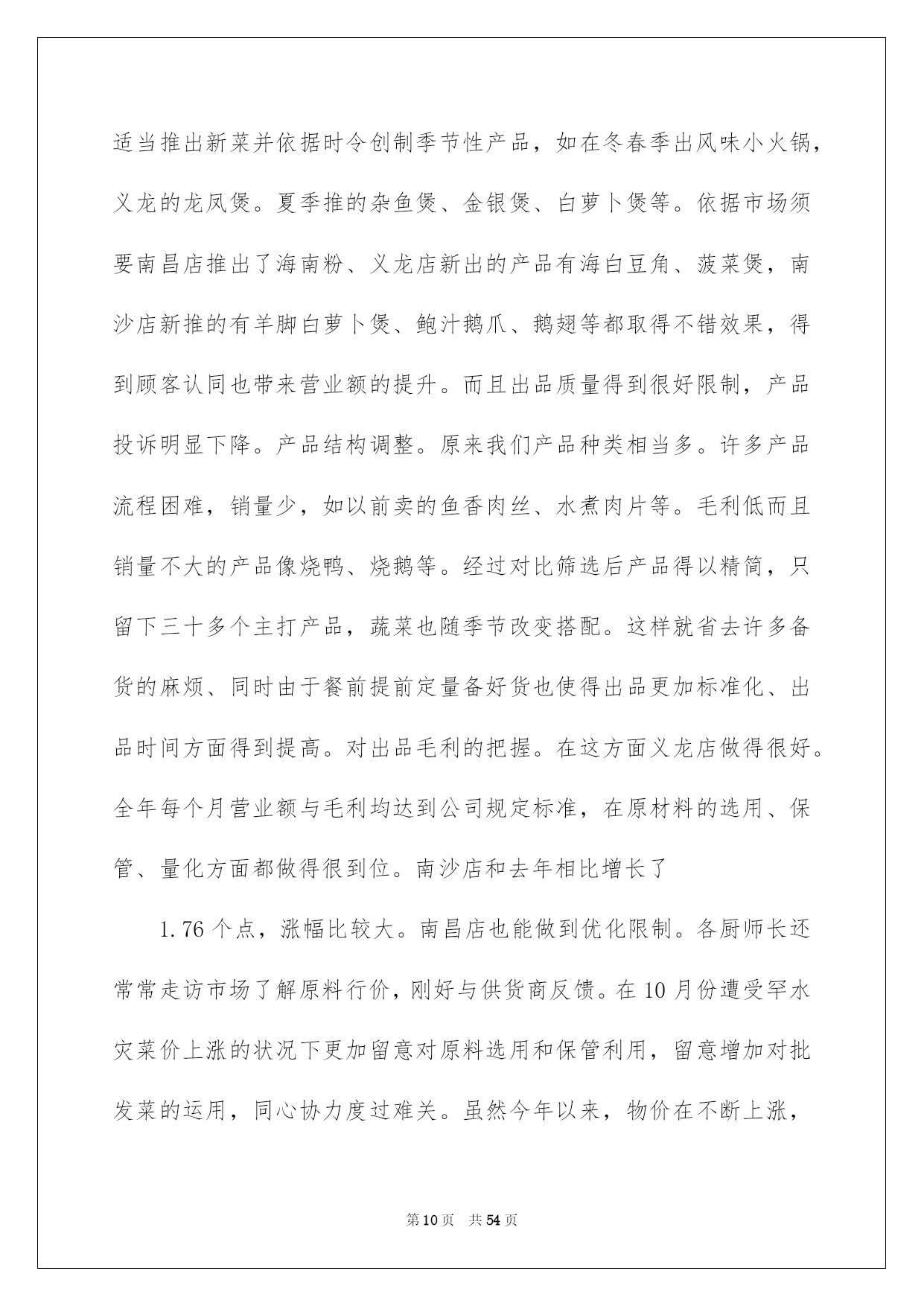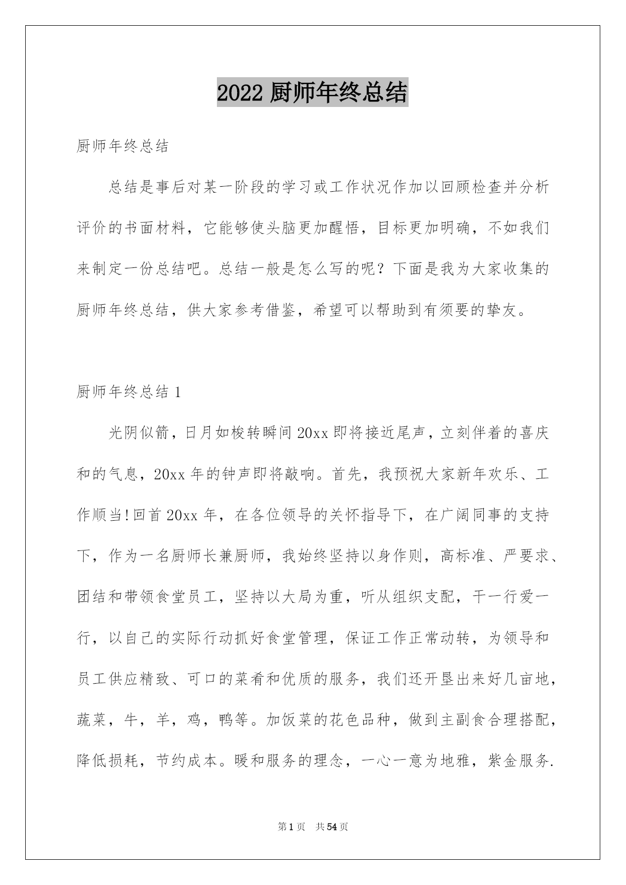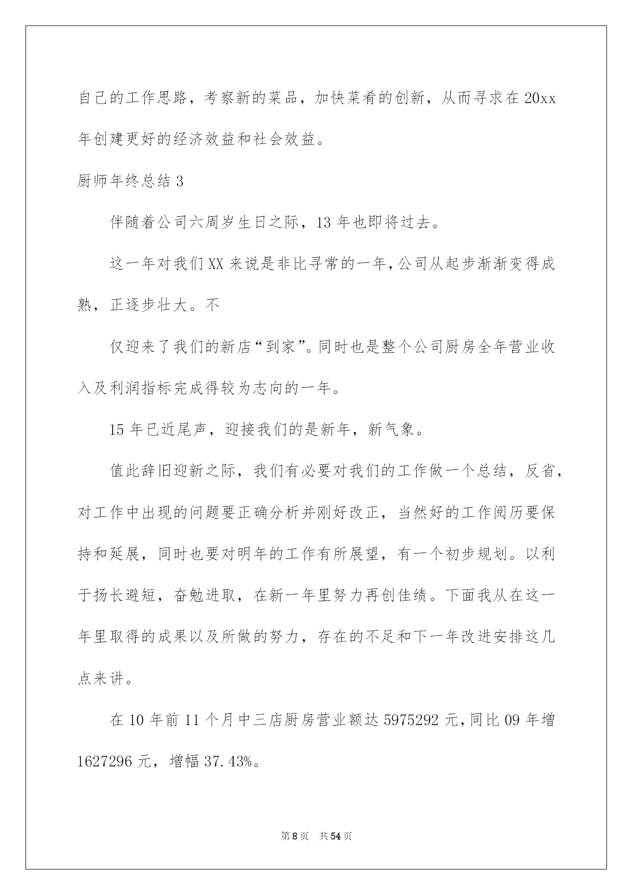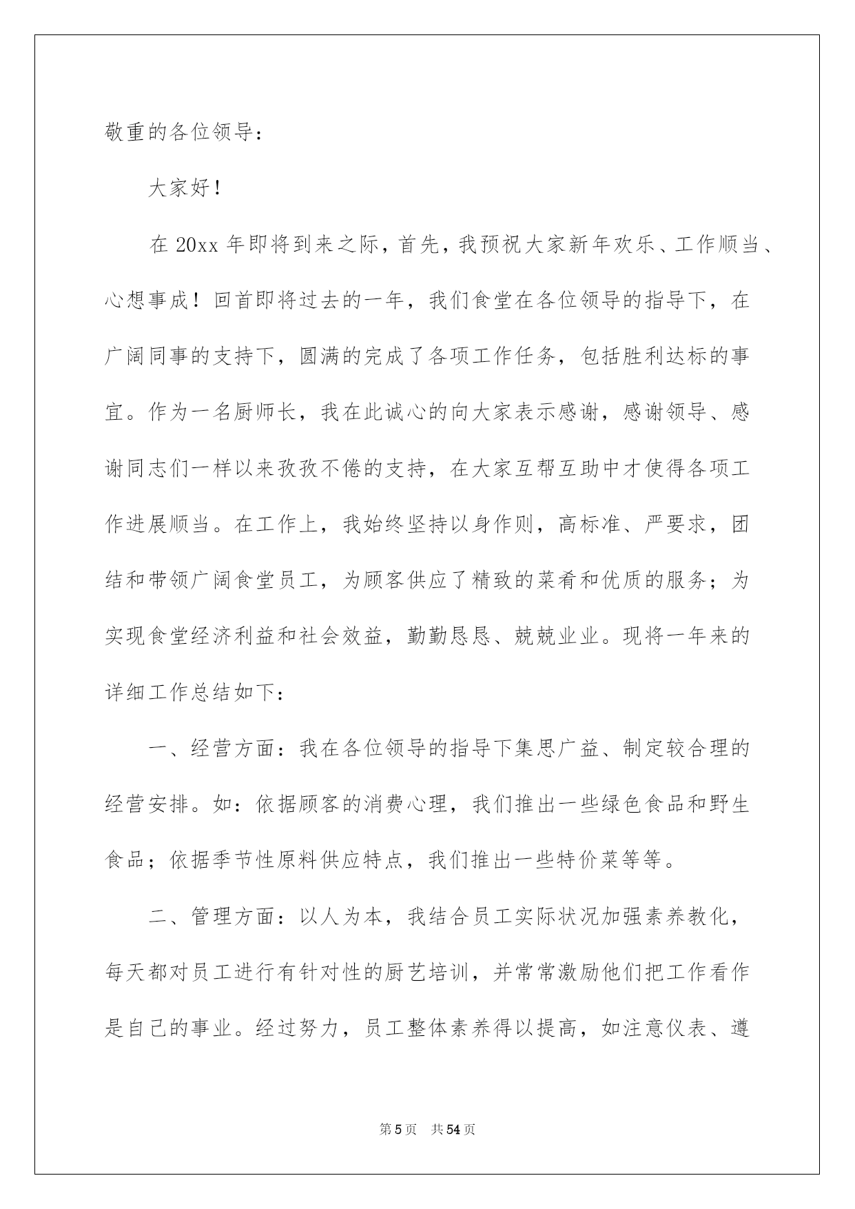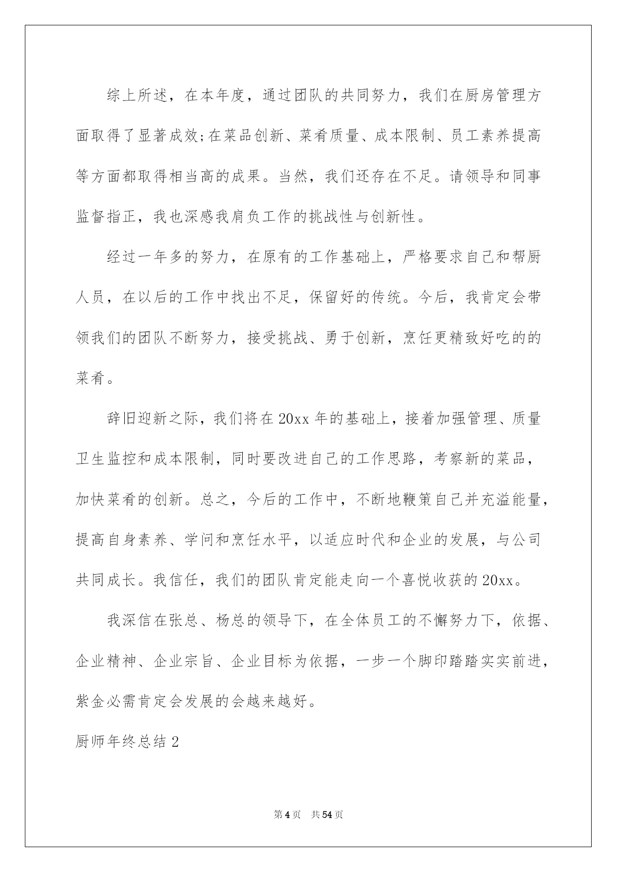 第PAGE\*Arabic\*MERGEFORMAT54页共NUMPAGES\*Arabic\*MERGEFORMAT54页第PAGE\*MERGEFORMAT54页共NUMPAGES\*MERGEFORMAT54页第PAGE\*MERGEFORMAT54页共NUMPAGES\*MERGEFORMAT54页第PAGE\*MERGEFORMAT54页共NUMPAGES\*MERGEFORMAT54页第PAGE\*MERGEFORMAT54页共NUMPAGES\*MERGEFORMAT54页第PAGE\*MERGEFORMAT54页共NUMPAGES\*MERGEFORMAT54页第PAGE\*MERGEFORMAT54页共NUMPAGES\*MERGEFORMAT54页第PAGE\*MERGEFORMAT54页共NUMPAGES\*MERGEFORMAT54页第PAGE\*MERGEFORMAT54页共NUMPAGES\*MERGEFORMAT54页第PAGE\*MERGEFORMAT54页共NUMPAGES\*MERGEFORMAT54页第PAGE\*MERGEFORMAT54页共NUMPAGES\*MERGEFORMAT54页2022厨师年终总结厨师年终总结总结是事后对某一阶段的学习或工作状况作加以回顾检查并分析评价的书面材料,它能够使头脑更加醒悟,目标更加明确,不如我们来制定一份总结吧。总结一般是怎么写的呢?下面是我为大家收集的厨师年终总结,供大家参考借鉴,希望可以帮助到有须要的挚友。厨师年终总结1光阴似箭,日月如梭转瞬间20xx即将接近尾声,立刻伴着的喜庆和的气息,20xx年的钟声即将敲响。首先,我预祝大家新年欢乐、工作顺当!回首20xx年,在各位领导的关怀指导下,在广阔同事的支持下,作为一名厨师长兼厨师,我始终坚持以身作则,高标准、严要求、团结和带领食堂员工,坚持以大局为重,听从组织支配,干一行爱一行,以自己的实际行动抓好食堂管理,保证工作正常动转,为领导和员工供应精致、可口的菜肴和优质的服务,我们还开垦出来好几亩地,蔬菜,牛,羊,鸡,鸭等。加饭菜的花色品种,做到主副食合理搭配,降低损耗,节约成本。暖和服务的理念,一心一意为地雅,紫金服务.在20xx年里,食堂共接待外部用餐121次,共计1077人次,并受到领导及客人的一样好评。现将一年来的详细工作总结如下:一、工作方面:我现担当食堂主管兼食堂烹调工作。我在各位领导的指导下集思广益、制定较合理的。首先在节约支出的状况下,吃饱吃好不奢侈,并在技术上不断提高自己的烹饪技术。在实践中我不断探究,让领导和员工都能吃上香甜可口的饭菜。二、管理方面:首先,对厨房从业人员定期培训和指导,杜绝在操作过程中的重大失误,比如,等。结合员工实际状况加强素养,对操作人员进行有针对性的厨艺培训,并常常激励他们把工作看作是自己的事业。经过努力,员工整体素养得以提高;注意仪表、遵守厨房、劳动纪律、不缺勤、不旷工、不迟到、不早退;现在,我们已经形成了一个和谐、优质、高效、创新的团队。三、质量方面:菜肴质量是食堂得以簇新、实惠的核心。作为厨师长,我严把质量关,保证,簇新、不腐烂、不变质。还要确保员工的用餐卫生、可口严防食物中毒,拒绝霉变,过期食品。其次,增加饭菜的花色品种,做到主、副食合理搭配。四、卫生方面:严格执行《食品卫生平安法》,仔细抓好食品卫生平安工作,把食品加工的各个环节。按规定,每个员工都必需对各自的卫生区负责,对操作间进行每两天消毒一次希望领导及同事们进行不定期检查;并提出珍贵,加以改正。其次,规定食品原料必需分类存放,分别处理,厨房用具也必需存放在固定位置;另外,库房、保鲜柜、冷冻箱等原料存放地也进行定期的温度和湿度测量。我们利用一切可以利用的力气,确保食品卫生平安,防止食物腐烂,造成不必要的奢侈。五、成本方面:在确保不超支、不奢侈、而且菜肴质量的状况下,降低损耗、节约成本、始终是我们追求的一个重要目标之一。作为厨师长,在平常的工作中也总结出一些降低成本的新方法。如:随时驾驭库存状况、坚决执行“先进先出”原则,把存货时间较长的原料尽快投入运用;研制无成本菜品,以降低成本。综上所述,在本年度,通过团队的共同努力,我们在厨房管理方面取得了显著成效;在菜品创新、菜肴质量、成本限制、员工素养提高等方面都取得相当高的成果。当然,我们还存在不足。请领导和同事监督指正,我也深感我肩负工作的挑战性与创新性。经过一年多的努力,在原有的工作基础上,严格要求自己和帮厨人员,在以后的工作中找出不足,保留好的传统。今后,我肯定会带领我们的团队不断努力,接受挑