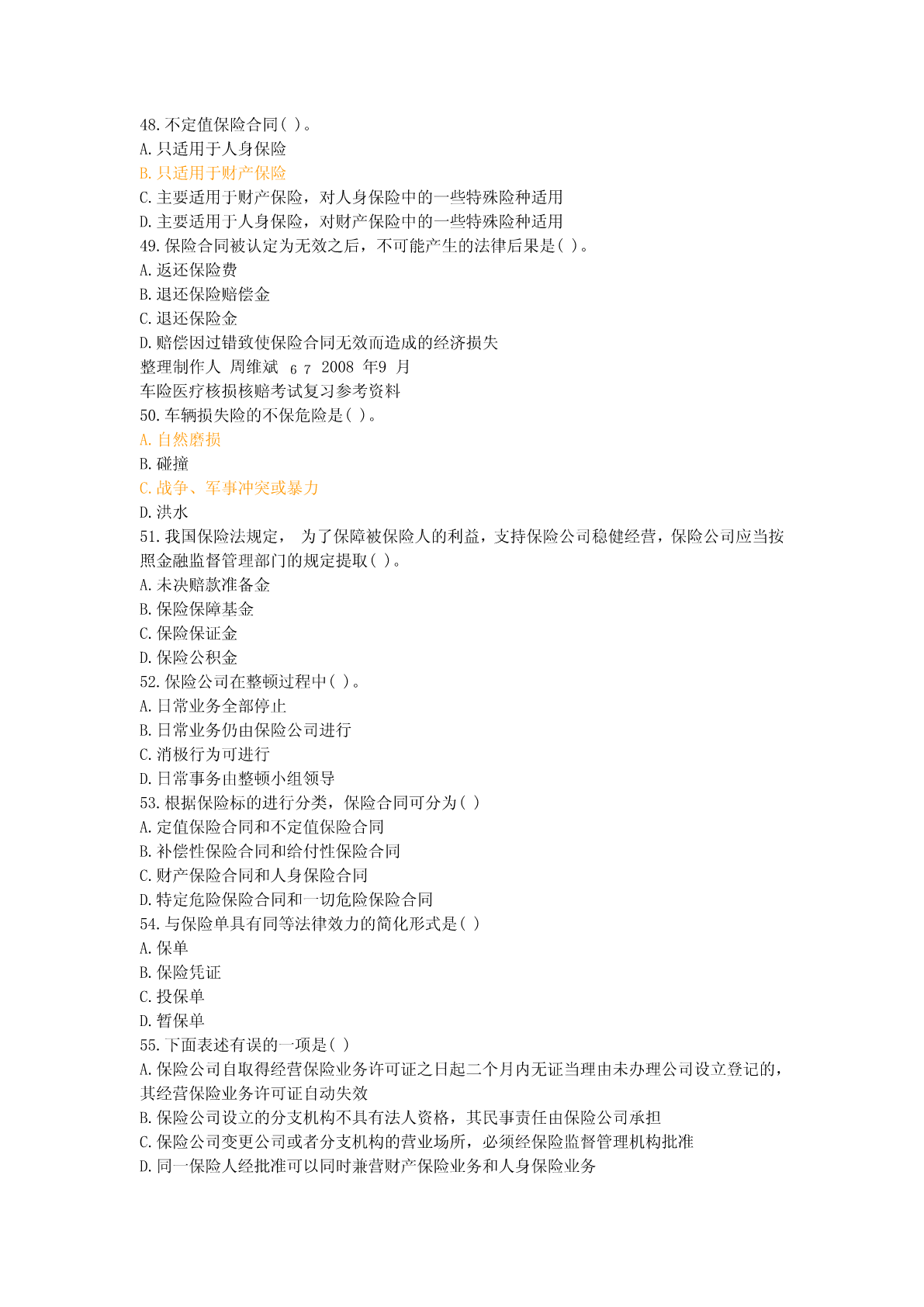 第二部分保险法及保险学原理试题一、单项选择题:1.下列保险属于强制保险的是()A.房屋按揭时的房屋保险B.机动车辆第三者责任险C.学生团体意外伤害保险D.保险公司将自己承保的财产保险中的百分之二十向其他保险公司办理再保险2.甲向乙保险公司投保机动车辆保险,保险金额100万元,乙保险公司向丙保险公司办理20万元的再保险。下列说法正确的是()A.发生保险事故后甲可以向丙索赔其应当承担的部分B.再保险的标的是责任C.再保险的被保险人是甲D.再保险的保险金额是80万元3.下列哪些人员属于机动车辆保险第三者责任险中的第三者?()A.被保险人的家庭成员B.本车上的乘客C.驾驶员D.行人4.保险合同成立的时间为()A.投保人交付保险费的时间B.保险人同意承保的时间C.双方约定的时间D.保险责任开始的时间5.下列不可以成为机动车辆保险的投保人是()A.所有权人B.承租人C.经营管理人D.无偿保管车辆的人6.投保人最基本的义务是()A.交付保险费B.危险通知C.出险通知D.出险施救7.保险金额超过保险价值的为()A.不足额保险合同B.足额保险合同C.超额保险合同D.无效保险合同8.下列主体中可以直接指定受益人而无须征得他人同意的是()A.投保人整理制作人周维斌612008年9月车险医疗核损核赔考试复习参考资料B.被保险人C.保险人D.保险经纪人9.光大实业公司系中美合资经营企业,该企业的财产保险应当()A.向中国境内的保险公司投保B.既可向中国境内的保险公司投保,也可向外国保险公司投保,由企业自主决定C.在同等条件下,应当优先在中国境内的保险公司投保D.由该企业的主管机关决定向境内或境外的保险公司投保10.保险合同成立后,除法律或保险合同另有规定外,不得解除保险合同的主体是()A.投保人B.被保险人C.受益人D.保险人11.当保险标的发生部分损失时,下列说法不正确的是()A.投保人可以终止合同B.保险人可以终止合同C.保险人终止合同的,应提前30天通知设保人D.保险人终止合同的,应将保险标的未受损部分的保险费,扣除自保险责任开始之日起至终止合同之日止期间的应收部分后,退还投保人12.保险合同中规定有关保险人责任免除条款的,保险人在订立保险合同时应当向投保人明确说明,未明确说明的()A.该条款未经法院确认不产生效力B.该条款不产生效力C.该条款未经投保人确认不产生效力D.依保险法规定确认该条款的效力13.下面是对有关财产保险合同中重复保险的表述,不正确的是()A.重复保险就是指投保人对同一保险标的、同一保险利益分别向两个以上保险人订立保险合同的保险B.重复保险的保险金额总和超过保险价值的,各保险人的赔偿金额的总和不得超过保险价值C.除合同另有约定外,重复保险的各个保险人应当按照其保险金额与保险标的的保险价值的比例承担赔偿责任D.重复保险的投保人应当将重复保险的有关情况通知各保险人14.某保险公司依法破产,其破产财产支付下列费用:(1)所欠税款;(2)清偿公司债务;(3)破产费用;(4)所欠职工工资和社会保险费用;(5)赔偿或给付保险金。其清偿顺序为()A.(1)(2)(3)(4)(5)B.(3)(4)(5)(1)(2)C.(3)(4)(5)(2)(1)D.(3)(1)(4)(5)(2)15.根据保险法的规定,下列各项说法中不正确的一项是()A.除人寿保险业务外,保险公司经营其他保险业务,应当从当年自留保险费中提取未到期责任准备金,提取和结转的数额,应相当于当年自留保险费的50%B.经营财产保险业务的保险公司当年自留保险费,不得超过其实有资本金加公积金总和的2倍整理制作人周维斌622008年9月车险医疗核损核赔考试复习参考资料C.保险公司除人寿保险业务外,应当将其承保的每笔保险业务的20%按照国家有关规定办理再保险D.保险公司对每一危险单位,即一次保险事故可能造成有最大损失范围所承担的责任,不得超过其实有资本金加公积金总和的10%;超过部分应当办理再保险23.某保险公司成立后,按照其注册资本总额的20%提取保证金,并存入金融监督管理部门指定的银行,这笔保证金可用于()A.弥补未到期责任准备金或者未决赔偿准备金的不足B.弥补保险公司的实际资产减实际负债的差额低于金融管理部门规定数额之间的差额C.弥补保险公司经营亏损D.保险公司清算时清偿债务16.保险经纪人依法收取佣金的对象是()A.保险人B.投保人C.被保险人D.受益人17.根据我国保险法规定,保险公司对账簿、原始凭证及有关资料的保管期限,自保险公司终止之日起计算,不得少于()A.2年