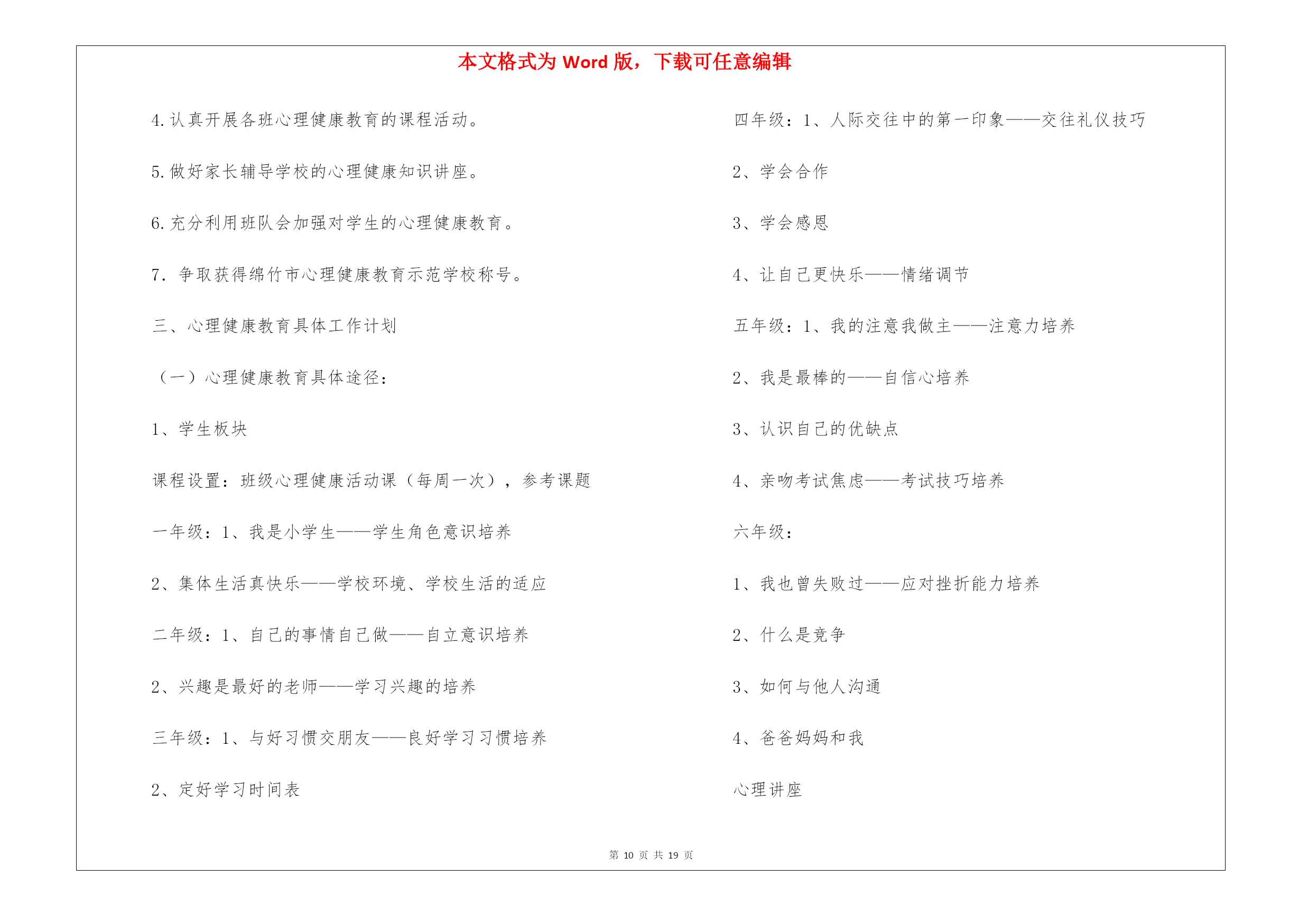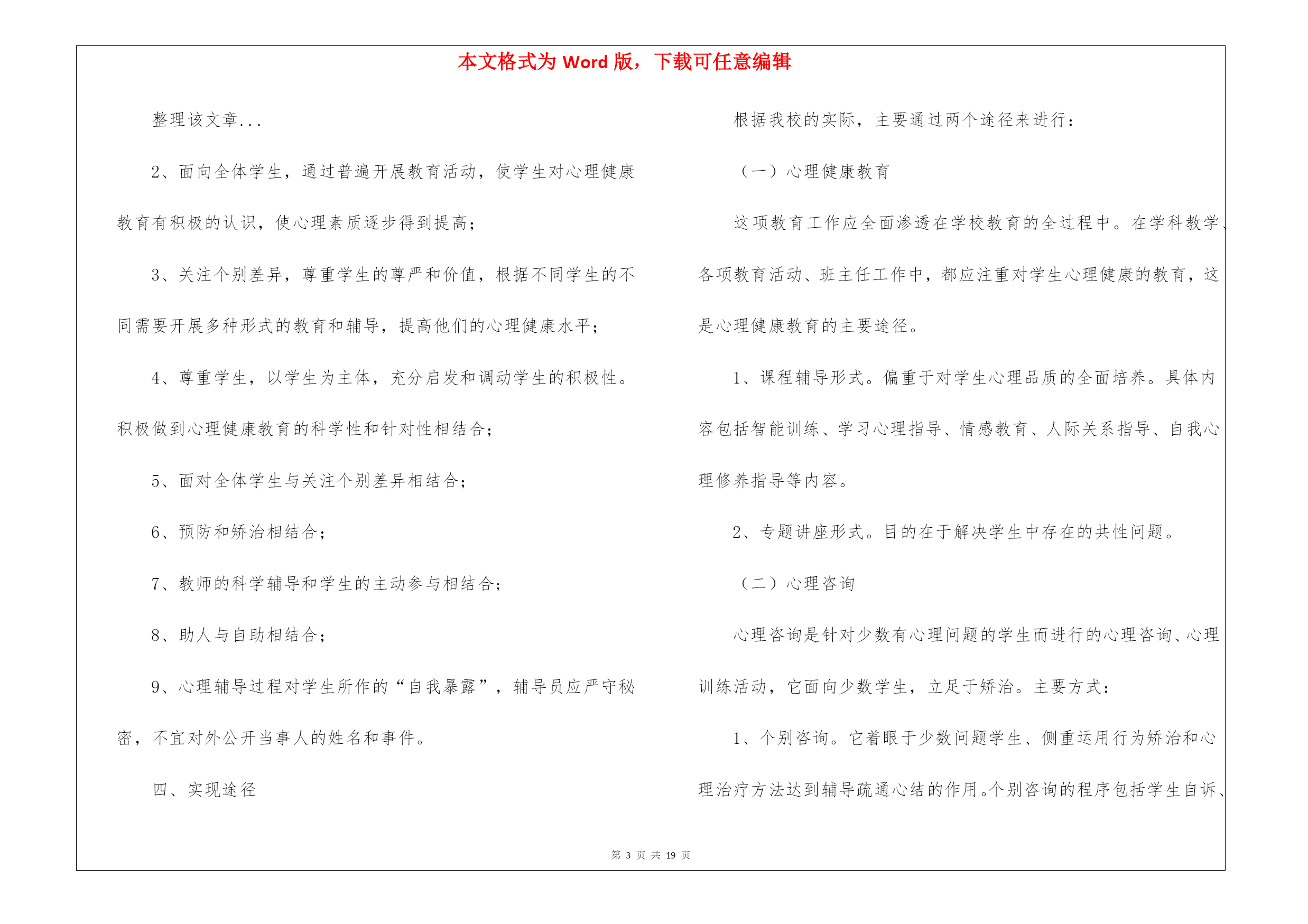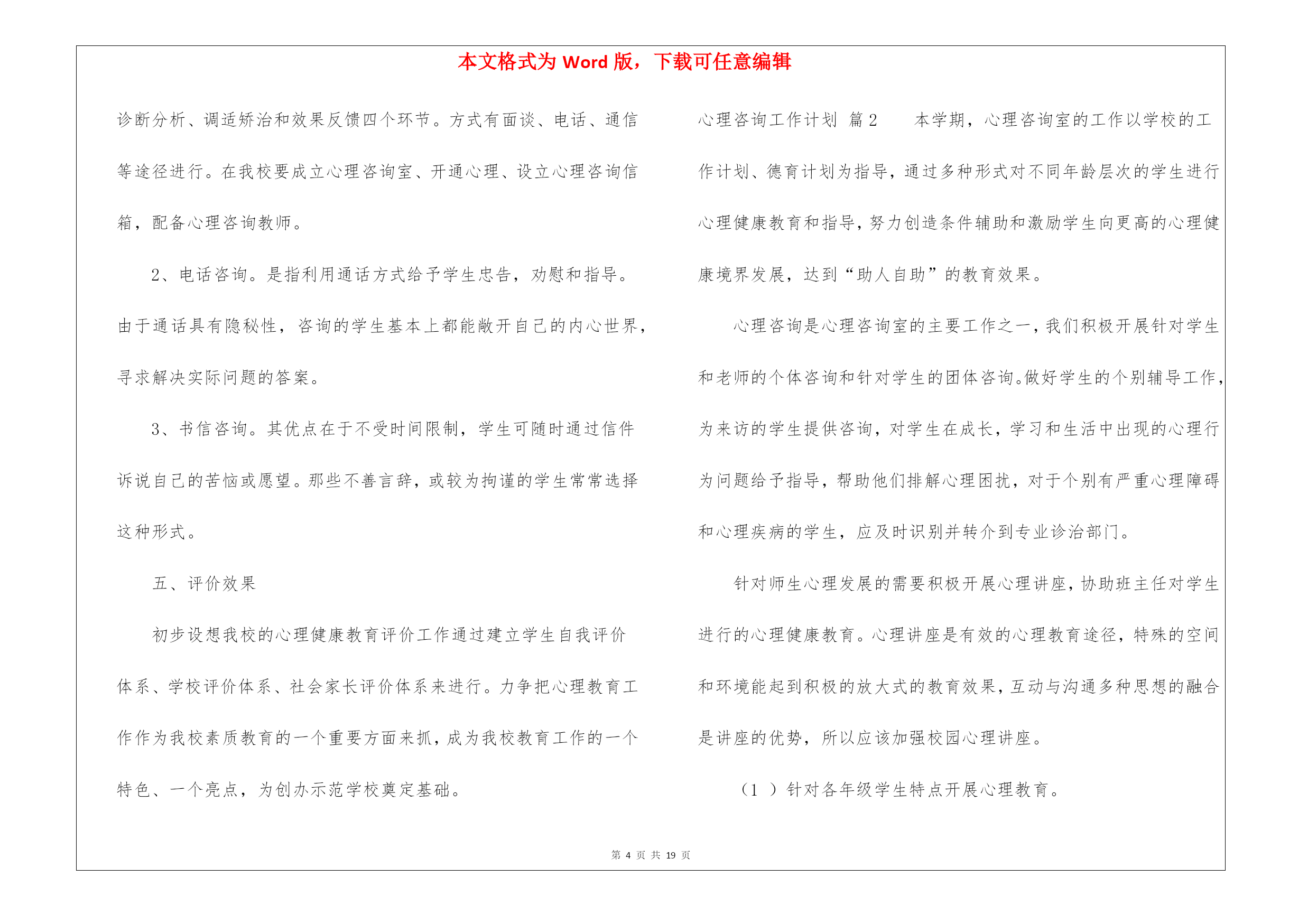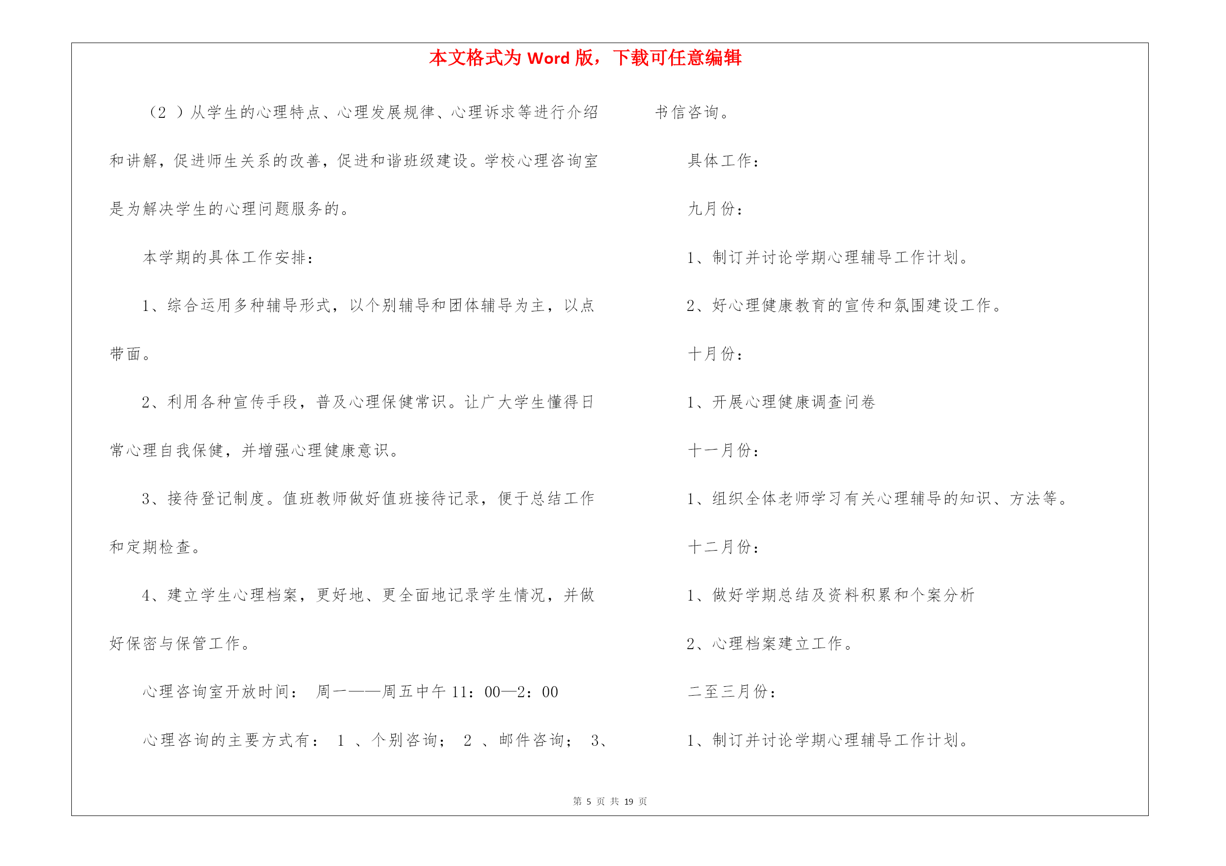 本文格式为Word版,下载可任意编辑第PAGE\*MERGEFORMAT19页共NUMPAGES\*MERGEFORMAT19页有关心理咨询工作计划汇总九篇有关心理咨询工作计划汇总九篇时间稍纵即逝,前方等待着我们的是新的机遇和挑战,写一份工作计划,为接下来的工作做准备吧!工作计划的开头要怎么写?想必这让大家都很苦恼吧,以下是我精心整理的心理咨询工作计划9篇,欢迎大家借鉴与参考,希望对大家有所帮助。心理咨询工作计划篇1目前普遍存在仅以学业成绩作为评价学生优劣标准的情况,导致不少学生自我形象偏低,自信心不足,严重阻碍着学生的素质成长。为了提高我校学生的心理健康水平,保证学生能够及时解决面临的问题,我校特开展心理咨询以帮助大家走出困境。以下是具体的工作计划。一、指导思想:以教育部下发的《关于加强中小学心理健康教育的若干意见》及《中小学生心理健康教育指导纲要》为指导,坚持育人为本,根据中小学生生理、心理发展特点和规律,运用心理健康教育的理论和方法,培养中小学生良好的心理素质,促进他们身心全面和谐发展。二、目标中小学心理健康教育的直接目标是提高全体学生的心理素质,最终目标是促进学生人格的健全发展。结合学生实际,确立我校的具体工作目标如下:1、了解自我目前普遍存在仅以学业成绩作为评价学生优劣标准的情况,导致不少学生自我形象偏低,自信心不足,严重阻碍着学生的素质成长。针对这一现象,心育工作应注重帮助学生了解自我,接纳自我,对自我的形象进行整体认识,让学生从学业自我形象、社会自我形象、情绪自我形象、体能自我形象等方面进行整体认识,找出自己的优势与劣态;帮助学生自尊、自爱、自强、自立,树立自信心。发挥出自己的潜能,实现人生价值。2、培养良好的学习适应能力当前由于学习适应性不强,而沦为学业不良的学生日渐增多,培养学生良好的学习适应能力就显得日趋重要。心育工作应致力于开展协助学生制定学习计划,寻求适合的学习方法,养成独立思考,刻苦钻研,集中精力,心无旁骛的学习品质以及保持浓厚的学习兴趣等方面的工作,以达到促进其有效学习的目的。3、养成理想的人际交往习惯理想的人际交往习惯是个体适应社会环境不可或缺的条件,人际交往的适应与否,直接影响着学生人格的发展,也影响着其在社会中的生存和发展,当前学生由于缺乏良好的人际交往习惯,可导致亲子、师生和同伴间的冲突不断增加。所以协助学生掌握人际交往的艺术是重要的。在当今这个多元化、多样化的社会,做到这一点,是尤为重要的事情。4、促进人格的健全发展目前的教育比较强调学生智力因素的培养,往往忽视非智力因素的养成;忽视对学生心理素质的全面培养,会严重影响着学生素质的提高。心育工作应注重对学生心理素质的全面培养,促进学生心理素质各方面的谐调发展,使个体在认识、情意和行为三方面达到一个有机的整体。使每个学生的各种潜能得以发挥,日后成为:具备一定的知识技能;具有很强的社会适应能力,对社会能作出积极贡献的人。三、工作安排领导小组:武连平组长:霍星成员:各年级班主任实施方案1、根据学生心理发展特点和身心发展规律,面向全体学生有针对性地实施教育;整理该文章...2、面向全体学生,通过普遍开展教育活动,使学生对心理健康教育有积极的认识,使心理素质逐步得到提高;3、关注个别差异,尊重学生的尊严和价值,根据不同学生的不同需要开展多种形式的教育和辅导,提高他们的心理健康水平;4、尊重学生,以学生为主体,充分启发和调动学生的积极性。积极做到心理健康教育的科学性和针对性相结合;5、面对全体学生与关注个别差异相结合;6、预防和矫治相结合;7、教师的科学辅导和学生的主动参与相结合;8、助人与自助相结合;9、心理辅导过程对学生所作的“自我暴露”,辅导员应严守秘密,不宜对外公开当事人的姓名和事件。四、实现途径根据我校的实际,主要通过两个途径来进行:(一)心理健康教育这项教育工作应全面渗透在学校教育的全过程中。在学科教学、各项教育活动、班主任工作中,都应注重对学生心理健康的教育,这是心理健康教育的主要途径。1、课程辅导形式。偏重于对学生心理品质的全面培养。具体内容包括智能训练、学习心理指导、情感教育、人际关系指导、自我心理修养指导等内容。2、专题讲座形式。目的在于解决学生中存在的共性问题。(二)心理咨询心理咨询是针对少数有心理问题的学生而进行的心理咨询、心理训练活动,它面向少数学生,立足于矫治。主要方式:1、个别咨询。它着眼于少数问题学生、侧重运用行为矫治和心理治疗方法达到辅导疏通心结的作用。个别咨询的程序包括学生自诉、诊断分析、调适矫治和效果反馈四个环节。方式有面谈、电话、通信等途径进行。在我校要成立心理咨询室、开通心理、设立心理咨询信箱,配备心理咨询教师。2、电话咨询。是指利用通话方式给予学生忠告,劝慰和指导。由于通话具有隐秘性,咨询