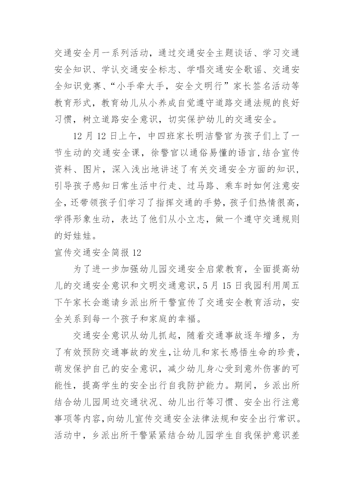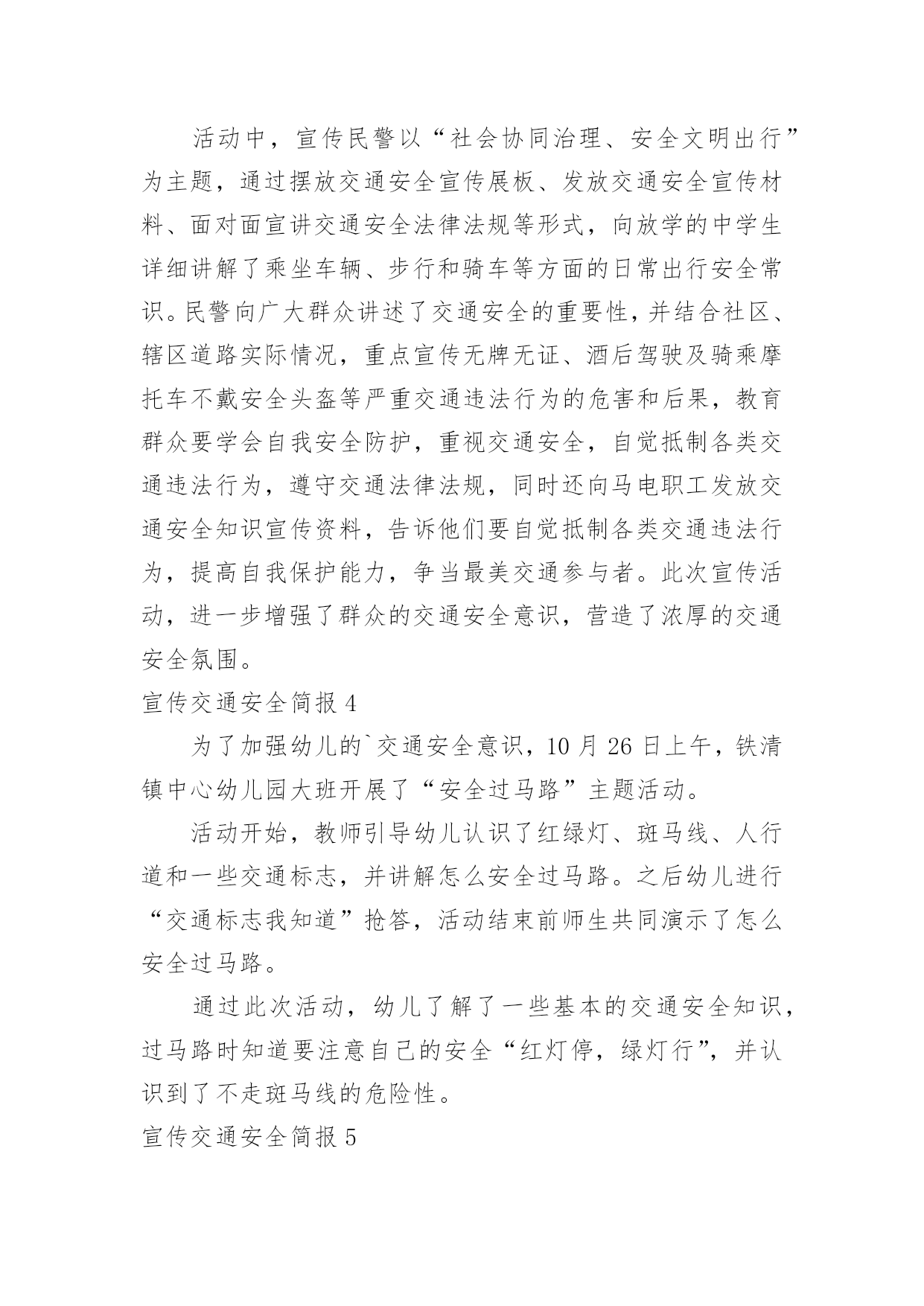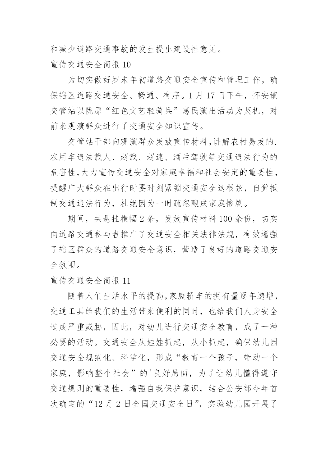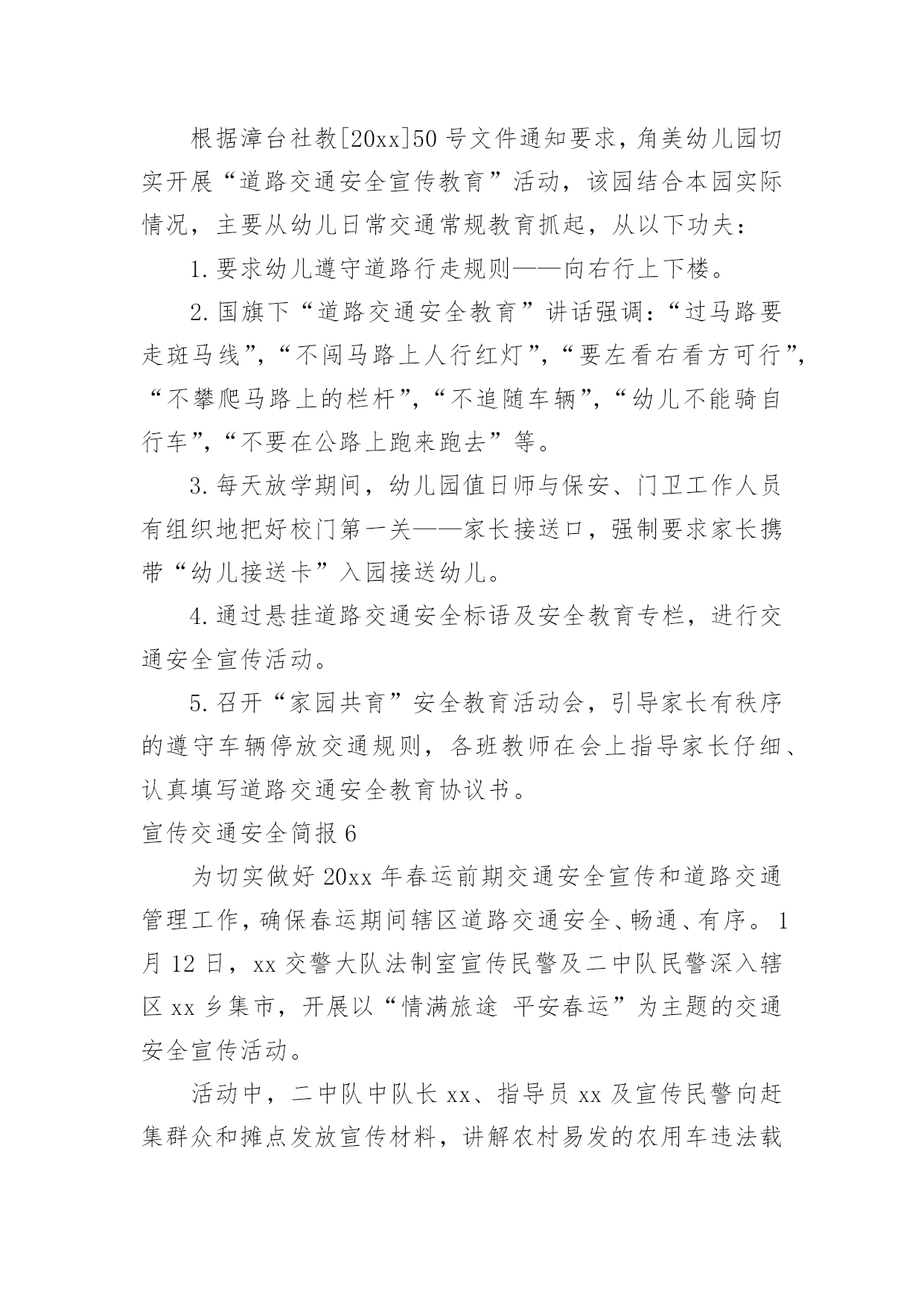 宣传交通安全简报宣传交通安全简报在不断进步的社会中,简报的使用频率逐渐增多,简报不是一种刊物。因为有些简报可装订成一本,像一般“刊物”,更多的是只有一两张纸,几个版面,像一份报纸。什么样的简报才经典呢?以下是小编为大家整理的宣传交通安全简报,仅供参考,大家一起来看看吧。宣传交通安全简报120xx年12月2日是国务院批准的.第五个全国交通安全日。为全力"122"交通安全宣传,11月29日下午,鹰潭交警信江大队走进鹰潭市第四小学,为该校师生上了一堂生动的交通安全教育课。民警通过播放交通安全警示教育片、讲述交通事故实际案例、与学生互动交流等各种生动活泼的形式,向学生们讲解了文明行走、文明乘车、文明骑车等交通安全知识,告诫学生们拒绝乘坐安全隐患车辆和"黑校车"、拒绝在公路上玩闹等危险行为;同时也教育学生从点滴做起,从身边做起,摒弃交通陋习,文明安全出行,自觉养成遵守道路交通法规、文明出行的良好习惯。宣传交通安全简报2如何安全出行,碰到交通事故如何处理,小学生在上下学路上应该注意什么。在122交通安全日到来之际,黄河新闻网与晋中市交通警察支队一大队、二大队、事故处理大队通过不同的形式宣传交通安全知识,截至12月1日已经有近2千名小学生接受了交通知识的`培训。11月26日,晋中市交警支队交通事故处理大队邀请黄河新闻网的小记者实地参观事故车辆,28日下午,由晋中交警支队二大队、榆次区太行小学、黄河新闻网、联通公司共同主办交通安全主题演讲比赛,29日,交通事故处理大队与黄河新闻网走进顺城街小学,现场播放真实事故录像,教育小学生要珍爱生命远离大货车。12月1日交通警察支队一大队与黄河新闻网6名小记者一起走向街头,共同维护交通秩序,通过小记者的亲身参与宣传交通安全常识。此次社会实践活动使孩子们真正体会到遵守交通规则的重要性,小学生用实际行动带动了家长们提高交通安全的意识,就如交警事故处理大队副大队长闫伟所言,通过此次活动可以教育一个学生,带动一个家庭,辐射整个社会,顺城街小学副校长也希望这些活动能长久做下去,以此营造良好的文明交通氛围。宣传交通安全简报320xx年122“全国交通安全日”即将来临,为进一步提高我区群众、学生等交通参与者的道路交通安全意识,尽可能减少和预防我区交通事故的`发生。11月24日下午,冀南新区交警大队宣教中队民警深入辖区马电社区人员密集场所,借马电职工和太行学校学生下班放学之机,开展122“全国交通安全日”预热宣传活动中,宣传民警以“社会协同治理、安全文明出行”为主题,通过摆放交通安全宣传展板、发放交通安全宣传材料、面对面宣讲交通安全法律法规等形式,向放学的中学生详细讲解了乘坐车辆、步行和骑车等方面的日常出行安全常识。民警向广大群众讲述了交通安全的重要性,并结合社区、辖区道路实际情况,重点宣传无牌无证、酒后驾驶及骑乘摩托车不戴安全头盔等严重交通违法行为的危害和后果,教育群众要学会自我安全防护,重视交通安全,自觉抵制各类交通违法行为,遵守交通法律法规,同时还向马电职工发放交通安全知识宣传资料,告诉他们要自觉抵制各类交通违法行为,提高自我保护能力,争当最美交通参与者。此次宣传活动,进一步增强了群众的交通安全意识,营造了浓厚的交通安全氛围。宣传交通安全简报4为了加强幼儿的`交通安全意识,10月26日上午,铁清镇中心幼儿园大班开展了“安全过马路”主题活动。活动开始,教师引导幼儿认识了红绿灯、斑马线、人行道和一些交通标志,并讲解怎么安全过马路。之后幼儿进行“交通标志我知道”抢答,活动结束前师生共同演示了怎么安全过马路。通过此次活动,幼儿了解了一些基本的交通安全知识,过马路时知道要注意自己的安全“红灯停,绿灯行”,并认识到了不走斑马线的危险性。宣传交通安全简报5根据漳台社教[20xx]50号文件通知要求,角美幼儿园切实开展“道路交通安全宣传教育”活动,该园结合本园实际情况,主要从幼儿日常交通常规教育抓起,从以下功夫:1.要求幼儿遵守道路行走规则——向右行上下楼。2.国旗下“道路交通安全教育”讲话强调:“过马路要走斑马线”,“不闯马路上人行红灯”,“要左看右看方可行”,“不攀爬马路上的栏杆”,“不追随车辆”,“幼儿不能骑自行车”,“不要在公路上跑来跑去”等。3.每天放学期间,幼儿园值日师与保安、门卫工作人员有组织地把好校门第一关——家长接送口,强制要求家长携带“幼儿接送卡”入园接送幼儿。4.通过悬挂道路交通安全标语及安全教育专栏,进行交通安全宣传活动。5.召开“家园共育”安全教育活动会,引导家长有秩序的遵守车辆停放交通规则,各班教师在会上指导家长仔细、认真填写道路交通安全教育协议书。宣传交通安全简报6为切实做好20xx年春运前期交通安全宣传和道路交通管理工作,确保春运期间辖区道路交通安全、畅通、有序。1月12日,xx交警大队法制室宣