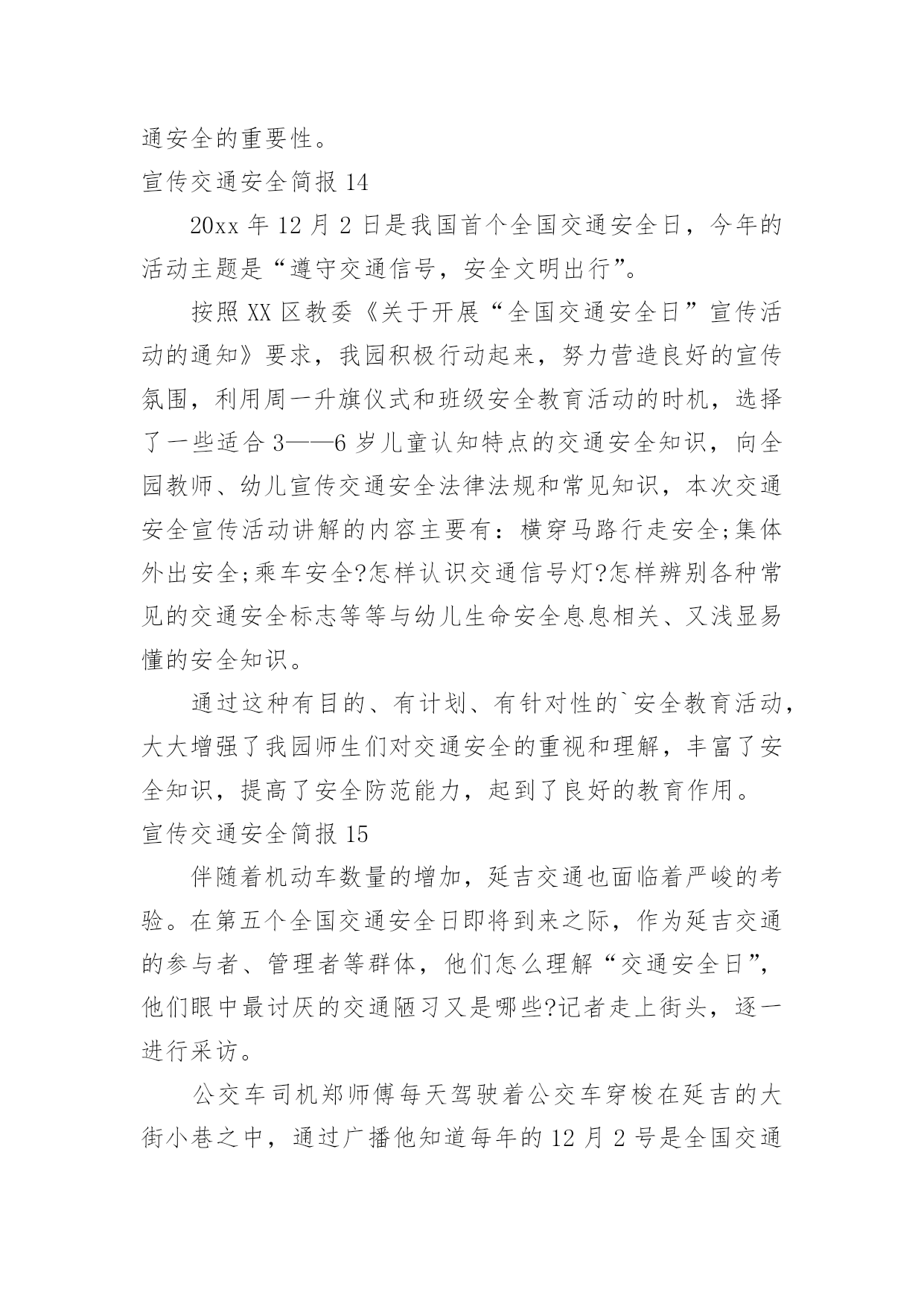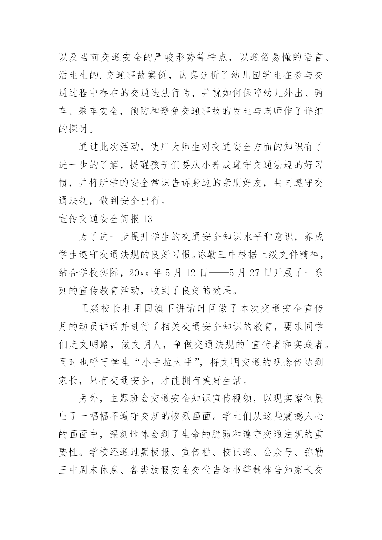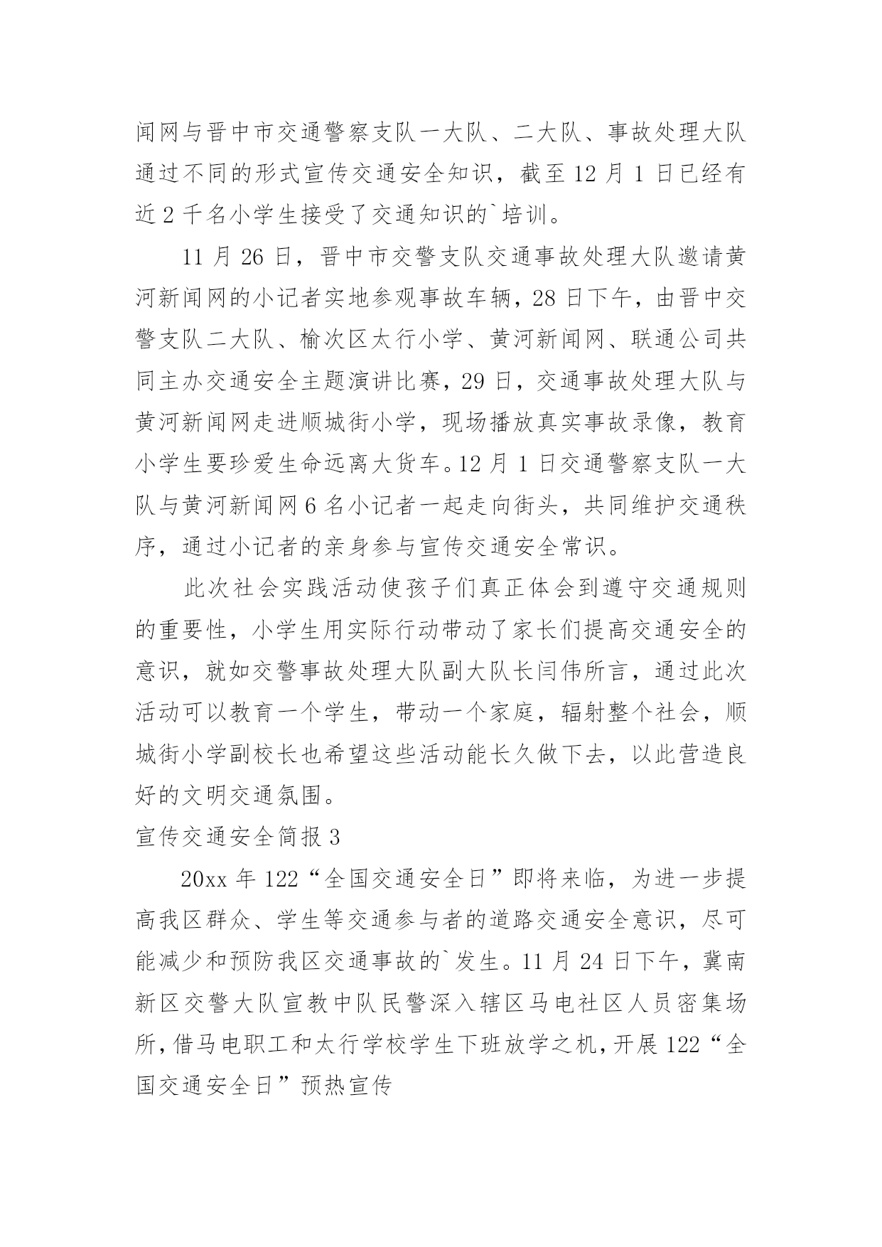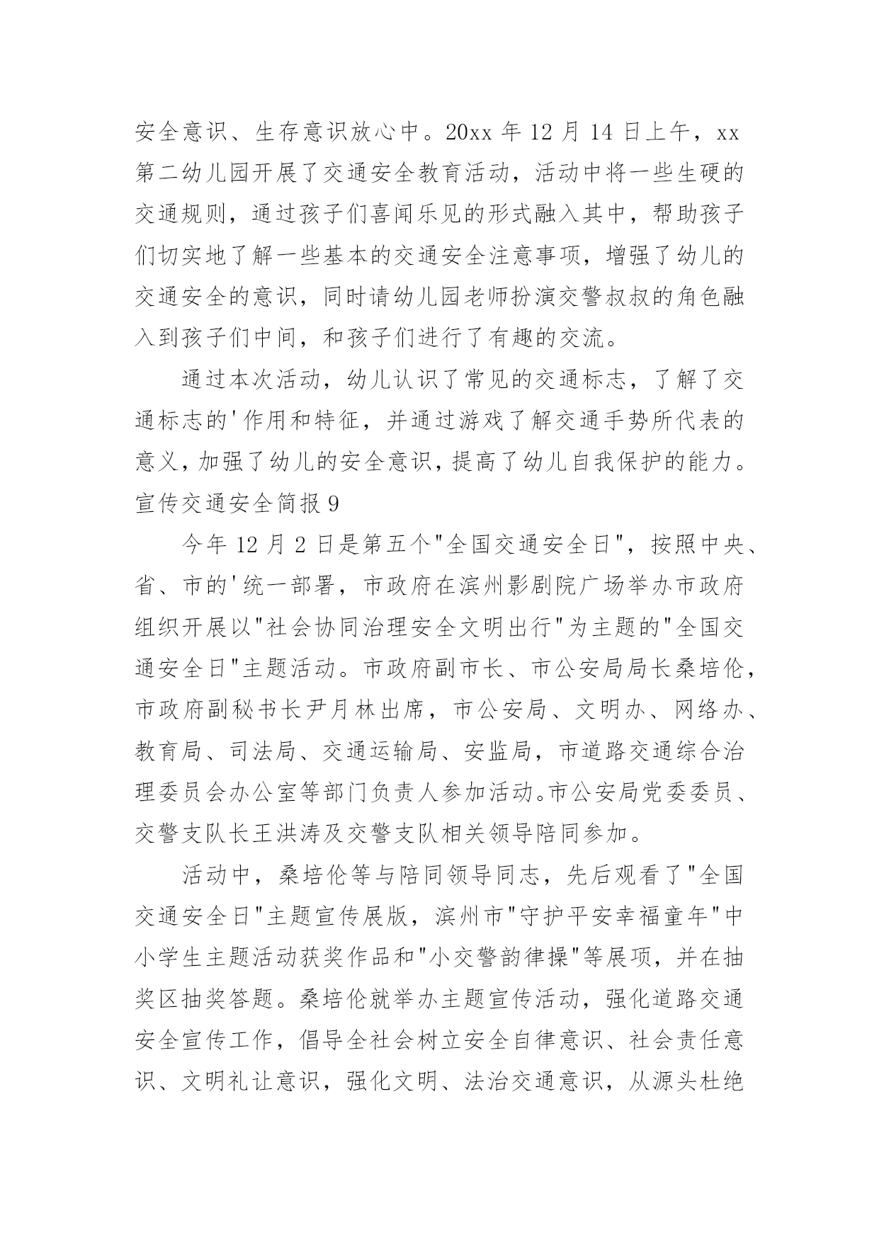 宣传交通安全简报宣传交通安全简报在不断进步的社会中,简报的使用频率逐渐增多,简报不是一种刊物。因为有些简报可装订成一本,像一般“刊物”,更多的是只有一两张纸,几个版面,像一份报纸。什么样的简报才经典呢?以下是小编为大家整理的宣传交通安全简报,仅供参考,大家一起来看看吧。宣传交通安全简报120xx年12月2日是国务院批准的.第五个全国交通安全日。为全力"122"交通安全宣传,11月29日下午,鹰潭交警信江大队走进鹰潭市第四小学,为该校师生上了一堂生动的交通安全教育课。民警通过播放交通安全警示教育片、讲述交通事故实际案例、与学生互动交流等各种生动活泼的形式,向学生们讲解了文明行走、文明乘车、文明骑车等交通安全知识,告诫学生们拒绝乘坐安全隐患车辆和"黑校车"、拒绝在公路上玩闹等危险行为;同时也教育学生从点滴做起,从身边做起,摒弃交通陋习,文明安全出行,自觉养成遵守道路交通法规、文明出行的良好习惯。宣传交通安全简报2如何安全出行,碰到交通事故如何处理,小学生在上下学路上应该注意什么。在122交通安全日到来之际,黄河新闻网与晋中市交通警察支队一大队、二大队、事故处理大队通过不同的形式宣传交通安全知识,截至12月1日已经有近2千名小学生接受了交通知识的`培训。11月26日,晋中市交警支队交通事故处理大队邀请黄河新闻网的小记者实地参观事故车辆,28日下午,由晋中交警支队二大队、榆次区太行小学、黄河新闻网、联通公司共同主办交通安全主题演讲比赛,29日,交通事故处理大队与黄河新闻网走进顺城街小学,现场播放真实事故录像,教育小学生要珍爱生命远离大货车。12月1日交通警察支队一大队与黄河新闻网6名小记者一起走向街头,共同维护交通秩序,通过小记者的亲身参与宣传交通安全常识。此次社会实践活动使孩子们真正体会到遵守交通规则的重要性,小学生用实际行动带动了家长们提高交通安全的意识,就如交警事故处理大队副大队长闫伟所言,通过此次活动可以教育一个学生,带动一个家庭,辐射整个社会,顺城街小学副校长也希望这些活动能长久做下去,以此营造良好的文明交通氛围。宣传交通安全简报320xx年122“全国交通安全日”即将来临,为进一步提高我区群众、学生等交通参与者的道路交通安全意识,尽可能减少和预防我区交通事故的`发生。11月24日下午,冀南新区交警大队宣教中队民警深入辖区马电社区人员密集场所,借马电职工和太行学校学生下班放学之机,开展122“全国交通安全日”预热宣传活动中,宣传民警以“社会协同治理、安全文明出行”为主题,通过摆放交通安全宣传展板、发放交通安全宣传材料、面对面宣讲交通安全法律法规等形式,向放学的中学生详细讲解了乘坐车辆、步行和骑车等方面的日常出行安全常识。民警向广大群众讲述了交通安全的重要性,并结合社区、辖区道路实际情况,重点宣传无牌无证、酒后驾驶及骑乘摩托车不戴安全头盔等严重交通违法行为的危害和后果,教育群众要学会自我安全防护,重视交通安全,自觉抵制各类交通违法行为,遵守交通法律法规,同时还向马电职工发放交通安全知识宣传资料,告诉他们要自觉抵制各类交通违法行为,提高自我保护能力,争当最美交通参与者。此次宣传活动,进一步增强了群众的交通安全意识,营造了浓厚的交通安全氛围。宣传交通安全简报4为了加强幼儿的`交通安全意识,10月26日上午,铁清镇中心幼儿园大班开展了“安全过马路”主题活动。活动开始,教师引导幼儿认识了红绿灯、斑马线、人行道和一些交通标志,并讲解怎么安全过马路。之后幼儿进行“交通标志我知道”抢答,活动结束前师生共同演示了怎么安全过马路。通过此次活动,幼儿了解了一些基本的交通安全知识,过马路时知道要注意自己的安全“红灯停,绿灯行”,并认识到了不走斑马线的危险性。宣传交通安全简报5根据漳台社教[20xx]50号文件通知要求,角美幼儿园切实开展“道路交通安全宣传教育”活动,该园结合本园实际情况,主要从幼儿日常交通常规教育抓起,从以下功夫:1.要求幼儿遵守道路行走规则——向右行上下楼。2.国旗下“道路交通安全教育”讲话强调:“过马路要走斑马线”,“不闯马路上人行红灯”,“要左看右看方可行”,“不攀爬马路上的栏杆”,“不追随车辆”,“幼儿不能骑自行车”,“不要在公路上跑来跑去”等。3.每天放学期间,幼儿园值日师与保安、门卫工作人员有组织地把好校门第一关——家长接送口,强制要求家长携带“幼儿接送卡”入园接送幼儿。4.通过悬挂道路交通安全标语及安全教育专栏,进行交通安全宣传活动。5.召开“家园共育”安全教育活动会,引导家长有秩序的遵守车辆停放交通规则,各班教师在会上指导家长仔细、认真填写道路交通安全教育协议书。宣传交通安全简报6为切实做好20xx年春运前期交通安全宣传和道路交通管理工作,确保春运期间辖区道路交通安全、畅通、有序。1月12日,xx交警大队法制室宣