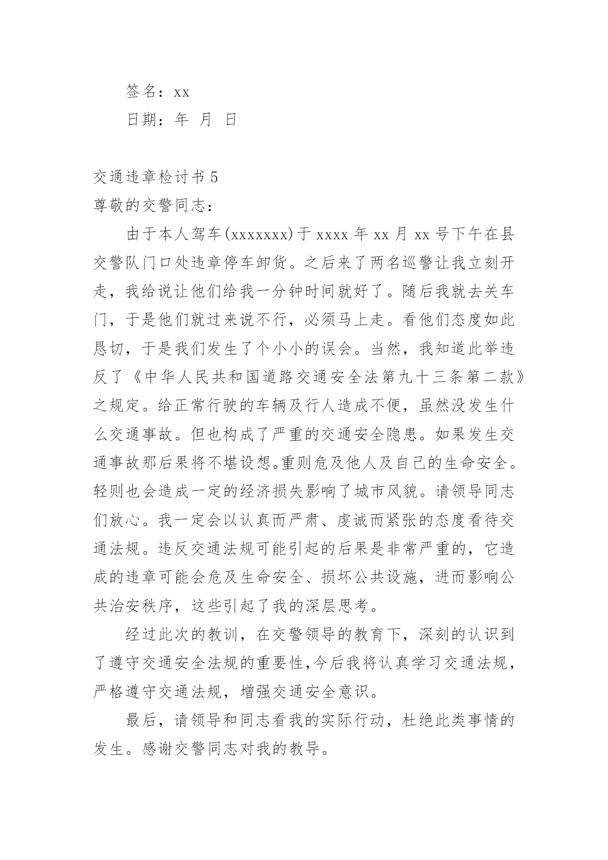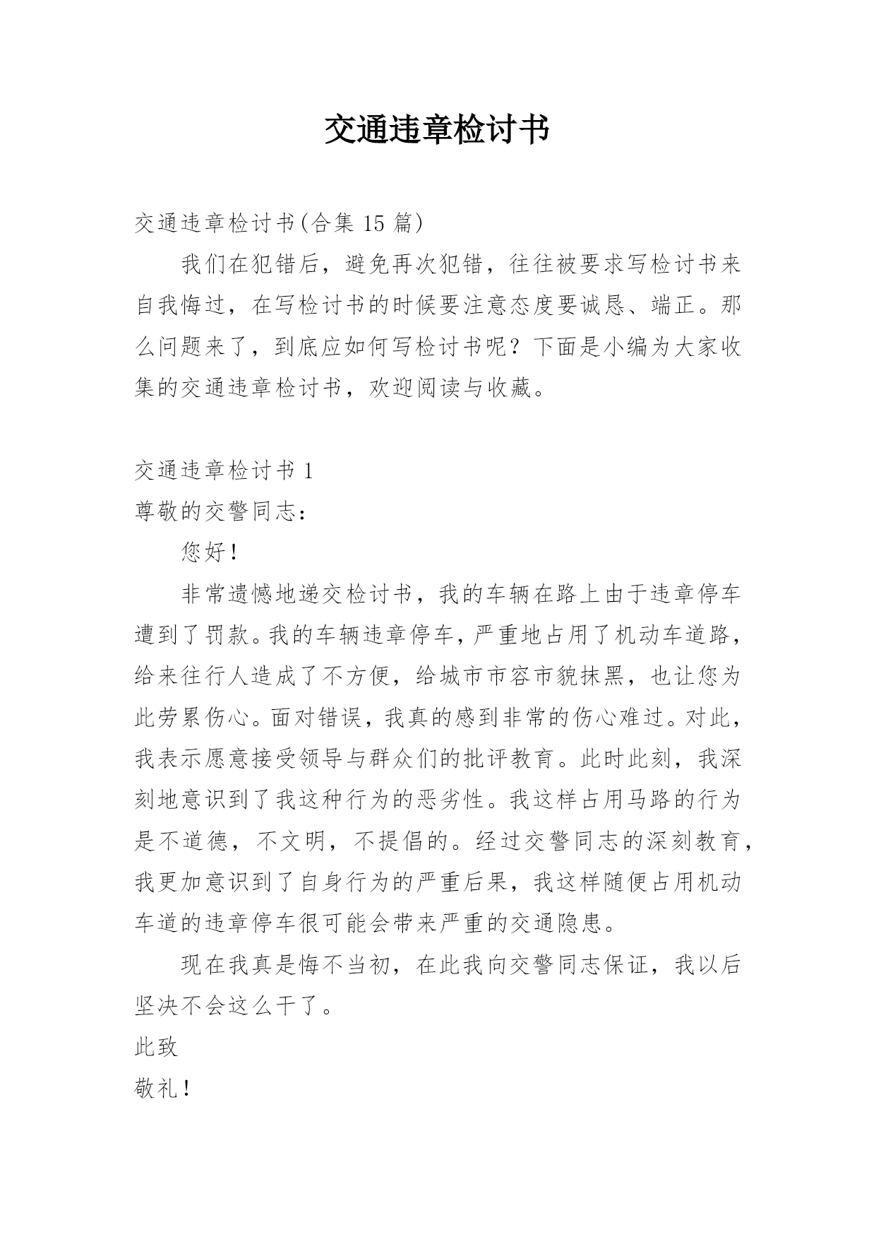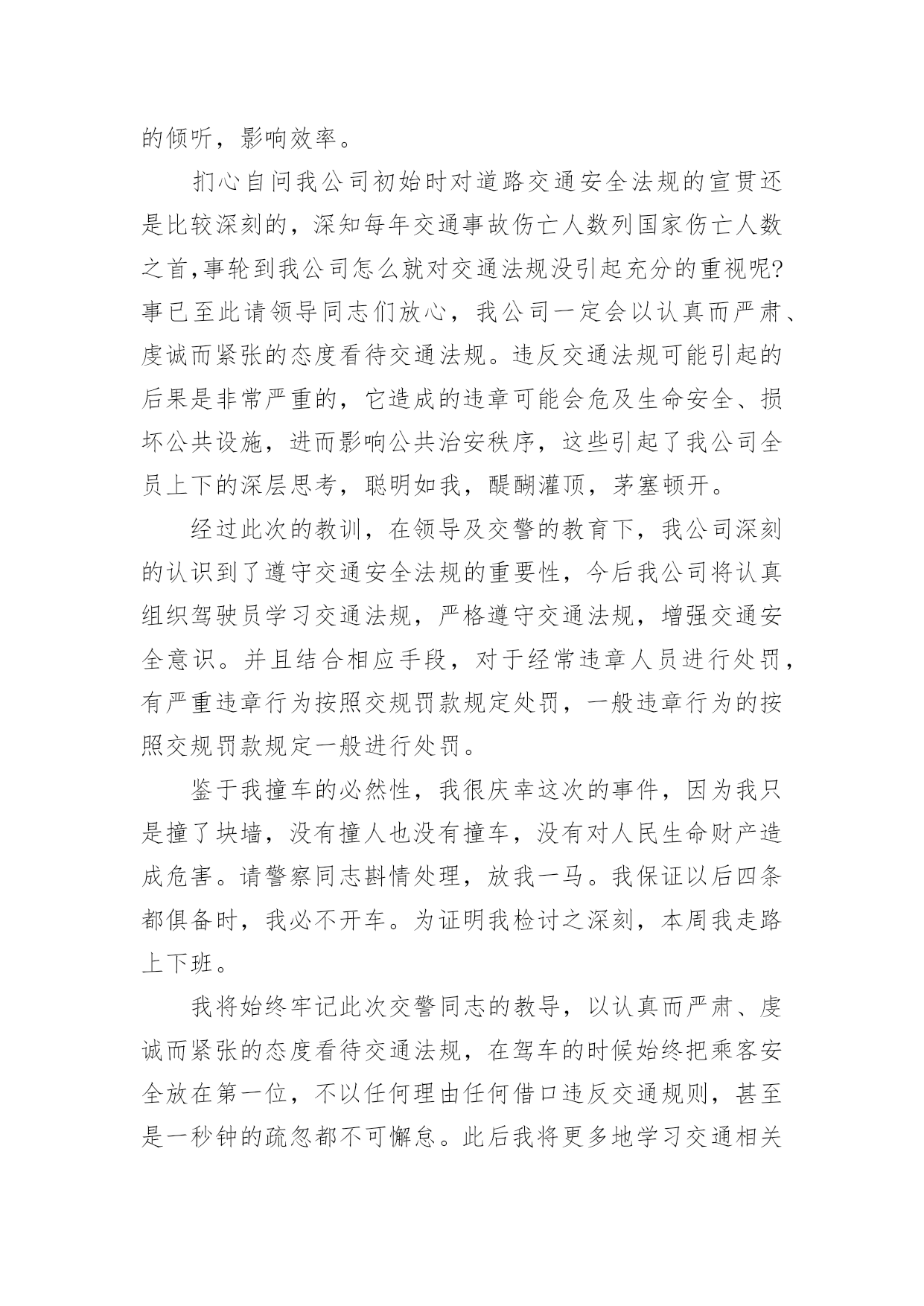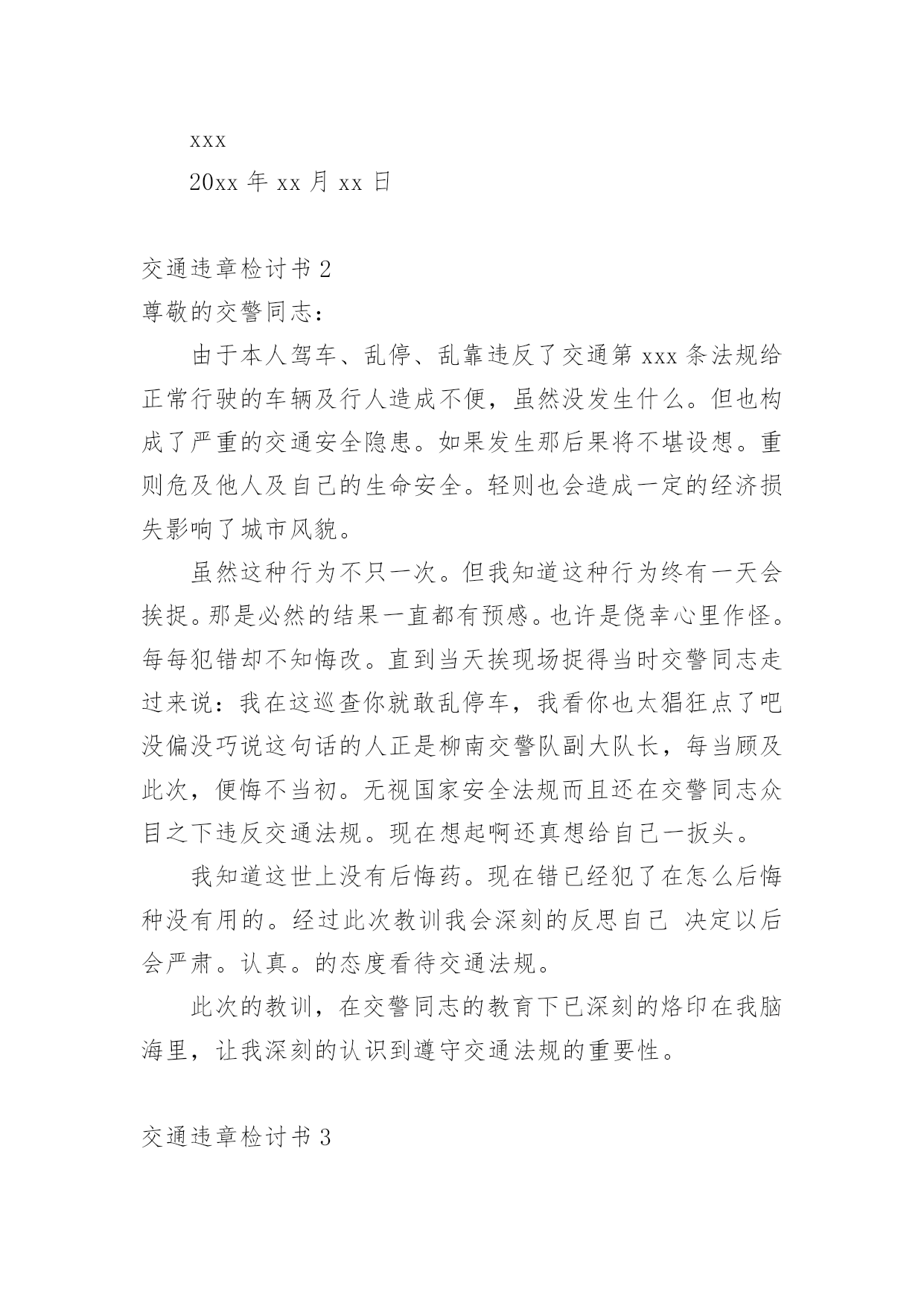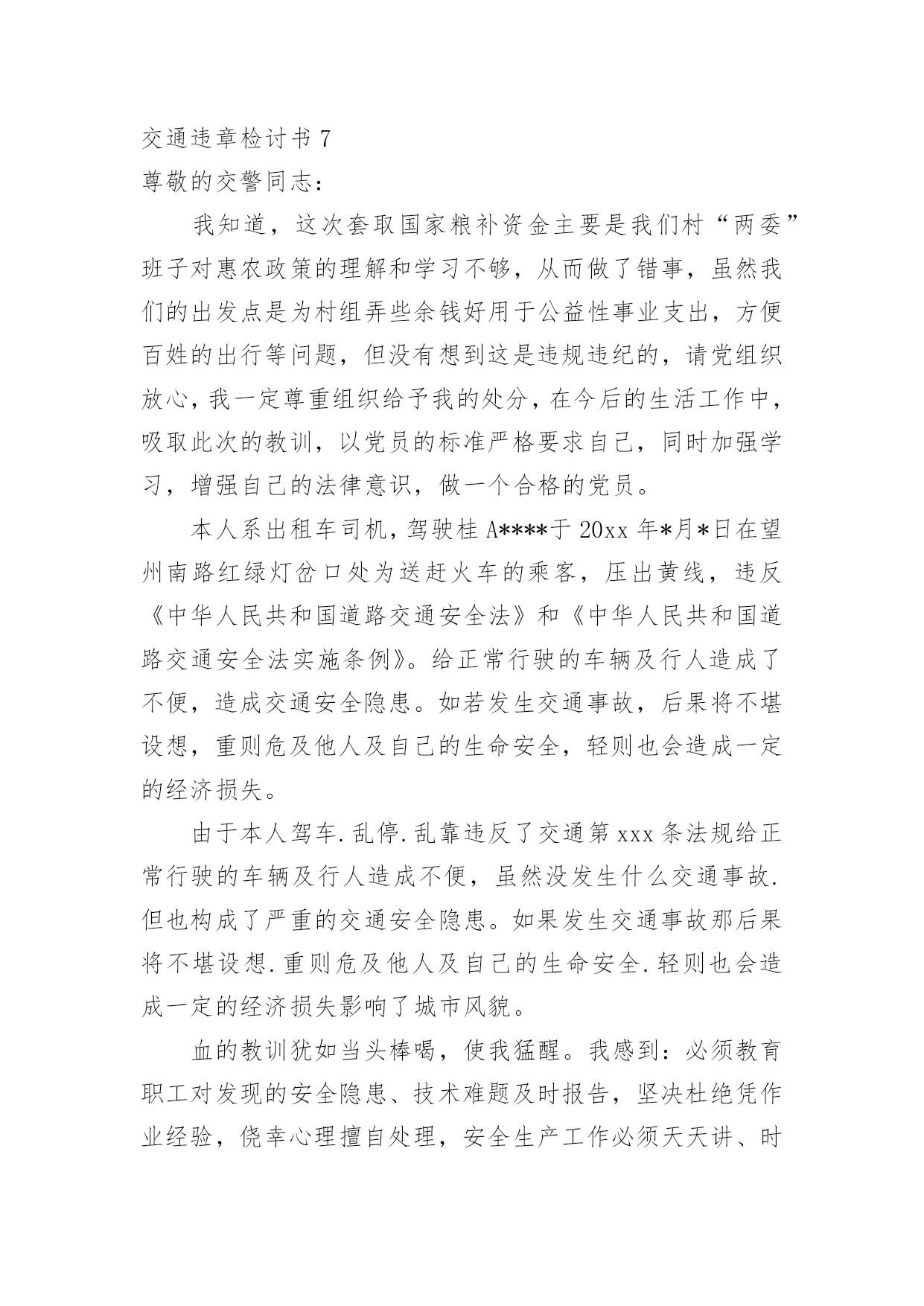 交通违章检讨书交通违章检讨书(合集15篇)我们在犯错后,避免再次犯错,往往被要求写检讨书来自我悔过,在写检讨书的时候要注意态度要诚恳、端正。那么问题来了,到底应如何写检讨书呢?下面是小编为大家收集的交通违章检讨书,欢迎阅读与收藏。交通违章检讨书1尊敬的交警同志:您好!非常遗憾地递交检讨书,我的车辆在路上由于违章停车遭到了罚款。我的车辆违章停车,严重地占用了机动车道路,给来往行人造成了不方便,给城市市容市貌抹黑,也让您为此劳累伤心。面对错误,我真的感到非常的伤心难过。对此,我表示愿意接受领导与群众们的批评教育。此时此刻,我深刻地意识到了我这种行为的恶劣性。我这样占用马路的行为是不道德,不文明,不提倡的。经过交警同志的深刻教育,我更加意识到了自身行为的严重后果,我这样随便占用机动车道的违章停车很可能会带来严重的交通隐患。现在我真是悔不当初,在此我向交警同志保证,我以后坚决不会这么干了。此致敬礼!xxx20xx年xx月xx日交通违章检讨书2尊敬的交警同志:由于本人驾车、乱停、乱靠违反了交通第xxx条法规给正常行驶的车辆及行人造成不便,虽然没发生什么。但也构成了严重的交通安全隐患。如果发生那后果将不堪设想。重则危及他人及自己的生命安全。轻则也会造成一定的经济损失影响了城市风貌。虽然这种行为不只一次。但我知道这种行为终有一天会挨捉。那是必然的结果一直都有预感。也许是侥幸心里作怪。每每犯错却不知悔改。直到当天挨现场捉得当时交警同志走过来说:我在这巡查你就敢乱停车,我看你也太猖狂点了吧没偏没巧说这句话的人正是柳南交警队副大队长,每当顾及此次,便悔不当初。无视国家安全法规而且还在交警同志众目之下违反交通法规。现在想起啊还真想给自己一扳头。我知道这世上没有后悔药。现在错已经犯了在怎么后悔种没有用的。经过此次教训我会深刻的反思自己决定以后会严肃。认真。的态度看待交通法规。此次的教训,在交警同志的教育下已深刻的烙印在我脑海里,让我深刻的认识到遵守交通法规的重要性。交通违章检讨书3尊敬的安委会领导同志们:首先,我公司对××××年第×季度车辆违章超标的行为向安委会的领导同志表示歉意。随着公司的发展,队伍的状态,拥有的车辆也日益增加。虽然我们之前对公司驾驶员进行了安全教育和再三的叮嘱,可是由于公司驾驶员很多,管理起来有一定难度,再加上在道路行车过程中有很多不定因素,又发生了这次违章。不过人生不可能一切都顺顺利利的,起起伏伏在所难免,只是有的人遇到的波浪大点,有的人遇到的波浪小点。经历过大风大浪的人定能成为出色的人才,而我么,就挡下小风小浪吧,努力做好现在就行。血的教训犹如当头棒喝,使我猛醒。我感到:必须教育职工对发现的安全隐患、技术难题及时报告,坚决杜绝凭作业经验,侥幸心理擅自处理,安全生产工作必须天天讲、时时讲,讲深讲透,讲的深入人心,让职工入耳入脑,树立牢固的安全生产观念,落实安全生产制度,遵守相关安全生产法规,及时排除隐患,才能够实现安全生产和经济效益的双丰收。面对事故我深知,任何道歉也不能带回已经逝去的生命,任何忏悔在血的教训面前也显得格外的苍白无力。在此,我只能说,我愿意为过去发生过的一切承担责任,也愿意接受公司对我批评处理,以此为鉴,远离事故,警示后人。未能参加公司重要工作会议,不仅对不起,对我的循循善诱,更对不起我自己的生活理念:生活就是工作,我们却让生活干扰了工作。使我对接下来安排的工作没有直接有效的倾听,影响效率。扪心自问我公司初始时对道路交通安全法规的宣贯还是比较深刻的,深知每年交通事故伤亡人数列国家伤亡人数之首,事轮到我公司怎么就对交通法规没引起充分的重视呢?事已至此请领导同志们放心,我公司一定会以认真而严肃、虔诚而紧张的态度看待交通法规。违反交通法规可能引起的后果是非常严重的,它造成的违章可能会危及生命安全、损坏公共设施,进而影响公共治安秩序,这些引起了我公司全员上下的深层思考,聪明如我,醍醐灌顶,茅塞顿开。经过此次的教训,在领导及交警的教育下,我公司深刻的认识到了遵守交通安全法规的重要性,今后我公司将认真组织驾驶员学习交通法规,严格遵守交通法规,增强交通安全意识。并且结合相应手段,对于经常违章人员进行处罚,有严重违章行为按照交规罚款规定处罚,一般违章行为的按照交规罚款规定一般进行处罚。鉴于我撞车的必然性,我很庆幸这次的事件,因为我只是撞了块墙,没有撞人也没有撞车,没有对人民生命财产造成危害。请警察同志斟情处理,放我一马。我保证以后四条都俱备时,我必不开车。为证明我检讨之深刻,本周我走路上下班。我将始终牢记此次交警同志的教导,以认真而严肃、虔诚而紧张的态度看待交通法规,在驾车的时候始终把乘客安全放在第一位,不以任何理由任何借口违反交通规则,甚至是一秒钟的疏忽都不可懈怠。此后我将更多地学习交通相关规则,学习经验教训,不断提高交通