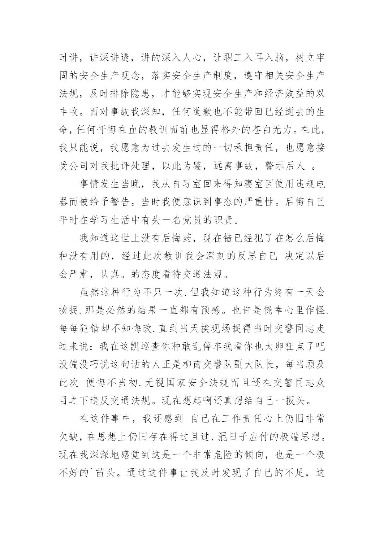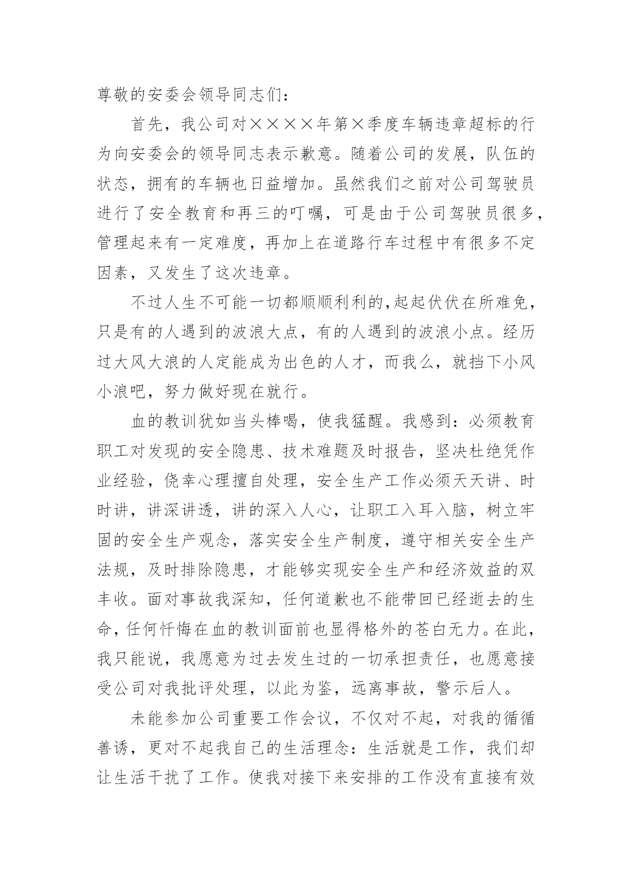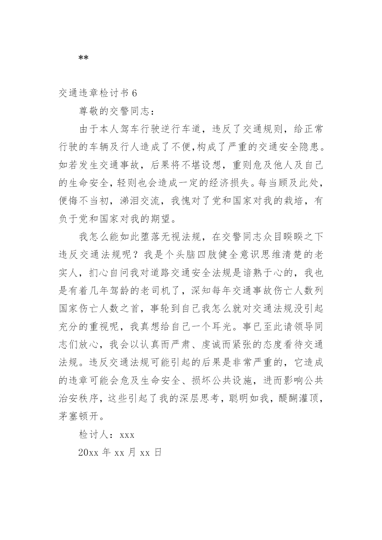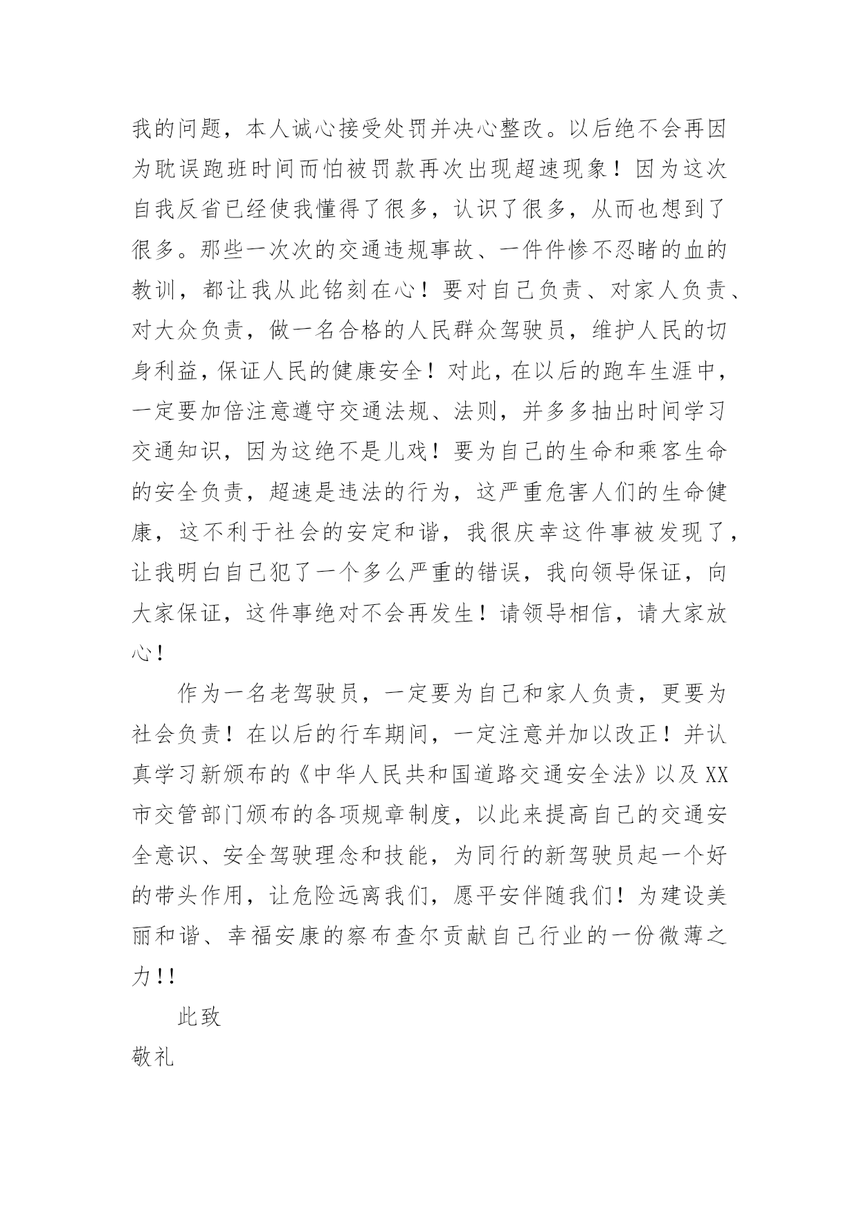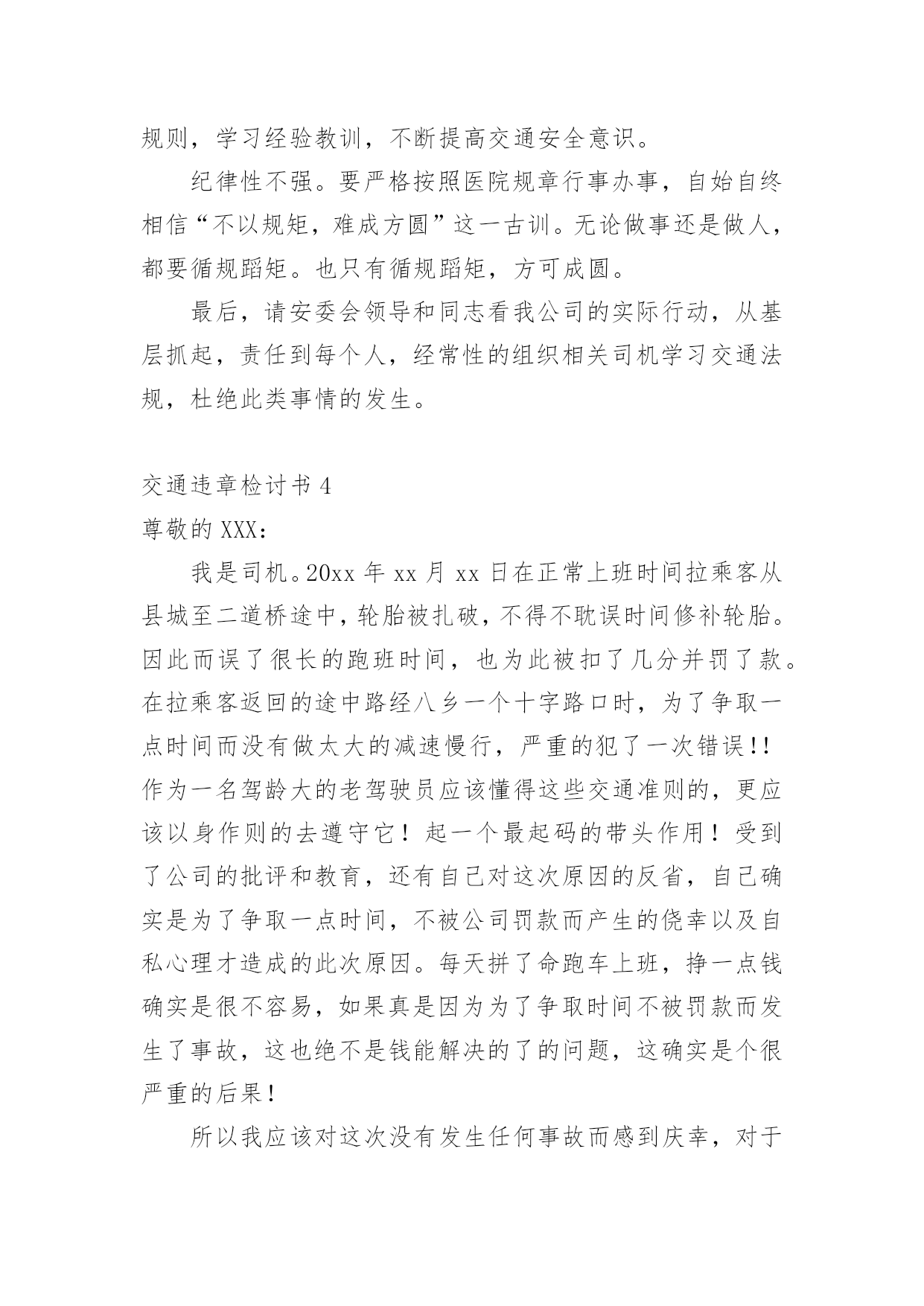 交通违章检讨书交通违章检讨书(合集15篇)我们在犯错后,避免再次犯错,往往被要求写检讨书来自我悔过,在写检讨书的时候要注意态度要诚恳、端正。那么问题来了,到底应如何写检讨书呢?下面是小编为大家收集的交通违章检讨书,欢迎阅读与收藏。交通违章检讨书1尊敬的交警同志:您好!非常遗憾地递交检讨书,我的车辆在路上由于违章停车遭到了罚款。我的车辆违章停车,严重地占用了机动车道路,给来往行人造成了不方便,给城市市容市貌抹黑,也让您为此劳累伤心。面对错误,我真的感到非常的伤心难过。对此,我表示愿意接受领导与群众们的批评教育。此时此刻,我深刻地意识到了我这种行为的恶劣性。我这样占用马路的行为是不道德,不文明,不提倡的。经过交警同志的深刻教育,我更加意识到了自身行为的严重后果,我这样随便占用机动车道的违章停车很可能会带来严重的交通隐患。现在我真是悔不当初,在此我向交警同志保证,我以后坚决不会这么干了。此致敬礼!xxx20xx年xx月xx日交通违章检讨书2尊敬的交警同志:由于本人驾车、乱停、乱靠违反了交通第xxx条法规给正常行驶的车辆及行人造成不便,虽然没发生什么。但也构成了严重的交通安全隐患。如果发生那后果将不堪设想。重则危及他人及自己的生命安全。轻则也会造成一定的经济损失影响了城市风貌。虽然这种行为不只一次。但我知道这种行为终有一天会挨捉。那是必然的结果一直都有预感。也许是侥幸心里作怪。每每犯错却不知悔改。直到当天挨现场捉得当时交警同志走过来说:我在这巡查你就敢乱停车,我看你也太猖狂点了吧没偏没巧说这句话的人正是柳南交警队副大队长,每当顾及此次,便悔不当初。无视国家安全法规而且还在交警同志众目之下违反交通法规。现在想起啊还真想给自己一扳头。我知道这世上没有后悔药。现在错已经犯了在怎么后悔种没有用的。经过此次教训我会深刻的反思自己决定以后会严肃。认真。的态度看待交通法规。此次的教训,在交警同志的教育下已深刻的烙印在我脑海里,让我深刻的认识到遵守交通法规的重要性。交通违章检讨书3尊敬的安委会领导同志们:首先,我公司对××××年第×季度车辆违章超标的行为向安委会的领导同志表示歉意。随着公司的发展,队伍的状态,拥有的车辆也日益增加。虽然我们之前对公司驾驶员进行了安全教育和再三的叮嘱,可是由于公司驾驶员很多,管理起来有一定难度,再加上在道路行车过程中有很多不定因素,又发生了这次违章。不过人生不可能一切都顺顺利利的,起起伏伏在所难免,只是有的人遇到的波浪大点,有的人遇到的波浪小点。经历过大风大浪的人定能成为出色的人才,而我么,就挡下小风小浪吧,努力做好现在就行。血的教训犹如当头棒喝,使我猛醒。我感到:必须教育职工对发现的安全隐患、技术难题及时报告,坚决杜绝凭作业经验,侥幸心理擅自处理,安全生产工作必须天天讲、时时讲,讲深讲透,讲的深入人心,让职工入耳入脑,树立牢固的安全生产观念,落实安全生产制度,遵守相关安全生产法规,及时排除隐患,才能够实现安全生产和经济效益的双丰收。面对事故我深知,任何道歉也不能带回已经逝去的生命,任何忏悔在血的教训面前也显得格外的苍白无力。在此,我只能说,我愿意为过去发生过的一切承担责任,也愿意接受公司对我批评处理,以此为鉴,远离事故,警示后人。未能参加公司重要工作会议,不仅对不起,对我的循循善诱,更对不起我自己的生活理念:生活就是工作,我们却让生活干扰了工作。使我对接下来安排的工作没有直接有效的倾听,影响效率。扪心自问我公司初始时对道路交通安全法规的宣贯还是比较深刻的,深知每年交通事故伤亡人数列国家伤亡人数之首,事轮到我公司怎么就对交通法规没引起充分的重视呢?事已至此请领导同志们放心,我公司一定会以认真而严肃、虔诚而紧张的态度看待交通法规。违反交通法规可能引起的后果是非常严重的,它造成的违章可能会危及生命安全、损坏公共设施,进而影响公共治安秩序,这些引起了我公司全员上下的深层思考,聪明如我,醍醐灌顶,茅塞顿开。经过此次的教训,在领导及交警的教育下,我公司深刻的认识到了遵守交通安全法规的重要性,今后我公司将认真组织驾驶员学习交通法规,严格遵守交通法规,增强交通安全意识。并且结合相应手段,对于经常违章人员进行处罚,有严重违章行为按照交规罚款规定处罚,一般违章行为的按照交规罚款规定一般进行处罚。鉴于我撞车的必然性,我很庆幸这次的事件,因为我只是撞了块墙,没有撞人也没有撞车,没有对人民生命财产造成危害。请警察同志斟情处理,放我一马。我保证以后四条都俱备时,我必不开车。为证明我检讨之深刻,本周我走路上下班。我将始终牢记此次交警同志的教导,以认真而严肃、虔诚而紧张的态度看待交通法规,在驾车的时候始终把乘客安全放在第一位,不以任何理由任何借口违反交通规则,甚至是一秒钟的疏忽都不可懈怠。此后我将更多地学习交通相关规则,学习经验教训,不断提高交通