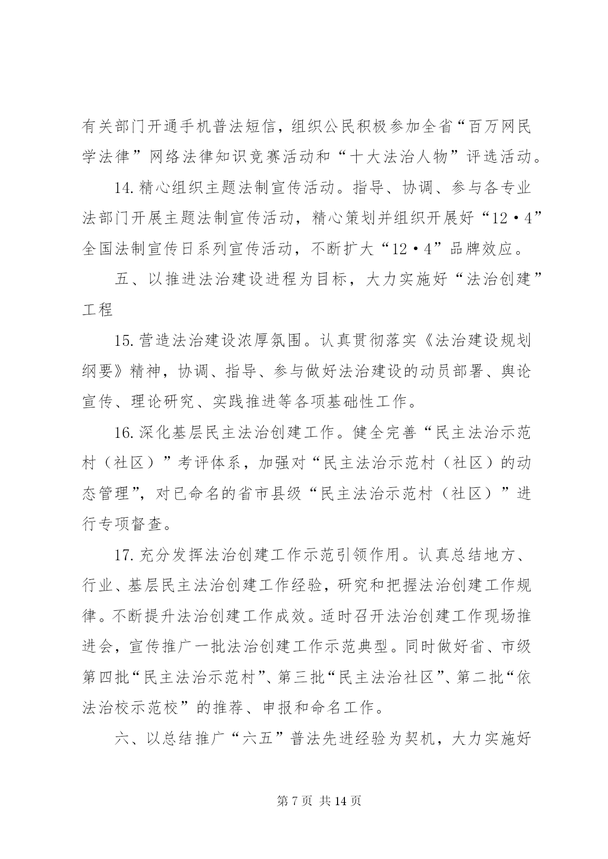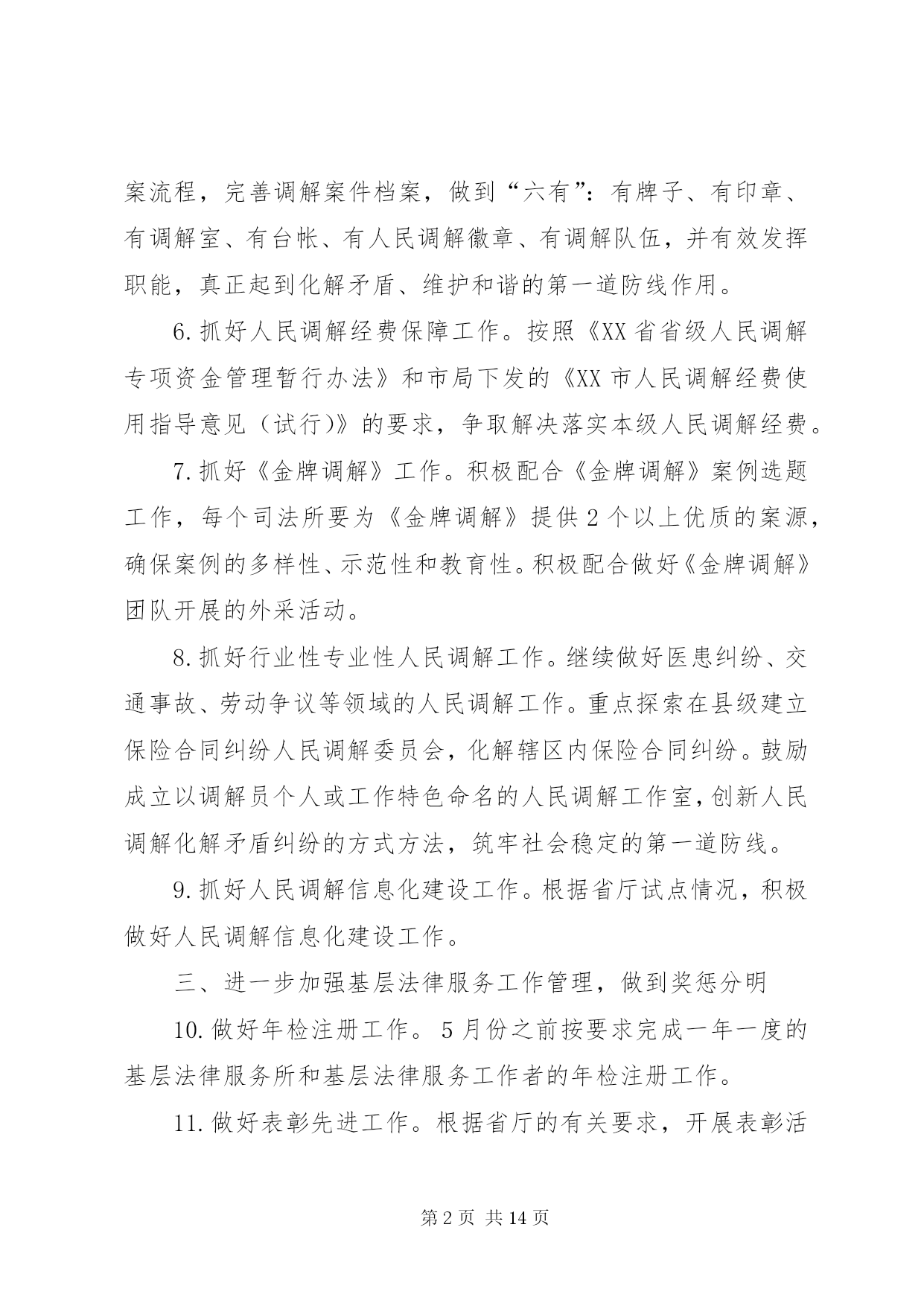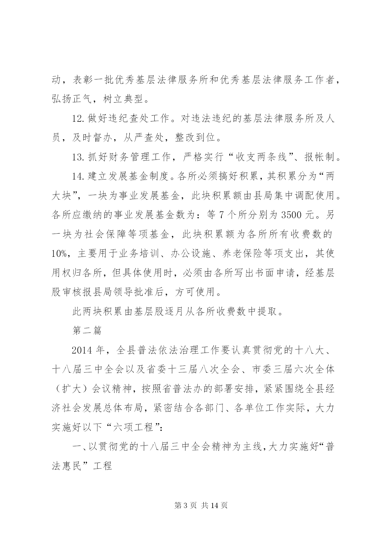 第PAGE\*Arabic\*MERGEFORMAT14页共NUMPAGES\*MERGEFORMAT14页司法行政基层工作要点3篇第一篇2014年,全县司法行政基层工作要全面贯彻落实全省司法行政工作会议、全市政法工作会议精神,坚持以党委政府工作大局为重,认真扎实履行职责,充分发挥司法行政基层工作在社会管理中的积极作用,重点做好以下工作。一、进一步加强司法所规范化建设,全面夯实基层基础1.继续推进“五好司法所”规范化达标创建工作。以“五好司法所”考评标准为抓手,重点做好工作督查、调研指导,全面、深入、持久地提升司法所规范化建设水平。2.加强基础工作管理。提高司法所台账资料管理水平,规范数据统计,按上级要求及时做好信息报送工作。推进信息化在基层业务管理中的应用。3.积极争取党委政府重视,进一步解决司法所人员不足问题,充实基层工作力量。4.积极输送司法所所长参加上级部门的培训班,对司法所长进行业务培训,提高管理司法所的能力水平。二、进一步加强人民调解规范化建设,注重发挥职能5.抓好人民调解组织规范化建设。全面贯彻落实《全市人民调解规范化建设现场推进会》精神,重点抓好村(居、社区)人民调解组织规范化建设,改善办公条件,健全调解场所,规范办案流程,完善调解案件档案,做到“六有”:有牌子、有印章、有调解室、有台帐、有人民调解徽章、有调解队伍,并有效发挥职能,真正起到化解矛盾、维护和谐的第一道防线作用。6.抓好人民调解经费保障工作。按照《XX省省级人民调解专项资金管理暂行办法》和市局下发的《XX市人民调解经费使用指导意见(试行)》的要求,争取解决落实本级人民调解经费。7.抓好《金牌调解》工作。积极配合《金牌调解》案例选题工作,每个司法所要为《金牌调解》提供2个以上优质的案源,确保案例的多样性、示范性和教育性。积极配合做好《金牌调解》团队开展的外采活动。8.抓好行业性专业性人民调解工作。继续做好医患纠纷、交通事故、劳动争议等领域的人民调解工作。重点探索在县级建立保险合同纠纷人民调解委员会,化解辖区内保险合同纠纷。鼓励成立以调解员个人或工作特色命名的人民调解工作室,创新人民调解化解矛盾纠纷的方式方法,筑牢社会稳定的第一道防线。9.抓好人民调解信息化建设工作。根据省厅试点情况,积极做好人民调解信息化建设工作。三、进一步加强基层法律服务工作管理,做到奖惩分明10.做好年检注册工作。5月份之前按要求完成一年一度的基层法律服务所和基层法律服务工作者的年检注册工作。11.做好表彰先进工作。根据省厅的有关要求,开展表彰活动,表彰一批优秀基层法律服务所和优秀基层法律服务工作者,弘扬正气,树立典型。12.做好违纪查处工作。对违法违纪的基层法律服务所及人员,及时督办,从严查处,整改到位。13.抓好财务管理工作,严格实行“收支两条线”、报帐制。14.建立发展基金制度。各所必须搞好积累,其积累分为“两大块”,一块为事业发展基金,此块积累额由县局集中调配使用。各所应缴纳的事业发展基金数为:等7个所分别为3500元。另一块为社会保障等项基金,此块积累额为各所所有收费数的10%,主要用于业务培训、办公设施、养老保险等项支出,其使用权归各所,但具体使用时,必须由各所写出书面申请,经基层股审核报县局领导批准后,方可使用。此两块积累由基层股逐月从各所收费数中提取。第二篇2014年,全县普法依法治理工作要认真贯彻党的十八大、十八届三中全会以及省委十三届八次全会、市委三届六次全体(扩大)会议精神,按照省普法办的部署安排,紧紧围绕全县经济社会发展总体布局,紧密结合各部门、各单位工作实际,大力实施好以下“六项工程”:一、以贯彻党的十八届三中全会精神为主线,大力实施好“普法惠民”工程1.健全完善社会普法教育机制。进一步强化和落实普法依法治理工作组织领导、责任分工、协调配合、工作保障、考核评价等机制和制度建设,有效整合部门、行业、社会组织和基层单位等各方面资源,促进普法依法治理工作由政府推动逐步向社会能动转变,逐步建立健全科学化、常态化的社会普法教育机制。2.强化落实专业法部门的普法责任。贯彻落实《省法制宣传教育工作条例》,指导、支持、督促各级专业法主管部门在负责抓好本部门学法用法工作的同时,通过开展法制宣传月、周、日等形式,按照“谁执法谁普法”的原则,积极面向社会集中开展本部门专业法律法规的宣传教育。3.广泛开展“法律六进”活动。按照“六五”普法规划的要求,配齐配强专职普法教育工作者队伍,健全充实普法讲师团、法制副校长、法制宣传员等社会普法志愿者队伍,并充分发挥其扎根基层、熟悉法律、知晓民情的作用,广泛开展“法律六进”活动。4.积极开展专项依法治理活动。注重抓住重点地区整治、食品药品安全、生态环境保护、特殊人群管理等群众关心的热点、难点问题开展专项依法治理活动