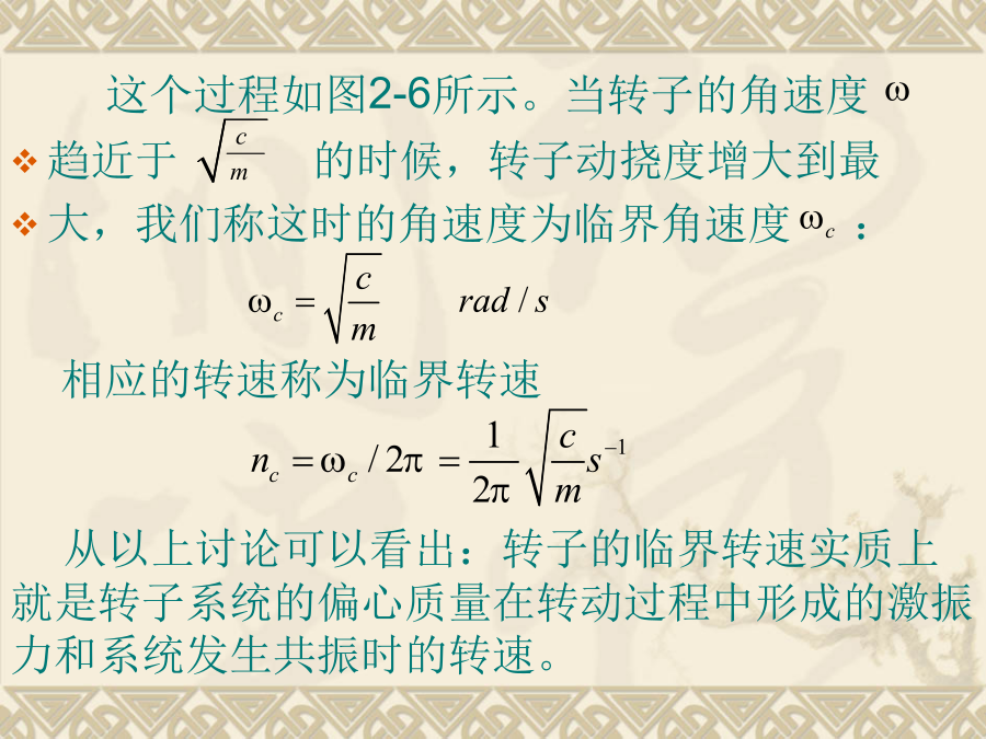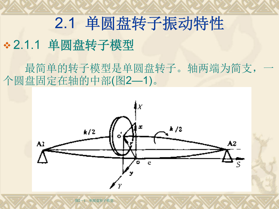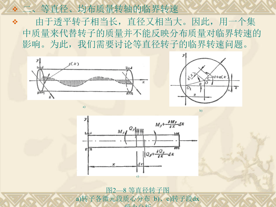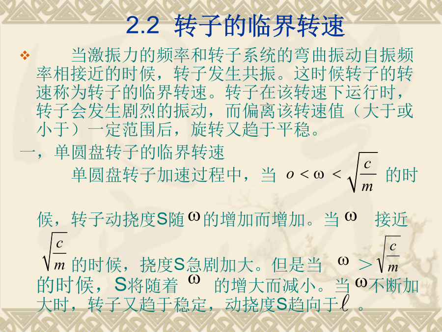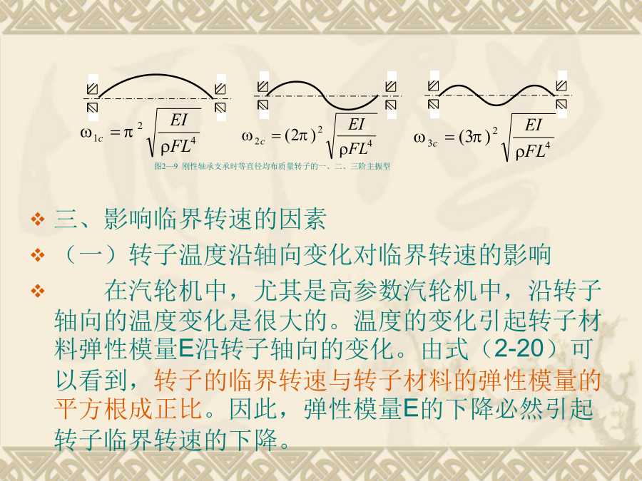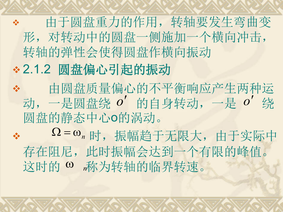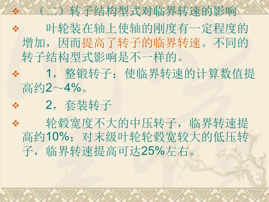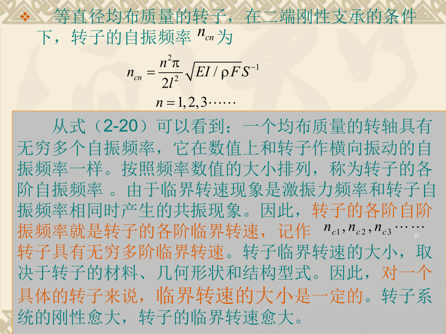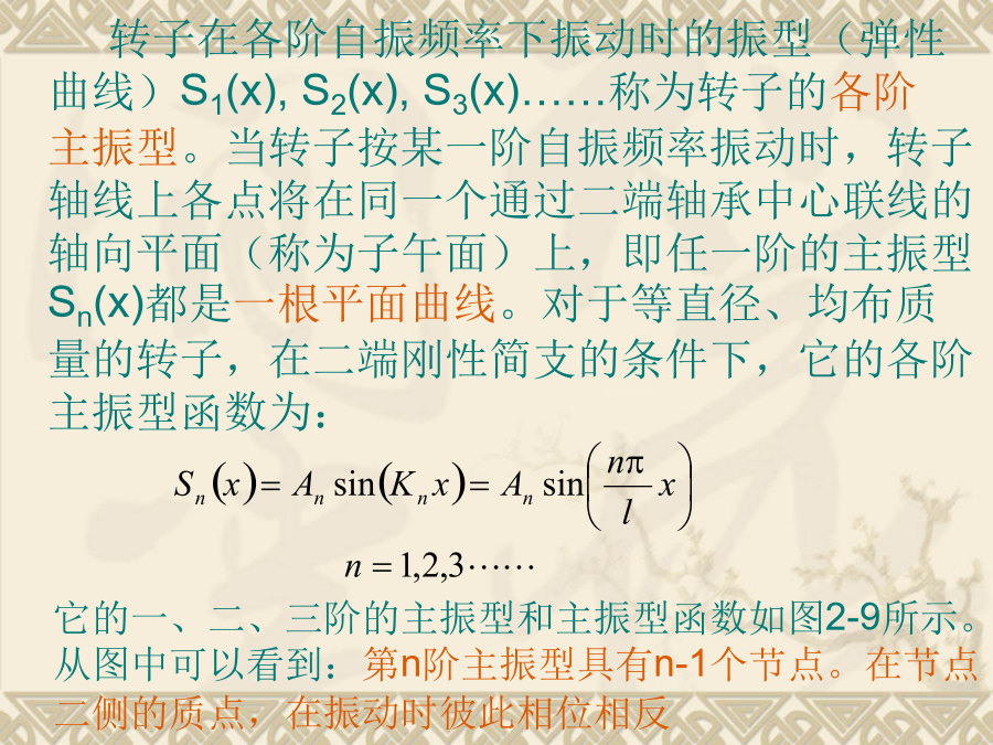 主讲人韩守木华中科技大学2.1单圆盘转子振动特性由于圆盘重力的作用,转轴要发生弯曲变形,对转动中的圆盘一侧施加一个横向冲击,转轴的弹性会使得圆盘作横向振动2.1.2圆盘偏心引起的振动由圆盘质量偏心的不平衡响应产生两种运动,一是圆盘绕的自身转动,一是绕圆盘的静态中心o的涡动。时,振幅趋于无限大,由于实际中存在阻尼,此时振幅会达到一个有限的峰值。这时的称为转轴的临界转速。2.2转子的临界转速这个过程如图2-6所示。当转子的角速度趋近于的时候,转子动挠度增大到最大,我们称这时的角速度为临界角速度:二、等直径、均布质量转轴的临界转速由于透平转子相当长,直径又相当大。因此,用一个集中质量来代替转子的质量并不能反映分布质量对临界转速的影响。为此,我们需要讨论等直径转子的临界转速问题。等直径均布质量的转子,在二端刚性支承的条件下,转子的自振频率为转子在各阶自振频率下振动时的振型(弹性曲线)S1(x),S2(x),S3(x)……称为转子的各阶主振型。当转子按某一阶自振频率振动时,转子轴线上各点将在同一个通过二端轴承中心联线的轴向平面(称为子午面)上,即任一阶的主振型Sn(x)都是一根平面曲线。对于等直径、均布质量的转子,在二端刚性简支的条件下,它的各阶主振型函数为:三、影响临界转速的因素(一)转子温度沿轴向变化对临界转速的影响在汽轮机中,尤其是高参数汽轮机中,沿转子轴向的温度变化是很大的。温度的变化引起转子材料弹性模量E沿转子轴向的变化。由式(2-20)可以看到,转子的临界转速与转子材料的弹性模量的平方根成正比。因此,弹性模量E的下降必然引起转子临界转速的下降。(二)转子结构型式对临界转速的影响叶轮装在轴上使轴的刚度有一定程度的增加,因而提高了转子的临界转速。不同的转子结构型式影响是不一样的。1,整锻转子:使临界转速的计算数值提高约2~4%。2,套装转子轮毂宽度不大的中压转子,临界转速提高约10%;对末级叶轮轮毂宽较大的低压转子,临界转速提高可达25%左右。(三)叶轮回转力矩对临界转速的影响对于直径比较大不是装在两个支承的正中间,甚至装在轴的悬臂端上的圆盘,在作弓形回旋时,将会产生回转力矩,使转子的临界转速发生变化(可能提高,也可能降低)。(四)轴系的临界转速和联轴器对临界转速的影响把一个单跨,二支点的转子连成了一个多支点的转子系统,称为轴系。在轴系中,由于相邻转子通过联轴器连接起来,轴的端部就不再是自由端。转子端部互相作用,就相当于在每个单跨转子的端部多了一个约束条件,使转子的刚性增加,从而引起该转子临界转速的加大。表2-1是国产30万千瓦汽轮发电机组的临界转速计算值。从表中可以看到:轴系的各阶临界转速总比单个转子的临界转速数值大。轴系是用联轴器连接。联轴器的刚性愈大,转子之间连接刚性愈大,因而相对于单个转子,轴系的临界转速升高亦愈多。(五)支承弹性对临界转速的影响实际上轴承座、轴瓦中起支承和润滑作用的油膜都不是绝对刚性的。以国产30万千瓦汽轮机的计算为例,对于单个转子,考虑支承弹性后,高压、中压、低压透平转子的临界转速分别下降了18%、16.3%和40%。。六、转子临界转速的安全标准为了保证转子安全运行,就必须:•尽可能避开共振•对转子进行精确的平衡。如果透平的工作转速n小于转子的第一阶临界转速要求:nc1>(1.2-1.25)n。如果透平的工作转速n在转子的一阶和二阶临界转速之间要求:1.4nc1<n<0.7nc2。我国电力部门提出,对于固定式发电用汽轮发电机组,要求轴系的各阶临界转速一般应与工作转速避开。轴系各阶临界转速的分布应保证机组能够有安全的暖机转速,并进行超速试验。2.3转子振动响应和临界转速一样,不平衡响应可以用计算的方法得到,也可以在现场实测得到。不平衡响应的计算,国外大的汽轮机制造公司对这个特性都有各自的设计规范。如西屋公司的标准指出,对于规定的不平衡量,在转速为25%一85%的工作转速范围内,即3000r/min机组在750—2550r∕min区间,轴系各轴颈的响应峰峰值应小于0.229mm;在转速为85%一125%的工作转速范围内,即3000r∕min机组在2550—3750r/min区间,轴系各轴颈的响应峰峰值应小于0.076mm。2.4轴系稳定性和动压滑动轴承如果转轴受扰动后,轴颈中心随时间的增加而逐渐趋向平衡位置,则认为是稳定的。如果随时间的增加,转子振动的振幅越来越大、或轴颈围绕平衡位置作“涡动”,则认为是不稳定的。轴颈受扰动其中心偏离平衡位置后,新位置的润滑油膜对轴颈产生一作用力,其方向与扰动方向有一偏位角。该作用力为扰动而引起的不平衡力,可分解为两个分力,即一个为沿扰动方向的分力,它是抗拒扰动的,还有一个垂直于扰动方向的分力,推动轴颈绕原