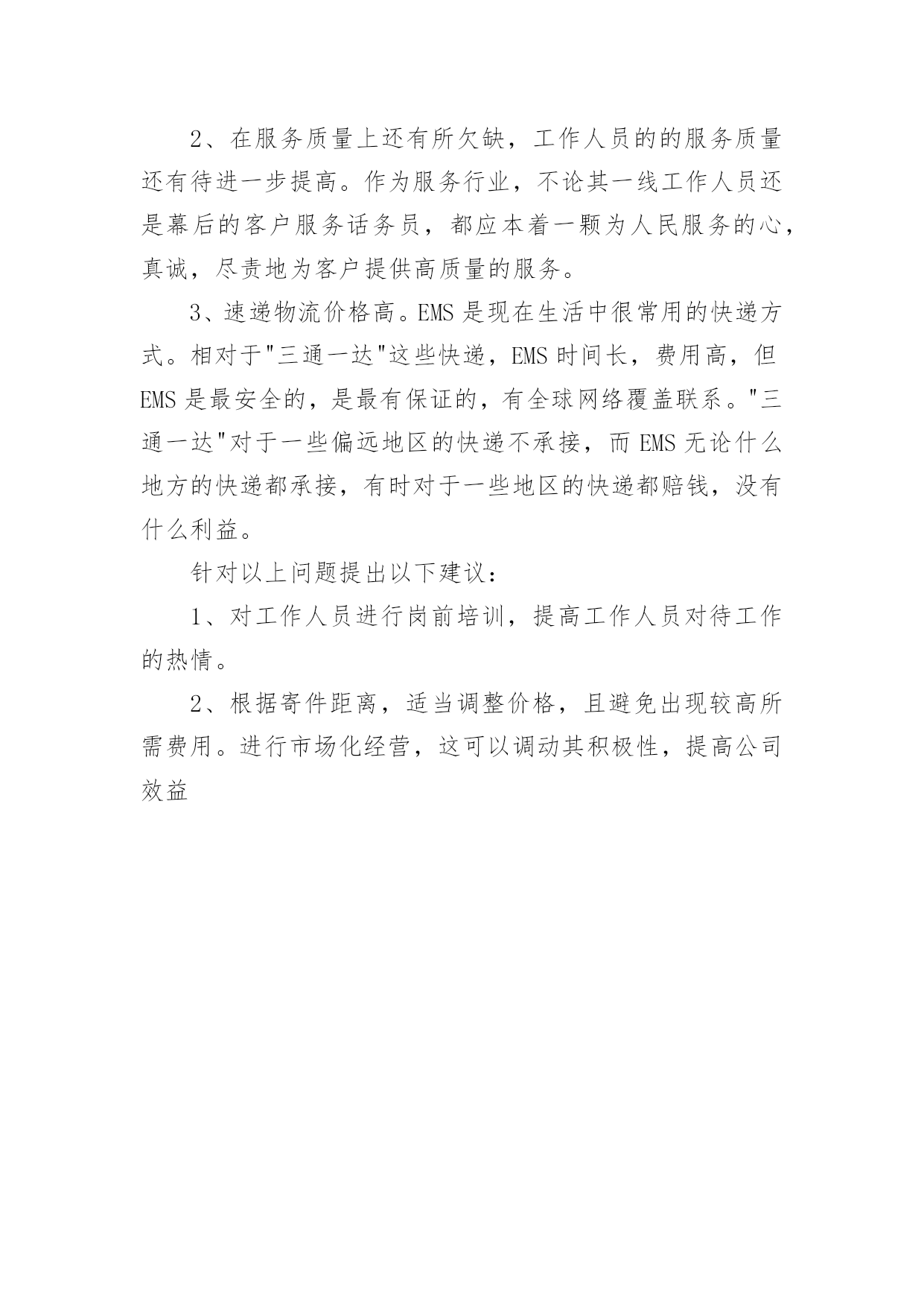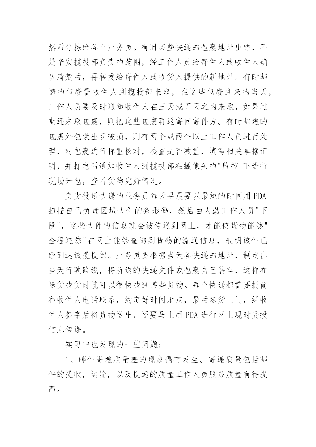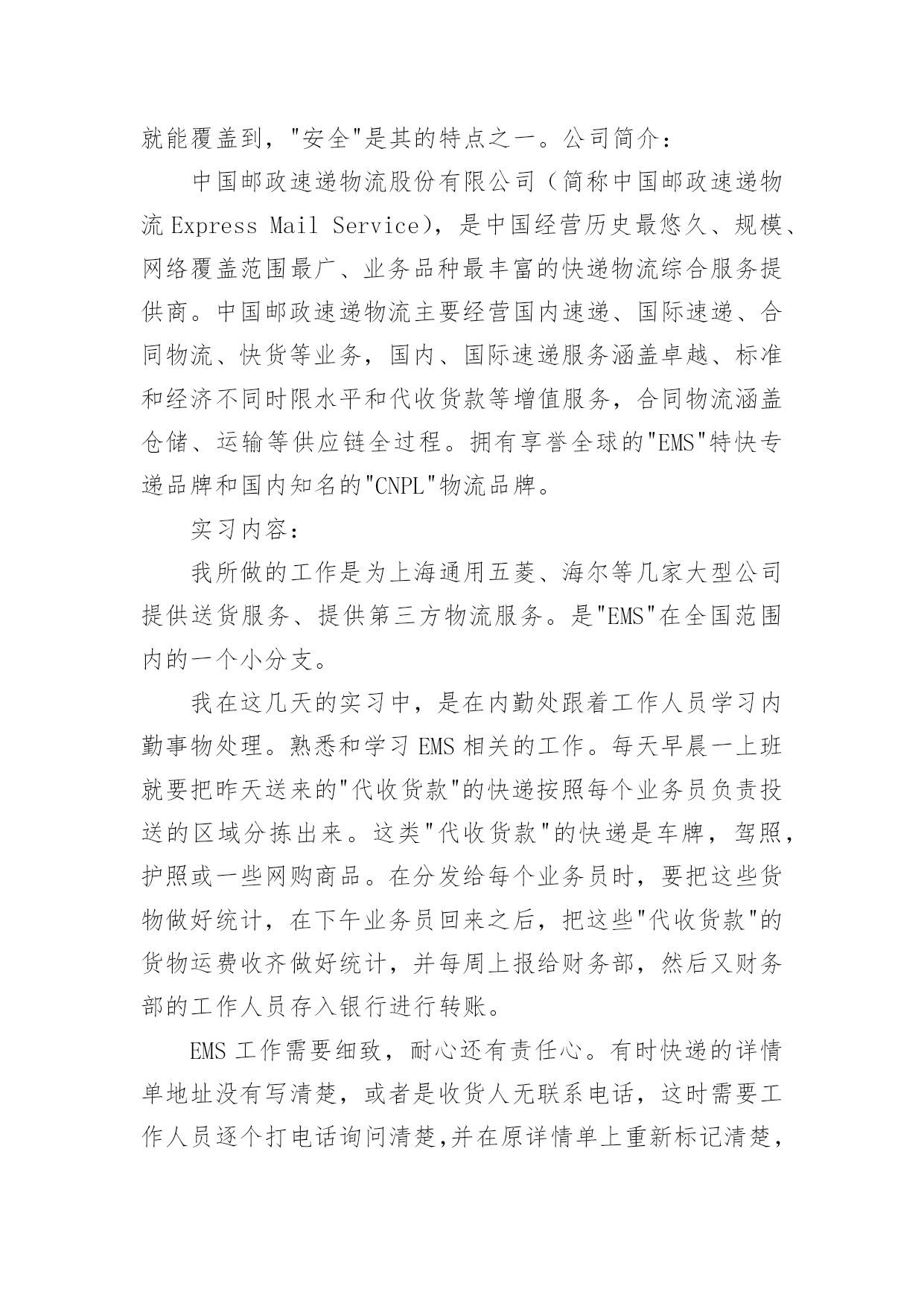 中国邮政物流实习报告在当下社会,报告的使用成为日常生活的常态,报告中涉及到专业性术语要解释清楚。你还在对写报告感到一筹莫展吗?以下是小编精心整理的中国邮政物流实习报告,希望能够帮助到大家。实训时间:20xx年xx月xx日——20xx年xx月xx日实训单位:EMS中国邮政速递物流公司实习目的:把知识与实践相结合,从过程中锻炼自己,提高能力。在老师的全力安排下,我与同学们有幸来到中国邮政速递物流公司实习一周,经过三个学期物流专业的学习,对物流的定义,基本功能,各个作业流程有了一定的理论基础。通过这些天的实习,将理论与实际相关操作相结合,在实践中提高了运用知识的能力,使我受益匪浅,更加了解物流的内部操作与流程。公司简介:中国邮政速递物流公司是中国邮政旗下专业经营和管理全国邮政速递物流业务的现代综合快递物流企业,拥有国内知名的EMS特快专递和CNPL中邮物流等品牌,通达全球200多个国家和地区。物流作为一个服务行业,在于客户之间的沟通中,需谨记"耐心,细心"。中国邮政是一个民族企业,创建的很早,凡是有人在的地方,中国邮政的网络范围就能覆盖到,"安全"是其的特点之一。公司简介:中国邮政速递物流股份有限公司(简称中国邮政速递物流ExpressMailService),是中国经营历史最悠久、规模、网络覆盖范围最广、业务品种最丰富的快递物流综合服务提供商。中国邮政速递物流主要经营国内速递、国际速递、合同物流、快货等业务,国内、国际速递服务涵盖卓越、标准和经济不同时限水平和代收货款等增值服务,合同物流涵盖仓储、运输等供应链全过程。拥有享誉全球的"EMS"特快专递品牌和国内知名的"CNPL"物流品牌。实习内容:我所做的工作是为上海通用五菱、海尔等几家大型公司提供送货服务、提供第三方物流服务。是"EMS"在全国范围内的一个小分支。我在这几天的实习中,是在内勤处跟着工作人员学习内勤事物处理。熟悉和学习EMS相关的工作。每天早晨一上班就要把昨天送来的"代收货款"的快递按照每个业务员负责投送的区域分拣出来。这类"代收货款"的快递是车牌,驾照,护照或一些网购商品。在分发给每个业务员时,要把这些货物做好统计,在下午业务员回来之后,把这些"代收货款"的货物运费收齐做好统计,并每周上报给财务部,然后又财务部的工作人员存入银行进行转账。EMS工作需要细致,耐心还有责任心。有时快递的详情单地址没有写清楚,或者是收货人无联系电话,这时需要工作人员逐个打电话询问清楚,并在原详情单上重新标记清楚,然后分拣给各个业务员。有时某些快递的包裹地址出错,不是辛安揽投部负责的范围,经工作人员给寄件人或收件人确认清楚后,再转发给寄件人或收货人提供的新地址。有时邮递的包裹需收件人到揽投部来取,在这些包裹到来的当天,工作人员要及时通知收件人在三天或五天之内来取,如果过期还未取包裹,则把这些包裹再返寄回寄件方。有时邮递的包裹外包装出现破损,则有两个或两个以上工作人员进行处理,对包裹进行称重核对,核查是否减重,填写相关单据证明,并打电话通知收件人到揽投部在摄像头的"监控"下进行现场开包,查看货物完好情况。负责投送快递的业务员每天早晨要以最短的时间用PDA扫描自己负责区域快件的条形码,然后由内勤工作人员"下段",这些快件的信息就会被传送到网上,才能使货物能够"全程追踪"在网上能够查询到货物的流通信息,表明该件已经到达该揽投部。业务员要根据当天各快递的地址,制定出当天行驶路线,将所送的快递文件或包裹自己装车,这样在送货找货时就可以很快找到某些货物。每个快递都需要提前和收件人电话联系,约定好时间地点,最后送货上门,经收件人签字后将货物送出,还要马上用PDA进行网上现时妥投信息传递。实习中也发现的一些问题:1、邮件寄递质量差的现象偶有发生。寄递质量包括邮件的揽收,运输,以及投递的质量工作人员服务质量有待提高。2、在服务质量上还有所欠缺,工作人员的的服务质量还有待进一步提高。作为服务行业,不论其一线工作人员还是幕后的客户服务话务员,都应本着一颗为人民服务的心,真诚,尽责地为客户提供高质量的服务。3、速递物流价格高。EMS是现在生活中很常用的快递方式。相对于"三通一达"这些快递,EMS时间长,费用高,但EMS是最安全的,是最有保证的,有全球网络覆盖联系。"三通一达"对于一些偏远地区的快递不承接,而EMS无论什么地方的快递都承接,有时对于一些地区的快递都赔钱,没有什么利益。针对以上问题提出以下建议:1、对工作人员进行岗前培训,提高工作人员对待工作的热情。2、根据寄件距离,适当调整价格,且避免出现较高所需费用。进行市场化经营,这可以调动其积极性,提高公司效益