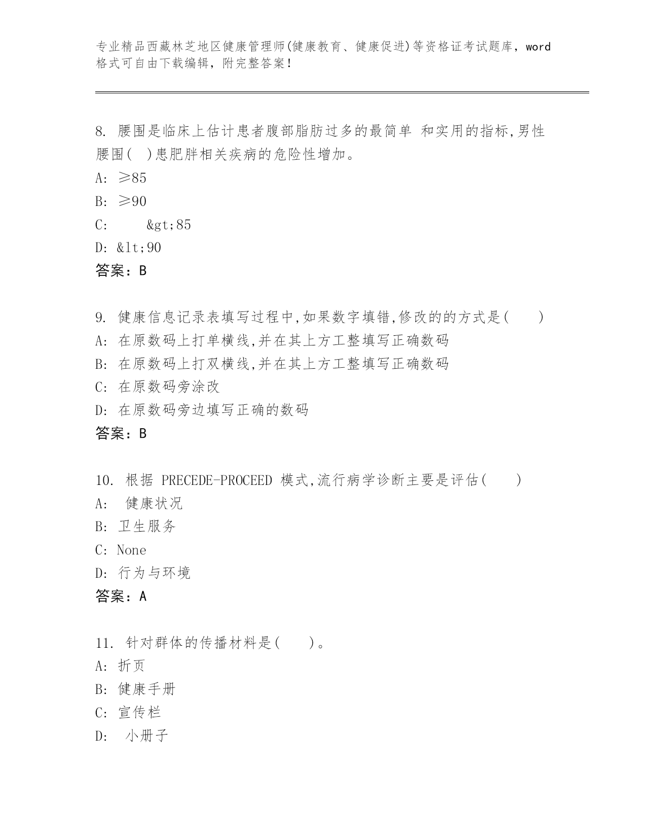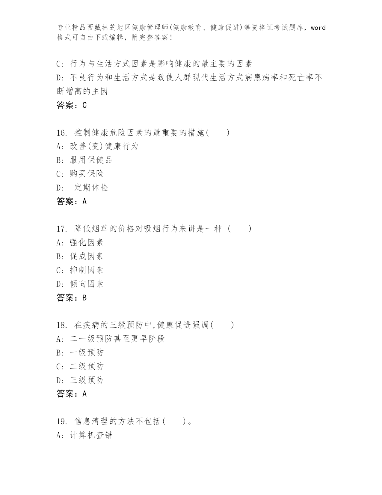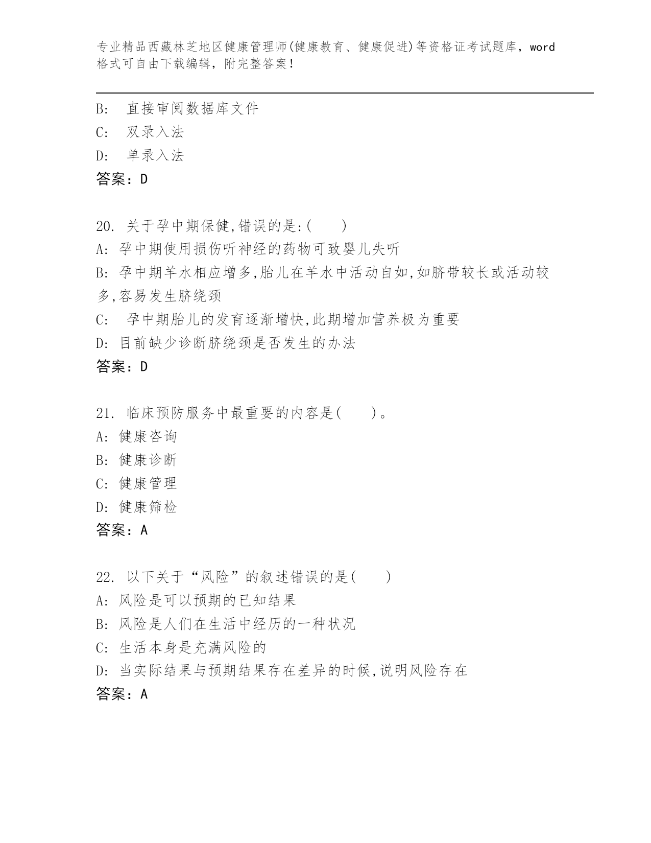 精编西藏林芝地区健康管理师(健康教育、健康促进)等资格证考试精品题库(轻巧夺冠)