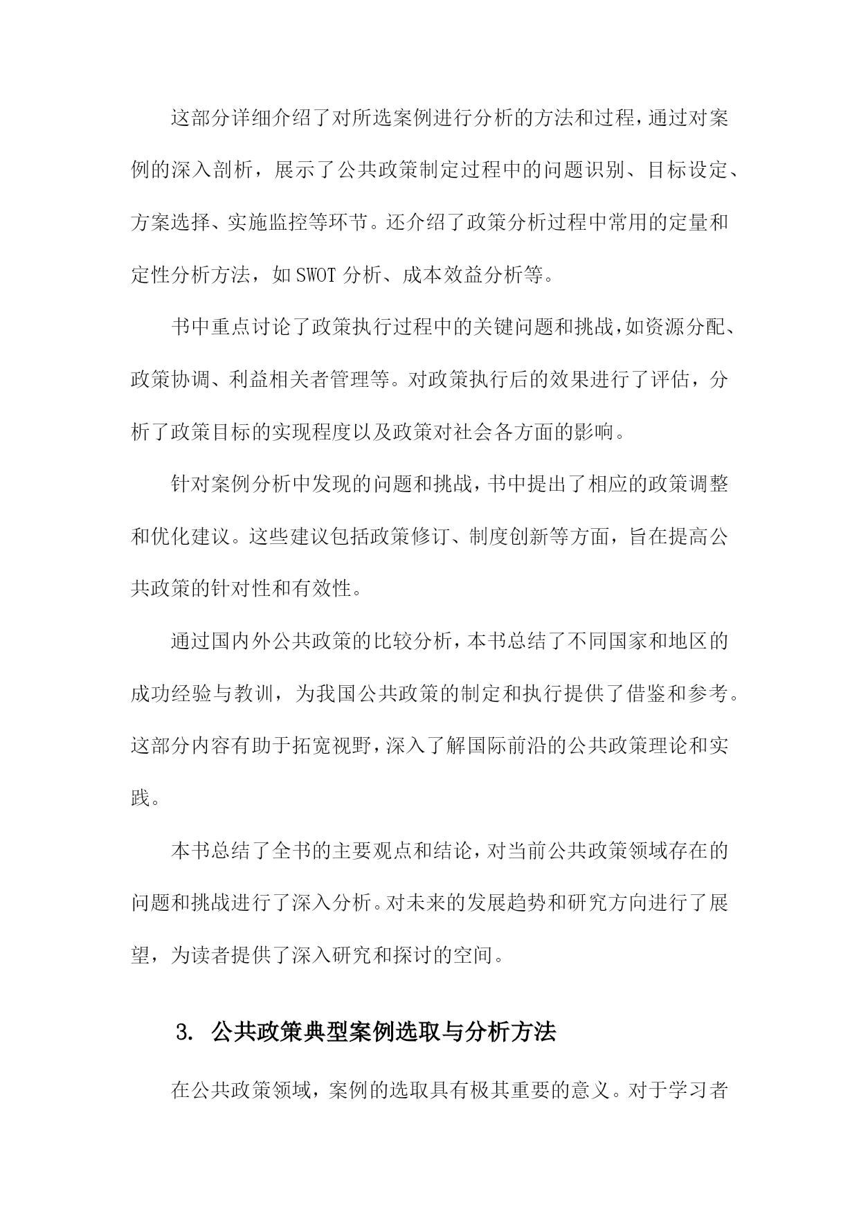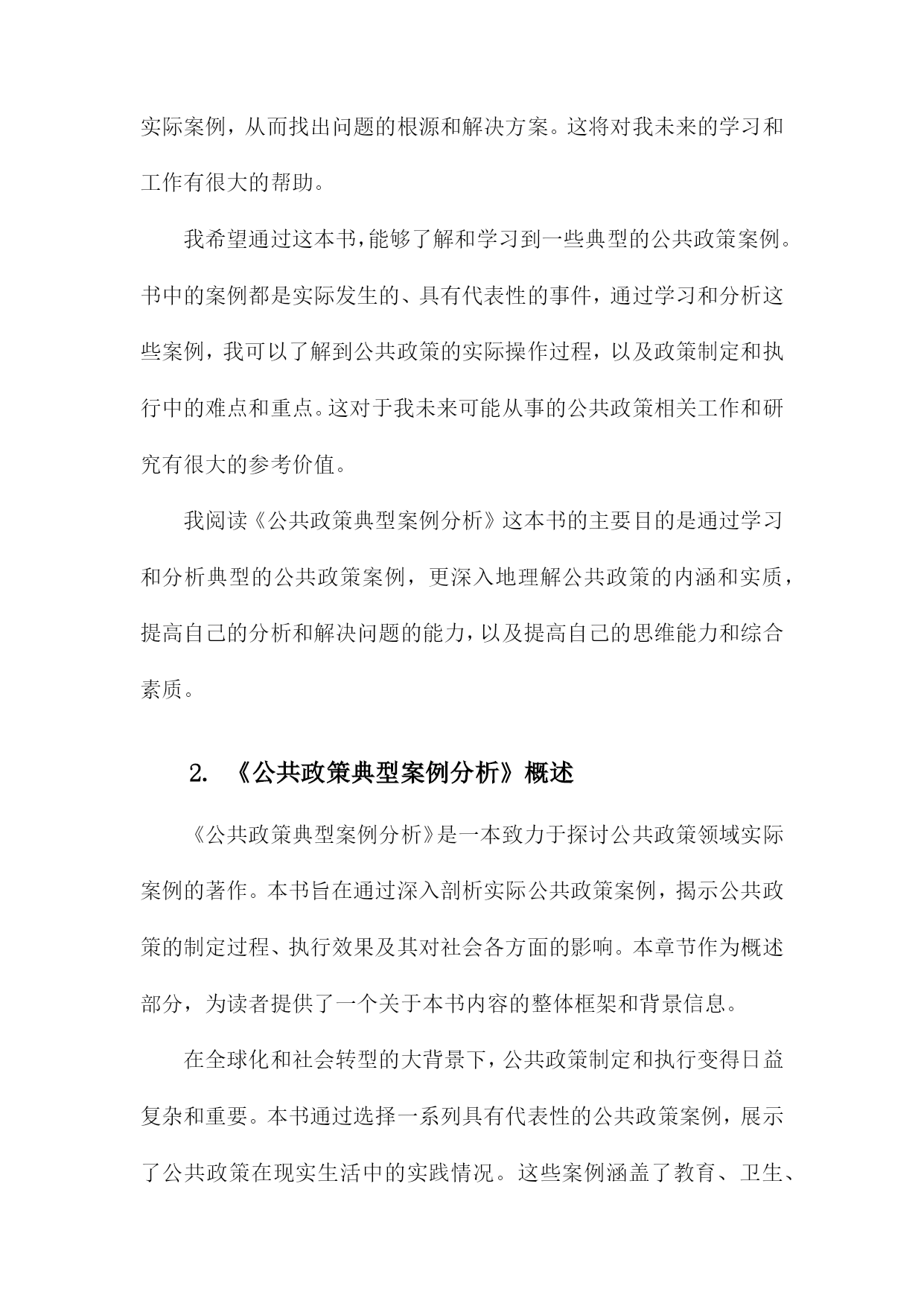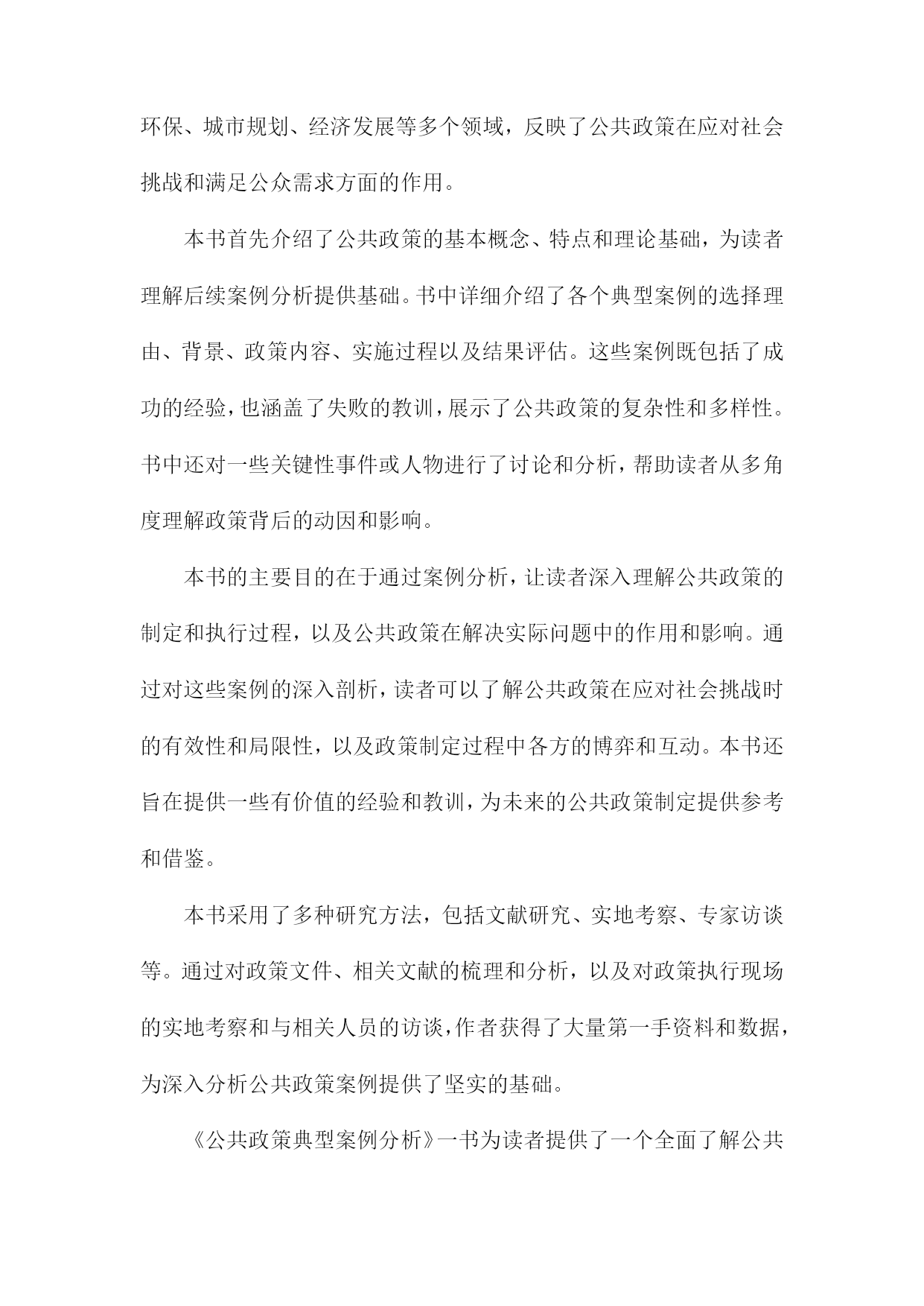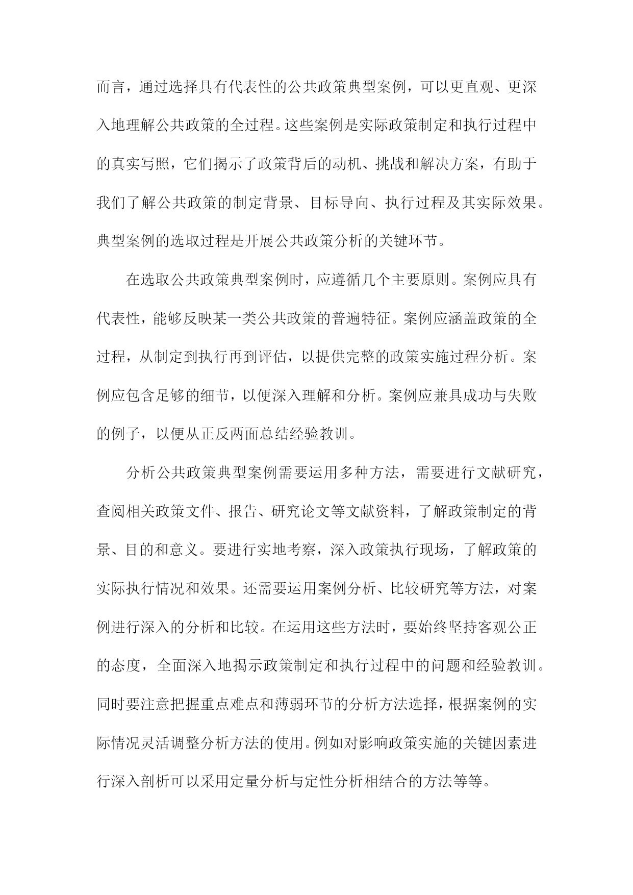 《公共政策典型案例分析》读书笔记1.内容概览在我最近阅读的《公共政策典型案例分析》我找到了对公共政策及其相关案例的深入理解。这本书集结了多个公共政策的典型案例,通过对这些案例的详细分析,揭示了公共政策的制定过程、执行效果以及面临的挑战。接下来是我对这本书的内容概览。本书介绍了公共政策的基本概念及其重要性,公共政策是政府在公众利益和公众需求的基础上制定的行动方案,其目的是解决社会问题,满足公众需求,促进社会公平和公正。书中详细阐述了公共政策的定义、特点、制定过程以及执行过程。书中通过多个典型案例展示了公共政策的实际应用,这些案例涵盖了教育、环境保护、经济发展、社会福利等各个领域。每个案例都包括背景介绍、政策制定过程、执行过程以及评估结果。这些案例既有成功的经验,也有失败的教训,为读者提供了丰富的实际情境。在案例分析部分,我特别关注了政策制定过程中的利益平衡和公众参与。政策制定过程中需要考虑到各方的利益和需求,这就需要政府进行有效的利益平衡和协调。公众参与也是政策制定过程中的重要环节,公众的意见和建议可以为政策制定提供重要的参考。书中还探讨了公共政策面临的挑战,包括政策执行过程中的阻力、政策效果评估的困难以及政策创新等。这些挑战是公共政策实施过程中普遍存在的问题,也是政策制定者需要思考和解决的问题。本书对公共政策的未来发展趋势进行了展望,随着社会的变化和发展,公共政策也需要不断适应新的环境和新的挑战。书中提出了对未来公共政策发展的预测和期待,为读者提供了思考的方向。《公共政策典型案例分析》是一本对公共政策进行深入剖析的书籍。通过对典型案例的分析,我对公共政策的制定、执行和评估有了更深入的理解。这本书为我提供了一个学习和研究公共政策的窗口,让我对公共政策的复杂性和挑战性有了更深的认识。1.1背景介绍在当前社会背景下,公共政策的制定和实施对于国家和社会的发展起着至关重要的作用。为了更好地理解公共政策的内涵、过程及效果,我选择了《公共政策典型案例分析》这本书进行深入阅读。本书集结了多个典型的公共政策案例,通过详尽的分析和解读,帮助读者深入了解公共政策的实际操作及其背后的复杂因素。在现代社会,公共政策涉及领域广泛,包括环境保护、教育改革、经济发展、社会保障等。这些政策的制定和实施,往往关系到广大民众的利益和社会的稳定。对公共政策进行深入研究,不仅有助于政府更好地治理国家,也有助于民众更好地理解和参与公共决策过程。我选择阅读这本书的初衷,是为了增强自己对公共政策的理解和认识,以期能在实际生活中更好地关注和参与公共政策的制定和实施。通过阅读这本书,我期望能够了解到公共政策制定的背后逻辑,理解政策实施过程中的难点和痛点,以及政策实施后对社会和民众产生的影响。《公共政策典型案例分析》这本书对于了解和研究公共政策具有重要的价值。通过阅读这本书,我对于公共政策的认知将更加深入,也将更加关注现实生活中的公共政策问题。我将详细记录我在阅读这本书过程中的所思所感。1.2读书目的我希望通过这本书,能够更深入地理解公共政策的内涵和实质。作为一名对公共政策感兴趣的学生,我认识到理解公共政策的重要性,它是政府管理社会、解决公共问题的重要手段。书本上的理论知识往往抽象且难以直接应用,我希望通过案例分析的方式,将理论与实际相结合,更直观地理解公共政策的实际操作和效果。我想提高自己的分析和解决问题的能力,案例分析是一种很好的实践方法,它可以帮助我提高分析问题和解决问题的能力。在阅读这本书的过程中,我将跟随作者的引导,学习如何运用理论知识去分析实际案例,从而找出问题的根源和解决方案。这将对我未来的学习和工作有很大的帮助。我希望通过这本书,能够了解和学习到一些典型的公共政策案例。书中的案例都是实际发生的、具有代表性的事件,通过学习和分析这些案例,我可以了解到公共政策的实际操作过程,以及政策制定和执行中的难点和重点。这对于我未来可能从事的公共政策相关工作和研究有很大的参考价值。我阅读《公共政策典型案例分析》这本书的主要目的是通过学习和分析典型的公共政策案例,更深入地理解公共政策的内涵和实质,提高自己的分析和解决问题的能力,以及提高自己的思维能力和综合素质。2.《公共政策典型案例分析》概述《公共政策典型案例分析》是一本致力于探讨公共政策领域实际案例的著作。本书旨在通过深入剖析实际公共政策案例,揭示公共政策的制定过程、执行效果及其对社会各方面的影响。本章节作为概述部分,为读者提供了一个关于本书内容的整体框架和背景信息。在全球化和社会转型的大背景下,公共政策制定和执行变得日益复杂和重要。本书通过选择一系列具有代表性的公共政策案例,展示了公共政策在现实生活中的实践情况。这些案例涵盖了教育、卫生、环保、城市规划、经济发展等多个领域,反映了公共政