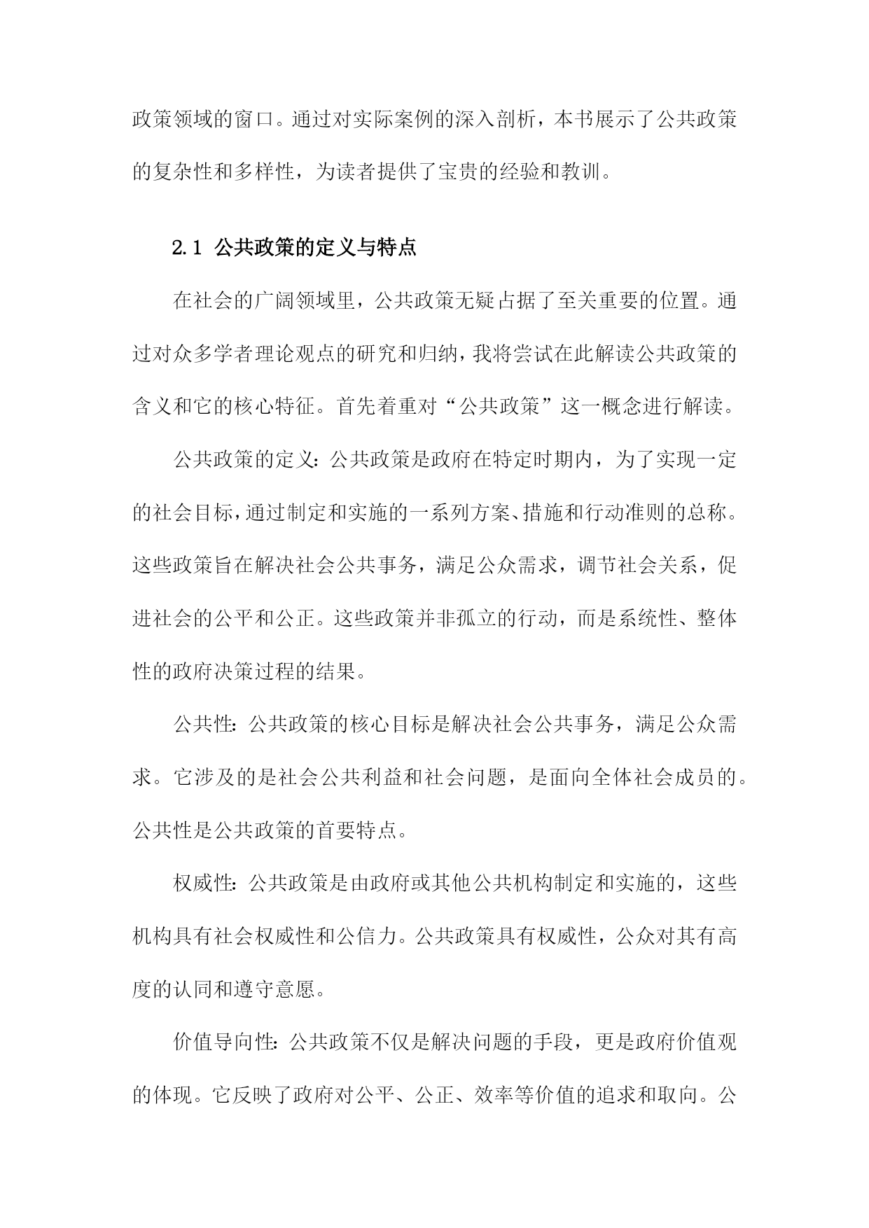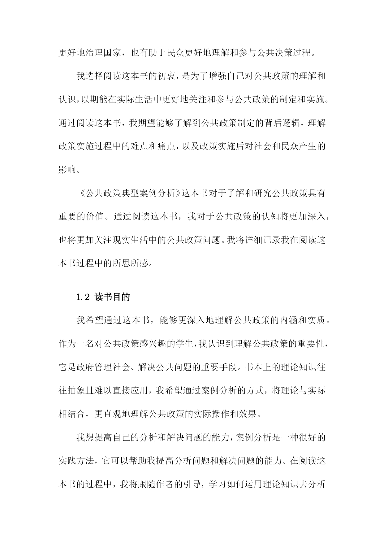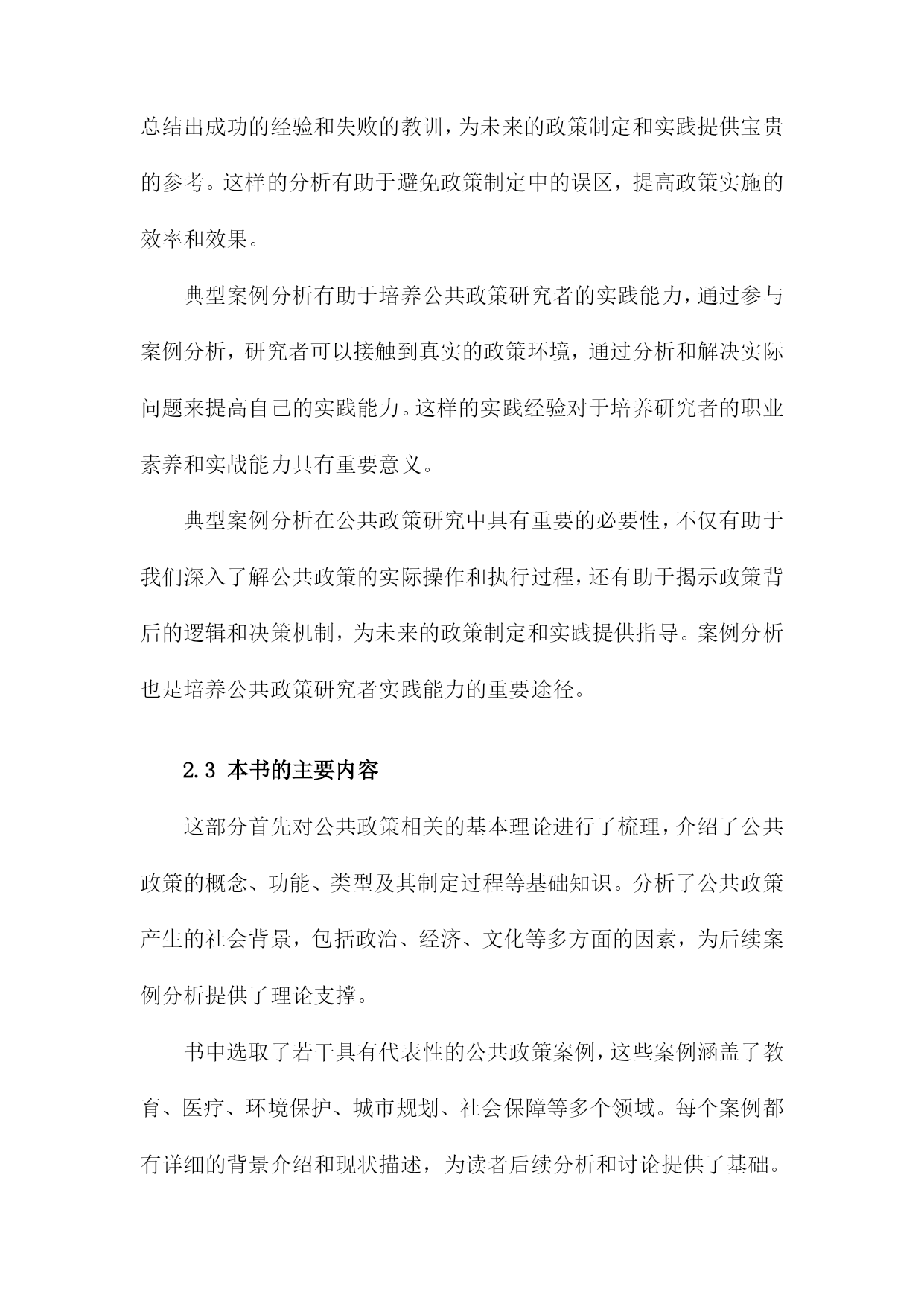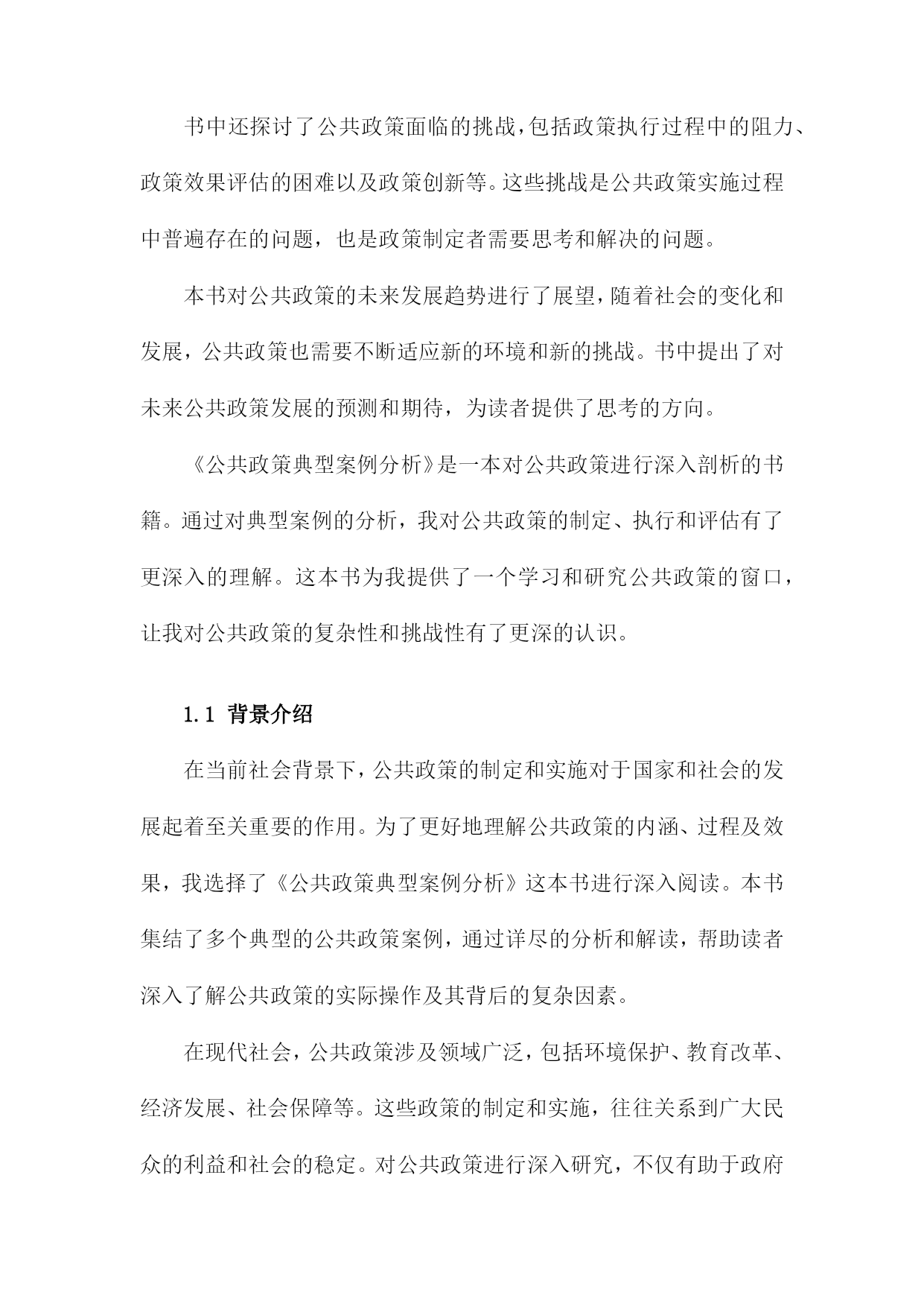 《公共政策典型案例分析》读书笔记1.内容概览在我最近阅读的《公共政策典型案例分析》我找到了对公共政策及其相关案例的深入理解。这本书集结了多个公共政策的典型案例,通过对这些案例的详细分析,揭示了公共政策的制定过程、执行效果以及面临的挑战。接下来是我对这本书的内容概览。本书介绍了公共政策的基本概念及其重要性,公共政策是政府在公众利益和公众需求的基础上制定的行动方案,其目的是解决社会问题,满足公众需求,促进社会公平和公正。书中详细阐述了公共政策的定义、特点、制定过程以及执行过程。书中通过多个典型案例展示了公共政策的实际应用,这些案例涵盖了教育、环境保护、经济发展、社会福利等各个领域。每个案例都包括背景介绍、政策制定过程、执行过程以及评估结果。这些案例既有成功的经验,也有失败的教训,为读者提供了丰富的实际情境。在案例分析部分,我特别关注了政策制定过程中的利益平衡和公众参与。政策制定过程中需要考虑到各方的利益和需求,这就需要政府进行有效的利益平衡和协调。公众参与也是政策制定过程中的重要环节,公众的意见和建议可以为政策制定提供重要的参考。书中还探讨了公共政策面临的挑战,包括政策执行过程中的阻力、政策效果评估的困难以及政策创新等。这些挑战是公共政策实施过程中普遍存在的问题,也是政策制定者需要思考和解决的问题。本书对公共政策的未来发展趋势进行了展望,随着社会的变化和发展,公共政策也需要不断适应新的环境和新的挑战。书中提出了对未来公共政策发展的预测和期待,为读者提供了思考的方向。《公共政策典型案例分析》是一本对公共政策进行深入剖析的书籍。通过对典型案例的分析,我对公共政策的制定、执行和评估有了更深入的理解。这本书为我提供了一个学习和研究公共政策的窗口,让我对公共政策的复杂性和挑战性有了更深的认识。1.1背景介绍在当前社会背景下,公共政策的制定和实施对于国家和社会的发展起着至关重要的作用。为了更好地理解公共政策的内涵、过程及效果,我选择了《公共政策典型案例分析》这本书进行深入阅读。本书集结了多个典型的公共政策案例,通过详尽的分析和解读,帮助读者深入了解公共政策的实际操作及其背后的复杂因素。在现代社会,公共政策涉及领域广泛,包括环境保护、教育改革、经济发展、社会保障等。这些政策的制定和实施,往往关系到广大民众的利益和社会的稳定。对公共政策进行深入研究,不仅有助于政府更好地治理国家,也有助于民众更好地理解和参与公共决策过程。我选择阅读这本书的初衷,是为了增强自己对公共政策的理解和认识,以期能在实际生活中更好地关注和参与公共政策的制定和实施。通过阅读这本书,我期望能够了解到公共政策制定的背后逻辑,理解政策实施过程中的难点和痛点,以及政策实施后对社会和民众产生的影响。《公共政策典型案例分析》这本书对于了解和研究公共政策具有重要的价值。通过阅读这本书,我对于公共政策的认知将更加深入,也将更加关注现实生活中的公共政策问题。我将详细记录我在阅读这本书过程中的所思所感。1.2读书目的我希望通过这本书,能够更深入地理解公共政策的内涵和实质。作为一名对公共政策感兴趣的学生,我认识到理解公共政策的重要性,它是政府管理社会、解决公共问题的重要手段。书本上的理论知识往往抽象且难以直接应用,我希望通过案例分析的方式,将理论与实际相结合,更直观地理解公共政策的实际操作和效果。我想提高自己的分析和解决问题的能力,案例分析是一种很好的实践方法,它可以帮助我提高分析问题和解决问题的能力。在阅读这本书的过程中,我将跟随作者的引导,学习如何运用理论知识去分析实际案例,从而找出问题的根源和解决方案。这将对我未来的学习和工作有很大的帮助。我希望通过这本书,能够了解和学习到一些典型的公共政策案例。书中的案例都是实际发生的、具有代表性的事件,通过学习和分析这些案例,我可以了解到公共政策的实际操作过程,以及政策制定和执行中的难点和重点。这对于我未来可能从事的公共政策相关工作和研究有很大的参考价值。我阅读《公共政策典型案例分析》这本书的主要目的是通过学习和分析典型的公共政策案例,更深入地理解公共政策的内涵和实质,提高自己的分析和解决问题的能力,以及提高自己的思维能力和综合素质。2.《公共政策典型案例分析》概述《公共政策典型案例分析》是一本致力于探讨公共政策领域实际案例的著作。本书旨在通过深入剖析实际公共政策案例,揭示公共政策的制定过程、执行效果及其对社会各方面的影响。本章节作为概述部分,为读者提供了一个关于本书内容的整体框架和背景信息。在全球化和社会转型的大背景下,公共政策制定和执行变得日益复杂和重要。本书通过选择一系列具有代表性的公共政策案例,展示了公共政策在现实生活中的实践情况。这些案例涵盖了教育、卫生、环保、城市规划、经济发展等多个领域,反映了公共政