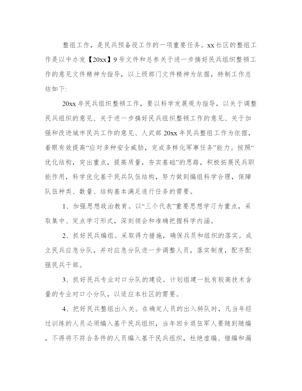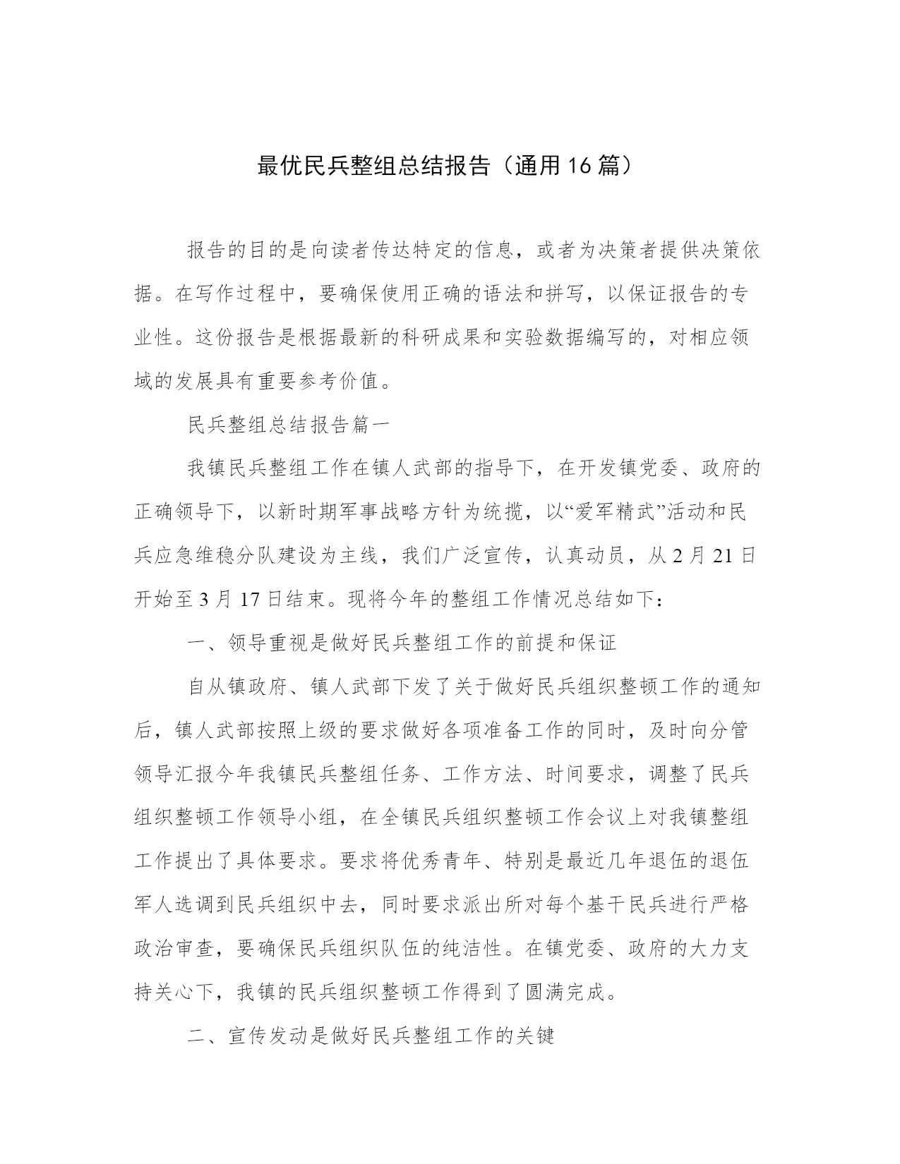 最优民兵整组总结报告(通用16篇)报告的目的是向读者传达特定的信息,或者为决策者提供决策依据。在写作过程中,要确保使用正确的语法和拼写,以保证报告的专业性。这份报告是根据最新的科研成果和实验数据编写的,对相应领域的发展具有重要参考价值。民兵整组总结报告篇一我镇民兵整组工作在镇人武部的指导下,在开发镇党委、政府的正确领导下,以新时期军事战略方针为统揽,以“爱军精武”活动和民兵应急维稳分队建设为主线,我们广泛宣传,认真动员,从2月21日开始至3月17日结束。现将今年的整组工作情况总结如下:一、领导重视是做好民兵整组工作的前提和保证自从镇政府、镇人武部下发了关于做好民兵组织整顿工作的通知后,镇人武部按照上级的要求做好各项准备工作的同时,及时向分管领导汇报今年我镇民兵整组任务、工作方法、时间要求,调整了民兵组织整顿工作领导小组,在全镇民兵组织整顿工作会议上对我镇整组工作提出了具体要求。要求将优秀青年、特别是最近几年退伍的退伍军人选调到民兵组织中去,同时要求派出所对每个基干民兵进行严格政治审查,要确保民兵组织队伍的纯洁性。在镇党委、政府的大力支持关心下,我镇的民兵组织整顿工作得到了圆满完成。二、宣传发动是做好民兵整组工作的关键各村(居)委会结合各自整组任务,充分利用调查摸底的有利时机,采取张贴标语、专题板报等多种形式大张旗鼓地开展宣传发动工作,整组期间,共张贴标语近200张。通过宣传,全镇广大适龄青年积极要求参加民兵组织,同时使全体基干民兵进一步端正思想,提高对民兵组织的认识,认清了加强民兵组织建设的现实意义,理清了建立民兵组织与经济发展是相辅相成的关系,并且认识到民兵组织建设在整个武装力量建设中的地位和作用,在全社会形成了一个关心、支持民兵组织调整的良好社会氛围。三、科学编组是做好民兵整组工作的落脚点本着有利于领导、有利于提高质量、有利于执行任务的原则进行科学编组。今年镇政府、镇人武部下达我镇的任务数为镇应急独立排45人、步兵分队223人(其中步兵十连109人、82迫7、8连174人)、普通民兵4149人。通过编组,我镇现有基干民兵268人,退伍军人214人。在做好编组的同时,配优配强民兵干部,将年龄偏大、业务能力比较弱的民兵干部调整出民兵组织,将年富力强、政治思想好、业务能力强的村(居)干部、企业负责人调整到民兵组织负责人的岗位上,及时做好出队人员的思想工作,健全完善了各项规章制度。四、选优配强是做好民兵整组工作的根本适应新形势,认真做好民兵干部管理工作。整组中我们重点调整了民兵干部素质情况,通过调查发现带普遍性的问题。一是民兵干部自身素质差,少数民兵干部年龄偏大;二是一些干部有失落感,随着价值观念的改变,造成了部分干部心理上只求配齐,忽略了配强;三是对干部的任免未按照上级规定程序进行。针对上述情况,我们做了以下几个方面的工作:一是注意选干工作,把那些政治思想好,年龄较轻具有一定文化水平和军政素质好,热爱民兵工作的同志,特别是退伍军人的优先挑到民兵干部队伍中来;二是严格任免手续,目前民兵干部的任免已基本走上正轨;三是加大了民兵干部的军训力度,提高整体素质;四是加强了民兵干部的管理教育工作。针对不同年龄段的情况作了认真分析,把政治素质好,思想品质高的.作为民兵整组对象。今年的整组工作得到了镇党委、政府、镇直各有关单位、各村(居)委会的高度重视,与往年相比有新的突破与进展,为全镇20民兵预备役工作打下了良好基础。民兵整组总结报告篇二根据军分区和市武装部年度整组工作指示精神,我镇xx年度民兵整组工作在镇党委、政府、人武部的精心安排和部署下,整组工作从2月10日开始至3月25日结束。经过调查摸底,出入转队,政治审查,造册登记和点验等阶段工作,按照编组原则,圆满完成338名基干民兵编组任务。经过整组,全乡共编基干民兵步兵连2个,233人,镇属民兵应急排1个,30人,通信连有限排1个,25人,公路抢修分队1个,50人。所编民兵思想稳定,队伍纯洁,结构合理,均符合条件。其主要做法是:该项工作开展伊始,镇领导高度重视,专题召开党委会议分析民兵整组工作,制定措施方案;召开民兵连干部会,安排部署整组工作。向各村民兵连和有关单位下发了整组通知,责任到人,抓好该项工作的落实。在连部建设上,镇上在人力、物力和财力上高度倾斜,加大工作力度。各村、民兵连接到通知后行动迅速,均能指派专人负责。为工作的顺利开展和保证民兵队伍质量打下了坚实的基础。宣传阶段,镇上武装部利用布告、标语、横幅等宣传工具,大张旗鼓,大造声势,大力宣传兵役法、国防法。各村民兵连也相应用板报、标语、横幅等进行宣传民兵整组工作,基本上做到了家喻户晓。据不完全统计,全镇共刷写民兵整组标语100多条,悬挂横幅5条。宣传工作好的村有花垸村、吴垸村、马溪居委会、唐李村等。