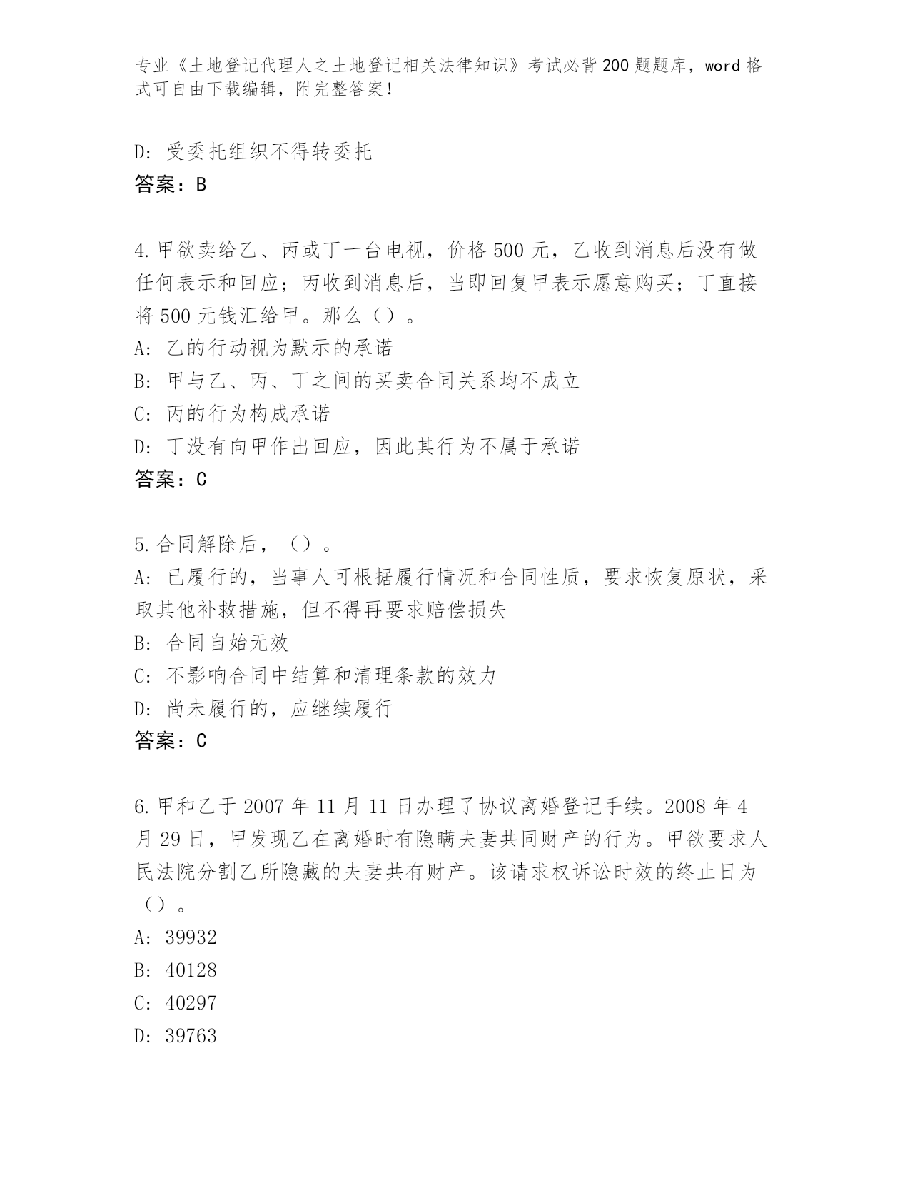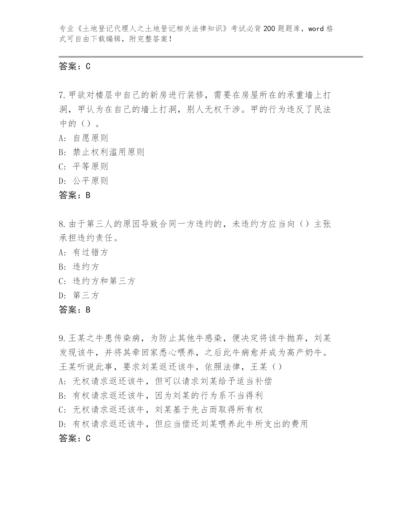 2024黑龙江省泰来县《土地登记代理人之土地登记相关法律知识》资格考试必刷200题真题(网校专用)