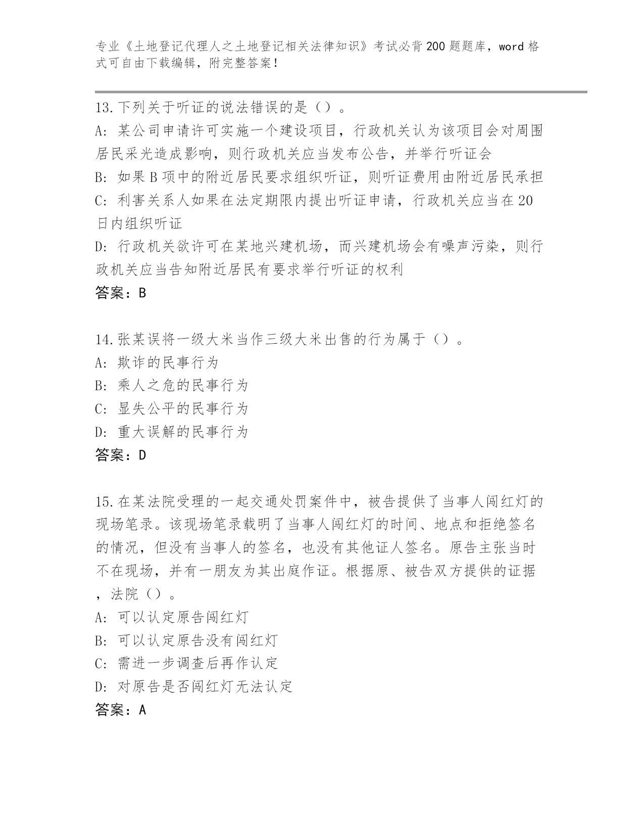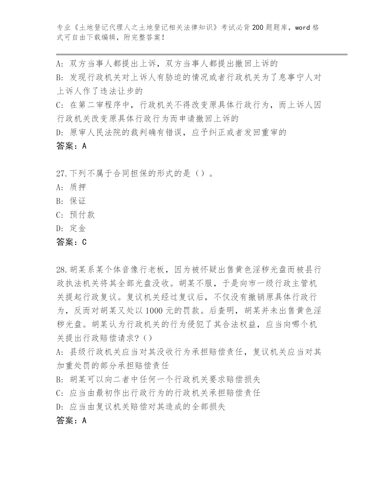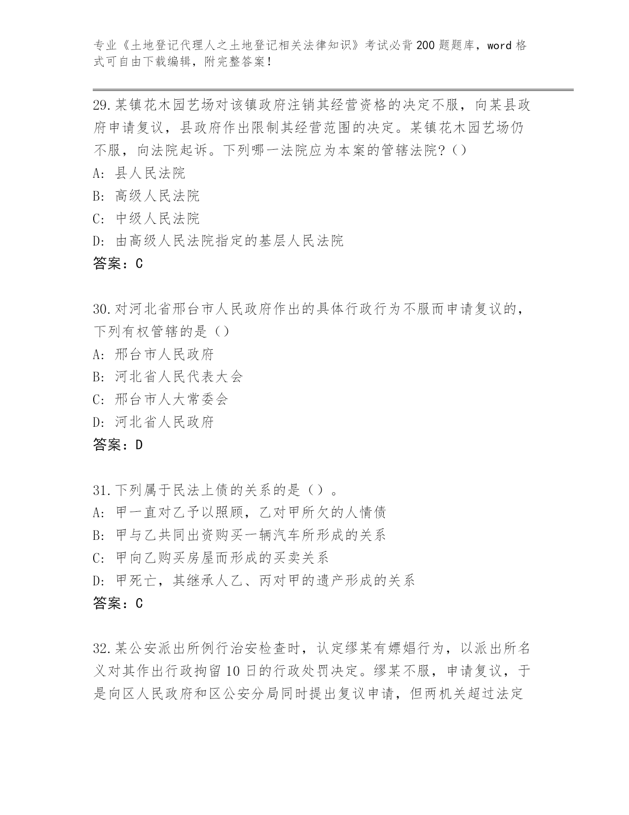 安徽省内部使用《土地登记代理人之土地登记相关法律知识》考试必背200题题库大全含解析答案