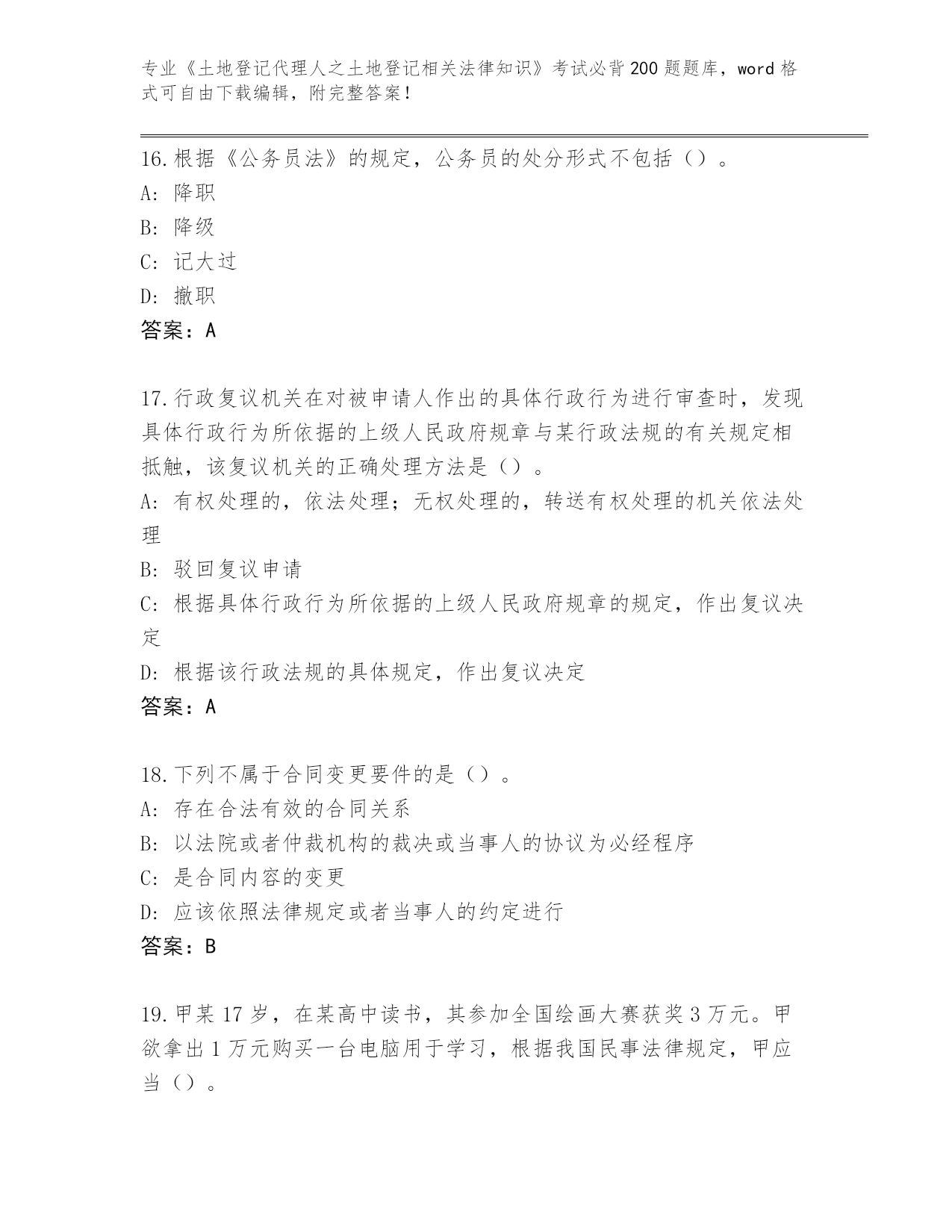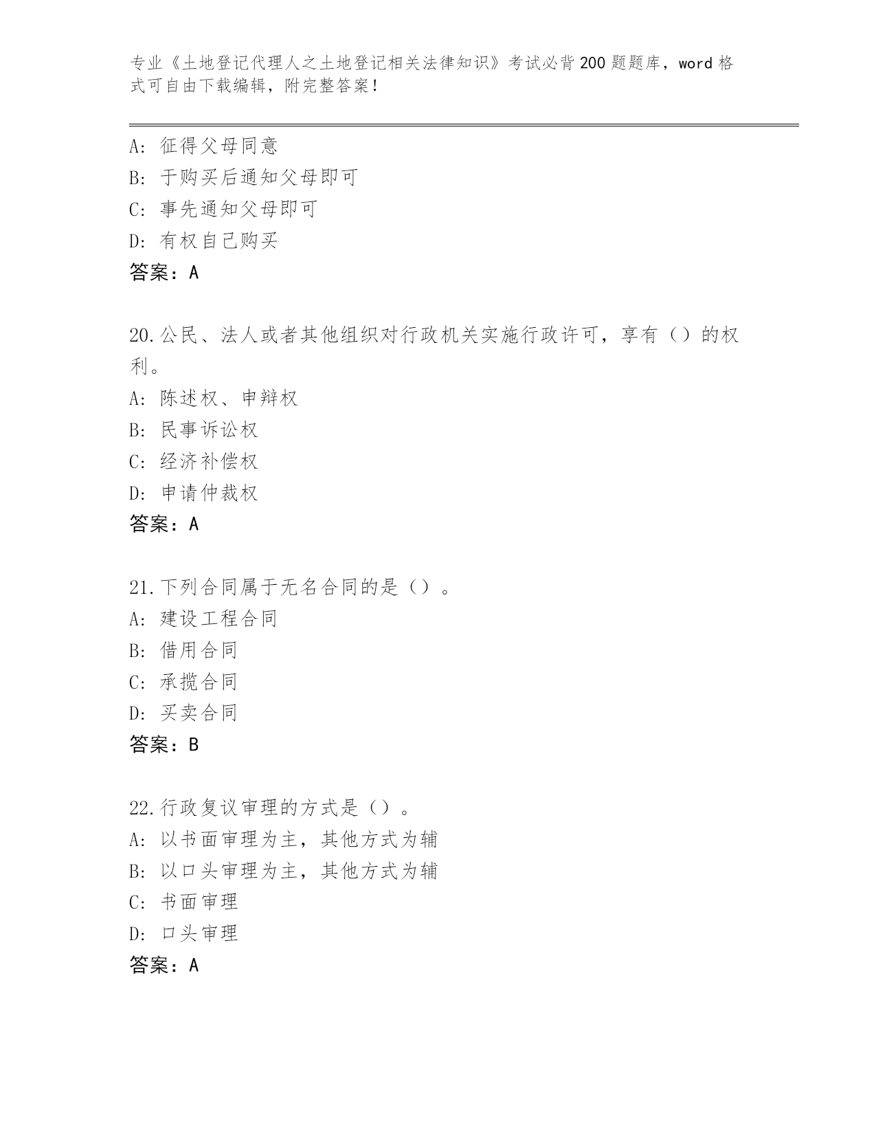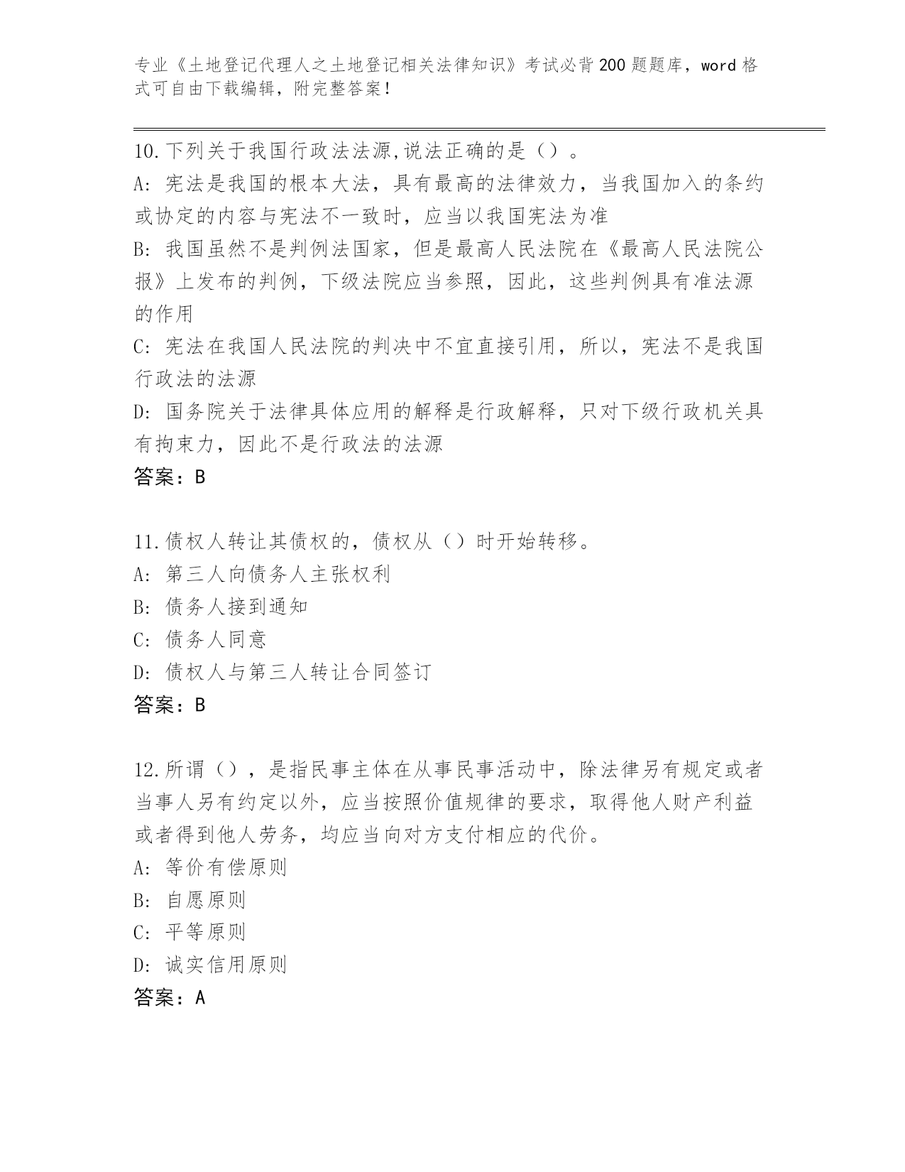 安徽省内部使用《土地登记代理人之土地登记相关法律知识》考试必背200题题库大全含解析答案