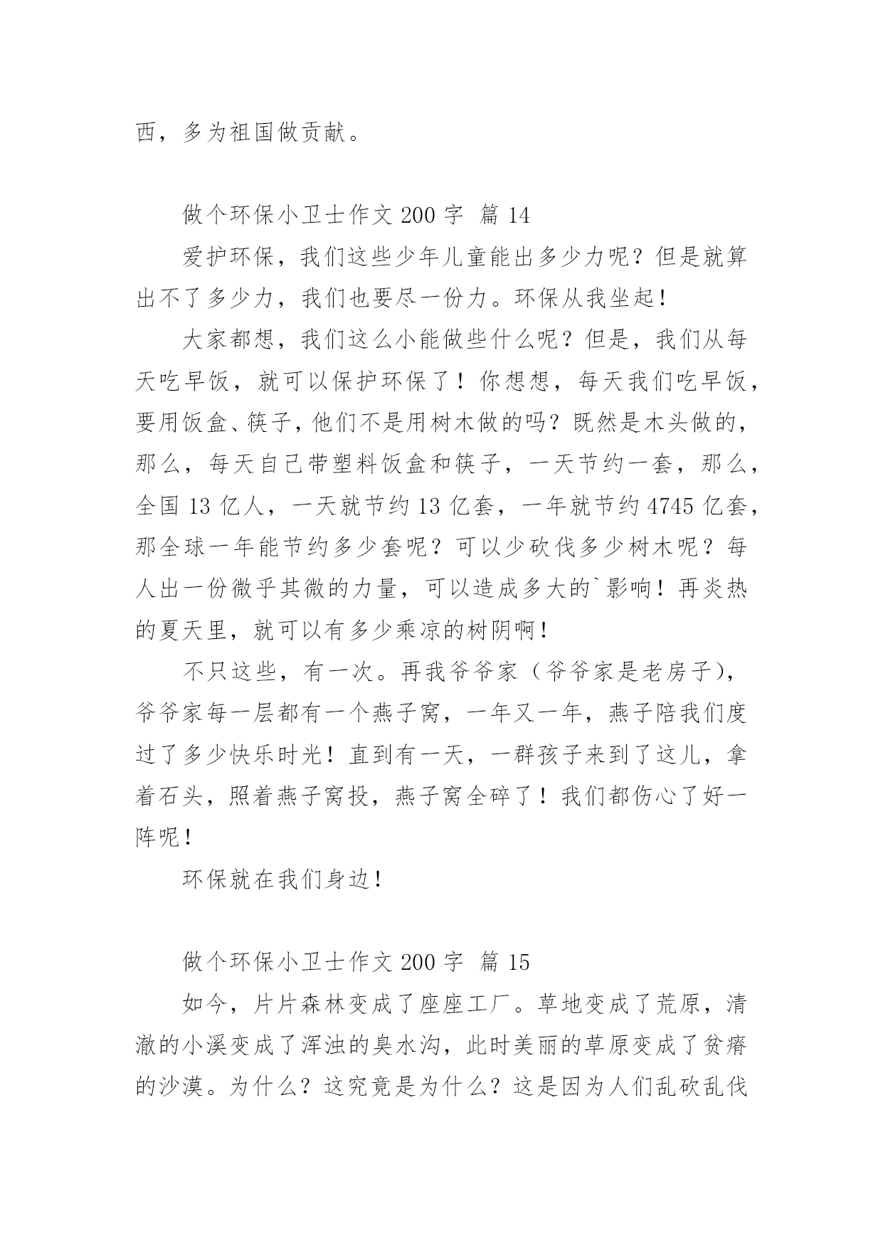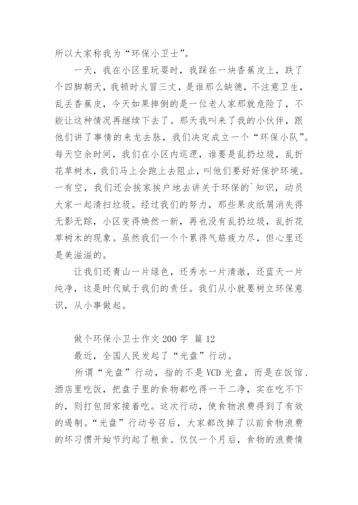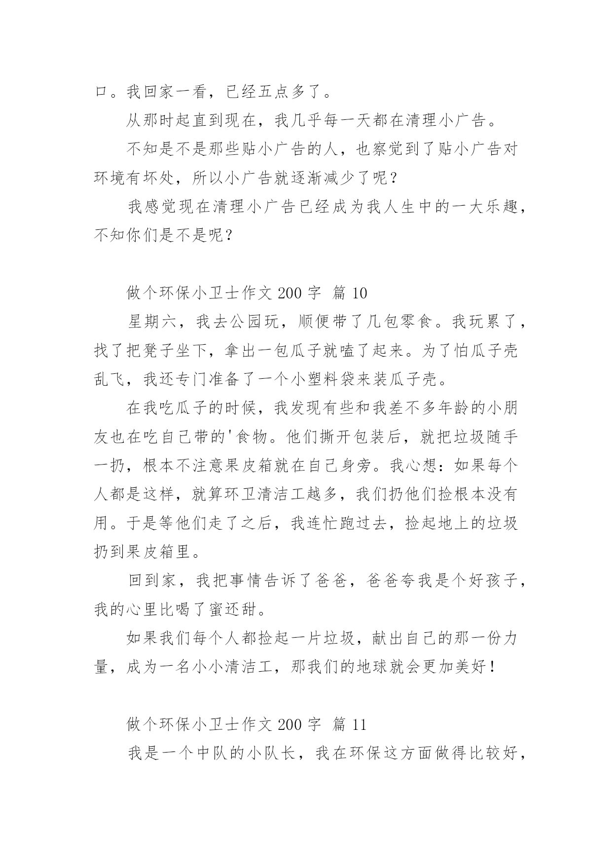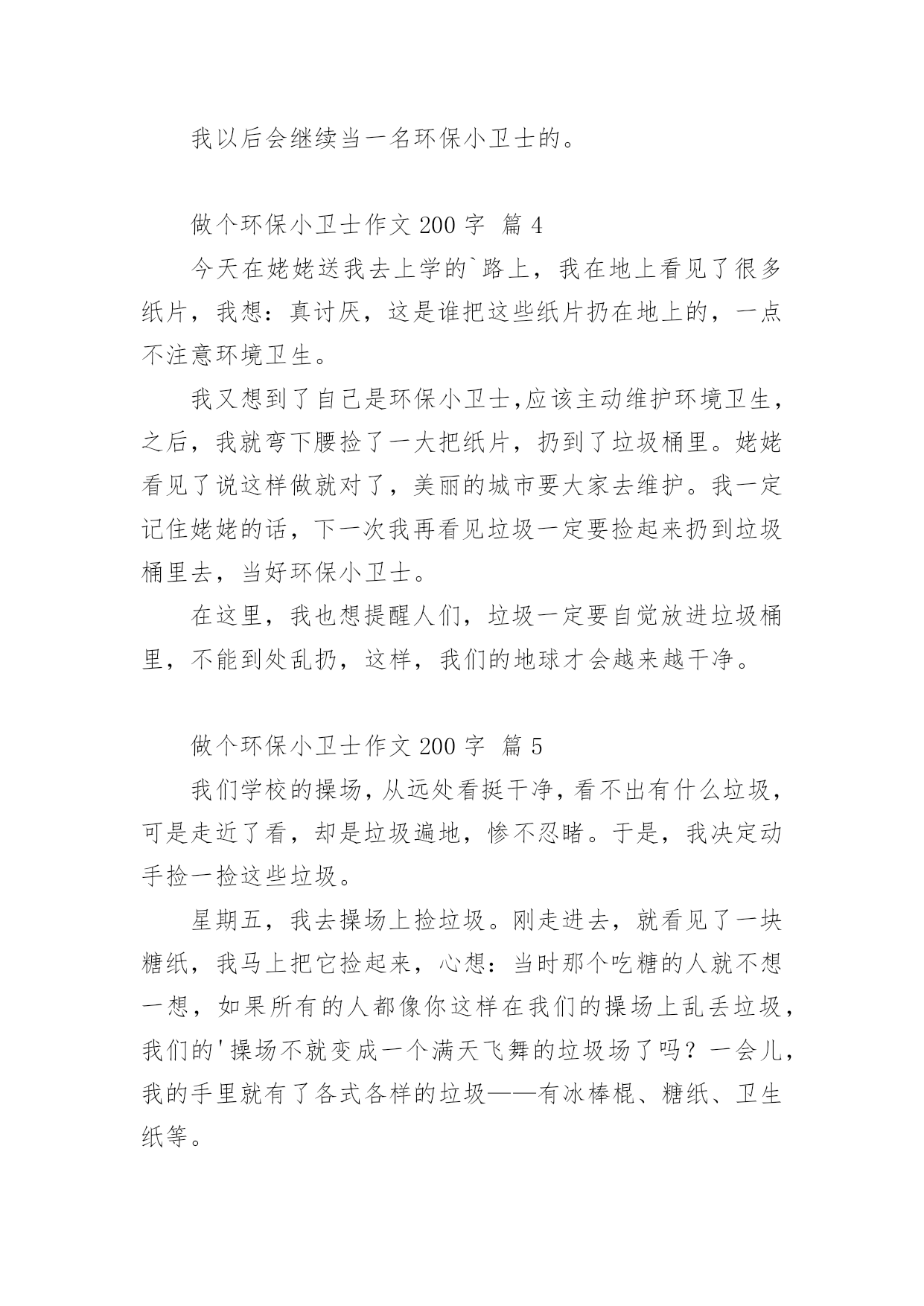 做个环保小卫士作文200字做个环保小卫士作文200字(通用53篇)无论在学习、工作或是生活中,大家对作文都不陌生吧,作文是通过文字来表达一个主题意义的记叙方法。你知道作文怎样写才规范吗?下面是小编收集整理的做个环保小卫士作文200字,供大家参考借鉴,希望可以帮助到有需要的朋友。做个环保小卫士作文200字篇1八月二十三日,我们“阳光小队”的同学们来到了紫金山,参加了金陵晚报的“虎风蝶捡垃圾行动”。活动开始了,大家穿着统一服装,拿着统一工,上山捡起了垃圾。我们当中,有的跑在最前面,怕有人把垃圾抢走;有的走在中间,与大家边聊边捡;有的脆落在最后,捡大家“走过、路过、都错过的”东西……个个的热火朝天。我们边唱山歌边捡杂物,有些市民见了纷纷表扬我们,甚至还有的`问我们是哪个学?哪个班的?这样一来,有的家长也大蠢蠢欲动,都做起了孩子的“军师”,为孩子们找杂物。最后,我们把捡到的垃圾倒进了废物箱,并一起合了影。这次活动让我们意识到了环保的重要性,让我们都来做个环保小卫士吧!做个环保小卫士作文200字篇2我是一只蒲公英,今天我将离开母亲的怀抱,去外面独自闯荡。听妈妈说,她出去的时候呀,天空灰蒙蒙的,被乌烟笼罩着,弄的很不舒服。我终于要去瞧瞧了,风一吹,我飞起来,来到一个公园。妈妈说,她以前看到这里全是垃圾呀。可我看到的不同呀——草地上开满了五颜六色的`鲜花,鸟儿在歌唱。有人来了呀,他们没有乱扔垃圾,而是将垃圾捡起,扔进垃圾桶里。妈妈说,这是环保小卫士呀。这是街道呀,妈妈说,风一吹,灰尘就到处乱飞。我觉得不像呀,空气很清新,很好闻的。我又看到他们了呀,脏兮兮的街道被他们打扫得干干净净,我真的好开心呀。环保小卫士越来越多的话,妈妈看到的世界会焕然一新的!做个环保小卫士作文200字篇3今天早上我一大早就来到了学校,马老师一看见我就让我和她一起去捡垃圾,当环保小卫士。我们来到操场指定的区域,不一会我们就把指定区域的垃圾捡完了。这时我看到同学们已经陆陆续续的来到学校了,看到干干净净的操场我心里好高兴啊!同学们可以在干干净净的操场上跑步、做早操、上体育课、自由的玩耍,同学们一定会很开心的`。马老师对我说:“从今天起你就是一个环保小卫士了,赶快回教室去吧!”我以后会继续当一名环保小卫士的。做个环保小卫士作文200字篇4今天在姥姥送我去上学的`路上,我在地上看见了很多纸片,我想:真讨厌,这是谁把这些纸片扔在地上的,一点不注意环境卫生。我又想到了自己是环保小卫士,应该主动维护环境卫生,之后,我就弯下腰捡了一大把纸片,扔到了垃圾桶里。姥姥看见了说这样做就对了,美丽的城市要大家去维护。我一定记住姥姥的话,下一次我再看见垃圾一定要捡起来扔到垃圾桶里去,当好环保小卫士。在这里,我也想提醒人们,垃圾一定要自觉放进垃圾桶里,不能到处乱扔,这样,我们的地球才会越来越干净。做个环保小卫士作文200字篇5我们学校的操场,从远处看挺干净,看不出有什么垃圾,可是走近了看,却是垃圾遍地,惨不忍睹。于是,我决定动手捡一捡这些垃圾。星期五,我去操场上捡垃圾。刚走进去,就看见了一块糖纸,我马上把它捡起来,心想:当时那个吃糖的人就不想一想,如果所有的人都像你这样在我们的操场上乱丢垃圾,我们的'操场不就变成一个满天飞舞的垃圾场了吗?一会儿,我的手里就有了各式各样的垃圾——有冰棒棍、糖纸、卫生纸等。我在操场里面走了一圈之后,又捡了许多垃圾。回头再看操场,已经干净了许多。同学们,让我们积极行动起来,保护环境,使我们的校园更加清洁、美丽。做个环保小卫士作文200字篇6今天的空气不再新鲜了,这是为什么呢?这是因为我们人类不停在锯树让空气不再新鲜了。现在全国都在搞绿化,人们也不怕天!大自然是人的摇篮,人没有理由去保护和爱护大自然!树木尤如地球的血管,由树根去吸地下水,那些树干和树叶像喷壶一样,在阳光的照耀下喷发水分。养育人类和万物。美丽的春天、迷人的夏天、果实丰收的秋天、有雪花的冬天。有一次国家领导开会,北京市长说过这样的一句话:谁要在北京砍树,就是用刀子刺我的'心窝子,是啊!让我们的绿色的城市永保青春!做个环保小卫士作文200字篇7中午,每当同学们吃完饭,你就会看到地上全都是掉下来的米饭、鱼骨头等,脚一踩,地上就黑乎乎的了。于是我决定给地面来个“大扫除”。我跑到302班借了把长柄刷子,我又往地上喷了点儿肥皂水,然后,我用刷子在地上刷呀刷,渐渐的,地上“冒”出了泡泡,过一会泡沫变黑了,太阳一照,煞是漂亮,紧接着,地面变白了,恢复了往日的“年轻”,我拿来了拖把,把泡沫拖掉,最后,我用拖把把地上的脏水拖掉。一个中午下来,我已经累得气喘吁吁的了,可是,望着干净的.、散发着清香的地面,我想:“让同学们在这么干净的教室里上课,是一件多么愉快的事呀!做个环保小卫士作文200字篇8晚上,凉风徐徐,我和妈妈一起去公