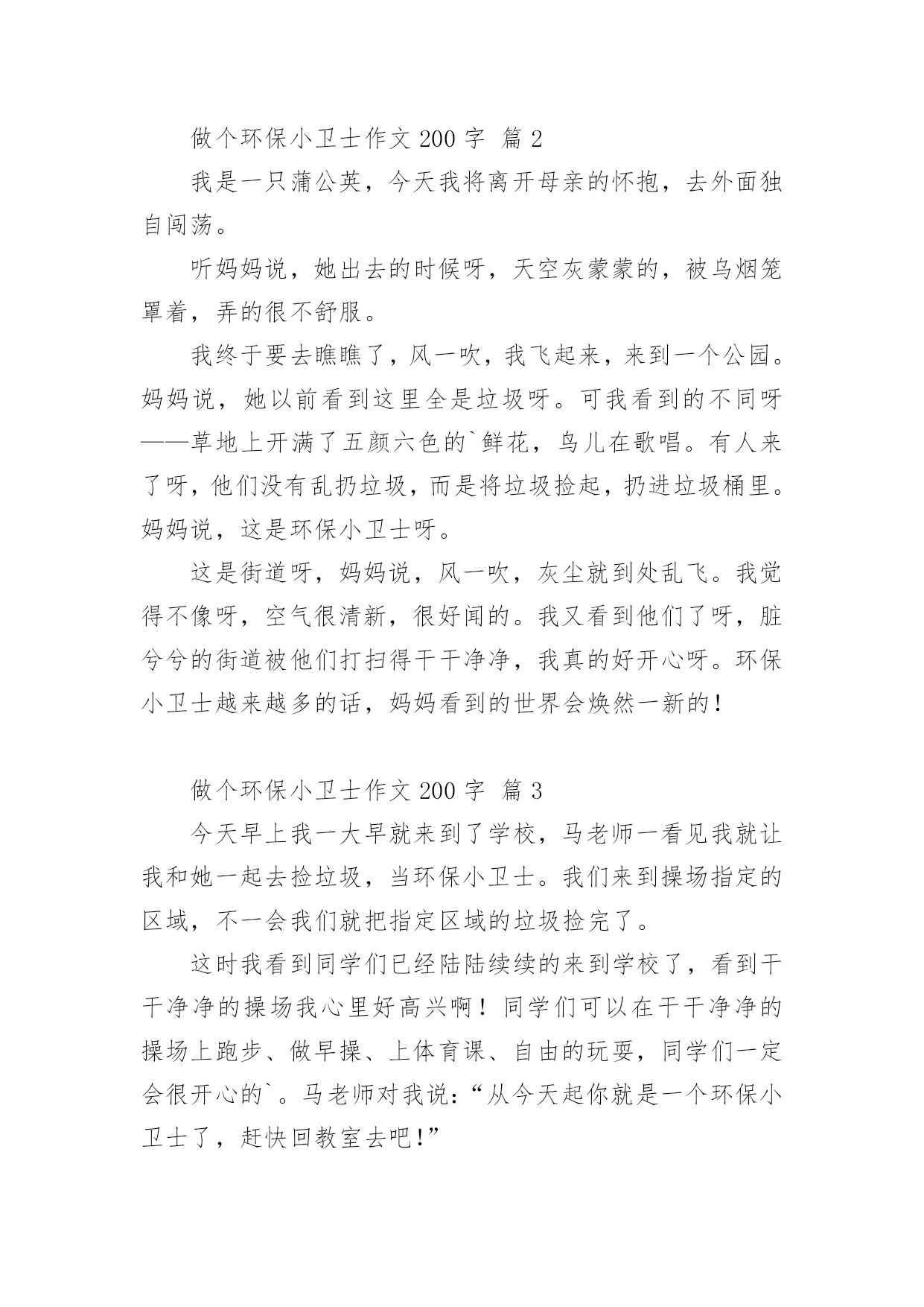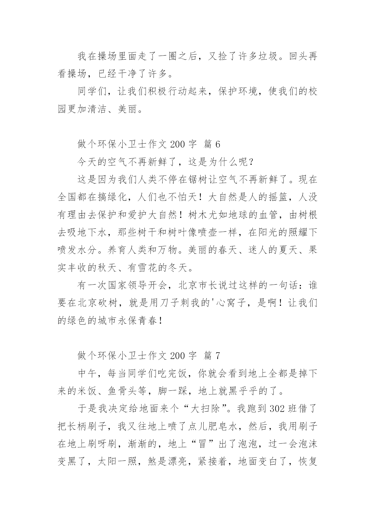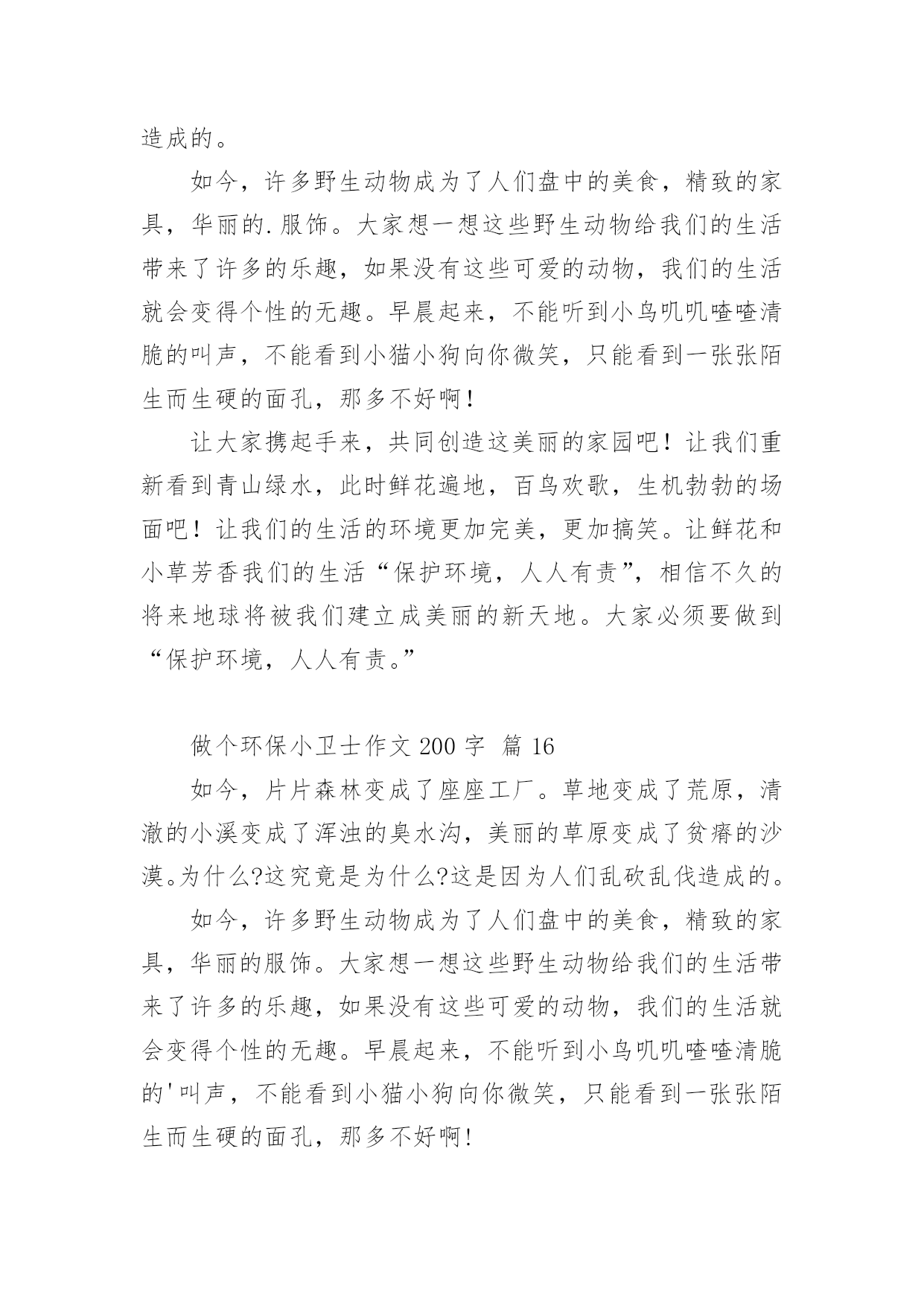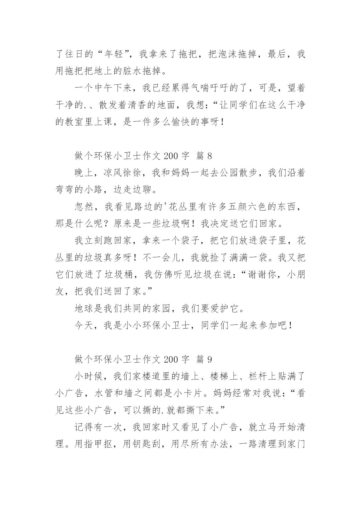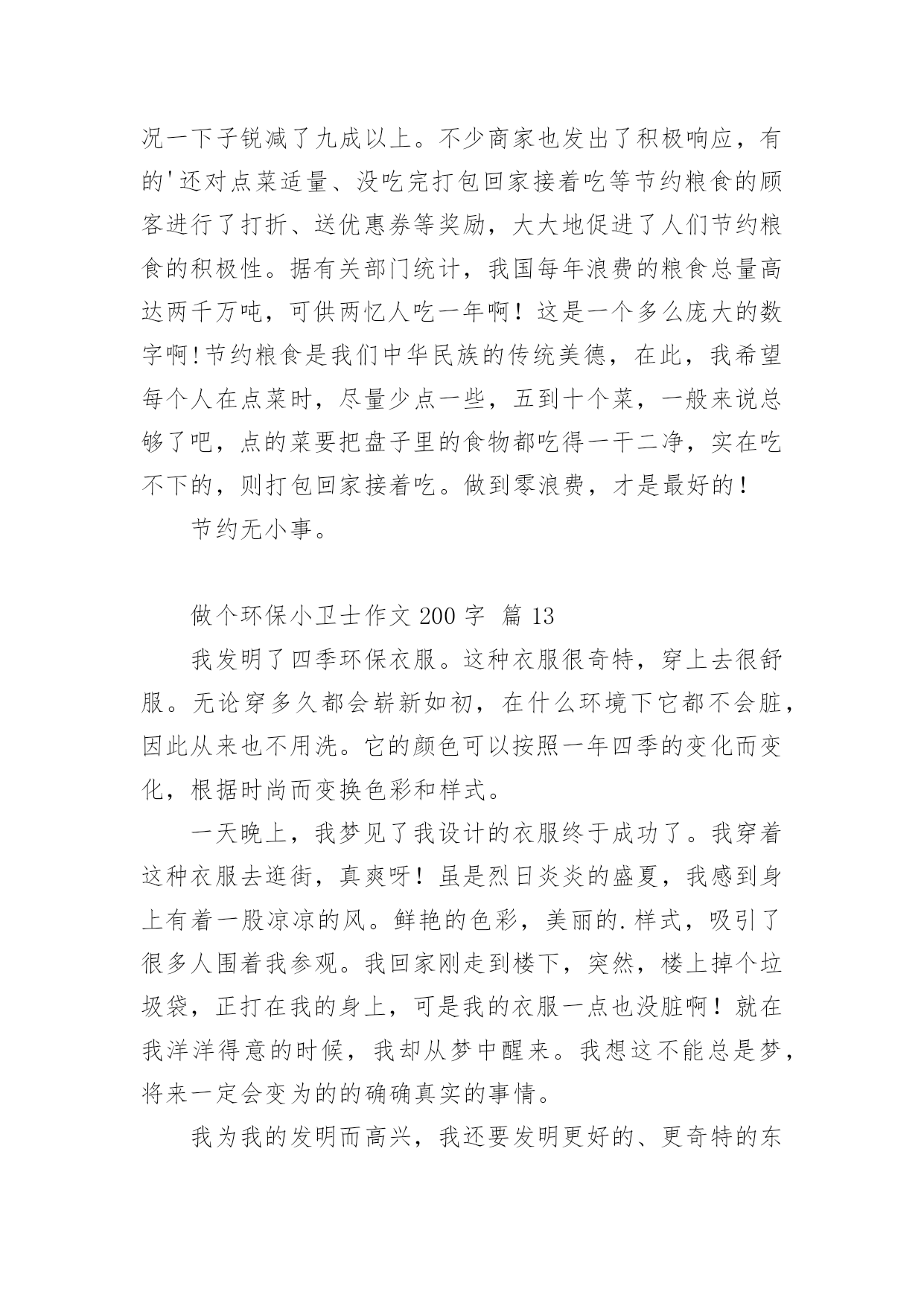 做个环保小卫士作文200字做个环保小卫士作文200字(通用53篇)无论在学习、工作或是生活中,大家对作文都不陌生吧,作文是通过文字来表达一个主题意义的记叙方法。你知道作文怎样写才规范吗?下面是小编收集整理的做个环保小卫士作文200字,供大家参考借鉴,希望可以帮助到有需要的朋友。做个环保小卫士作文200字篇1八月二十三日,我们“阳光小队”的同学们来到了紫金山,参加了金陵晚报的“虎风蝶捡垃圾行动”。活动开始了,大家穿着统一服装,拿着统一工,上山捡起了垃圾。我们当中,有的跑在最前面,怕有人把垃圾抢走;有的走在中间,与大家边聊边捡;有的脆落在最后,捡大家“走过、路过、都错过的”东西……个个的热火朝天。我们边唱山歌边捡杂物,有些市民见了纷纷表扬我们,甚至还有的`问我们是哪个学?哪个班的?这样一来,有的家长也大蠢蠢欲动,都做起了孩子的“军师”,为孩子们找杂物。最后,我们把捡到的垃圾倒进了废物箱,并一起合了影。这次活动让我们意识到了环保的重要性,让我们都来做个环保小卫士吧!做个环保小卫士作文200字篇2我是一只蒲公英,今天我将离开母亲的怀抱,去外面独自闯荡。听妈妈说,她出去的时候呀,天空灰蒙蒙的,被乌烟笼罩着,弄的很不舒服。我终于要去瞧瞧了,风一吹,我飞起来,来到一个公园。妈妈说,她以前看到这里全是垃圾呀。可我看到的不同呀——草地上开满了五颜六色的`鲜花,鸟儿在歌唱。有人来了呀,他们没有乱扔垃圾,而是将垃圾捡起,扔进垃圾桶里。妈妈说,这是环保小卫士呀。这是街道呀,妈妈说,风一吹,灰尘就到处乱飞。我觉得不像呀,空气很清新,很好闻的。我又看到他们了呀,脏兮兮的街道被他们打扫得干干净净,我真的好开心呀。环保小卫士越来越多的话,妈妈看到的世界会焕然一新的!做个环保小卫士作文200字篇3今天早上我一大早就来到了学校,马老师一看见我就让我和她一起去捡垃圾,当环保小卫士。我们来到操场指定的区域,不一会我们就把指定区域的垃圾捡完了。这时我看到同学们已经陆陆续续的来到学校了,看到干干净净的操场我心里好高兴啊!同学们可以在干干净净的操场上跑步、做早操、上体育课、自由的玩耍,同学们一定会很开心的`。马老师对我说:“从今天起你就是一个环保小卫士了,赶快回教室去吧!”我以后会继续当一名环保小卫士的。做个环保小卫士作文200字篇4今天在姥姥送我去上学的`路上,我在地上看见了很多纸片,我想:真讨厌,这是谁把这些纸片扔在地上的,一点不注意环境卫生。我又想到了自己是环保小卫士,应该主动维护环境卫生,之后,我就弯下腰捡了一大把纸片,扔到了垃圾桶里。姥姥看见了说这样做就对了,美丽的城市要大家去维护。我一定记住姥姥的话,下一次我再看见垃圾一定要捡起来扔到垃圾桶里去,当好环保小卫士。在这里,我也想提醒人们,垃圾一定要自觉放进垃圾桶里,不能到处乱扔,这样,我们的地球才会越来越干净。做个环保小卫士作文200字篇5我们学校的操场,从远处看挺干净,看不出有什么垃圾,可是走近了看,却是垃圾遍地,惨不忍睹。于是,我决定动手捡一捡这些垃圾。星期五,我去操场上捡垃圾。刚走进去,就看见了一块糖纸,我马上把它捡起来,心想:当时那个吃糖的人就不想一想,如果所有的人都像你这样在我们的操场上乱丢垃圾,我们的'操场不就变成一个满天飞舞的垃圾场了吗?一会儿,我的手里就有了各式各样的垃圾——有冰棒棍、糖纸、卫生纸等。我在操场里面走了一圈之后,又捡了许多垃圾。回头再看操场,已经干净了许多。同学们,让我们积极行动起来,保护环境,使我们的校园更加清洁、美丽。做个环保小卫士作文200字篇6今天的空气不再新鲜了,这是为什么呢?这是因为我们人类不停在锯树让空气不再新鲜了。现在全国都在搞绿化,人们也不怕天!大自然是人的摇篮,人没有理由去保护和爱护大自然!树木尤如地球的血管,由树根去吸地下水,那些树干和树叶像喷壶一样,在阳光的照耀下喷发水分。养育人类和万物。美丽的春天、迷人的夏天、果实丰收的秋天、有雪花的冬天。有一次国家领导开会,北京市长说过这样的一句话:谁要在北京砍树,就是用刀子刺我的'心窝子,是啊!让我们的绿色的城市永保青春!做个环保小卫士作文200字篇7中午,每当同学们吃完饭,你就会看到地上全都是掉下来的米饭、鱼骨头等,脚一踩,地上就黑乎乎的了。于是我决定给地面来个“大扫除”。我跑到302班借了把长柄刷子,我又往地上喷了点儿肥皂水,然后,我用刷子在地上刷呀刷,渐渐的,地上“冒”出了泡泡,过一会泡沫变黑了,太阳一照,煞是漂亮,紧接着,地面变白了,恢复了往日的“年轻”,我拿来了拖把,把泡沫拖掉,最后,我用拖把把地上的脏水拖掉。一个中午下来,我已经累得气喘吁吁的了,可是,望着干净的.、散发着清香的地面,我想:“让同学们在这么干净的教室里上课,是一件多么愉快的事呀!做个环保小卫士作文200字篇8晚上,凉风徐徐,我和妈妈一起去公
