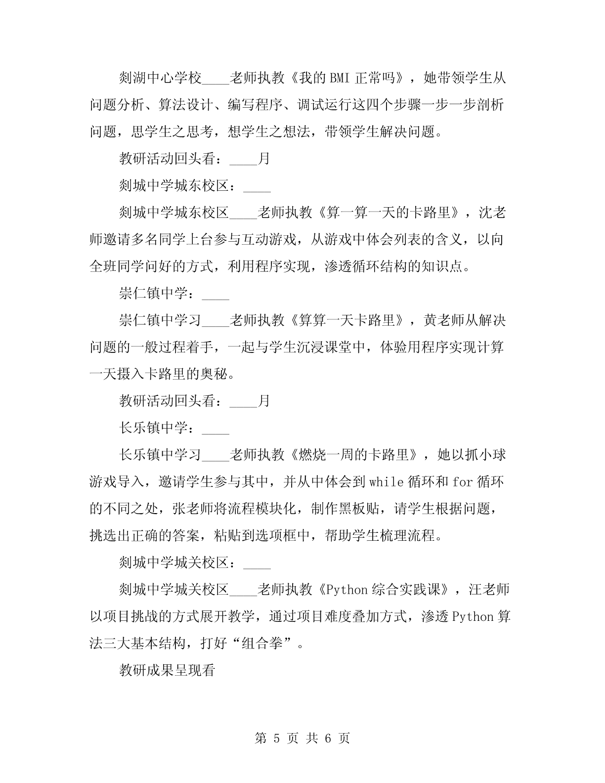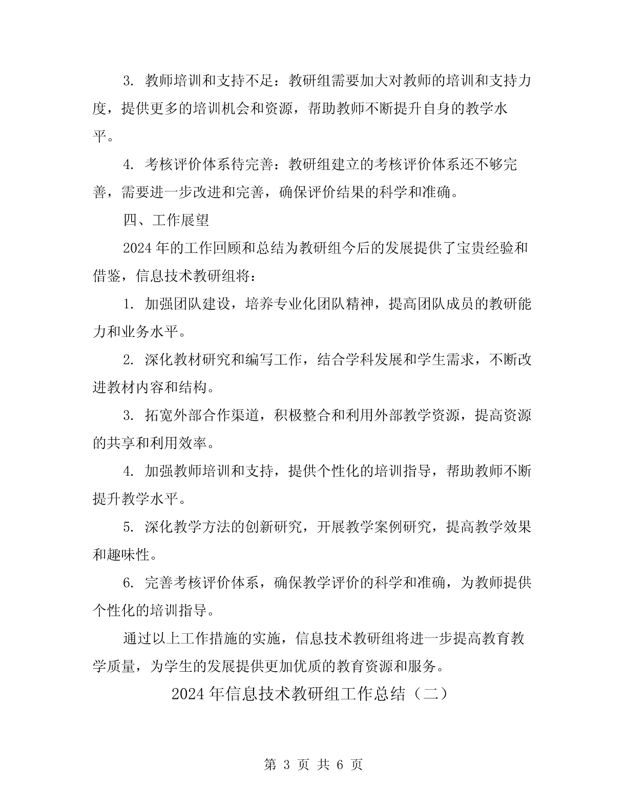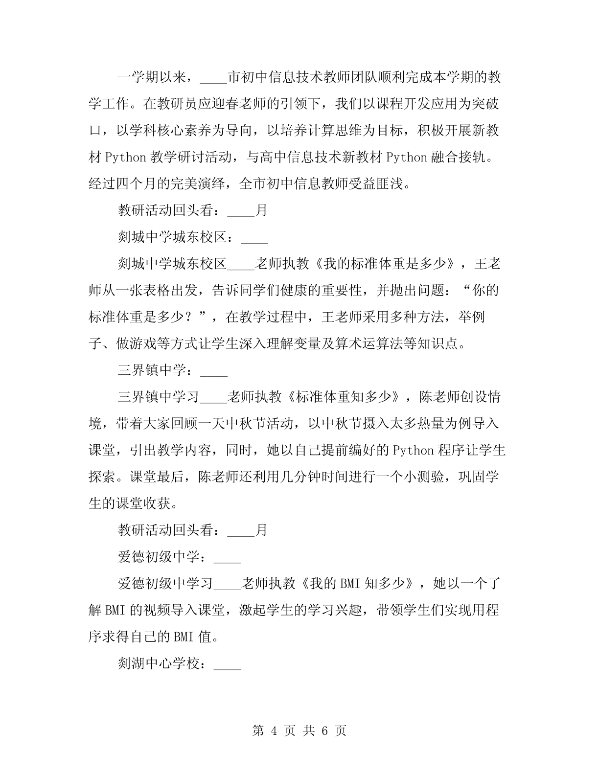 2024年信息技术教研组工作总结一、工作回顾2024年,信息技术教研组在领导的正确指导下,充分发挥团队合作的优势,充实了团队的人员配置,全面推进教研工作,有效提升了教育教学质量。具体工作回顾如下:1.教材研究和编写:教研组成员积极参与课程教材的研究和编写工作,在上一年度的基础上,进一步完善了教材的内容和结构,提高了适应性和实用性。2.资源建设和共享:教研组积极整理、建设和共享教学资源,推动教师间的资源互享,提高教学效果。通过建立资源分享平台和组织内部研讨会,促进教师之间的交流和合作。3.教学方法研究:教研组成员不断研究和探索信息技术教学的创新方法,鼓励教师借助信息技术工具开展课堂教学,创造出更多互动、参与和趣味性的教学形式。4.教学评价和反馈:教研组重视对教学过程和效果的评价和反馈,推动建立科学、客观的教学评价体系,并及时为教师提供评价结果和个性化的培训指导,帮助教师不断提升教学能力。5.学科竞赛和活动组织:教研组组织了一系列学科竞赛和活动,激发学生的学习热情和创造力,丰富了学生的课外学习内容,提高了学科的影响力。二、工作成果在2024年的工作中,信息技术教研组取得了以下几方面的成果:1.课程教材的改进:教研组根据教学实践和学科发展的需要,对课程教材进行了全面的改进,使之更加符合学生的实际需求,提高了学习的兴趣和效果。2.教学资源的建设与共享:教研组建立了教学资源共享平台,整理了丰富多样的教学资源,为教师提供了更多便利和支持,实现了资源的共享和高效利用。3.教学方法的创新:教研组成员积极探索和实践信息技术教学的创新方法,开展了多种形式的课堂教学活动,提高了教学的趣味性和有效性。4.教学评价和反馈的完善:教研组建立了科学、客观的教学评价体系,及时为教师提供评价结果和个性化的培训指导,帮助教师改进教学方法,提高教学效果。5.学科竞赛和活动的组织:教研组组织了一系列学科竞赛和活动,涵盖了多个学年级和不同层次的学生,为学生提供了展示和交流的平台,培养了学生的综合素质。三、存在的问题和不足在2024年的工作中,信息技术教研组也存在一些问题和不足之处,主要表现为:1.外部资源整合不够:教研组在教材编写和教学资源建设中,对外部资源的整合和利用还不够深入,需要进一步拓宽外部合作渠道,加强资源共享。2.创新研究力度不够:教研组在教学方法的创新方面,还需要加强创新研究力度,积极探索和应用最新的教育技术手段,提升教学效果。3.教师培训和支持不足:教研组需要加大对教师的培训和支持力度,提供更多的培训机会和资源,帮助教师不断提升自身的教学水平。4.考核评价体系待完善:教研组建立的考核评价体系还不够完善,需要进一步改进和完善,确保评价结果的科学和准确。四、工作展望2024年的工作回顾和总结为教研组今后的发展提供了宝贵经验和借鉴,信息技术教研组将:1.加强团队建设,培养专业化团队精神,提高团队成员的教研能力和业务水平。2.深化教材研究和编写工作,结合学科发展和学生需求,不断改进教材内容和结构。3.拓宽外部合作渠道,积极整合和利用外部教学资源,提高资源的共享和利用效率。4.加强教师培训和支持,提供个性化的培训指导,帮助教师不断提升教学水平。5.深化教学方法的创新研究,开展教学案例研究,提高教学效果和趣味性。6.完善考核评价体系,确保教学评价的科学和准确,为教师提供个性化的培训指导。通过以上工作措施的实施,信息技术教研组将进一步提高教育教学质量,为学生的发展提供更加优质的教育资源和服务。2024年信息技术教研组工作总结(二)一学期以来,____市初中信息技术教师团队顺利完成本学期的教学工作。在教研员应迎春老师的引领下,我们以课程开发应用为突破口,以学科核心素养为导向,以培养计算思维为目标,积极开展新教材Python教学研讨活动,与高中信息技术新教材Python融合接轨。经过四个月的完美演绎,全市初中信息教师受益匪浅。教研活动回头看:____月剡城中学城东校区:____剡城中学城东校区____老师执教《我的标准体重是多少》,王老师从一张表格出发,告诉同学们健康的重要性,并抛出问题:“你的标准体重是多少?”,在教学过程中,王老师采用多种方法,举例子、做游戏等方式让学生深入理解变量及算术运算法等知识点。三界镇中学:____三界镇中学习____老师执教《标准体重知多少》,陈老师创设情境,带着大家回顾一天中秋节活动,以中秋节摄入太多热量为例导入课堂,引出教学内容,同时,她以自己提前编好的Python程序让学生探索。课堂最后,陈老师还利用几分钟时间进行一个小测验,巩固学生的课堂收获