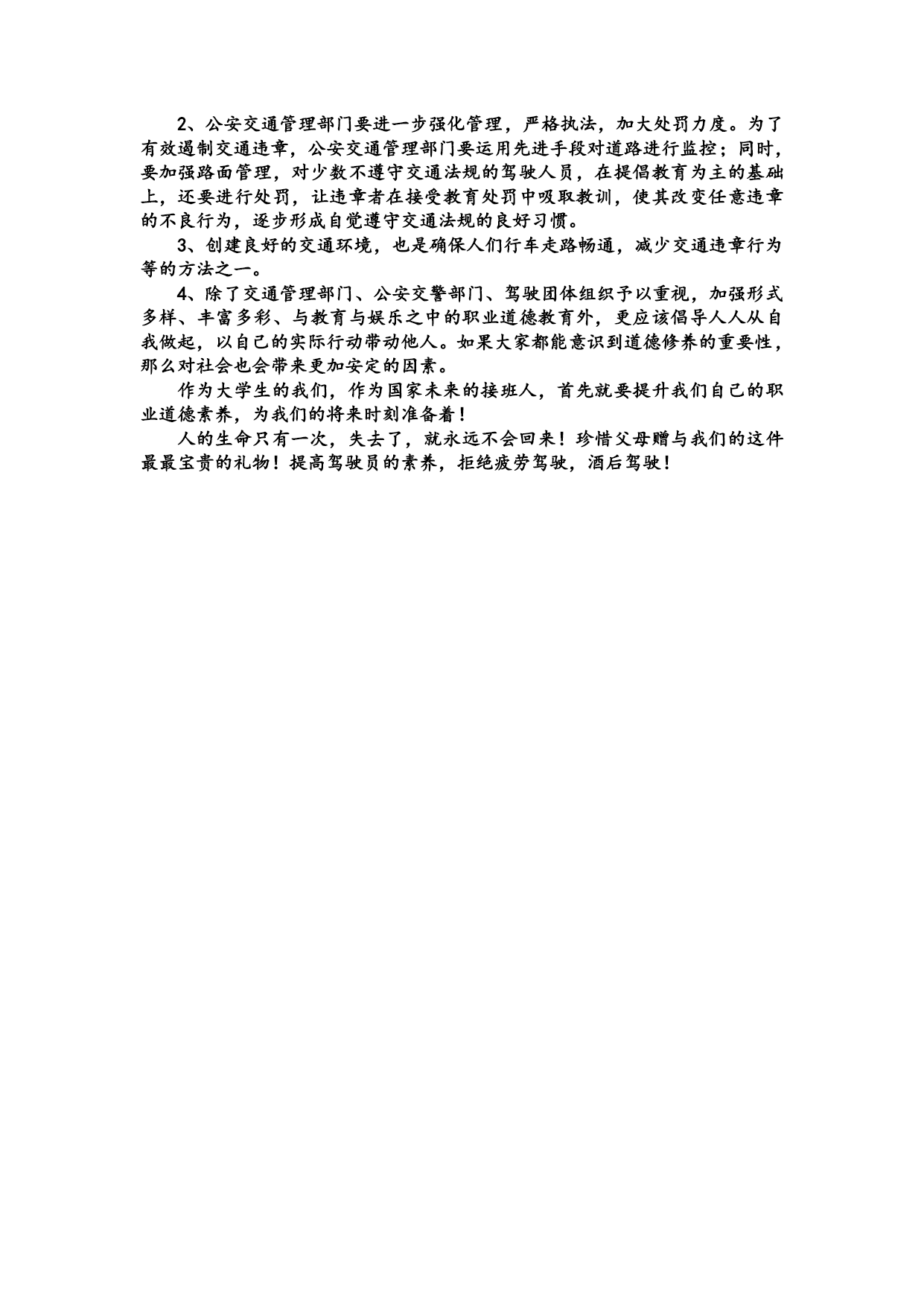 交通事故频繁的背后——提高驾驶员素养的重要性我国每年死于意外的人数都很多,其中交通事故就占了很大比例,并且比例还在不断增加,造成的直接和间接经济损失也在直线上升,造成这些悲剧的最大责任在于谁?行人还是驾驶员?据统计,2010年,全国共发生道路交通事故238351起,造成67759人死亡、275125人受伤,直接财产损失9.1亿元,与去年同期相比,分别下降10.1%、7.8%、9.8%和10.7%。其中,发生一次死亡10人以上特大道路交通事故24起。在众多交通事故中,酒后驾车,疲劳驾驶,闯红灯等等占了绝大多数。虽然事故同期发生率有所下降,可是依然存在这么多触目惊心的事件,这是谁的责任?驾驶员?行人?还是那些无辜的乘客?虽然马路上的红灯多多,大街小巷的标语多多,却还是无法阻止那些车辆的横冲直撞!这折射出了怎样的社会现象呢?难道忙碌的生活甚至于没有多余的时间等几秒的红灯?酒的诱惑抵不过家人的期待和叮嘱?甚至抵不过自己及他人的生命的珍贵?这一个个的悲剧究竟说明了什么?我们要怎样才能解决这个问题?在不久前,杭州市交警支队向媒体通报了2月1日凌晨发生在中河路惠民路交叉口的宝马车撞公交车事故。“凌晨杭州一宝马撞上公交司机涉嫌闯红灯和酒后驾车!”警方在通报中称:2月1日2时5分许,杭州籍驾驶人富俊强驾驶一辆宝马小轿车,沿中河路由北向南行驶至惠民路口时,与该路口由北向西左转弯的K208路公交车相撞,造成富俊强及车上另外3名成员受伤。而当事故发生后,富俊强立即离开现场。当日下午2时许,交警部门在省立同德医院找到了正在挂盐水的富俊强,病历显示为“右踝骨骨折、脑震荡等”。询问中,富俊强对凌晨发生在中河路惠民路口的交通事故表示“记不起来了”。然而警方通过大量的走访调查,已基本查明富俊强在事故发生前后的活动情况,且富俊强涉嫌酒后驾车。目前,交警部门对该起事故正在全力调查之中。警方告诫违法者不要心存侥幸,交警部门一定坚持“零容忍”原则,严厉整治酒后驾车。从这个案例中我们已经清楚的看到酒后驾车带来的残酷后果,甚至还有愚昧的肇事者在事后还不知悔改!这种种的种种,又能说明什么呢?这一切都说明我们驾驶员的素养实在需要得到进一步提高,而且这个问题已迫在眉睫。或许,驾驶员不是自己想喝酒,只是迫不得已,不得不喝!或许,驾驶员不是故意疲劳驾驶的,只是有很重要的要去做,不得不拖着疲惫的身躯去开车!但是,结果却是一样,他们违反了交通安全法。根据2008年世界卫生组织的事故调查显示,大约50%-60%的交通事故与酒后驾车有关,酒后驾驶重罚被列为车祸致死的主要原因。在中国,每年由于酒后驾车引发的交通事故达数万起;而造成死亡的事故中50%以上都与酒后驾车有关。这些数据无不敲响了我们心中的警钟。同时也提醒了我们提高驾驶员综合素养的重要性!但是要如何才能提高驾驶员的素养呢?采取多种形式,不断加强职业道德教育。不论是驾驶单位,还是群众性驾驶组织,都要十分重视对机车驾驶员的职业道德教育。采用多渠道以及生动的实例来引导他们,以提高驾驶员的素质和职业道德修养。各级交通管理部门、公安交通管理部门以及驾驶员培训学校,要充分利用换证驾驶员年审违章办理培训等有利时机,有针对性的对驾驶员进行职业道德教育。公安交通管理部门要进一步强化管理,严格执法,加大处罚力度。为了有效遏制交通违章,公安交通管理部门要运用先进手段对道路进行监控;同时,要加强路面管理,对少数不遵守交通法规的驾驶人员,在提倡教育为主的基础上,还要进行处罚,让违章者在接受教育处罚中吸取教训,使其改变任意违章的不良行为,逐步形成自觉遵守交通法规的良好习惯。创建良好的交通环境,也是确保人们行车走路畅通,减少交通违章行为等的方法之一。除了交通管理部门、公安交警部门、驾驶团体组织予以重视,加强形式多样、丰富多彩、与教育与娱乐之中的职业道德教育外,更应该倡导人人从自我做起,以自己的实际行动带动他人。如果大家都能意识到道德修养的重要性,那么对社会也会带来更加安定的因素。作为大学生的我们,作为国家未来的接班人,首先就要提升我们自己的职业道德素养,为我们的将来时刻准备着!人的生命只有一次,失去了,就永远不会回来!珍惜父母赠与我们的这件最最宝贵的礼物!提高驾驶员的素养,拒绝疲劳驾驶,酒后驾驶!