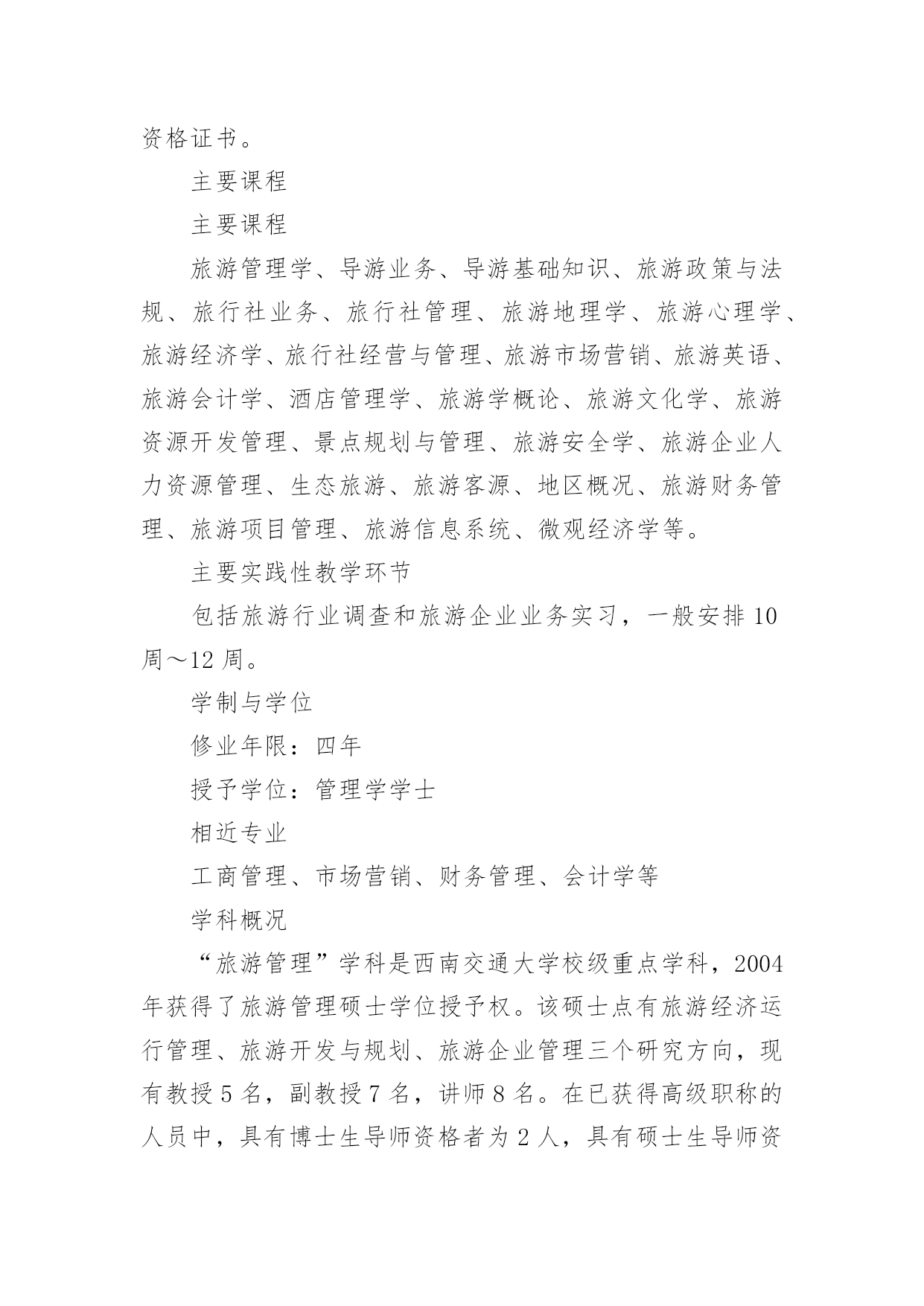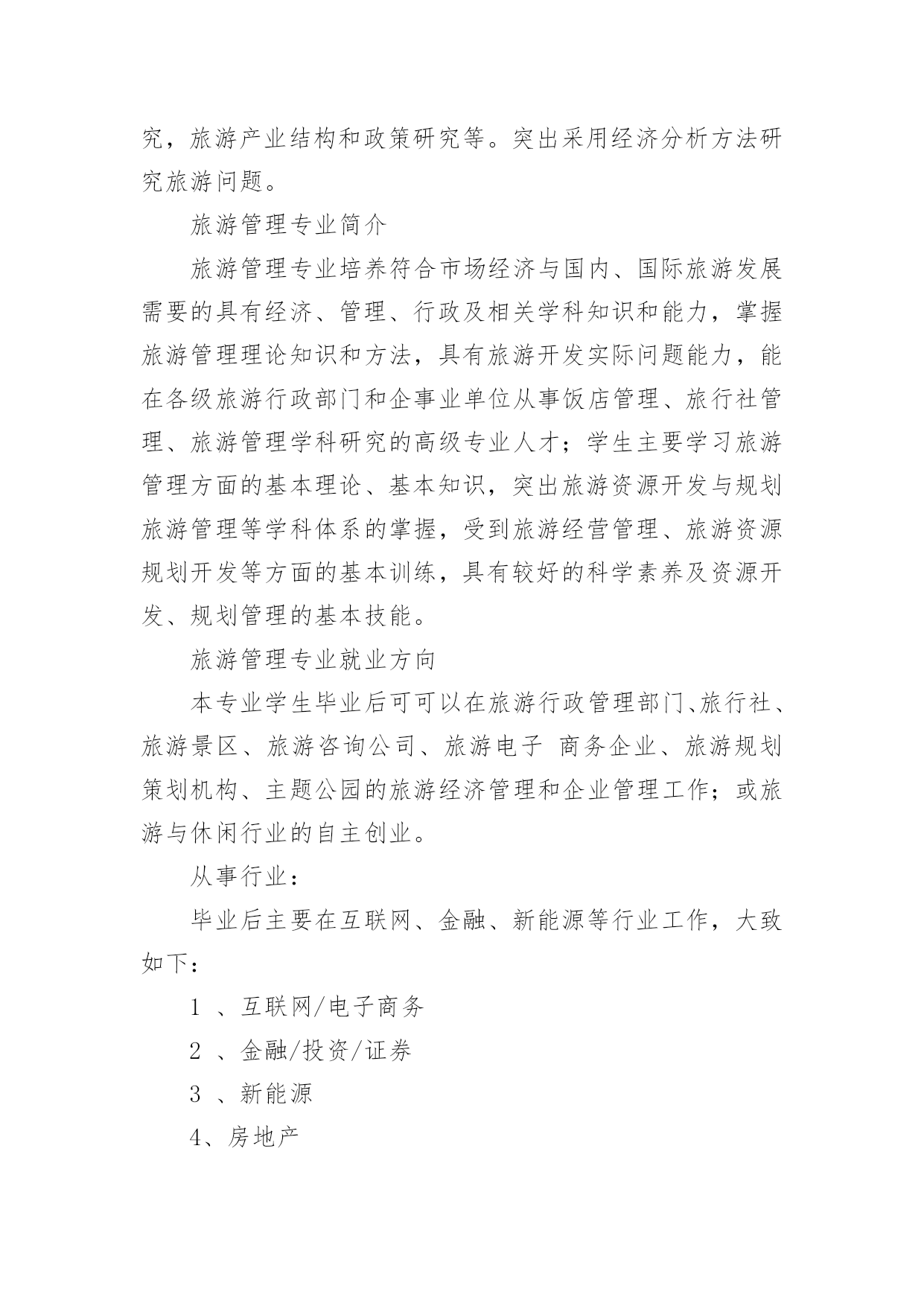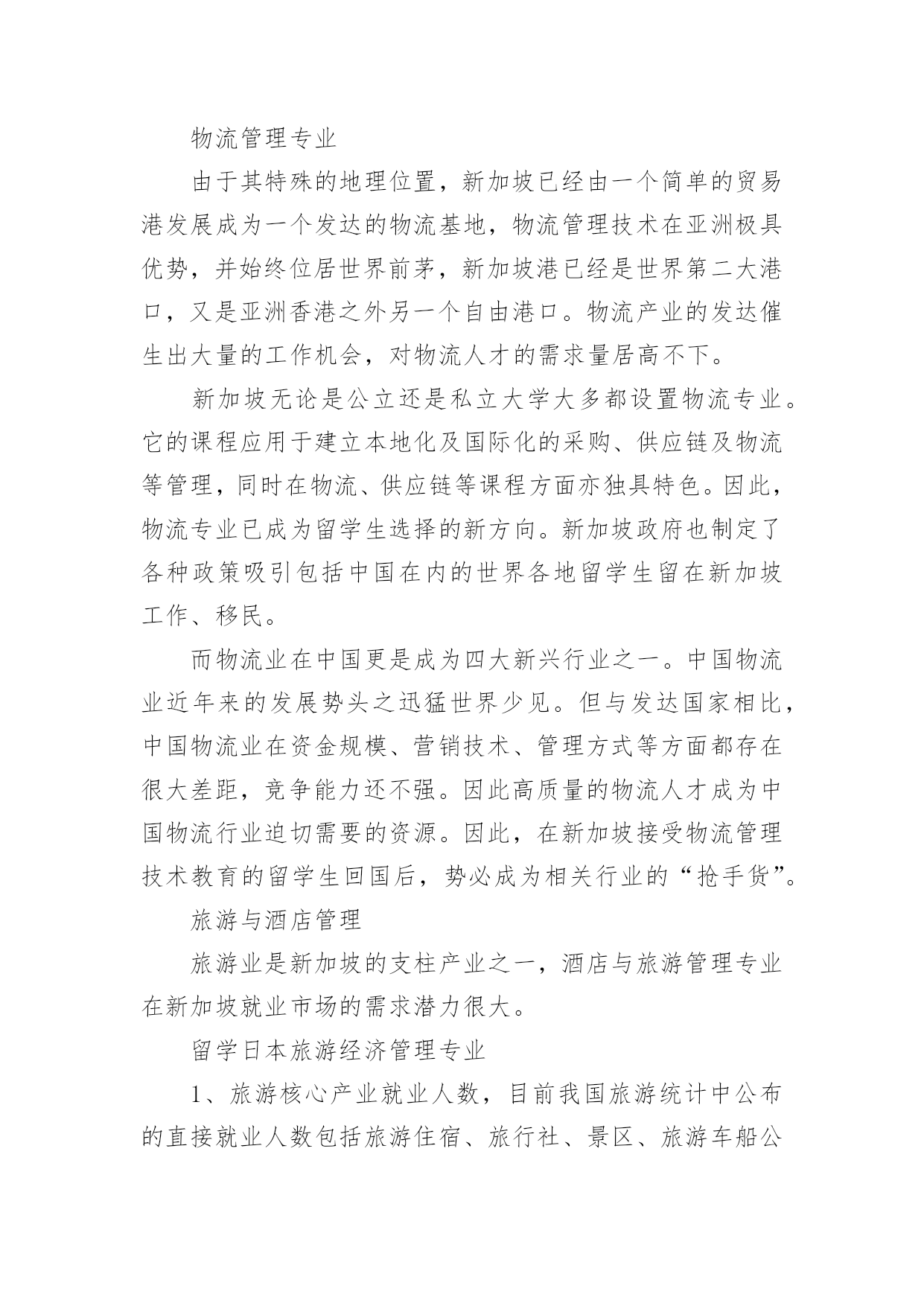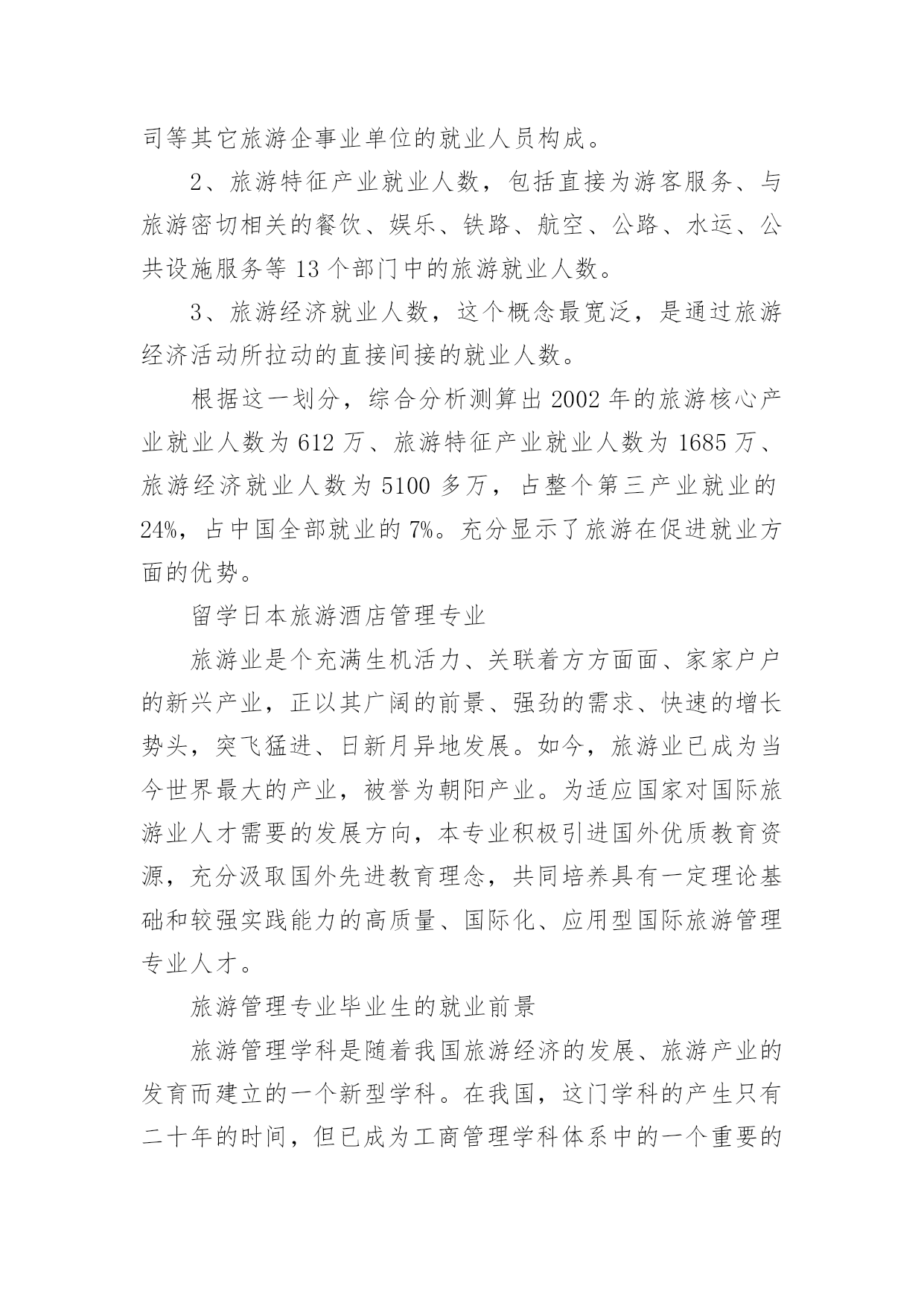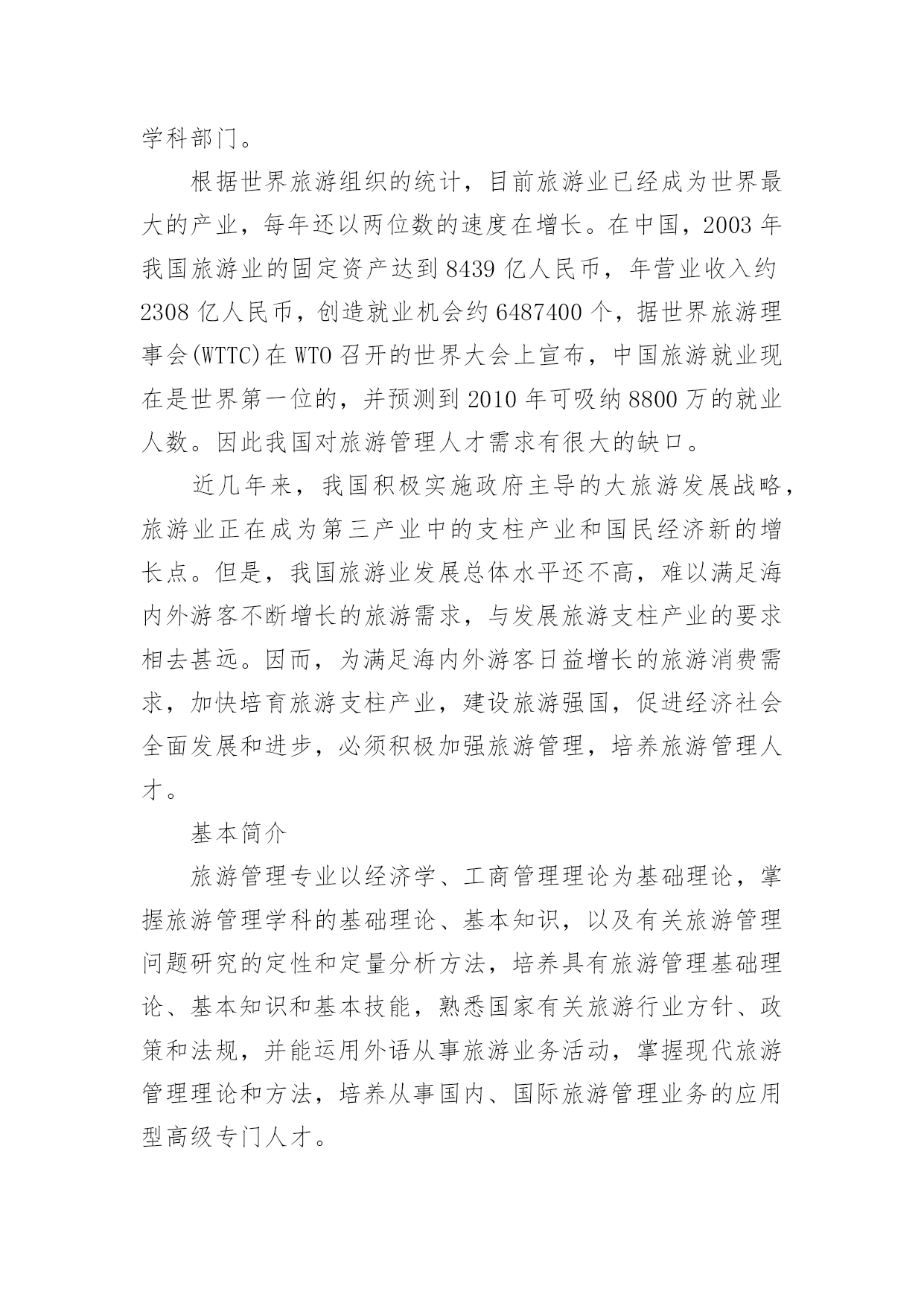 旅游管理专业介绍旅游管理专业介绍处在一个陌生场合时,常常要进行自我介绍,自我介绍可以给陌生人留下一个好的印象。那么你真的会写自我介绍吗?以下是小编收集整理的旅游管理专业介绍,供大家参考借鉴,希望可以帮助到有需要的朋友。现有4个稳定的研究方向:1、旅游开发与规划:主要研究旅游资源、旅游要素和旅游产品开发的理论与个案实证,旅游策划、旅游规划的理论、方法、技术及其实践应用,旅游目的地开发管理和区域旅游合作等。2、旅游企业管理:主要研究旅游企业管理的理论与方法,旅游企业人力资源开发与管理,旅游企业组织与决策系统,旅游饭店、旅行社、旅游交通等企业运行经营策划与管理实务等。3、旅游经济:主要研究旅游经济现象、经济关系和经济规律等基本理论,区域旅游形象策划与旅游营销,旅游经济发展战略与旅游产业政策,旅游经济开发的效应、影响和可持续发展等。4、旅游文化:主要研究旅游文化理论、旅游文化内涵及表现、文化资源的旅游产业化、文化的景观化(开发利用)、旅游企业文化建设和旅游开发的文化提升,旅游的社会文化功能和旅游伦理等。物流管理专业由于其特殊的地理位置,新加坡已经由一个简单的贸易港发展成为一个发达的物流基地,物流管理技术在亚洲极具优势,并始终位居世界前茅,新加坡港已经是世界第二大港口,又是亚洲香港之外另一个自由港口。物流产业的发达催生出大量的工作机会,对物流人才的需求量居高不下。新加坡无论是公立还是私立大学大多都设置物流专业。它的课程应用于建立本地化及国际化的采购、供应链及物流等管理,同时在物流、供应链等课程方面亦独具特色。因此,物流专业已成为留学生选择的新方向。新加坡政府也制定了各种政策吸引包括中国在内的世界各地留学生留在新加坡工作、移民。而物流业在中国更是成为四大新兴行业之一。中国物流业近年来的发展势头之迅猛世界少见。但与发达国家相比,中国物流业在资金规模、营销技术、管理方式等方面都存在很大差距,竞争能力还不强。因此高质量的物流人才成为中国物流行业迫切需要的资源。因此,在新加坡接受物流管理技术教育的留学生回国后,势必成为相关行业的“抢手货”。旅游与酒店管理旅游业是新加坡的支柱产业之一,酒店与旅游管理专业在新加坡就业市场的需求潜力很大。留学日本旅游经济管理专业1、旅游核心产业就业人数,目前我国旅游统计中公布的直接就业人数包括旅游住宿、旅行社、景区、旅游车船公司等其它旅游企事业单位的就业人员构成。2、旅游特征产业就业人数,包括直接为游客服务、与旅游密切相关的餐饮、娱乐、铁路、航空、公路、水运、公共设施服务等13个部门中的旅游就业人数。3、旅游经济就业人数,这个概念最宽泛,是通过旅游经济活动所拉动的直接间接的就业人数。根据这一划分,综合分析测算出2002年的旅游核心产业就业人数为612万、旅游特征产业就业人数为1685万、旅游经济就业人数为5100多万,占整个第三产业就业的24%,占中国全部就业的7%。充分显示了旅游在促进就业方面的优势。留学日本旅游酒店管理专业旅游业是个充满生机活力、关联着方方面面、家家户户的新兴产业,正以其广阔的前景、强劲的需求、快速的增长势头,突飞猛进、日新月异地发展。如今,旅游业已成为当今世界最大的产业,被誉为朝阳产业。为适应国家对国际旅游业人才需要的发展方向,本专业积极引进国外优质教育资源,充分汲取国外先进教育理念,共同培养具有一定理论基础和较强实践能力的高质量、国际化、应用型国际旅游管理专业人才。旅游管理专业毕业生的就业前景旅游管理学科是随着我国旅游经济的发展、旅游产业的发育而建立的一个新型学科。在我国,这门学科的产生只有二十年的时间,但已成为工商管理学科体系中的一个重要的学科部门。根据世界旅游组织的统计,目前旅游业已经成为世界最大的产业,每年还以两位数的速度在增长。在中国,2003年我国旅游业的固定资产达到8439亿人民币,年营业收入约2308亿人民币,创造就业机会约6487400个,据世界旅游理事会(WTTC)在WTO召开的世界大会上宣布,中国旅游就业现在是世界第一位的,并预测到2010年可吸纳8800万的就业人数。因此我国对旅游管理人才需求有很大的缺口。近几年来,我国积极实施政府主导的大旅游发展战略,旅游业正在成为第三产业中的支柱产业和国民经济新的增长点。但是,我国旅游业发展总体水平还不高,难以满足海内外游客不断增长的旅游需求,与发展旅游支柱产业的要求相去甚远。因而,为满足海内外游客日益增长的旅游消费需求,加快培育旅游支柱产业,建设旅游强国,促进经济社会全面发展和进步,必须积极加强旅游管理,培养旅游管理人才。基本简介旅游管理专业以经济学、工商管理理论为基础理论,掌握旅游管理学科的基础理论、基本知识,以及有关旅游管理问题研究的定性和定量分析方法,培养具有旅游管理基础理论、基本知识和基本技能,熟悉国家有关旅游行业方针、政