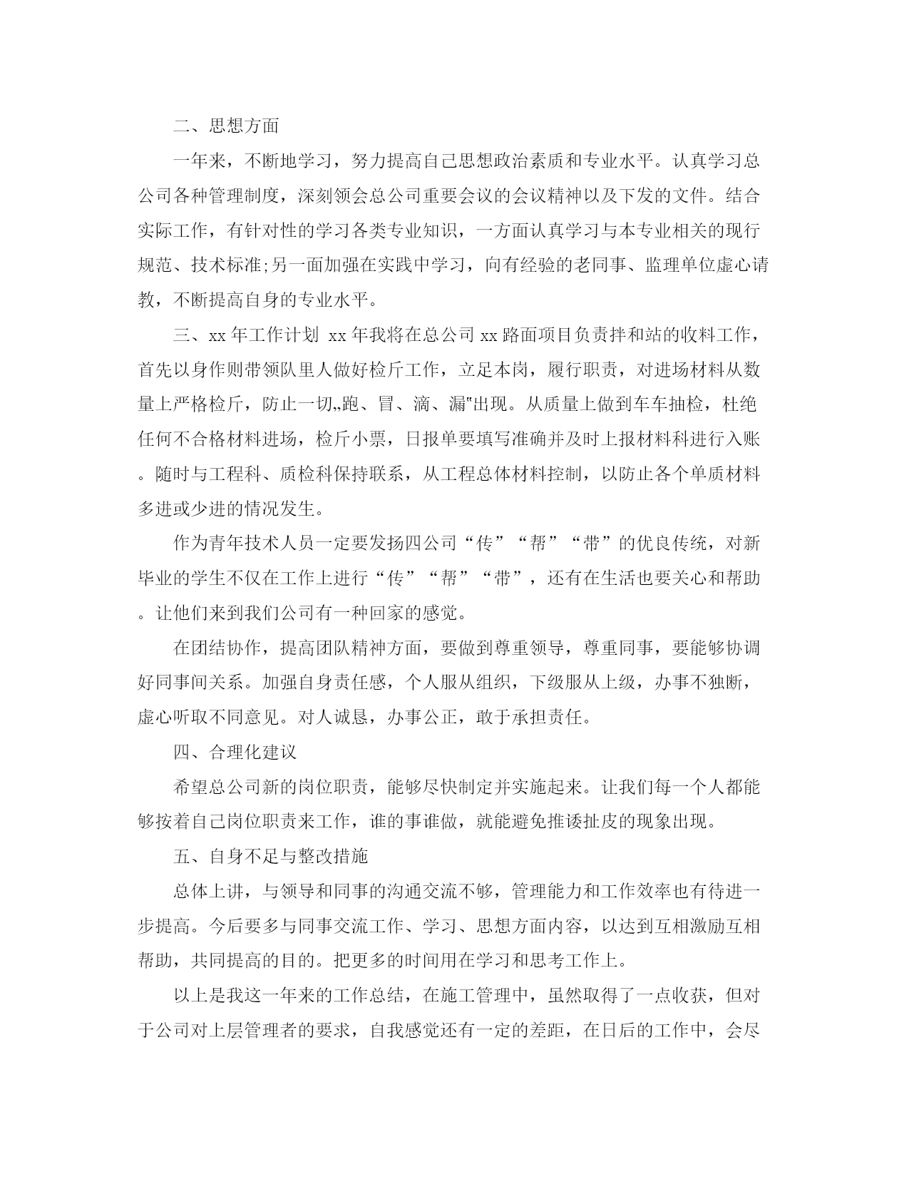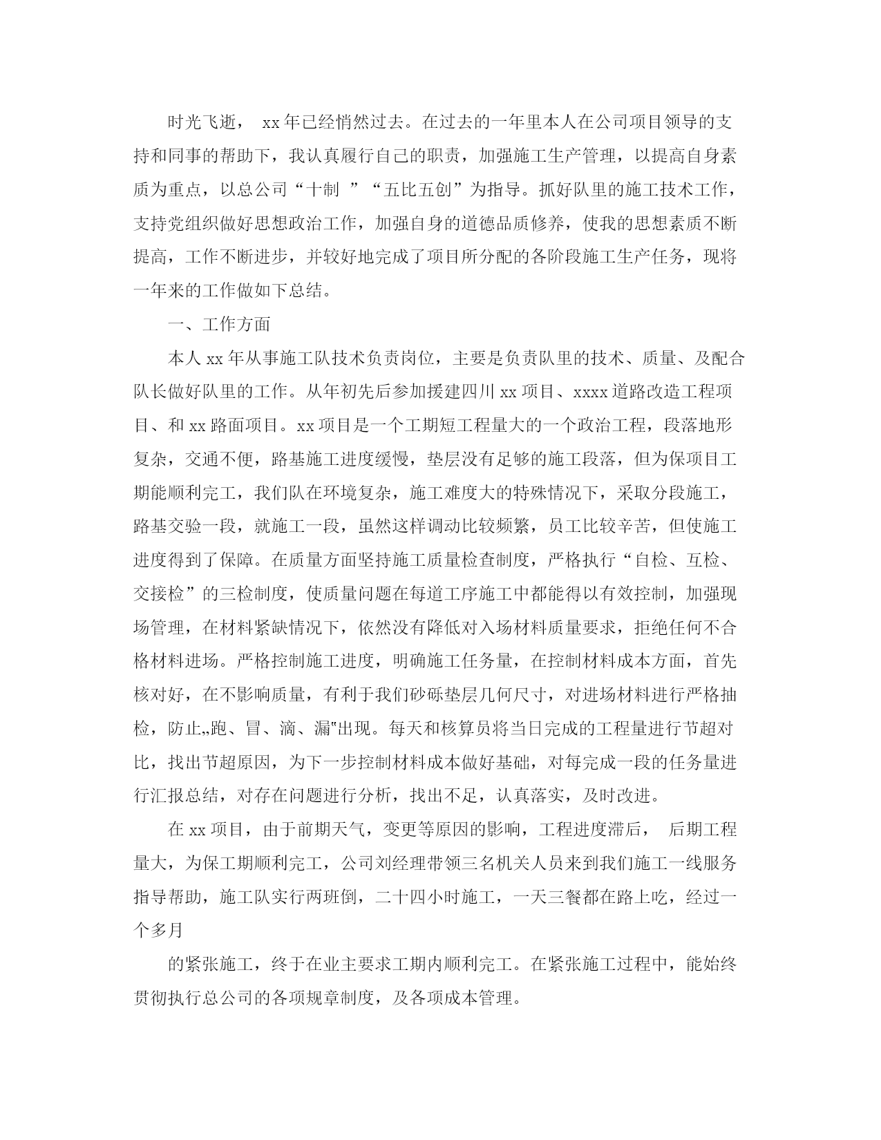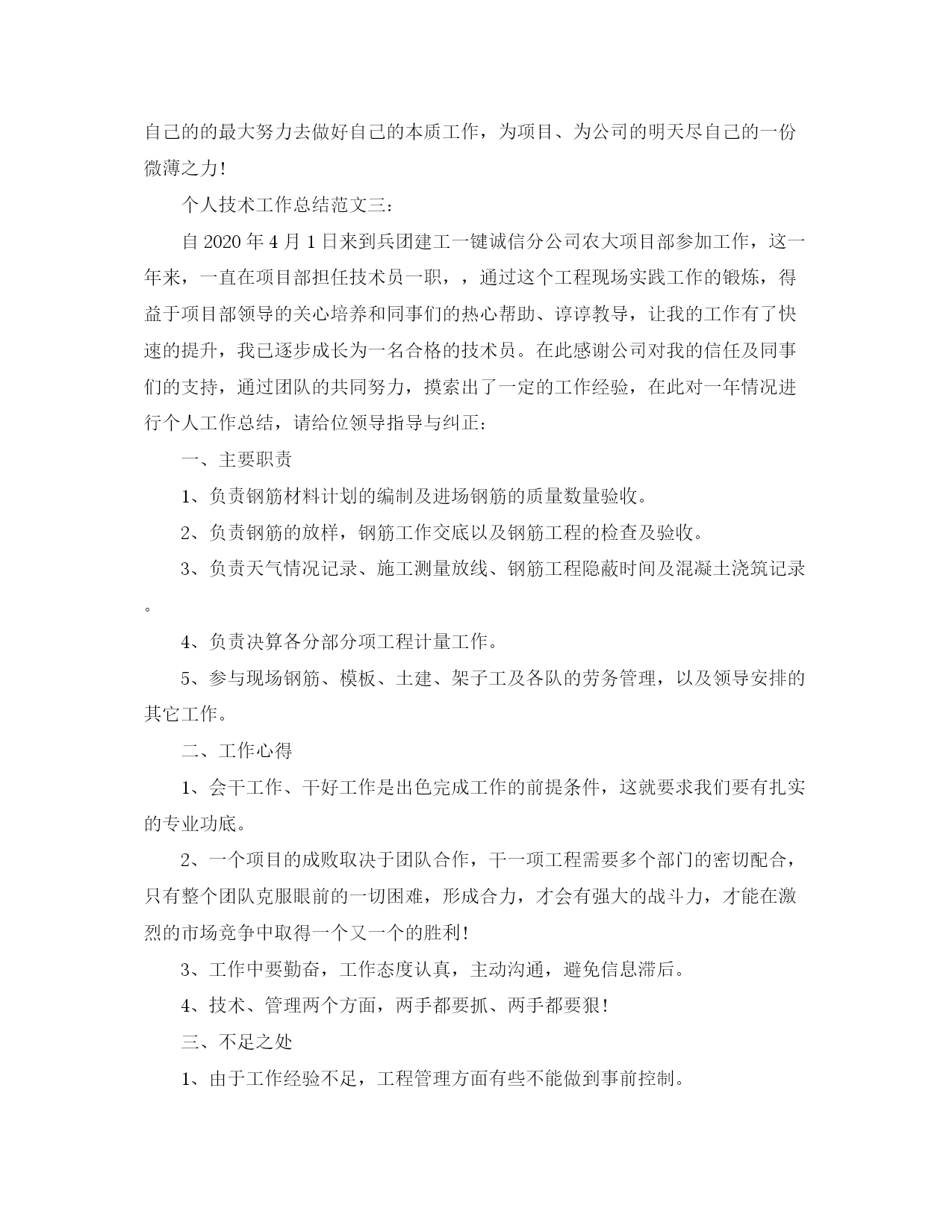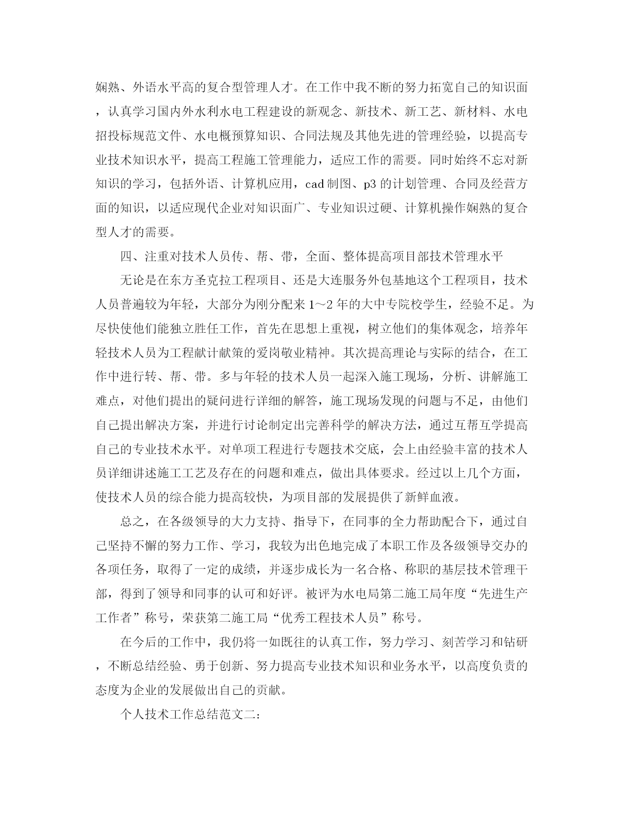 此资料由网络收集而来,如有侵权请告知上传者立即删除。资料共分享,我们负责传递知识。个人技术工作总结范文3篇作为技术人员为本职的技术工作做一个总结,本文是个人技术工作的总结范文,仅供参考。个人技术工作总结范文一:自从我参加工作以来,我始终本着“干一行,爱一行,专一行”工作态度和敬业精神,热爱祖国的水文水利事业,刻苦钻研业务,努力实践,积极向工人师傅、同事学习,工作勤勤恳恳,勇于开拓创新,以孜孜不倦的工作态度和一丝不苟的职业道德以及高度的责任感和强烈的事业心,努力拓宽知识面,积极学习、熟练掌握水利建设的新技术、新设备、新观念,从而使我不断地改造和完善,在工作、学习、生活等各方面有了长足的发展。现将参加工作以来的情况总结如下:一、不断学习,努力提高思想理论水平和政治素质在工作、生活中,我始终自觉学习马列主义、毛泽东思想、***理论及***的“三个代表”,坚决执行党在新时期制定的路线、方针、政策,积极向党组织靠拢,在思想上始终与局党支部保持一致,自觉抵制社会上的种种不良现象,努力提高自身思想政治水平。通过认真学习,增强了在重大问题处理上的判断能力,在解决问题时能够避免搞片面性;在工作中与同事互相帮助,共同提高;在生活中廉洁自律,遵纪守法。二、立足本职工作,勇于创新,积极优化施工方案、积极推广和应用新技术、新工艺,创造经济效益。参加工作以来,在各级领导的关怀和培养下,我一直勤奋严谨、求实创新,总结经验,不断丰富和完善自我。三、结合工作需要,不断学习、总结和钻研,加强业务学习和管理知识为了使我局在新世纪再度腾飞和辉煌,作为一个工程管理和技术人员,尤其是逐步走上基层技术领导岗位,我深深感受到,企业需要的不仅仅是是单一的专业人才,而是要求知识面广、专业知识过硬、精通管理、熟知合同、计算机操作娴熟、外语水平高的复合型管理人才。在工作中我不断的努力拓宽自己的知识面,认真学习国内外水利水电工程建设的新观念、新技术、新工艺、新材料、水电招投标规范文件、水电概预算知识、合同法规及其他先进的管理经验,以提高专业技术知识水平,提高工程施工管理能力,适应工作的需要。同时始终不忘对新知识的学习,包括外语、计算机应用,cad制图、p3的计划管理、合同及经营方面的知识,以适应现代企业对知识面广、专业知识过硬、计算机操作娴熟的复合型人才的需要。四、注重对技术人员传、帮、带,全面、整体提高项目部技术管理水平无论是在东方圣克拉工程项目、还是大连服务外包基地这个工程项目,技术人员普遍较为年轻,大部分为刚分配来1~2年的大中专院校学生,经验不足。为尽快使他们能独立胜任工作,首先在思想上重视,树立他们的集体观念,培养年轻技术人员为工程献计献策的爱岗敬业精神。其次提高理论与实际的结合,在工作中进行转、帮、带。多与年轻的技术人员一起深入施工现场,分析、讲解施工难点,对他们提出的疑问进行详细的解答,施工现场发现的问题与不足,由他们自己提出解决方案,并进行讨论制定出完善科学的解决方法,通过互帮互学提高自己的专业技术水平。对单项工程进行专题技术交底,会上由经验丰富的技术人员详细讲述施工工艺及存在的问题和难点,做出具体要求。经过以上几个方面,使技术人员的综合能力提高较快,为项目部的发展提供了新鲜血液。总之,在各级领导的大力支持、指导下,在同事的全力帮助配合下,通过自己坚持不懈的努力工作、学习,我较为出色地完成了本职工作及各级领导交办的各项任务,取得了一定的成绩,并逐步成长为一名合格、称职的基层技术管理干部,得到了领导和同事的认可和好评。被评为水电局第二施工局年度“先进生产工作者”称号,荣获第二施工局“优秀工程技术人员”称号。在今后的工作中,我仍将一如既往的认真工作,努力学习、刻苦学习和钻研,不断总结经验、勇于创新、努力提高专业技术知识和业务水平,以高度负责的态度为企业的发展做出自己的贡献。个人技术工作总结范文二:时光飞逝,xx年已经悄然过去。在过去的一年里本人在公司项目领导的支持和同事的帮助下,我认真履行自己的职责,加强施工生产管理,以提高自身素质为重点,以总公司“十制”“五比五创”为指导。抓好队里的施工技术工作,支持党组织做好思想政治工作,加强自身的道德品质修养,使我的思想素质不断提高,工作不断进步,并较好地完成了项目所分配的各阶段施工生产任务,现将一年来的工作做如下总结。一、工作方面本人xx年从事施工队技术负责岗位,主要是负责队里的技术、质量、及配合队长做好队里的工作。从年初先后参加援建四川xx项目、xxxx道路改造工程项目、和xx路面项目。xx项目是一个工期短工程量大的一个政治工程,段落地形复杂,交通不便,路基施工进度缓慢,垫层没有足够的施工段落,但为保项目工期能顺利完工,我们队在环境复杂,施工难度大的特殊情况下,采取分段施工,路基交验一段,就施