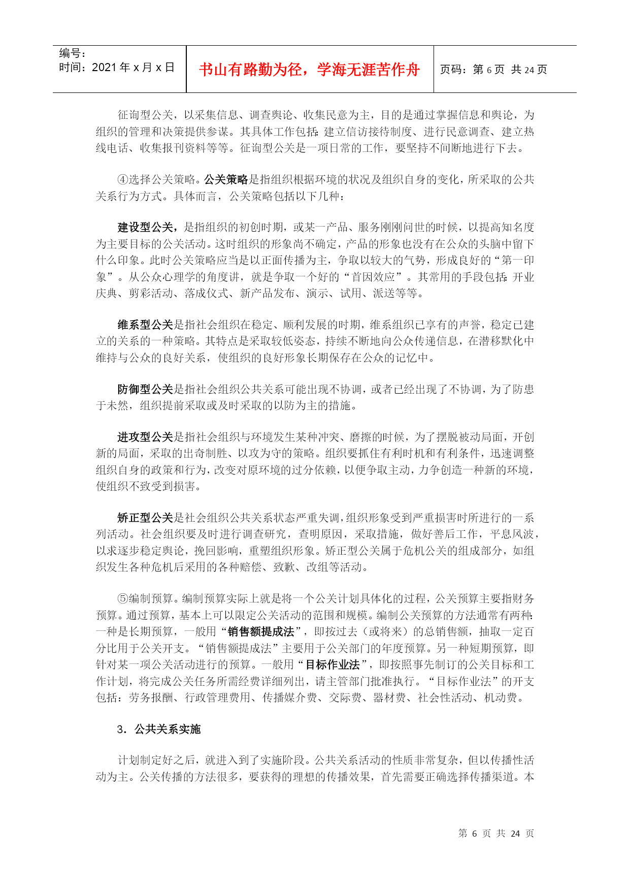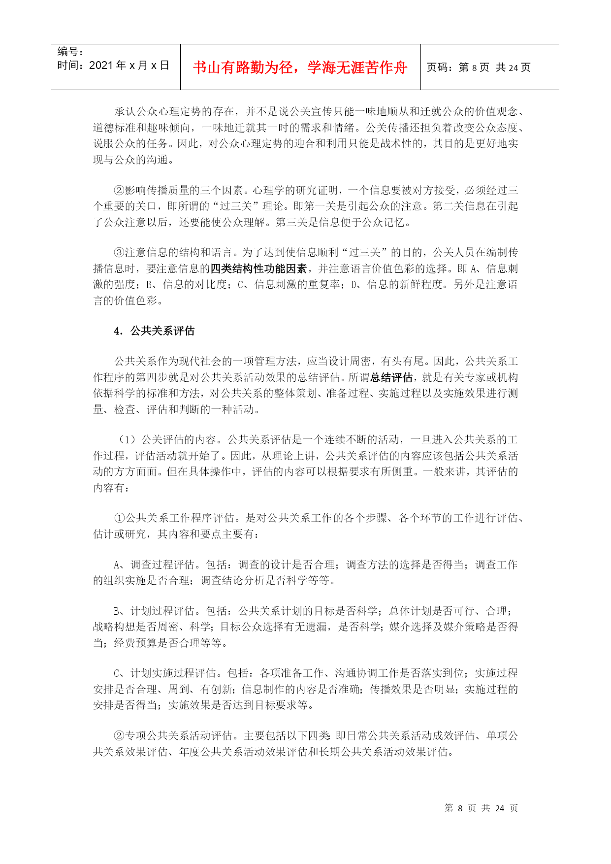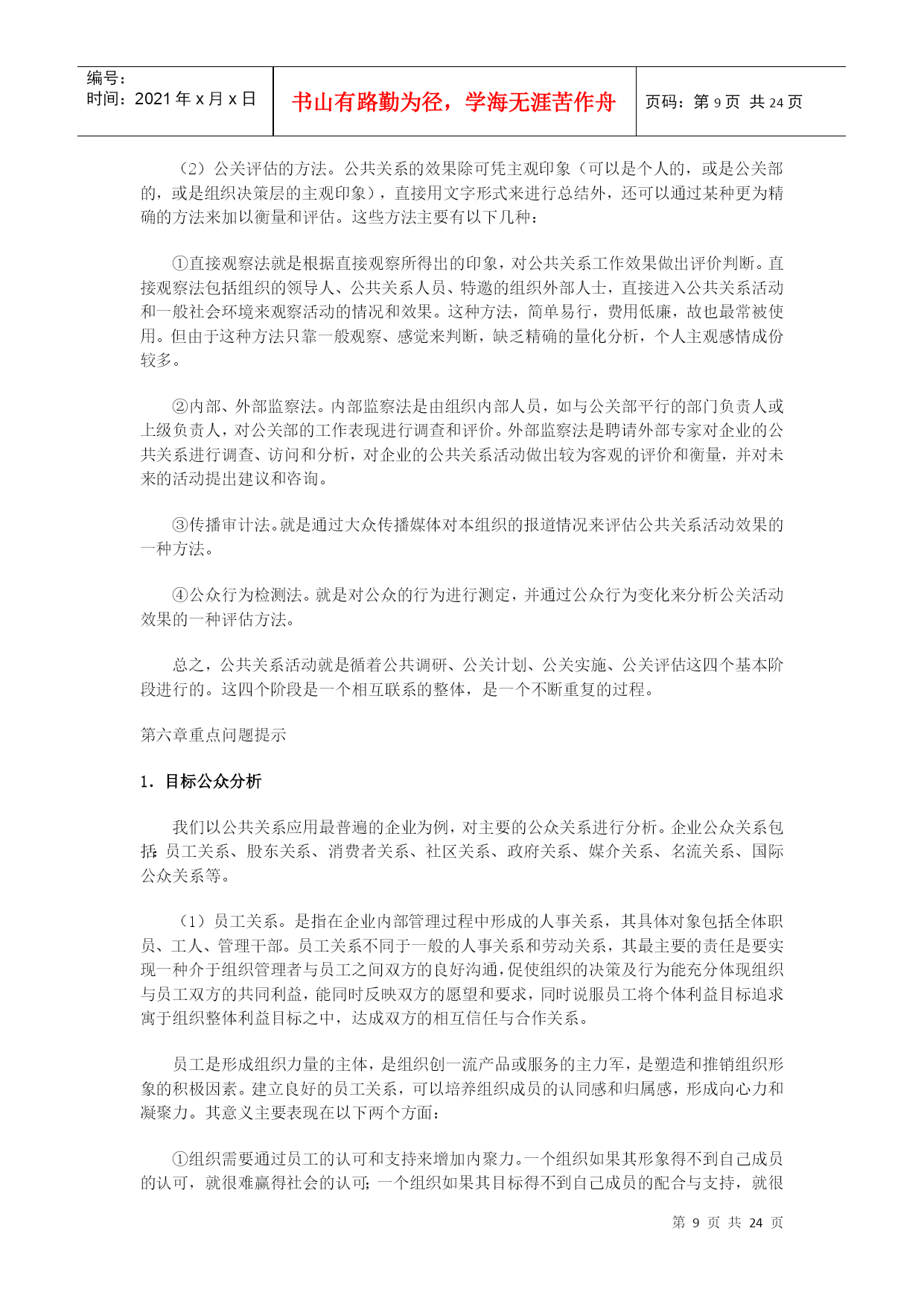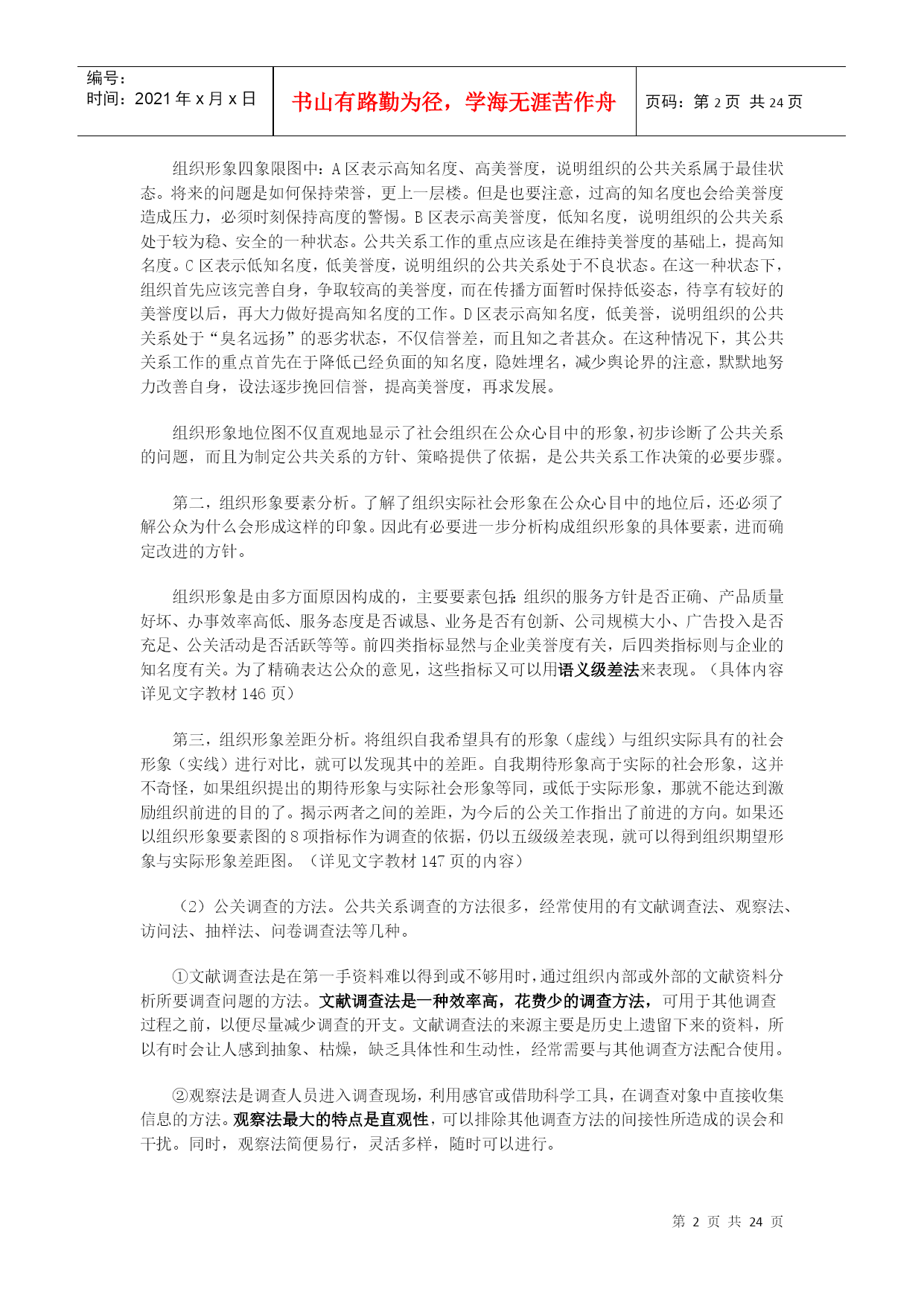 编号:时间:2021年x月x日书山有路勤为径,学海无涯苦作舟页码:第PAGE24页共NUMPAGES24页第PAGE\*MERGEFORMAT24页共NUMPAGES\*MERGEFORMAT24页《公共关系实务》教学辅导三第五章重点问题提示美国公共关系学的权威著作《有效的公共关系》一书,提出了公共关系的四步工作法,将公共关系的工作程序概括成四个基本步骤:公共关系调查、公共关系策划、公共关系实施和公共关系评估。1.公共关系调查公共关系调查是指社会组织通过运用科学方法,搜集公众对组织主体的评价资料,进而对主体公共关系状态进行客观分析的一种公共关系实务活动。公关调查作为公关工作程序的基础步骤和首要环节,对组织的整个公关活动具有重要意义。(1)公关调查的内容。主要包括:社会环境调查、公众调查和组织形象调查。①社会环境调查。对社会环境进行调查,主要是为了分析、把握与本组织有关的社会政治、经济、科技、文化等方面的一切动态。②公众调查。公众是公关部门工作的主要对象,从某种意义上讲,公众也就是公关部门所面对的具体环境。公众是一个经常变化的群体,不断因问题的发展而变迁。因此公众调查应经常进行,公众调研要掌握的材料包括:公众构成、公众态度、公众需求、意见领袖。③组织形象调查。组织形象就是组织在公众心目中留下的印象。换言之,组织形象也就是公众对组织的看法和评价。组织形象调查可分成两个方面:一是组织自我期待形象的调查;二是组织实际社会形象的分析。自我期待形象与实际社会形象之间的差距,就是公关工作的目标。公关部门可以通过民意测验、舆论监督、与领导面谈等方法,获得自身的实际社会形象。组织的实际社会形象调查可以分成三个部分:第一,是组织形象地位图。一个组织实际的社会形象,需要用公众对该组织的认识、看法和评价来反映,这些指标又可概括成知名度和美誉度这两个综合指标。知名度是公众对组织知晓和了解程度,是反映组织社会名气大小的客观指标。其具体内容包括:公众是否知道本组织的名称、标志、产品、服务、领导人、成立时间等等方面。美誉度则是公众对组织的信任和赞许程度,是组织社会名誉好坏的客观指标。其具体内容包括:是否喜欢本企业的产品、服务和销售方式,对本组织的机构设置、人员素质、工作效率的评价如何,本组织的经营方针是否正确等等。一个组织的形象好坏,通过知名度和美誉度两个指标就可以反映出来。将调查获得的数据纵横交错,就构成了一个组织形象四象限图,它是公关专家们测定组织实际社会形象的主要工具。组织形象四象限图中:A区表示高知名度、高美誉度,说明组织的公共关系属于最佳状态。将来的问题是如何保持荣誉,更上一层楼。但是也要注意,过高的知名度也会给美誉度造成压力,必须时刻保持高度的警惕。B区表示高美誉度,低知名度,说明组织的公共关系处于较为稳、安全的一种状态。公共关系工作的重点应该是在维持美誉度的基础上,提高知名度。C区表示低知名度,低美誉度,说明组织的公共关系处于不良状态。在这一种状态下,组织首先应该完善自身,争取较高的美誉度,而在传播方面暂时保持低姿态,待享有较好的美誉度以后,再大力做好提高知名度的工作。D区表示高知名度,低美誉,说明组织的公共关系处于“臭名远扬”的恶劣状态,不仅信誉差,而且知之者甚众。在这种情况下,其公共关系工作的重点首先在于降低已经负面的知名度,隐姓埋名,减少舆论界的注意,默默地努力改善自身,设法逐步挽回信誉,提高美誉度,再求发展。组织形象地位图不仅直观地显示了社会组织在公众心目中的形象,初步诊断了公共关系的问题,而且为制定公共关系的方针、策略提供了依据,是公共关系工作决策的必要步骤。第二,组织形象要素分析。了解了组织实际社会形象在公众心目中的地位后,还必须了解公众为什么会形成这样的印象。因此有必要进一步分析构成组织形象的具体要素,进而确定改进的方针。组织形象是由多方面原因构成的,主要要素包括:组织的服务方针是否正确、产品质量好坏、办事效率高低、服务态度是否诚恳、业务是否有创新、公司规模大小、广告投入是否充足、公关活动是否活跃等等。前四类指标显然与企业美誉度有关,后四类指标则与企业的知名度有关。为了精确表达公众的意见,这些指标又可以用语义级差法来表现。(具体内容详见文字教材146页)第三,组织形象差距分析。将组织自我希望具有的形象(虚线)与组织实际具有的社会形象(实线)进行对比,就可以发现其中的差距。自我期待形象高于实际的社会形象,这并不奇怪,如果组织提出的期待形象与实际社会形象等同,或低于实际形象,那就不能达到激励组织前进的目的了。揭示两者之间的差距,为今后的公关工作指出了前进的方向。如果还以组织形象要素图的8项指标作为调查的依据,仍以五级级差表现,就可以得到组织期望形象与实际形象差距图。(