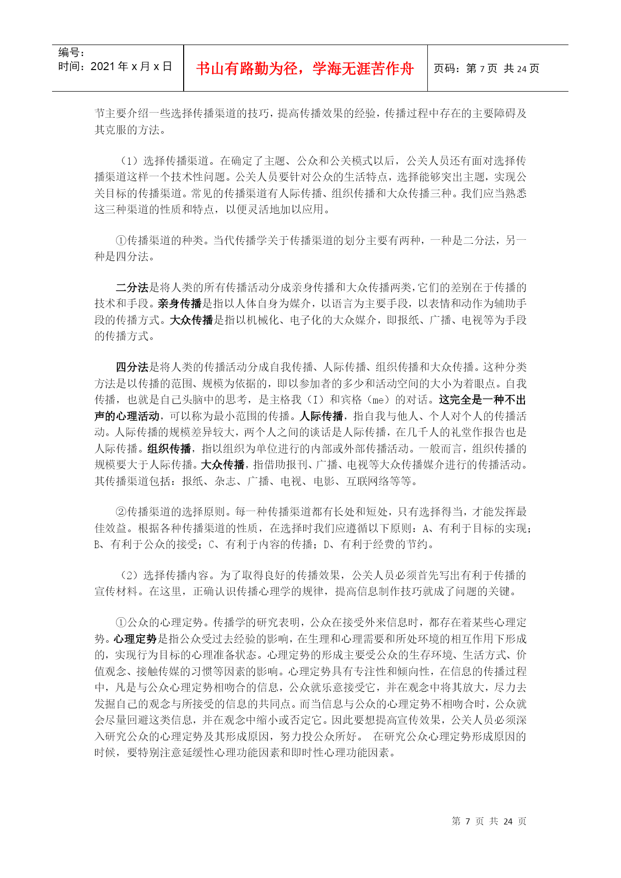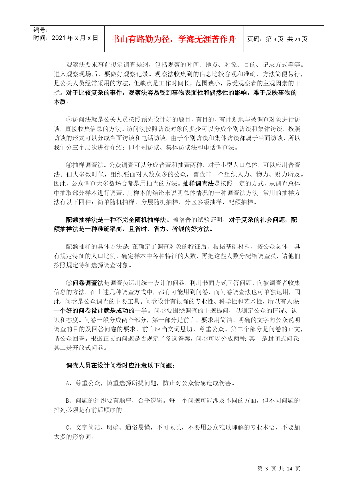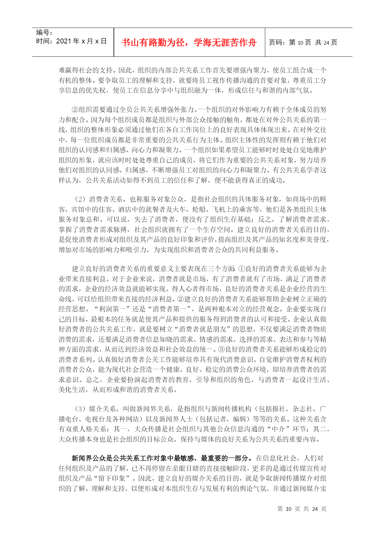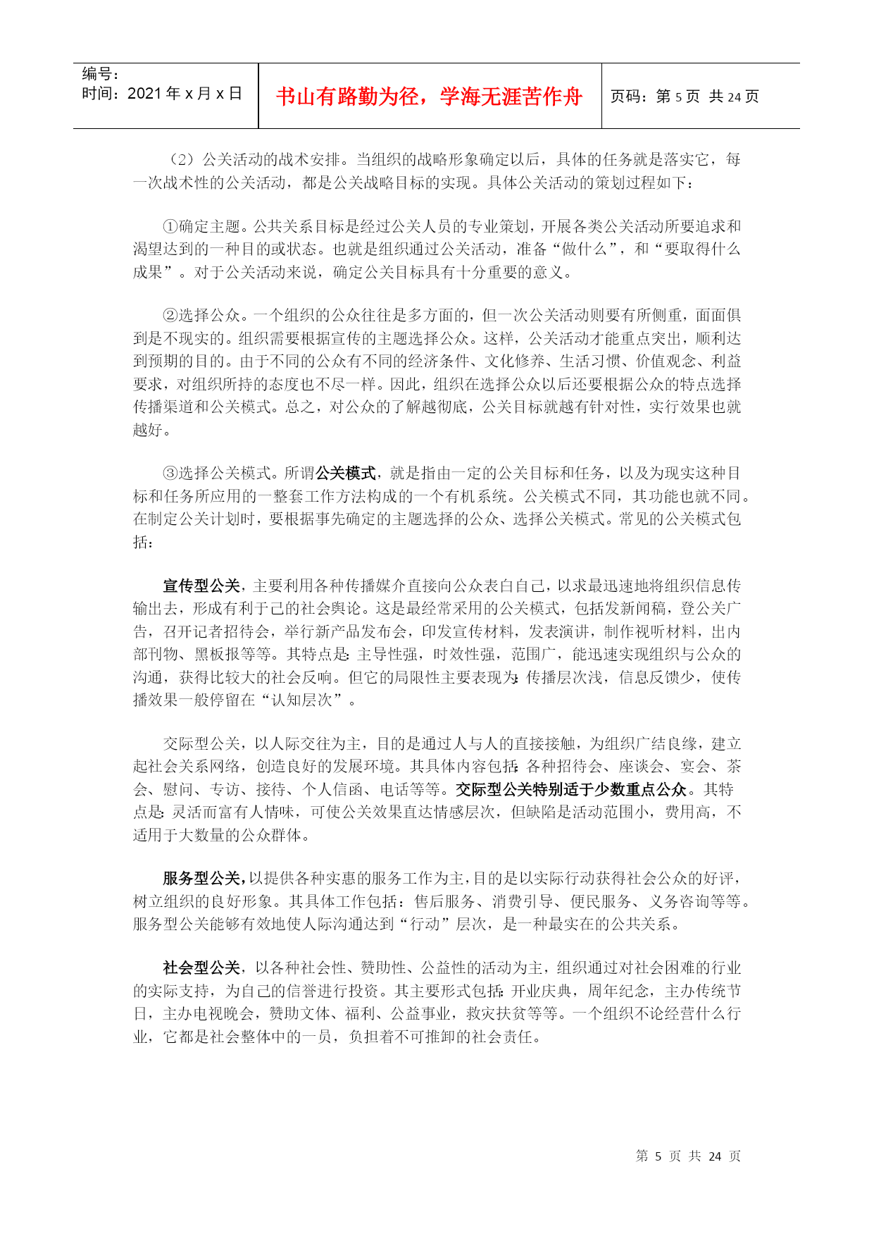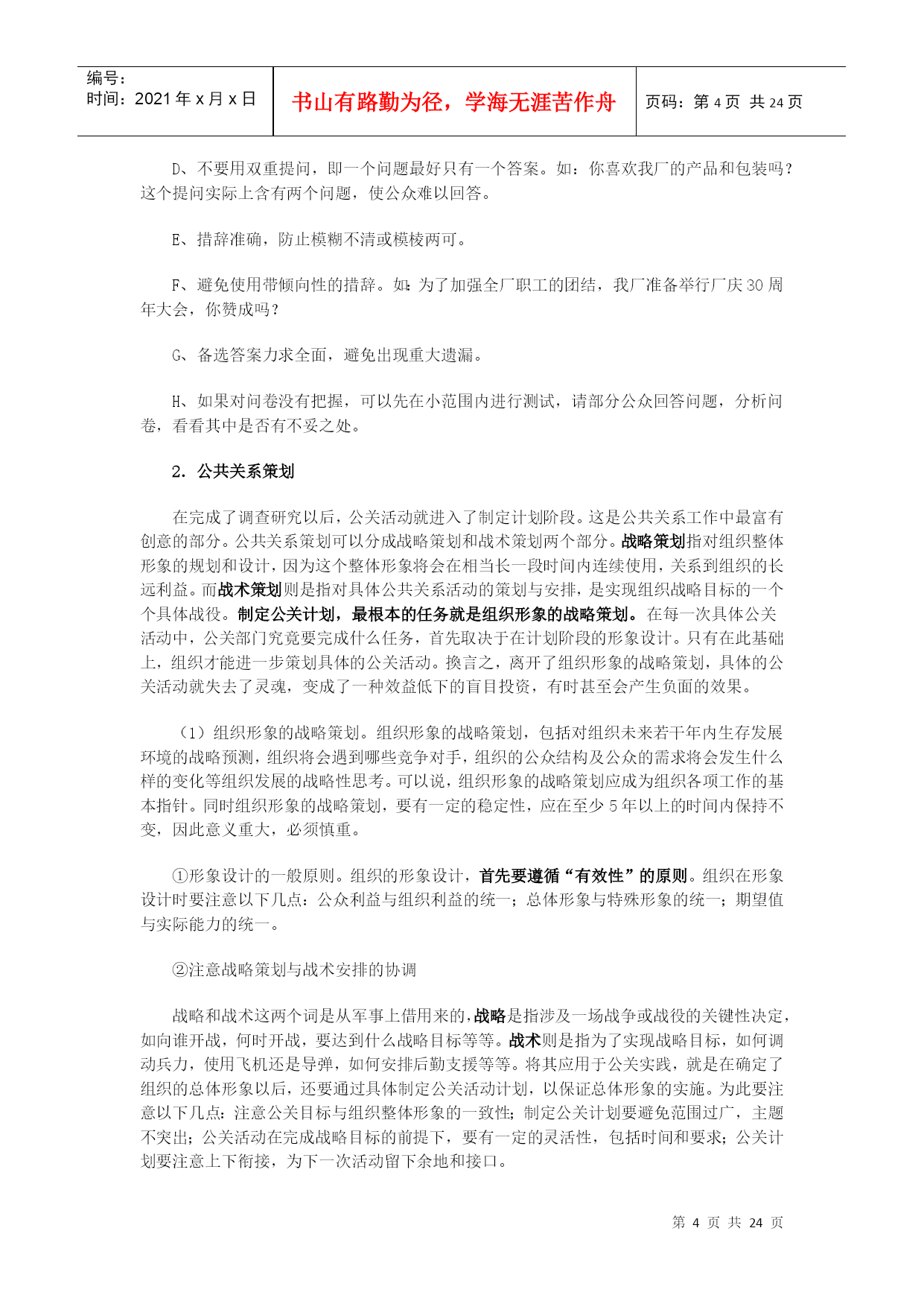 编号:时间:2021年x月x日书山有路勤为径,学海无涯苦作舟页码:第PAGE24页共NUMPAGES24页第PAGE\*MERGEFORMAT24页共NUMPAGES\*MERGEFORMAT24页《公共关系实务》教学辅导三第五章重点问题提示美国公共关系学的权威著作《有效的公共关系》一书,提出了公共关系的四步工作法,将公共关系的工作程序概括成四个基本步骤:公共关系调查、公共关系策划、公共关系实施和公共关系评估。1.公共关系调查公共关系调查是指社会组织通过运用科学方法,搜集公众对组织主体的评价资料,进而对主体公共关系状态进行客观分析的一种公共关系实务活动。公关调查作为公关工作程序的基础步骤和首要环节,对组织的整个公关活动具有重要意义。(1)公关调查的内容。主要包括:社会环境调查、公众调查和组织形象调查。①社会环境调查。对社会环境进行调查,主要是为了分析、把握与本组织有关的社会政治、经济、科技、文化等方面的一切动态。②公众调查。公众是公关部门工作的主要对象,从某种意义上讲,公众也就是公关部门所面对的具体环境。公众是一个经常变化的群体,不断因问题的发展而变迁。因此公众调查应经常进行,公众调研要掌握的材料包括:公众构成、公众态度、公众需求、意见领袖。③组织形象调查。组织形象就是组织在公众心目中留下的印象。换言之,组织形象也就是公众对组织的看法和评价。组织形象调查可分成两个方面:一是组织自我期待形象的调查;二是组织实际社会形象的分析。自我期待形象与实际社会形象之间的差距,就是公关工作的目标。公关部门可以通过民意测验、舆论监督、与领导面谈等方法,获得自身的实际社会形象。组织的实际社会形象调查可以分成三个部分:第一,是组织形象地位图。一个组织实际的社会形象,需要用公众对该组织的认识、看法和评价来反映,这些指标又可概括成知名度和美誉度这两个综合指标。知名度是公众对组织知晓和了解程度,是反映组织社会名气大小的客观指标。其具体内容包括:公众是否知道本组织的名称、标志、产品、服务、领导人、成立时间等等方面。美誉度则是公众对组织的信任和赞许程度,是组织社会名誉好坏的客观指标。其具体内容包括:是否喜欢本企业的产品、服务和销售方式,对本组织的机构设置、人员素质、工作效率的评价如何,本组织的经营方针是否正确等等。一个组织的形象好坏,通过知名度和美誉度两个指标就可以反映出来。将调查获得的数据纵横交错,就构成了一个组织形象四象限图,它是公关专家们测定组织实际社会形象的主要工具。组织形象四象限图中:A区表示高知名度、高美誉度,说明组织的公共关系属于最佳状态。将来的问题是如何保持荣誉,更上一层楼。但是也要注意,过高的知名度也会给美誉度造成压力,必须时刻保持高度的警惕。B区表示高美誉度,低知名度,说明组织的公共关系处于较为稳、安全的一种状态。公共关系工作的重点应该是在维持美誉度的基础上,提高知名度。C区表示低知名度,低美誉度,说明组织的公共关系处于不良状态。在这一种状态下,组织首先应该完善自身,争取较高的美誉度,而在传播方面暂时保持低姿态,待享有较好的美誉度以后,再大力做好提高知名度的工作。D区表示高知名度,低美誉,说明组织的公共关系处于“臭名远扬”的恶劣状态,不仅信誉差,而且知之者甚众。在这种情况下,其公共关系工作的重点首先在于降低已经负面的知名度,隐姓埋名,减少舆论界的注意,默默地努力改善自身,设法逐步挽回信誉,提高美誉度,再求发展。组织形象地位图不仅直观地显示了社会组织在公众心目中的形象,初步诊断了公共关系的问题,而且为制定公共关系的方针、策略提供了依据,是公共关系工作决策的必要步骤。第二,组织形象要素分析。了解了组织实际社会形象在公众心目中的地位后,还必须了解公众为什么会形成这样的印象。因此有必要进一步分析构成组织形象的具体要素,进而确定改进的方针。组织形象是由多方面原因构成的,主要要素包括:组织的服务方针是否正确、产品质量好坏、办事效率高低、服务态度是否诚恳、业务是否有创新、公司规模大小、广告投入是否充足、公关活动是否活跃等等。前四类指标显然与企业美誉度有关,后四类指标则与企业的知名度有关。为了精确表达公众的意见,这些指标又可以用语义级差法来表现。(具体内容详见文字教材146页)第三,组织形象差距分析。将组织自我希望具有的形象(虚线)与组织实际具有的社会形象(实线)进行对比,就可以发现其中的差距。自我期待形象高于实际的社会形象,这并不奇怪,如果组织提出的期待形象与实际社会形象等同,或低于实际形象,那就不能达到激励组织前进的目的了。揭示两者之间的差距,为今后的公关工作指出了前进的方向。如果还以组织形象要素图的8项指标作为调查的依据,仍以五级级差表现,就可以得到组织期望形象与实际形象差距图。(