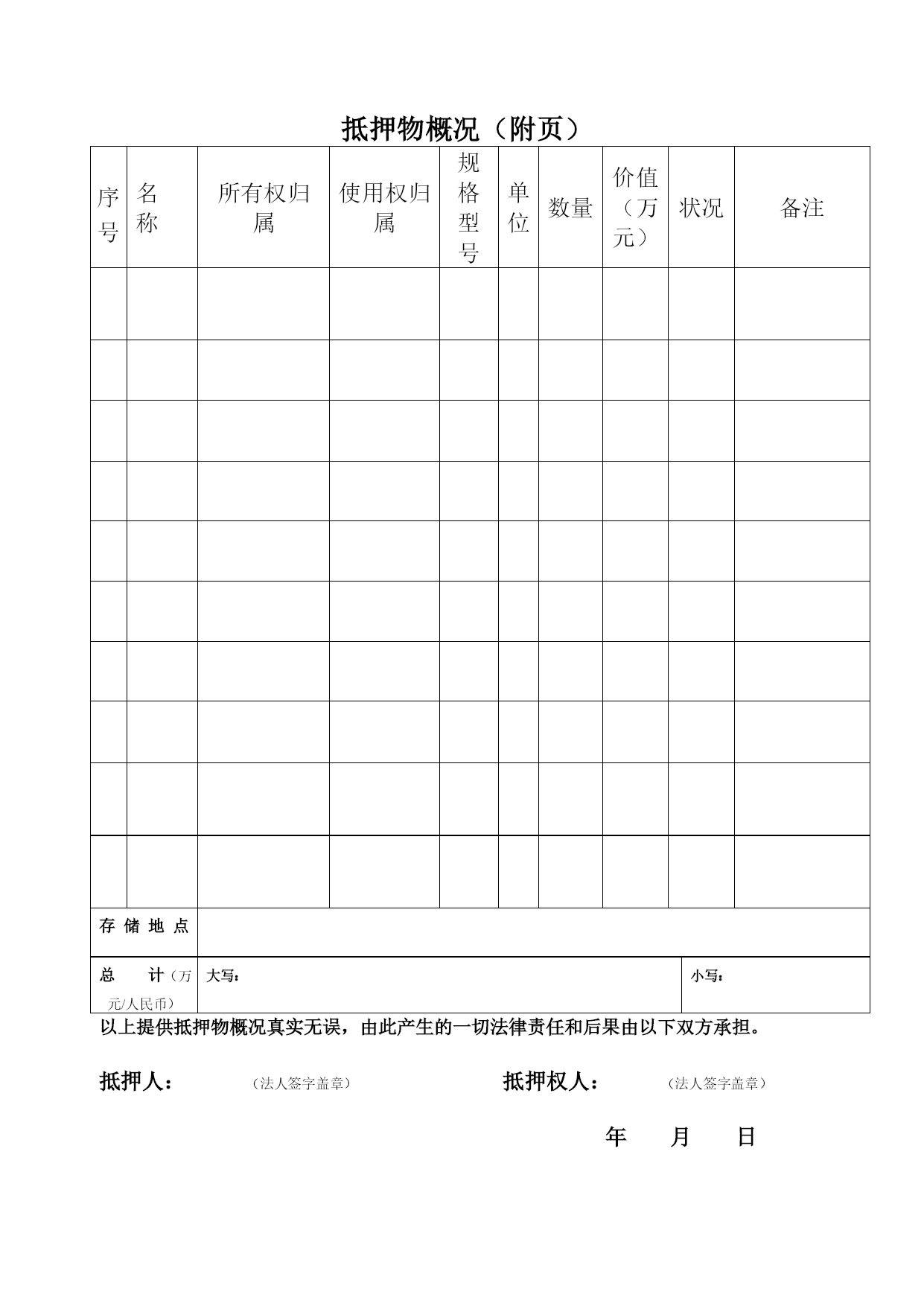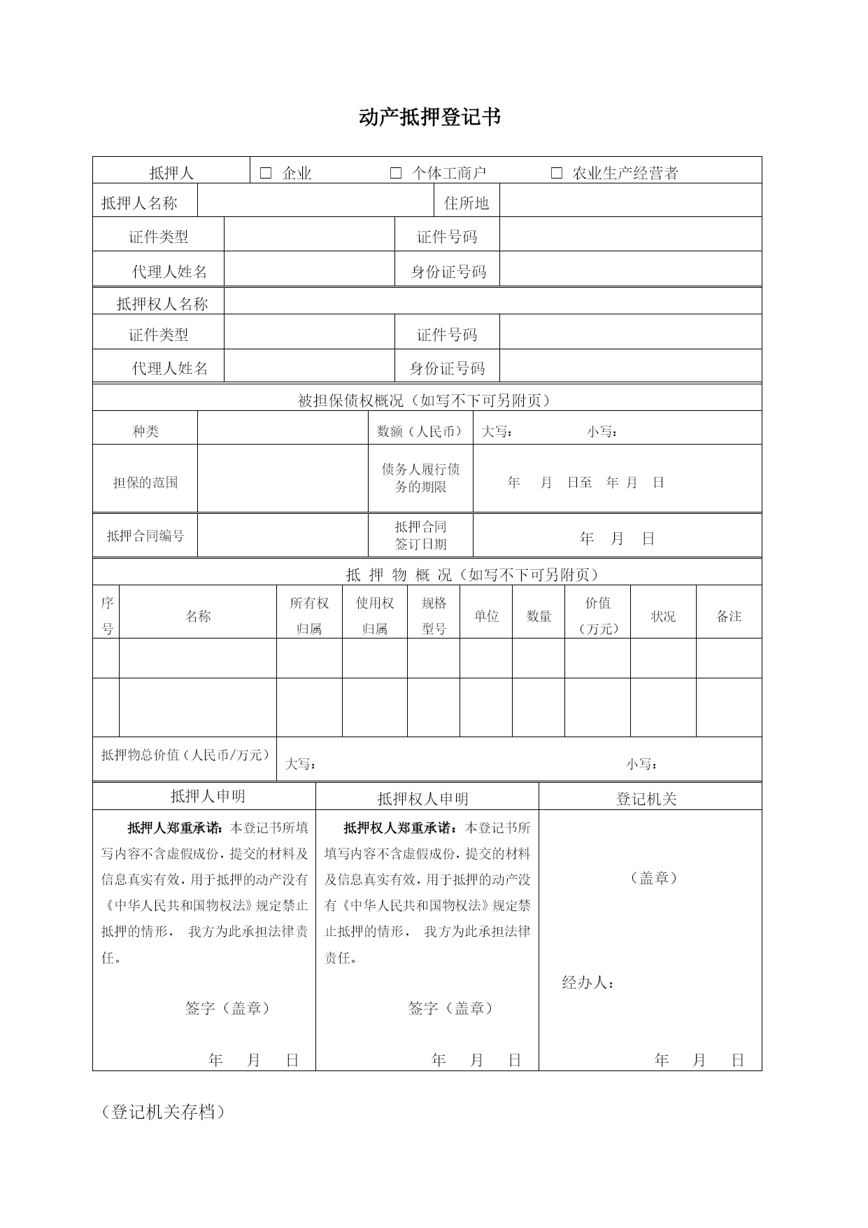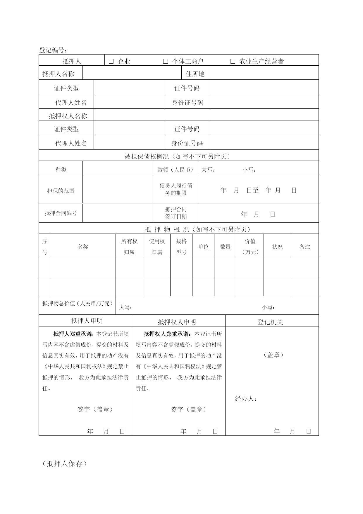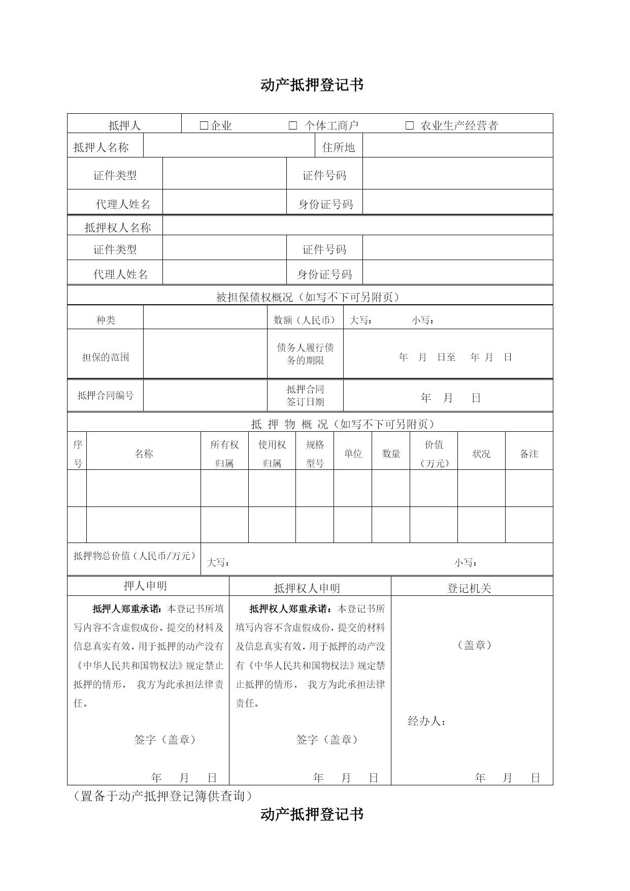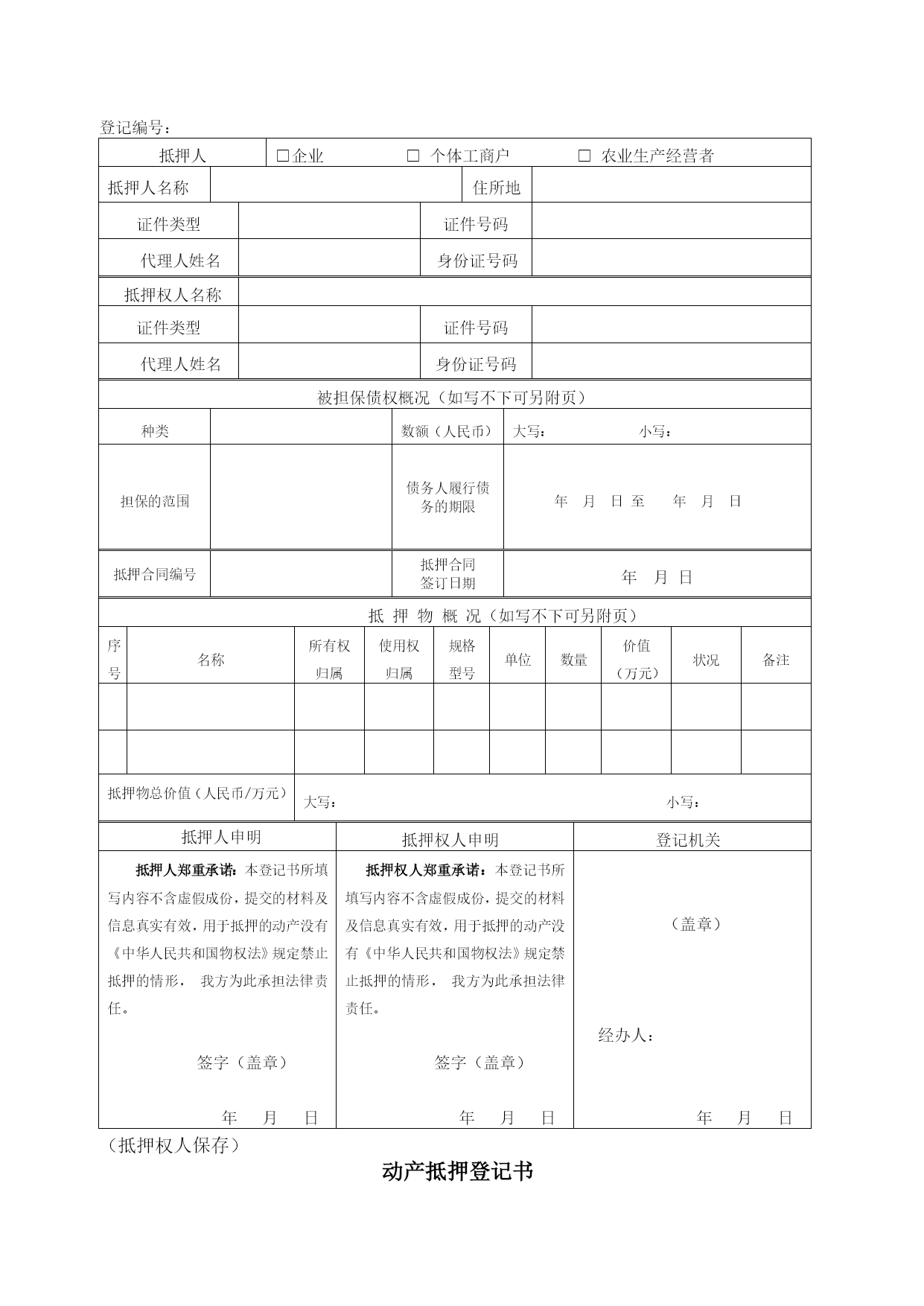 动产抵押登记书抵押人□企业□个体工商户□农业生产经营者抵押人名称住所地证件类型证件号码代理人姓名身份证号码抵押权人名称证件类型证件号码代理人姓名身份证号码被担保债权概况(如写不下可另附页)种类数额(人民币)大写:小写:担保的范围债务人履行债务的期限年月日至年月日抵押合同编号抵押合同签订日期年月日抵押物概况(如写不下可另附页)序号名称所有权归属使用权归属规格型号单位数量价值(万元)状况备注抵押物总价值(人民币/万元)大写:小写:抵押人申明抵押权人申明登记机关抵押人郑重承诺:本登记书所填写内容不含虚假成份,提交的材料及信息真实有效,用于抵押的动产没有《中华人民共和国物权法》规定禁止抵押的情形,我方为此承担法律责任。签字(盖章)年月日抵押权人郑重承诺:本登记书所填写内容不含虚假成份,提交的材料及信息真实有效,用于抵押的动产没有《中华人民共和国物权法》规定禁止抵押的情形,我方为此承担法律责任。签字(盖章)年月日(盖章)经办人:年月日(登记机关存档)动产抵押登记书抵押人□企业□个体工商户□农业生产经营者抵押人名称住所地证件类型证件号码代理人姓名身份证号码抵押权人名称证件类型证件号码代理人姓名身份证号码被担保债权概况(如写不下可另附页)种类数额(人民币)大写:小写:担保的范围债务人履行债务的期限年月日至年月日抵押合同编号抵押合同签订日期年月日抵押物概况(如写不下可另附页)序号名称所有权归属使用权归属规格型号单位数量价值(万元)状况备注抵押物总价值(人民币/万元)大写:小写:押人申明抵押权人申明登记机关抵押人郑重承诺:本登记书所填写内容不含虚假成份,提交的材料及信息真实有效,用于抵押的动产没有《中华人民共和国物权法》规定禁止抵押的情形,我方为此承担法律责任。签字(盖章)年月日抵押权人郑重承诺:本登记书所填写内容不含虚假成份,提交的材料及信息真实有效,用于抵押的动产没有《中华人民共和国物权法》规定禁止抵押的情形,我方为此承担法律责任。签字(盖章)年月日(盖章)经办人:年月日(置备于动产抵押登记簿供查询)动产抵押登记书登记编号:抵押人□企业□个体工商户□农业生产经营者抵押人名称住所地证件类型证件号码代理人姓名身份证号码抵押权人名称证件类型证件号码代理人姓名身份证号码被担保债权概况(如写不下可另附页)种类数额(人民币)大写:小写:担保的范围债务人履行债务的期限年月日至年月日抵押合同编号抵押合同签订日期年月日抵押物概况(如写不下可另附页)序号名称所有权归属使用权归属规格型号单位数量价值(万元)状况备注抵押物总价值(人民币/万元)大写:小写:抵押人申明抵押权人申明登记机关抵押人郑重承诺:本登记书所填写内容不含虚假成份,提交的材料及信息真实有效,用于抵押的动产没有《中华人民共和国物权法》规定禁止抵押的情形,我方为此承担法律责任。签字(盖章)年月日抵押权人郑重承诺:本登记书所填写内容不含虚假成份,提交的材料及信息真实有效,用于抵押的动产没有《中华人民共和国物权法》规定禁止抵押的情形,我方为此承担法律责任。签字(盖章)年月日(盖章)经办人:年月日(抵押权人保存)动产抵押登记书登记编号:抵押人□企业□个体工商户□农业生产经营者抵押人名称住所地证件类型证件号码代理人姓名身份证号码抵押权人名称证件类型证件号码代理人姓名身份证号码被担保债权概况(如写不下可另附页)种类数额(人民币)大写:小写:担保的范围债务人履行债务的期限年月日至年月日抵押合同编号抵押合同签订日期年月日抵押物概况(如写不下可另附页)序号名称所有权归属使用权归属规格型号单位数量价值(万元)状况备注抵押物总价值(人民币/万元)大写:小写:抵押人申明抵押权人申明登记机关抵押人郑重承诺:本登记书所填写内容不含虚假成份,提交的材料及信息真实有效,用于抵押的动产没有《中华人民共和国物权法》规定禁止抵押的情形,我方为此承担法律责任。签字(盖章)年月日抵押权人郑重承诺:本登记书所填写内容不含虚假成份,提交的材料及信息真实有效,用于抵押的动产没有《中华人民共和国物权法》规定禁止抵押的情形,我方为此承担法律责任。签字(盖章)年月日(盖章)经办人:年月日(抵押人保存)抵押物概况(附页)序号名称所有权归属使用权归属规格型号单位数量价值(万元)状况备注存储地点总计(万元/人民币)大写:小写:以上提供抵押物概况真实无误,由此产生的一切法律责任和后果由以下双方承担。抵押人:(法人签字盖章)抵押权人:(法人签字盖章)年月日