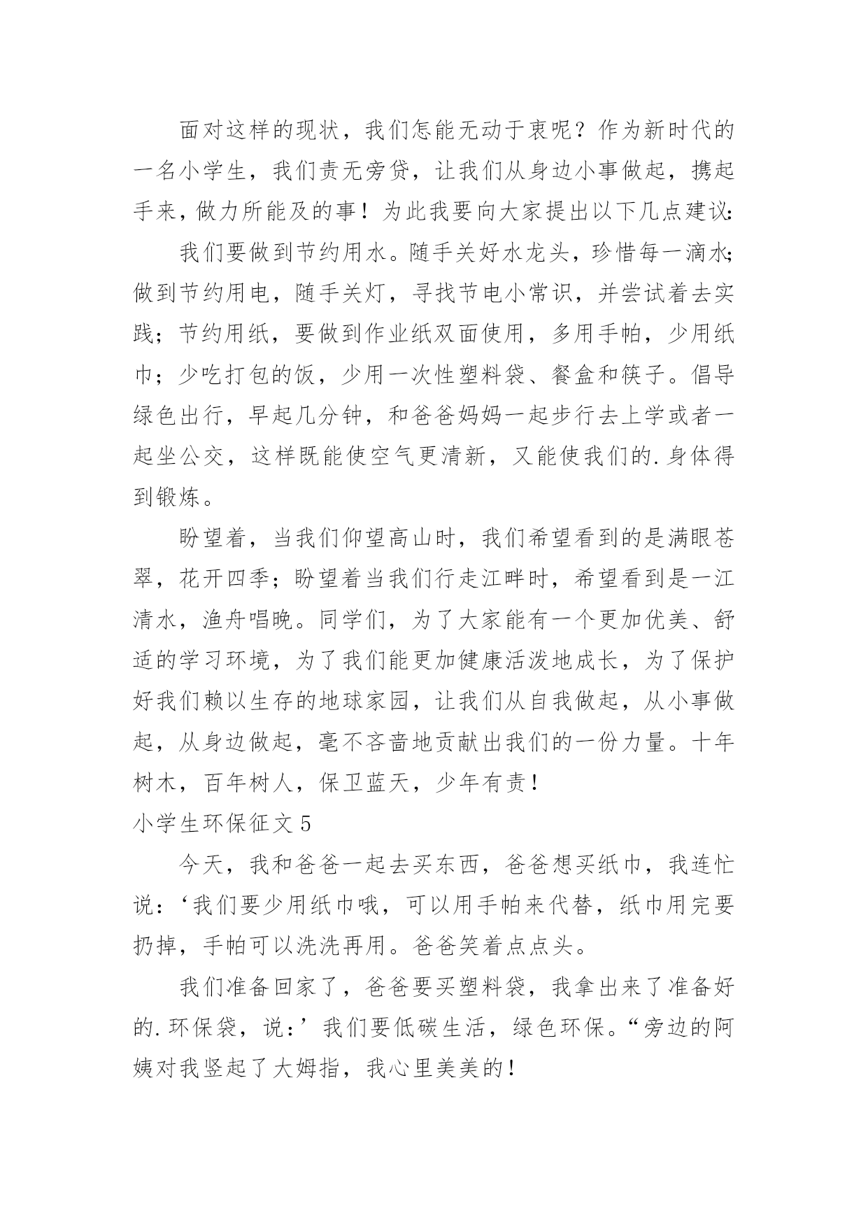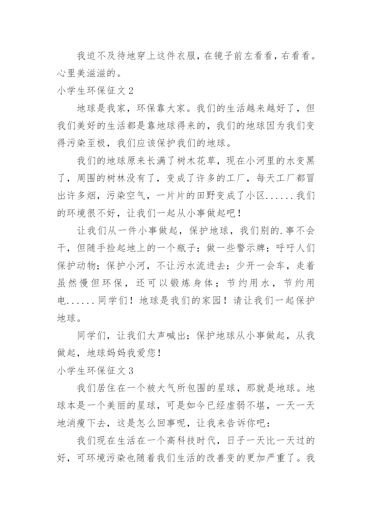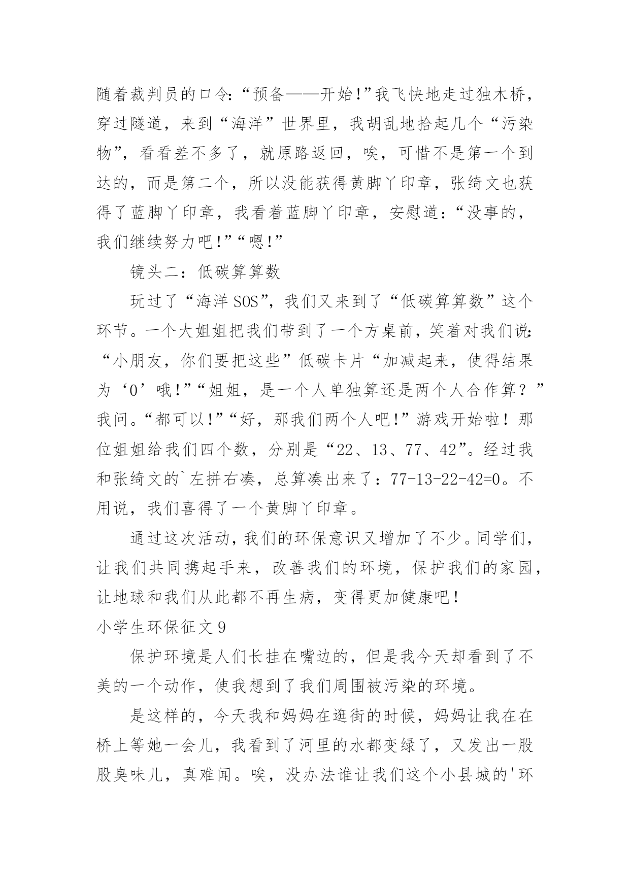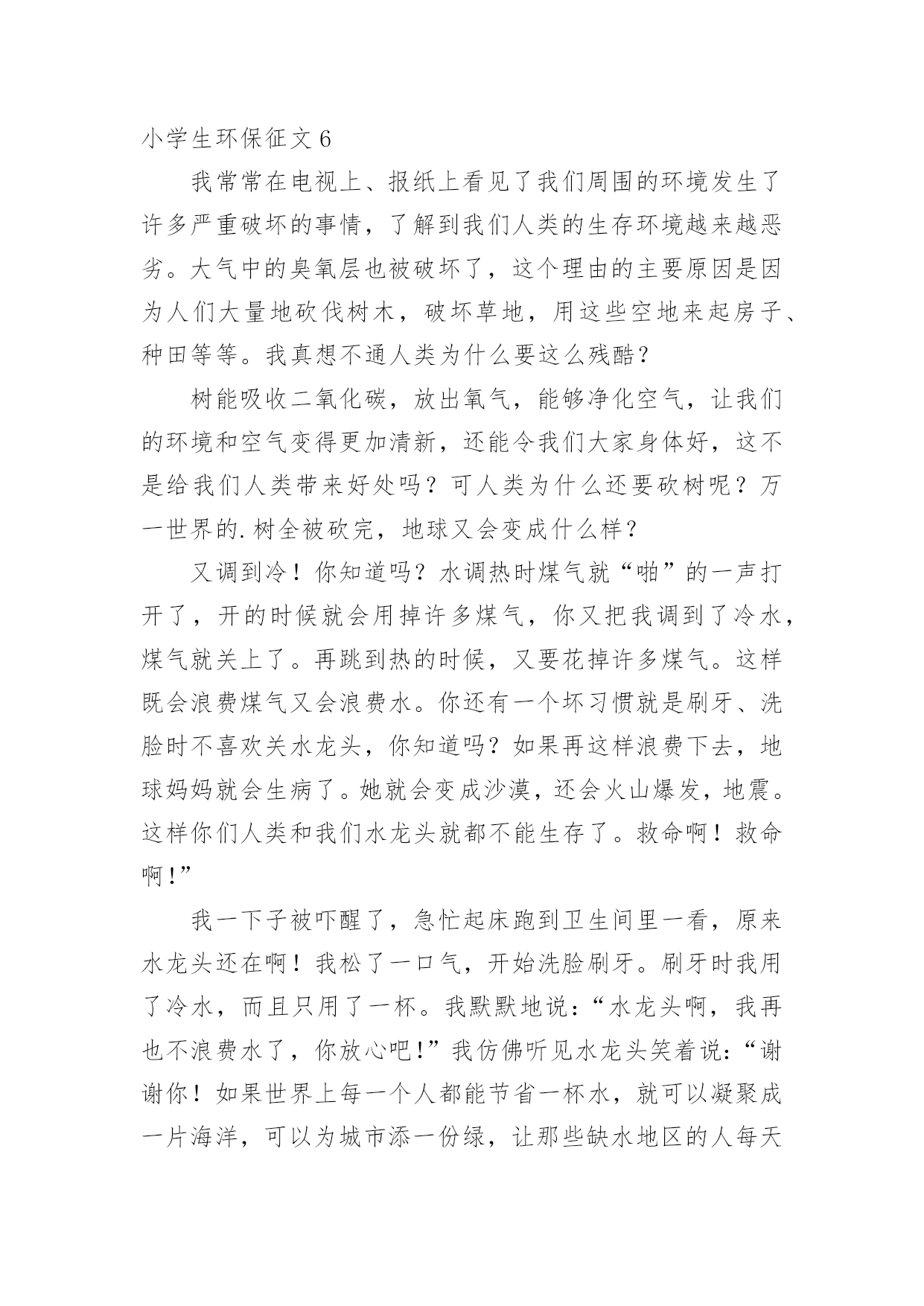 小学生环保征文小学生环保征文无论是身处学校还是步入社会,许多人都写过征文吧,征文要求文面整洁干净,书写端正美观,字体清晰规范,标点准确无误。相信许多人会觉得征文很难写吧,以下是小编精心整理的小学生环保征文,仅供参考,大家一起来看看吧。小学生环保征文1这个星期天,我跟妈妈一起做环保服装。我准备做一件马褂,我先找来两只米袋子,把它裁成正反两面,在正面剪下一个领口,再把它缝起来。我一手拿针,眼睛盯着针眼,一动不动,另一手拿线,我小心翼翼地终于把线穿了进去,又把线头和线尾连在一起,打了个结。我拿起这件衣服,用左手紧紧地按着,右手拿着针线小心翼翼地穿过去。针线像一个淘气的小男孩子,不听使唤。我急得直挠头,妈妈在旁边也看得直摇头。我来做给你看看。我看见妈妈的动作飞快,扎下去,穿上来,又扎下去,又穿上来。不一会儿,一个肩就做好了。我也学着妈妈的样子扎下去,穿上来,又扎下去,又穿上来。我费了九牛二虎之办,另一个肩终于也做好了。妈妈剪了四根横条,我把它们缝在衣服的'左右两边,过了好一会儿,我的第一件手工衣服——————马褂,终于大功告成了。我迫不及待地穿上这件衣服,在镜子前左看看,右看看。心里美滋滋的。小学生环保征文2地球是我家,环保靠大家。我们的生活越来越好了,但我们美好的生活都是靠地球得来的,我们的地球因为我们变得污染至极,我们应该保护我们的地球。我们的地球原来长满了树木花草,现在小河里的水变黑了,周围的树林没有了,变成了许多的工厂,每天工厂都冒出许多烟,污染空气,一片片的田野变成了小区......我们的环境很不好,让我们一起从小事做起吧!让我们从一件小事做起,保护地球,我们别的.事不会干,但随手捡起地上的一个瓶子;做一些警示牌;呼吁人们保护动物;保护小河,不让污水流进去;少开一会车,走着虽然慢但环保,还可以锻炼身体;节约用水,节约用电......同学们!地球是我们的家园!请让我们一起保护地球。同学们,让我们大声喊出;保护地球从小事做起,从我做起,地球妈妈我爱您!小学生环保征文3我们居住在一个被大气所包围的星球,那就是地球。地球本是一个美丽的星球,可是如今已经虚弱不堪,一天一天地消瘦下去,这是怎么回事呢,让我来告诉你吧:我们现在生活在一个高科技时代,日子一天比一天过的好,可环境污染也随着我们生活的改善变的更加严重了。我们应该重视低碳生活,而所谓的低碳就是减少二氧化碳。因为二氧化碳能让臭氧层也就是地球的保护伞渐渐变薄,之后就会引起新的`环境问题,如过量的紫外线能使塑料等高分子材料更加容易老化和分解,结果又带来光化学大气污染。要想做到低碳生活首先我们要多骑车,少开车,因为现在人们便得富有起来了,几乎每家都有一辆汽车,而汽车的尾气的排放造成了环境污染,严重影响了人们的健康。其次我们还要多植树,原因是树木可以理沙化耕地,控制水土流失,防风固沙,增加土壤蓄水能力,可以大大改善生态环境,减轻洪涝灾害的损失。还要少开空调,因为使用空调,会使新鲜的空气中臭氧减少,特别是夏天的时候,要尽量的少开空调,可以吹吹电风扇。最后,我们还应该以环保购物袋替代塑料袋;以节能灯代替白炽灯;用永久性筷子、饭盒,取代一次性餐具;使用传统发条闹钟,取代电子闹钟。让低碳走进我们的生活,让环保走进我们的心中,我们要让地球母亲恢复原来的面貌。小学生环保征文4绿水青山就是金山银山。可是现在,我们周围的环境污染越来越严重,放眼望去,到处都是汽车,尾部喷出灰白色的呛人的烟雾;天总是灰蒙蒙的,白云与灰色融为一体,蓝天不见了,取而代之的是被浓浓的雾霾遮挡着的天空。只有太阳呈现出模糊的轮廓,发着昏黄的光;街道边,草地上,塑料袋随处可见,白色污染越来越严重。我们都知道,地球是我们唯一的家园,可她现在却被我们践踏的面目全非。面对这样的现状,我们怎能无动于衷呢?作为新时代的一名小学生,我们责无旁贷,让我们从身边小事做起,携起手来,做力所能及的事!为此我要向大家提出以下几点建议:我们要做到节约用水。随手关好水龙头,珍惜每一滴水;做到节约用电,随手关灯,寻找节电小常识,并尝试着去实践;节约用纸,要做到作业纸双面使用,多用手帕,少用纸巾;少吃打包的饭,少用一次性塑料袋、餐盒和筷子。倡导绿色出行,早起几分钟,和爸爸妈妈一起步行去上学或者一起坐公交,这样既能使空气更清新,又能使我们的.身体得到锻炼。盼望着,当我们仰望高山时,我们希望看到的是满眼苍翠,花开四季;盼望着当我们行走江畔时,希望看到是一江清水,渔舟唱晚。同学们,为了大家能有一个更加优美、舒适的学习环境,为了我们能更加健康活泼地成长,为了保护好我们赖以生存的地球家园,让我们从自我做起,从小事做起,从身边做起,毫不吝啬地贡献出我们的一份力量。十年树木,百年树人,保卫蓝天,少年有责!小学生环保征文5今天,我和爸爸一起去买东西,爸爸想买纸巾,我连忙说:‘我