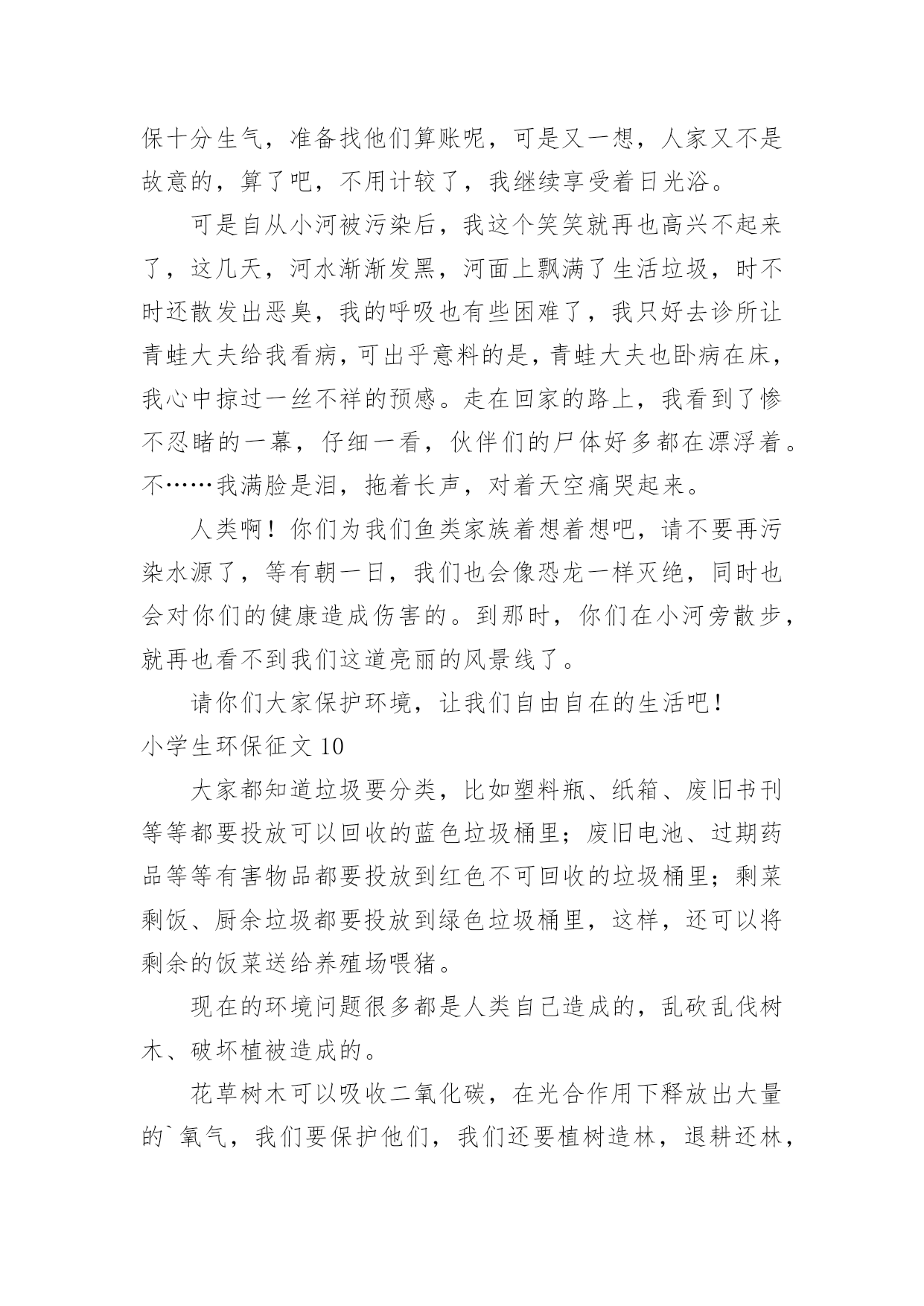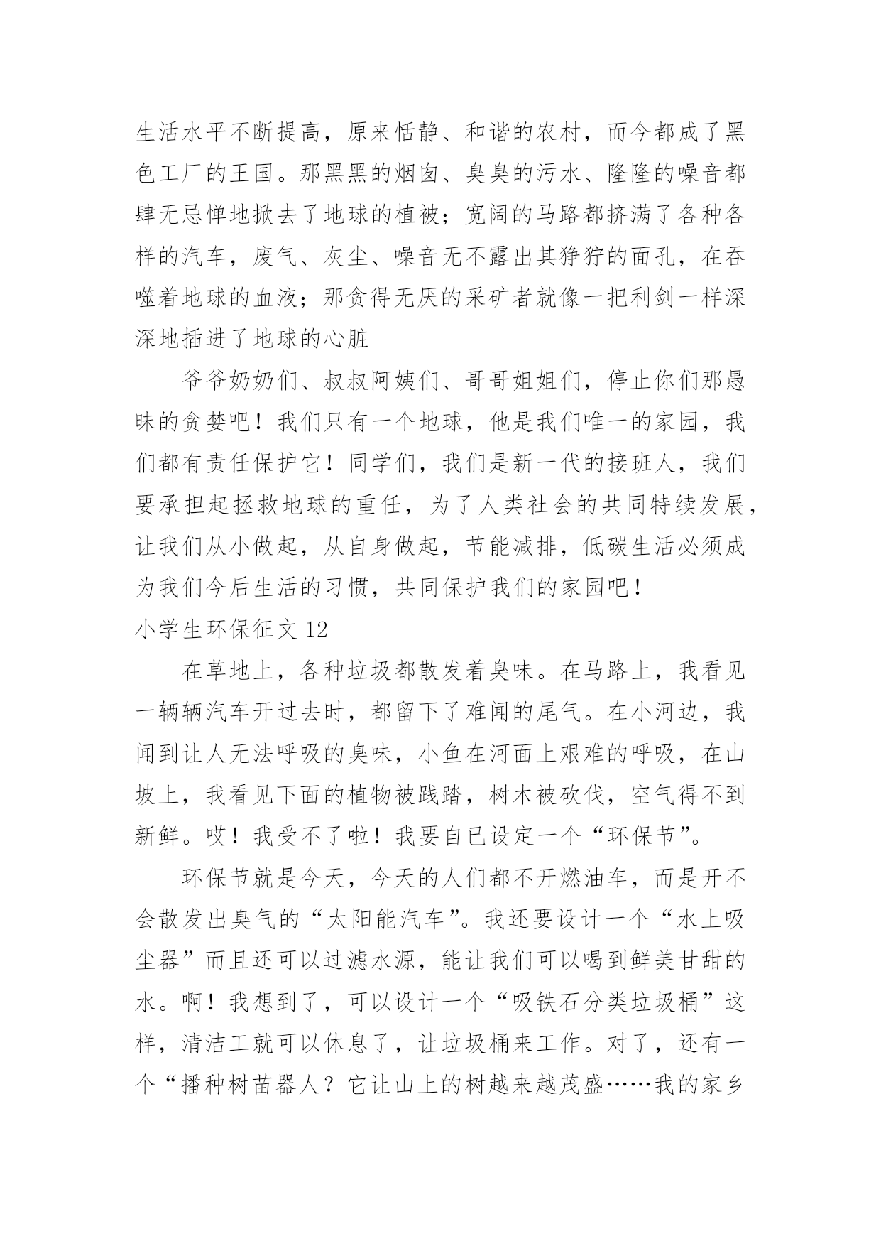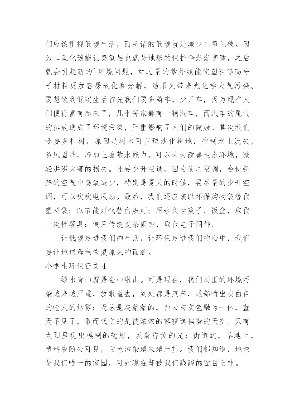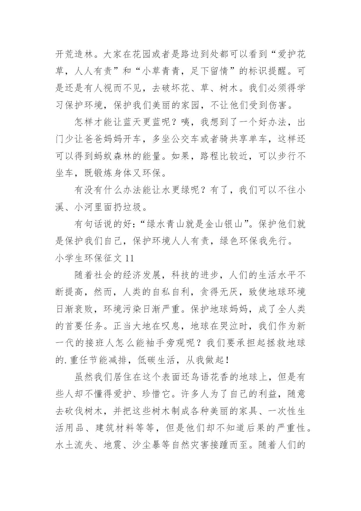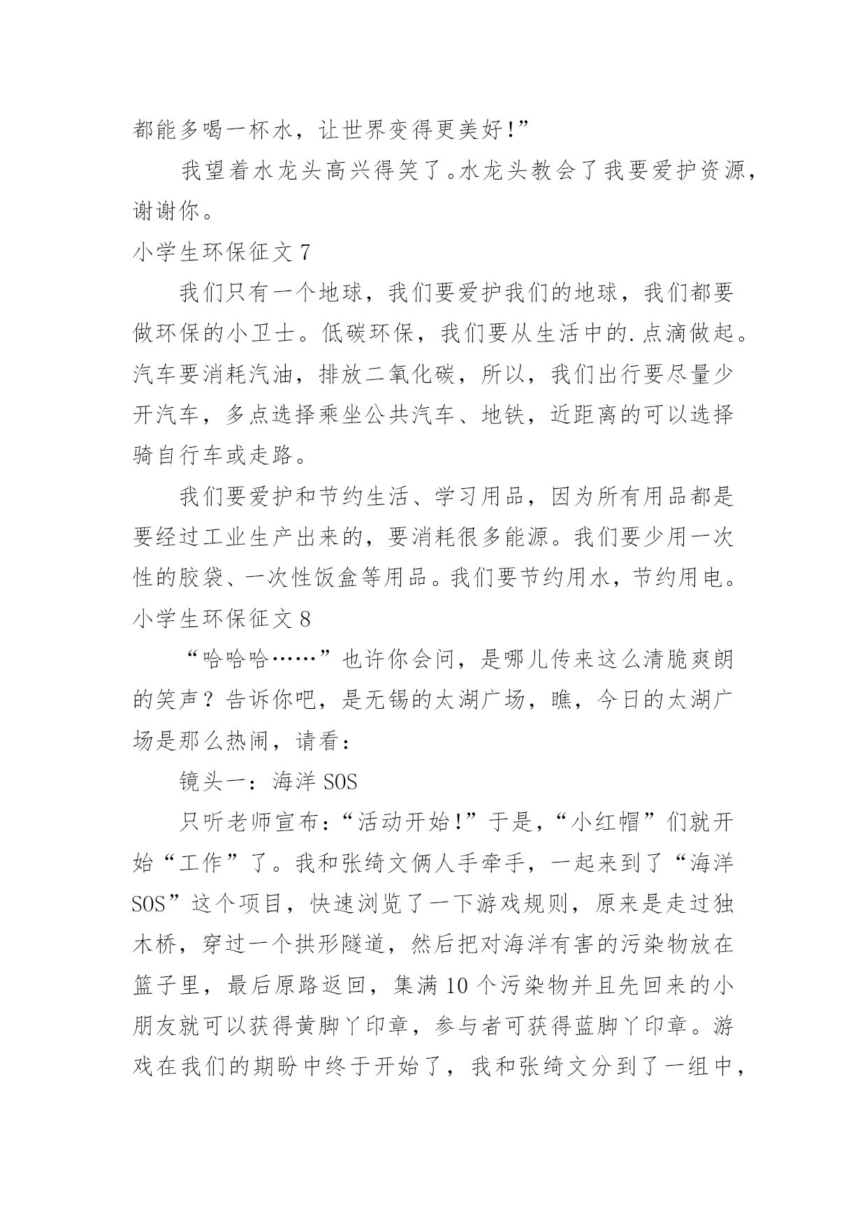 小学生环保征文小学生环保征文无论是身处学校还是步入社会,许多人都写过征文吧,征文要求文面整洁干净,书写端正美观,字体清晰规范,标点准确无误。相信许多人会觉得征文很难写吧,以下是小编精心整理的小学生环保征文,仅供参考,大家一起来看看吧。小学生环保征文1这个星期天,我跟妈妈一起做环保服装。我准备做一件马褂,我先找来两只米袋子,把它裁成正反两面,在正面剪下一个领口,再把它缝起来。我一手拿针,眼睛盯着针眼,一动不动,另一手拿线,我小心翼翼地终于把线穿了进去,又把线头和线尾连在一起,打了个结。我拿起这件衣服,用左手紧紧地按着,右手拿着针线小心翼翼地穿过去。针线像一个淘气的小男孩子,不听使唤。我急得直挠头,妈妈在旁边也看得直摇头。我来做给你看看。我看见妈妈的动作飞快,扎下去,穿上来,又扎下去,又穿上来。不一会儿,一个肩就做好了。我也学着妈妈的样子扎下去,穿上来,又扎下去,又穿上来。我费了九牛二虎之办,另一个肩终于也做好了。妈妈剪了四根横条,我把它们缝在衣服的'左右两边,过了好一会儿,我的第一件手工衣服——————马褂,终于大功告成了。我迫不及待地穿上这件衣服,在镜子前左看看,右看看。心里美滋滋的。小学生环保征文2地球是我家,环保靠大家。我们的生活越来越好了,但我们美好的生活都是靠地球得来的,我们的地球因为我们变得污染至极,我们应该保护我们的地球。我们的地球原来长满了树木花草,现在小河里的水变黑了,周围的树林没有了,变成了许多的工厂,每天工厂都冒出许多烟,污染空气,一片片的田野变成了小区......我们的环境很不好,让我们一起从小事做起吧!让我们从一件小事做起,保护地球,我们别的.事不会干,但随手捡起地上的一个瓶子;做一些警示牌;呼吁人们保护动物;保护小河,不让污水流进去;少开一会车,走着虽然慢但环保,还可以锻炼身体;节约用水,节约用电......同学们!地球是我们的家园!请让我们一起保护地球。同学们,让我们大声喊出;保护地球从小事做起,从我做起,地球妈妈我爱您!小学生环保征文3我们居住在一个被大气所包围的星球,那就是地球。地球本是一个美丽的星球,可是如今已经虚弱不堪,一天一天地消瘦下去,这是怎么回事呢,让我来告诉你吧:我们现在生活在一个高科技时代,日子一天比一天过的好,可环境污染也随着我们生活的改善变的更加严重了。我们应该重视低碳生活,而所谓的低碳就是减少二氧化碳。因为二氧化碳能让臭氧层也就是地球的保护伞渐渐变薄,之后就会引起新的`环境问题,如过量的紫外线能使塑料等高分子材料更加容易老化和分解,结果又带来光化学大气污染。要想做到低碳生活首先我们要多骑车,少开车,因为现在人们便得富有起来了,几乎每家都有一辆汽车,而汽车的尾气的排放造成了环境污染,严重影响了人们的健康。其次我们还要多植树,原因是树木可以理沙化耕地,控制水土流失,防风固沙,增加土壤蓄水能力,可以大大改善生态环境,减轻洪涝灾害的损失。还要少开空调,因为使用空调,会使新鲜的空气中臭氧减少,特别是夏天的时候,要尽量的少开空调,可以吹吹电风扇。最后,我们还应该以环保购物袋替代塑料袋;以节能灯代替白炽灯;用永久性筷子、饭盒,取代一次性餐具;使用传统发条闹钟,取代电子闹钟。让低碳走进我们的生活,让环保走进我们的心中,我们要让地球母亲恢复原来的面貌。小学生环保征文4绿水青山就是金山银山。可是现在,我们周围的环境污染越来越严重,放眼望去,到处都是汽车,尾部喷出灰白色的呛人的烟雾;天总是灰蒙蒙的,白云与灰色融为一体,蓝天不见了,取而代之的是被浓浓的雾霾遮挡着的天空。只有太阳呈现出模糊的轮廓,发着昏黄的光;街道边,草地上,塑料袋随处可见,白色污染越来越严重。我们都知道,地球是我们唯一的家园,可她现在却被我们践踏的面目全非。面对这样的现状,我们怎能无动于衷呢?作为新时代的一名小学生,我们责无旁贷,让我们从身边小事做起,携起手来,做力所能及的事!为此我要向大家提出以下几点建议:我们要做到节约用水。随手关好水龙头,珍惜每一滴水;做到节约用电,随手关灯,寻找节电小常识,并尝试着去实践;节约用纸,要做到作业纸双面使用,多用手帕,少用纸巾;少吃打包的饭,少用一次性塑料袋、餐盒和筷子。倡导绿色出行,早起几分钟,和爸爸妈妈一起步行去上学或者一起坐公交,这样既能使空气更清新,又能使我们的.身体得到锻炼。盼望着,当我们仰望高山时,我们希望看到的是满眼苍翠,花开四季;盼望着当我们行走江畔时,希望看到是一江清水,渔舟唱晚。同学们,为了大家能有一个更加优美、舒适的学习环境,为了我们能更加健康活泼地成长,为了保护好我们赖以生存的地球家园,让我们从自我做起,从小事做起,从身边做起,毫不吝啬地贡献出我们的一份力量。十年树木,百年树人,保卫蓝天,少年有责!小学生环保征文5今天,我和爸爸一起去买东西,爸爸想买纸巾,我连忙说:‘我