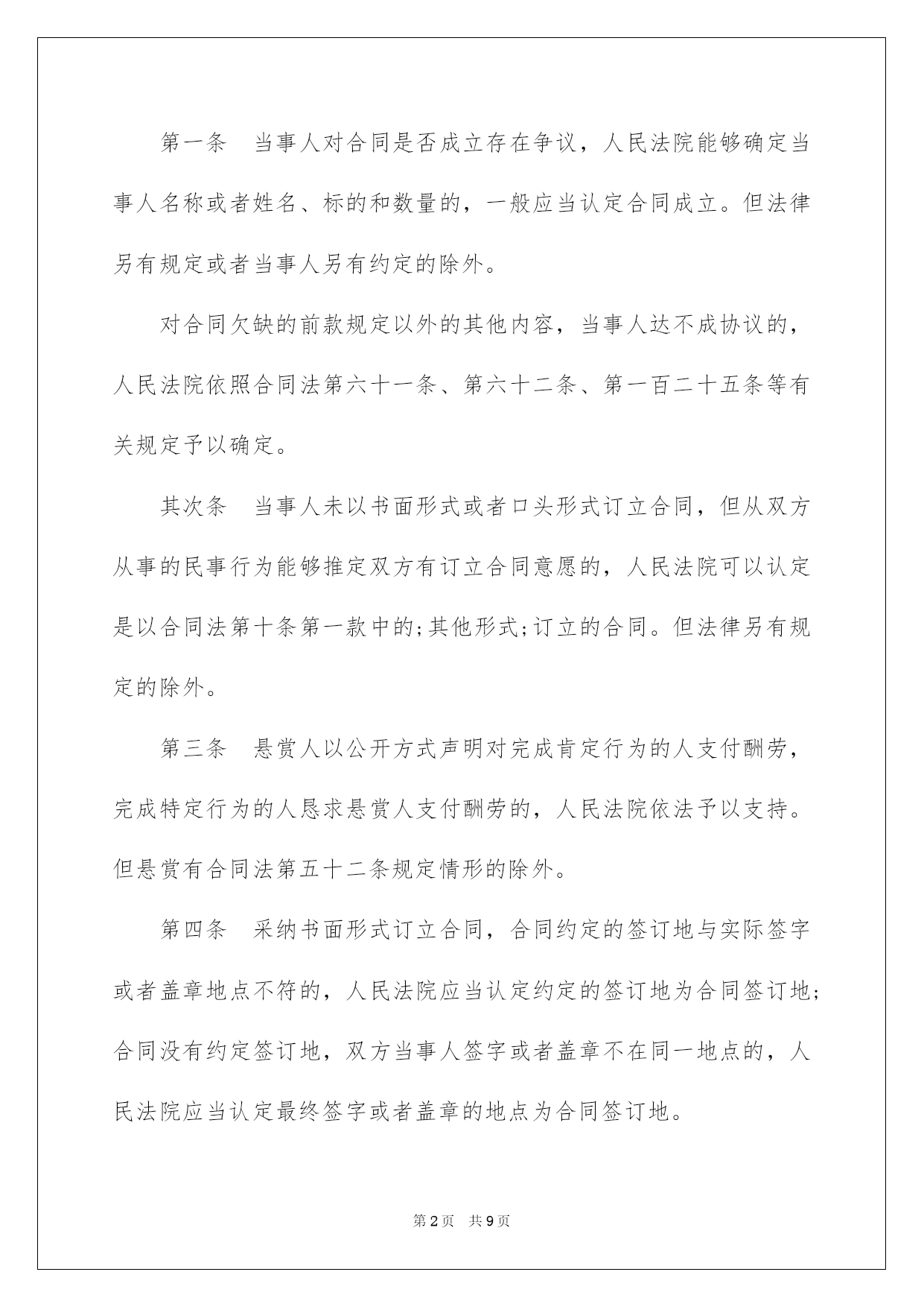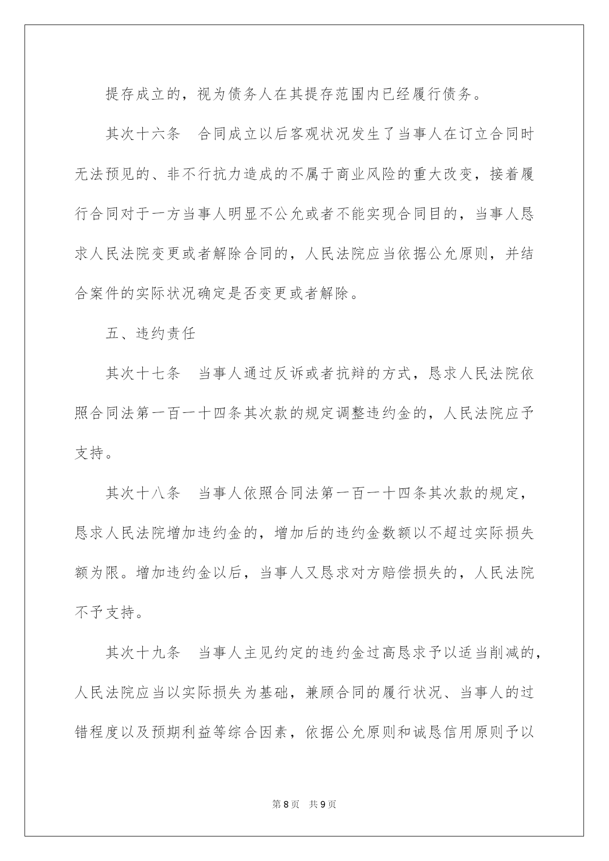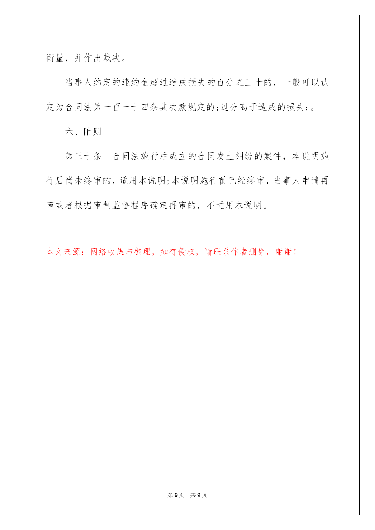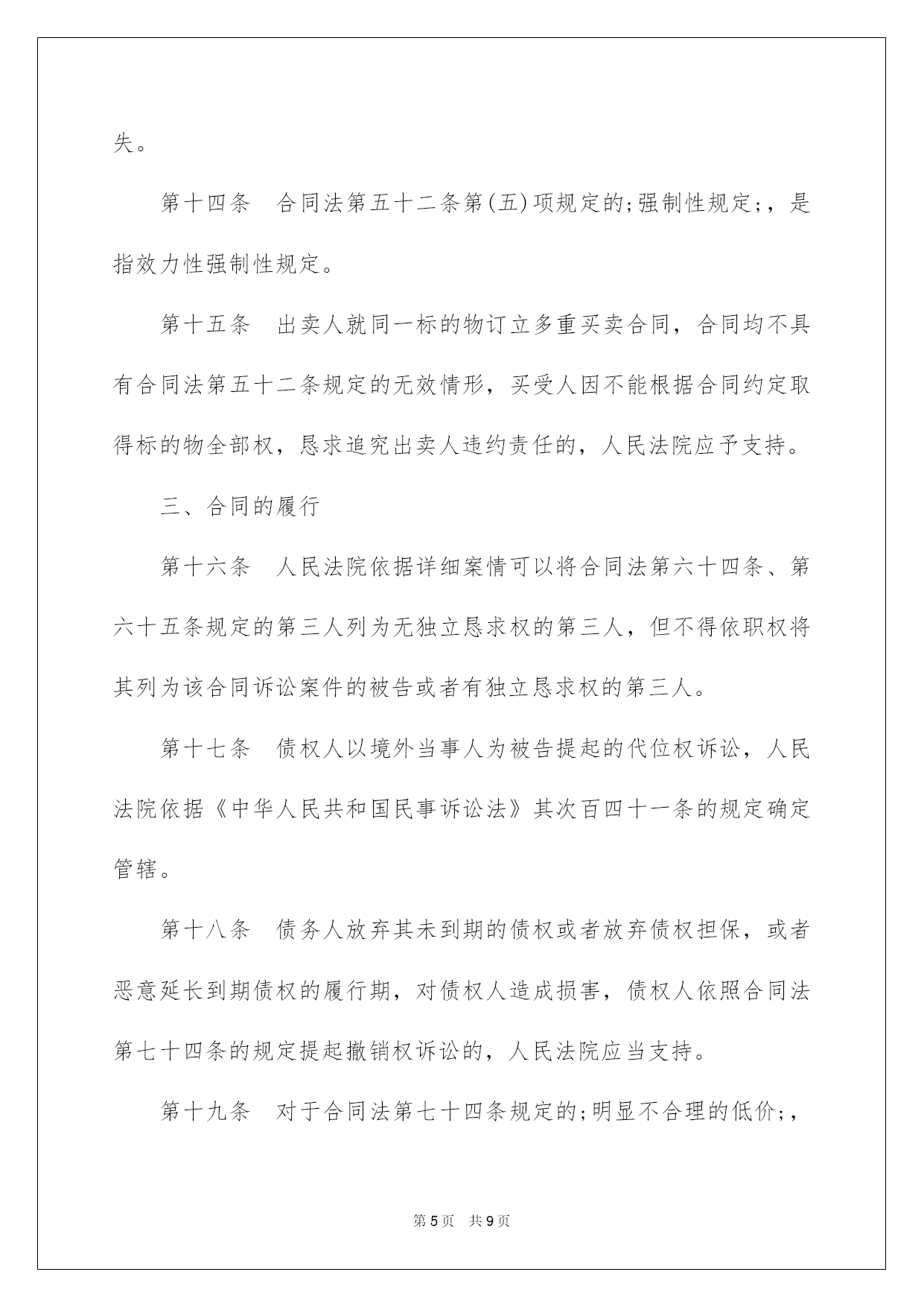 第PAGE\*Arabic\*MERGEFORMAT9页共NUMPAGES\*Arabic\*MERGEFORMAT9页第PAGE\*MERGEFORMAT9页共NUMPAGES\*MERGEFORMAT9页第PAGE\*MERGEFORMAT9页共NUMPAGES\*MERGEFORMAT9页第PAGE\*MERGEFORMAT9页共NUMPAGES\*MERGEFORMAT9页第PAGE\*MERGEFORMAT9页共NUMPAGES\*MERGEFORMAT9页第PAGE\*MERGEFORMAT9页共NUMPAGES\*MERGEFORMAT9页第PAGE\*MERGEFORMAT9页共NUMPAGES\*MERGEFORMAT9页第PAGE\*MERGEFORMAT9页共NUMPAGES\*MERGEFORMAT9页第PAGE\*MERGEFORMAT9页共NUMPAGES\*MERGEFORMAT9页第PAGE\*MERGEFORMAT9页共NUMPAGES\*MERGEFORMAT9页第PAGE\*MERGEFORMAT9页共NUMPAGES\*MERGEFORMAT9页2022合同法司法解释二合同法司法说明二最高人民法院关于适用《中华人民共和国合同法》若干问题的说明(二)于2022年2月9日最高人民法院审判委员会第1462次会议通过,2022年5月13日起施行。书目一、合同的订立二、合同的效力三、合同的履行四、合同的权利义务终止五、违约责任六、附则合同法司法说明二为了正确审理合同纠纷案件,依据《中华人民共和国合同法》的规定,对人民法院适用合同法的有关问题作出如下说明:一、合同的订立第一条当事人对合同是否成立存在争议,人民法院能够确定当事人名称或者姓名、标的和数量的,一般应当认定合同成立。但法律另有规定或者当事人另有约定的除外。对合同欠缺的前款规定以外的其他内容,当事人达不成协议的,人民法院依照合同法第六十一条、第六十二条、第一百二十五条等有关规定予以确定。其次条当事人未以书面形式或者口头形式订立合同,但从双方从事的民事行为能够推定双方有订立合同意愿的,人民法院可以认定是以合同法第十条第一款中的;其他形式;订立的合同。但法律另有规定的除外。第三条悬赏人以公开方式声明对完成肯定行为的人支付酬劳,完成特定行为的人恳求悬赏人支付酬劳的,人民法院依法予以支持。但悬赏有合同法第五十二条规定情形的除外。第四条采纳书面形式订立合同,合同约定的签订地与实际签字或者盖章地点不符的,人民法院应当认定约定的签订地为合同签订地;合同没有约定签订地,双方当事人签字或者盖章不在同一地点的,人民法院应当认定最终签字或者盖章的地点为合同签订地。第五条当事人采纳合同书形式订立合同的,应当签字或者盖章。当事人在合同书上摁手印的,人民法院应当认定其具有与签字或者盖章同等的法律效力。第六条供应格式条款的一方对格式条款中免除或者限制其责任的内容,在合同订立时采纳足以引起对方留意的文字、符号、字体等特殊标识,并根据对方的要求对该格式条款予以说明的,人民法院应当认定符合合同法第三十九条所称;实行合理的方式;。供应格式条款一方对已尽合理提示及说明义务担当举证责任。第七条下列情形,不违反法律、行政法规强制性规定的,人民法院可以认定为合同法所称;交易习惯;:(一)在交易行为当地或者某一领域、某一行业通常采纳并为交易对方订立合同时所知道或者应当知道的做法;(二)当事人双方常常运用的习惯做法。对于交易习惯,由提出主见的一方当事人担当举证责任。第八条依照法律、行政法规的规定经批准或者登记才能生效的合同成立后,有义务办理申请批准或者申请登记等手续的一方当事人未根据法律规定或者合同约定办理申请批准或者未申请登记的,属于合同法第四十二条第(三)项规定的;其他违反诚恳信用原则的行为;,人民法院可以依据案件的详细状况和相对人的恳求,判决相对人自己办理有关手续;对方当事人对由此产生的费用和给相对人造成的实际损失,应当担当损害赔偿责任。二、合同的效力第九条供应格式条款的一方当事人违反合同法第三十九条第一款关于提示和说明义务的规定,导致对方没有留意免除或者限制其责任的条款,对方当事人申请撤销该格式条款的,人民法院应当支持。第十条供应格式条款的一方当事人违反合同法第三十九条第一款的`规定,并具有合同法第四十条规定的情形之一的,人民法院应当认定该格式条款无效。第十一条依据合同法第四十七条、第四十八条的规定,追认的意思表示自到达相对人时生效,合同自订立时起生效。第十二条无权代理人以被代理人的名义订立合同,被代理人已经起先履行合同义务的,