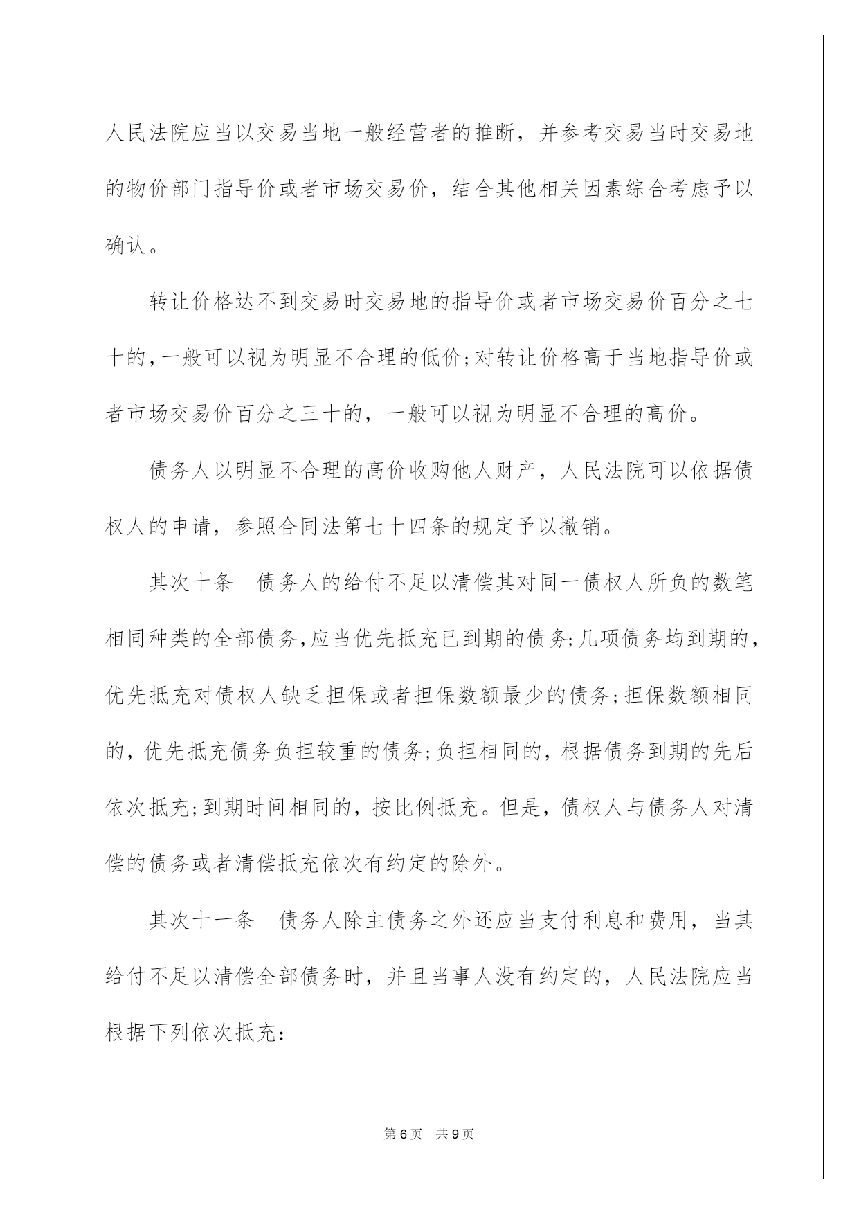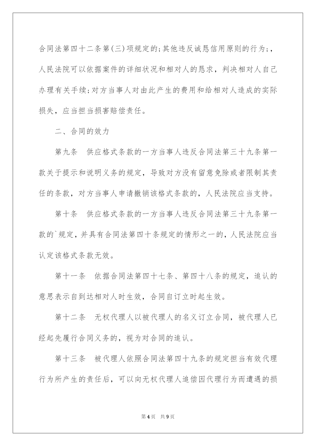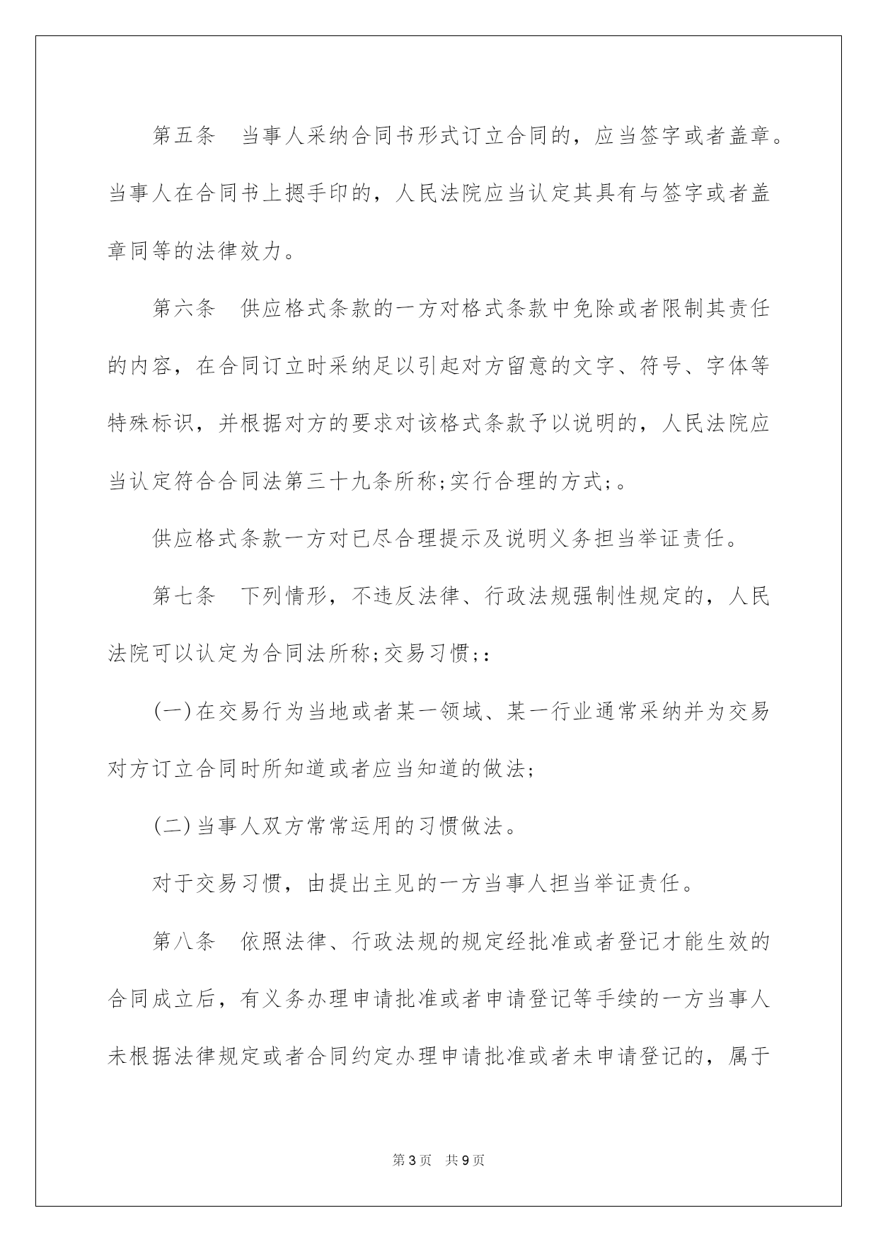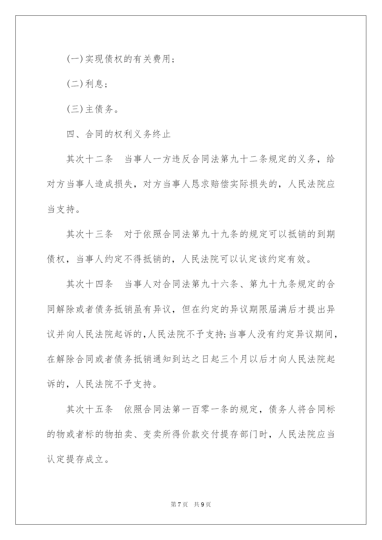 第PAGE\*Arabic\*MERGEFORMAT9页共NUMPAGES\*Arabic\*MERGEFORMAT9页第PAGE\*MERGEFORMAT9页共NUMPAGES\*MERGEFORMAT9页第PAGE\*MERGEFORMAT9页共NUMPAGES\*MERGEFORMAT9页第PAGE\*MERGEFORMAT9页共NUMPAGES\*MERGEFORMAT9页第PAGE\*MERGEFORMAT9页共NUMPAGES\*MERGEFORMAT9页第PAGE\*MERGEFORMAT9页共NUMPAGES\*MERGEFORMAT9页第PAGE\*MERGEFORMAT9页共NUMPAGES\*MERGEFORMAT9页第PAGE\*MERGEFORMAT9页共NUMPAGES\*MERGEFORMAT9页第PAGE\*MERGEFORMAT9页共NUMPAGES\*MERGEFORMAT9页第PAGE\*MERGEFORMAT9页共NUMPAGES\*MERGEFORMAT9页第PAGE\*MERGEFORMAT9页共NUMPAGES\*MERGEFORMAT9页2022合同法司法解释二合同法司法说明二最高人民法院关于适用《中华人民共和国合同法》若干问题的说明(二)于2022年2月9日最高人民法院审判委员会第1462次会议通过,2022年5月13日起施行。书目一、合同的订立二、合同的效力三、合同的履行四、合同的权利义务终止五、违约责任六、附则合同法司法说明二为了正确审理合同纠纷案件,依据《中华人民共和国合同法》的规定,对人民法院适用合同法的有关问题作出如下说明:一、合同的订立第一条当事人对合同是否成立存在争议,人民法院能够确定当事人名称或者姓名、标的和数量的,一般应当认定合同成立。但法律另有规定或者当事人另有约定的除外。对合同欠缺的前款规定以外的其他内容,当事人达不成协议的,人民法院依照合同法第六十一条、第六十二条、第一百二十五条等有关规定予以确定。其次条当事人未以书面形式或者口头形式订立合同,但从双方从事的民事行为能够推定双方有订立合同意愿的,人民法院可以认定是以合同法第十条第一款中的;其他形式;订立的合同。但法律另有规定的除外。第三条悬赏人以公开方式声明对完成肯定行为的人支付酬劳,完成特定行为的人恳求悬赏人支付酬劳的,人民法院依法予以支持。但悬赏有合同法第五十二条规定情形的除外。第四条采纳书面形式订立合同,合同约定的签订地与实际签字或者盖章地点不符的,人民法院应当认定约定的签订地为合同签订地;合同没有约定签订地,双方当事人签字或者盖章不在同一地点的,人民法院应当认定最终签字或者盖章的地点为合同签订地。第五条当事人采纳合同书形式订立合同的,应当签字或者盖章。当事人在合同书上摁手印的,人民法院应当认定其具有与签字或者盖章同等的法律效力。第六条供应格式条款的一方对格式条款中免除或者限制其责任的内容,在合同订立时采纳足以引起对方留意的文字、符号、字体等特殊标识,并根据对方的要求对该格式条款予以说明的,人民法院应当认定符合合同法第三十九条所称;实行合理的方式;。供应格式条款一方对已尽合理提示及说明义务担当举证责任。第七条下列情形,不违反法律、行政法规强制性规定的,人民法院可以认定为合同法所称;交易习惯;:(一)在交易行为当地或者某一领域、某一行业通常采纳并为交易对方订立合同时所知道或者应当知道的做法;(二)当事人双方常常运用的习惯做法。对于交易习惯,由提出主见的一方当事人担当举证责任。第八条依照法律、行政法规的规定经批准或者登记才能生效的合同成立后,有义务办理申请批准或者申请登记等手续的一方当事人未根据法律规定或者合同约定办理申请批准或者未申请登记的,属于合同法第四十二条第(三)项规定的;其他违反诚恳信用原则的行为;,人民法院可以依据案件的详细状况和相对人的恳求,判决相对人自己办理有关手续;对方当事人对由此产生的费用和给相对人造成的实际损失,应当担当损害赔偿责任。二、合同的效力第九条供应格式条款的一方当事人违反合同法第三十九条第一款关于提示和说明义务的规定,导致对方没有留意免除或者限制其责任的条款,对方当事人申请撤销该格式条款的,人民法院应当支持。第十条供应格式条款的一方当事人违反合同法第三十九条第一款的`规定,并具有合同法第四十条规定的情形之一的,人民法院应当认定该格式条款无效。第十一条依据合同法第四十七条、第四十八条的规定,追认的意思表示自到达相对人时生效,合同自订立时起生效。第十二条无权代理人以被代理人的名义订立合同,被代理人已经起先履行合同义务的,