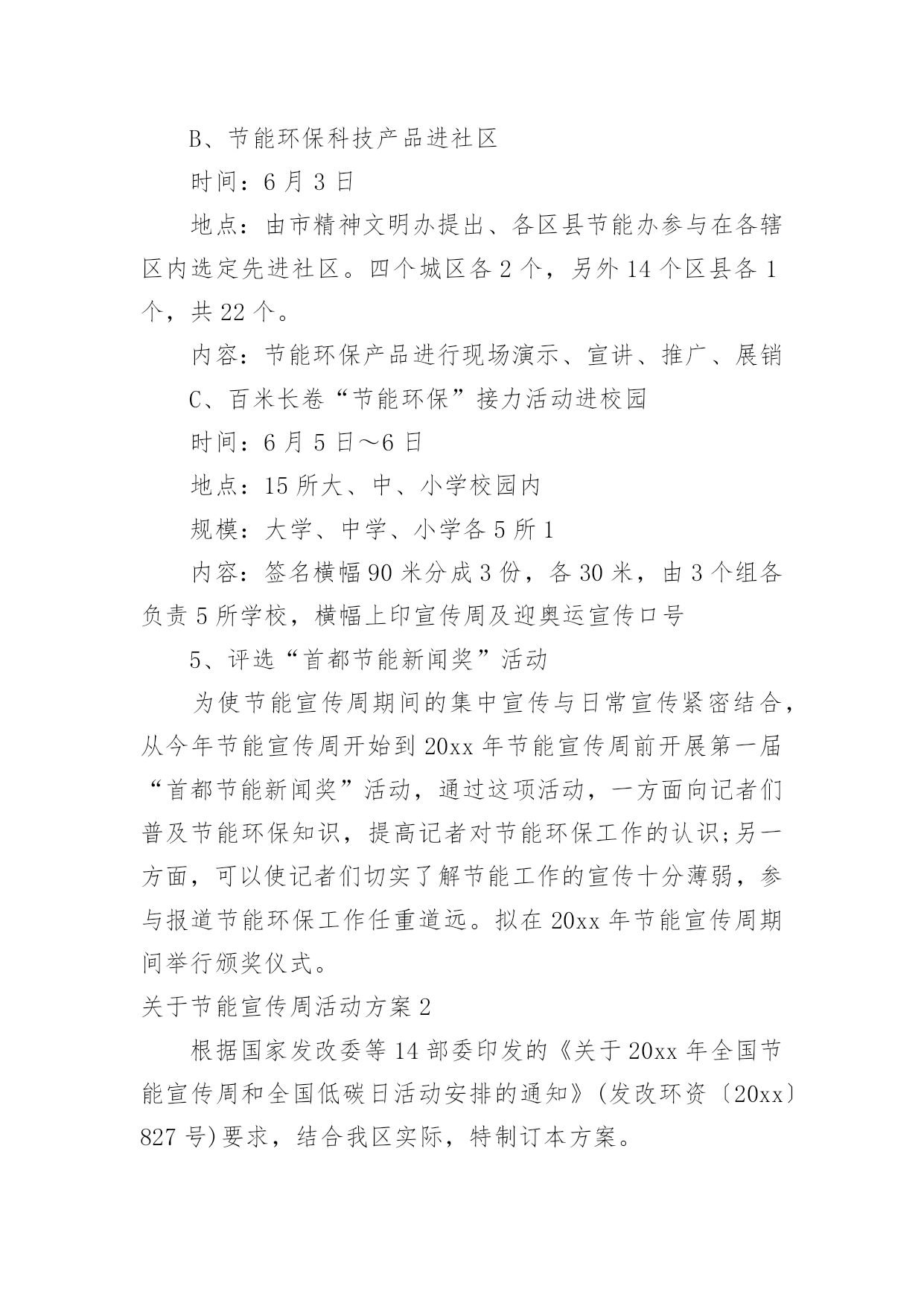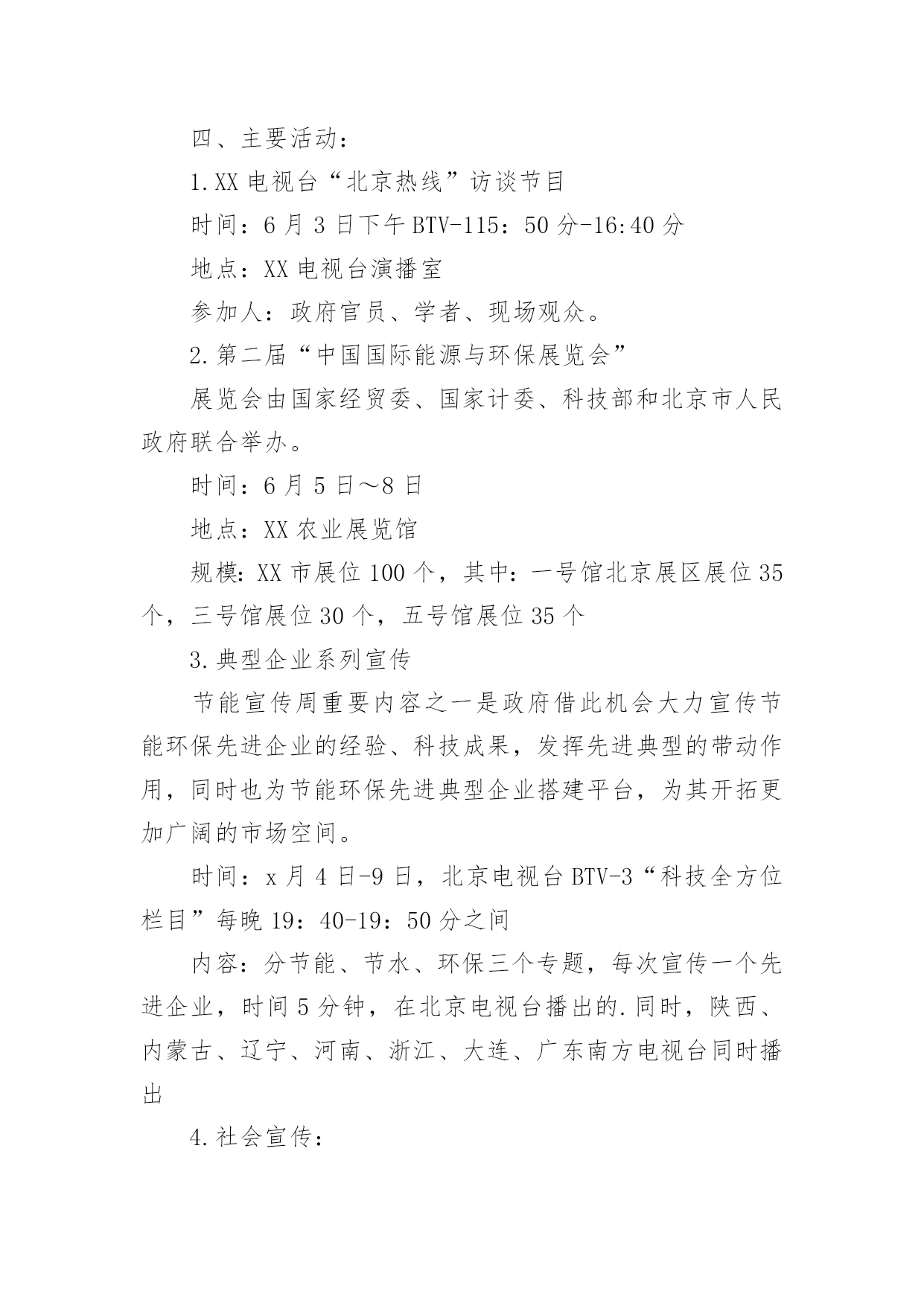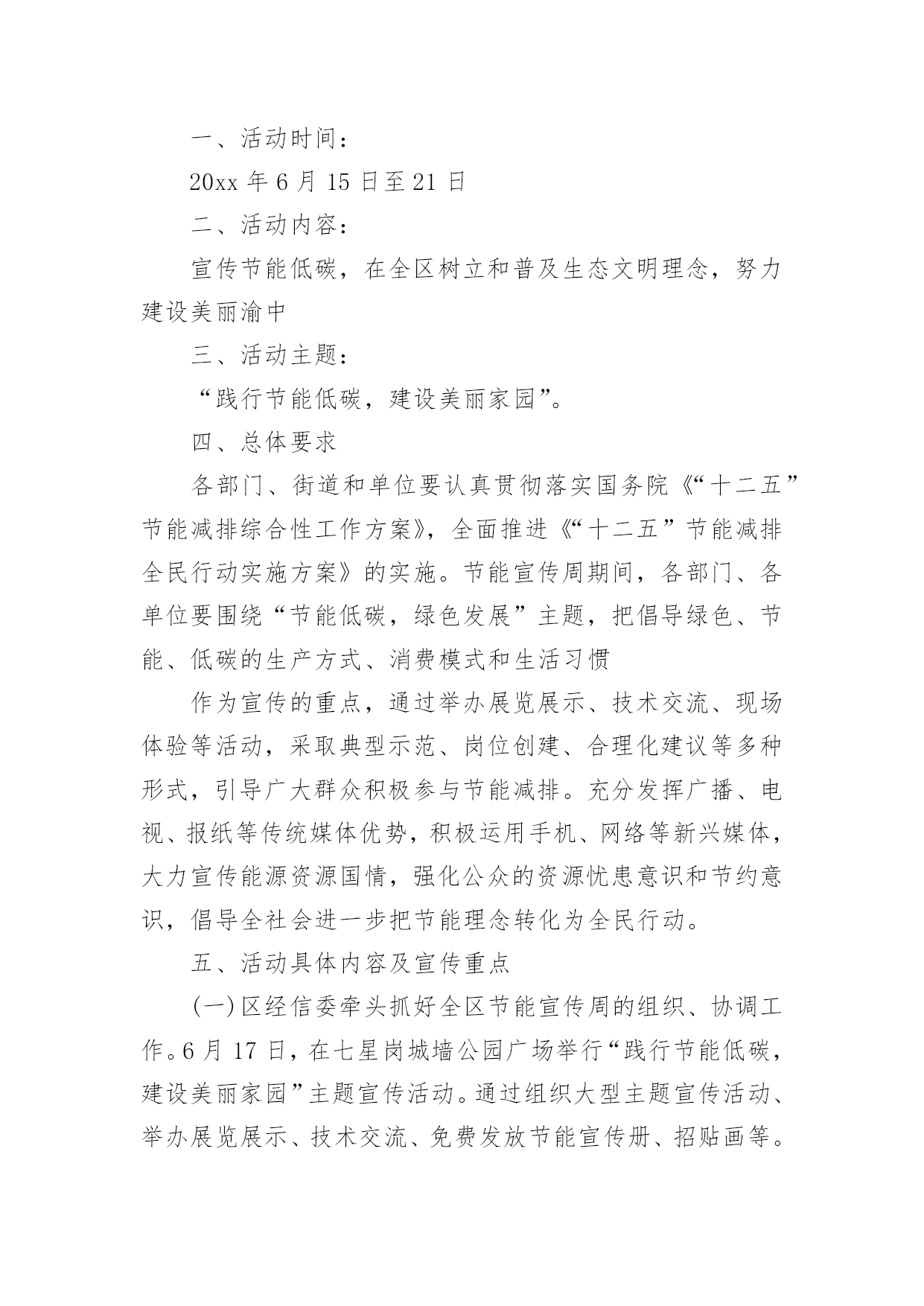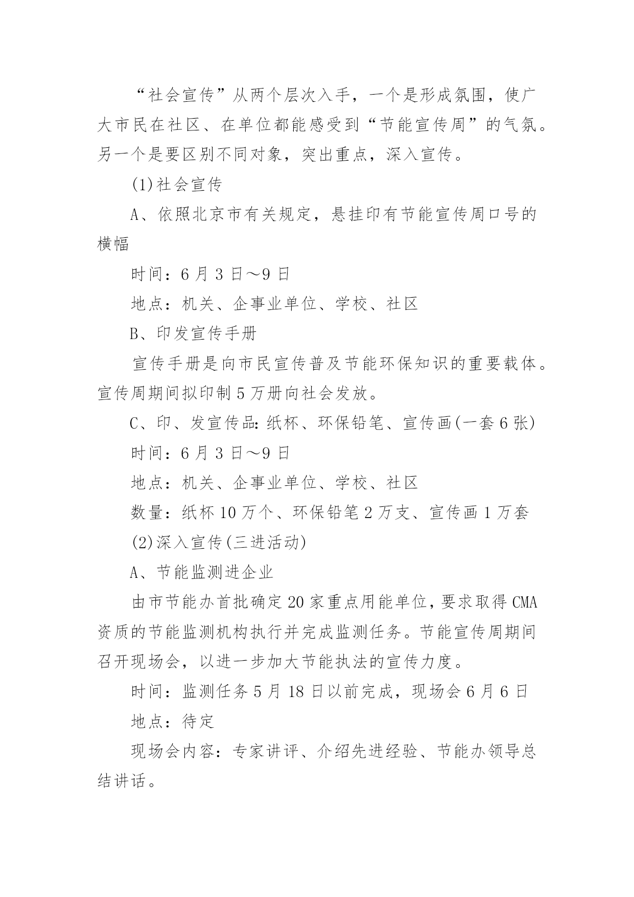 节能宣传周活动方案关于节能宣传周活动方案为了确保我们的努力取得实效,我们需要事先制定方案,方案是综合考量事情或问题相关的因素后所制定的书面计划。写方案需要注意哪些格式呢?以下是小编为大家整理的关于节能宣传周活动方案,欢迎大家分享。关于节能宣传周活动方案1节约能源、保护环境是实施国家可持续发展战略的重要措施,必须加大宣传、贯彻力度;为宣传并实现“绿色奥运”的主题,6月份的“节能宣传周”是一次极好的宣传机会。为办好20xx年北京节能宣传周,使其活动内容有创新,形式有特色,组织有水平,实际有效果,实现“政府宣传与市民参与”、“集中宣传与日常宣传”两个相结合,特提出北京节能宣传周活动方案。一、宣传周主题:绿色奥运、依法节能、持续发展二、宣传周时间:x月4日-9日三、XX市组织机构:主办单位:XX市经济委员会XX市委宣传部、XX市发展计划委员会、XX市科学技术委员会、XX市财政局2.承办单位:XX节能环保服务中心四、主要活动:1.XX电视台“北京热线”访谈节目时间:6月3日下午BTV-115:50分-16:40分地点:XX电视台演播室参加人:政府官员、学者、现场观众。2.第二届“中国国际能源与环保展览会”展览会由国家经贸委、国家计委、科技部和北京市人民政府联合举办。时间:6月5日~8日地点:XX农业展览馆规模:XX市展位100个,其中:一号馆北京展区展位35个,三号馆展位30个,五号馆展位35个3.典型企业系列宣传节能宣传周重要内容之一是政府借此机会大力宣传节能环保先进企业的经验、科技成果,发挥先进典型的带动作用,同时也为节能环保先进典型企业搭建平台,为其开拓更加广阔的市场空间。时间:x月4日-9日,北京电视台BTV-3“科技全方位栏目”每晚19:40-19:50分之间内容:分节能、节水、环保三个专题,每次宣传一个先进企业,时间5分钟,在北京电视台播出的.同时,陕西、内蒙古、辽宁、河南、浙江、大连、广东南方电视台同时播出4.社会宣传:“社会宣传”从两个层次入手,一个是形成氛围,使广大市民在社区、在单位都能感受到“节能宣传周”的气氛。另一个是要区别不同对象,突出重点,深入宣传。(1)社会宣传A、依照北京市有关规定,悬挂印有节能宣传周口号的横幅时间:6月3日~9日地点:机关、企事业单位、学校、社区B、印发宣传手册宣传手册是向市民宣传普及节能环保知识的重要载体。宣传周期间拟印制5万册向社会发放。C、印、发宣传品:纸杯、环保铅笔、宣传画(一套6张)时间:6月3日~9日地点:机关、企事业单位、学校、社区数量:纸杯10万个、环保铅笔2万支、宣传画1万套(2)深入宣传(三进活动)A、节能监测进企业由市节能办首批确定20家重点用能单位,要求取得CMA资质的节能监测机构执行并完成监测任务。节能宣传周期间召开现场会,以进一步加大节能执法的宣传力度。时间:监测任务5月18日以前完成,现场会6月6日地点:待定现场会内容:专家讲评、介绍先进经验、节能办领导总结讲话。B、节能环保科技产品进社区时间:6月3日地点:由市精神文明办提出、各区县节能办参与在各辖区内选定先进社区。四个城区各2个,另外14个区县各1个,共22个。内容:节能环保产品进行现场演示、宣讲、推广、展销C、百米长卷“节能环保”接力活动进校园时间:6月5日~6日地点:15所大、中、小学校园内规模:大学、中学、小学各5所1内容:签名横幅90米分成3份,各30米,由3个组各负责5所学校,横幅上印宣传周及迎奥运宣传口号5、评选“首都节能新闻奖”活动为使节能宣传周期间的集中宣传与日常宣传紧密结合,从今年节能宣传周开始到20xx年节能宣传周前开展第一届“首都节能新闻奖”活动,通过这项活动,一方面向记者们普及节能环保知识,提高记者对节能环保工作的认识;另一方面,可以使记者们切实了解节能工作的宣传十分薄弱,参与报道节能环保工作任重道远。拟在20xx年节能宣传周期间举行颁奖仪式。关于节能宣传周活动方案2根据国家发改委等14部委印发的《关于20xx年全国节能宣传周和全国低碳日活动安排的通知》(发改环资〔20xx〕827号)要求,结合我区实际,特制订本方案。一、活动时间:20xx年6月15日至21日二、活动内容:宣传节能低碳,在全区树立和普及生态文明理念,努力建设美丽渝中三、活动主题:“践行节能低碳,建设美丽家园”。四、总体要求各部门、街道和单位要认真贯彻落实国务院《“十二五”节能减排综合性工作方案》,全面推进《“十二五”节能减排全民行动实施方案》的实施。节能宣传周期间,各部门、各单位要围绕“节能低碳,绿色发展”主题,把倡导绿色、节能、低碳的生产方式、消费模式和生活习惯作为宣传的重点,通过举办展览展示、技术交流、现场体验等活动,采取典型示范、岗位创建、合理化建议等多种形式,引导广大群众积极参与节能减排。充分发挥广播、电