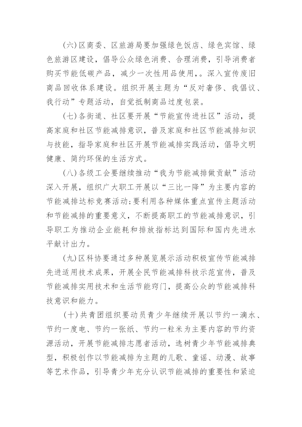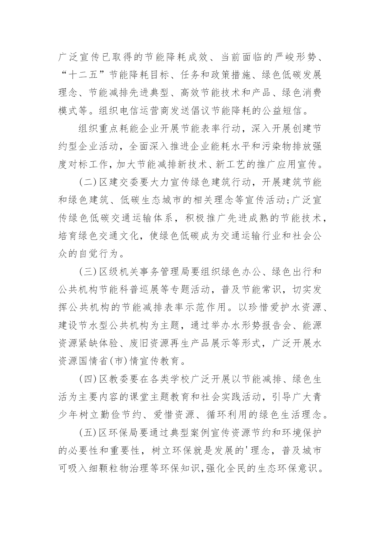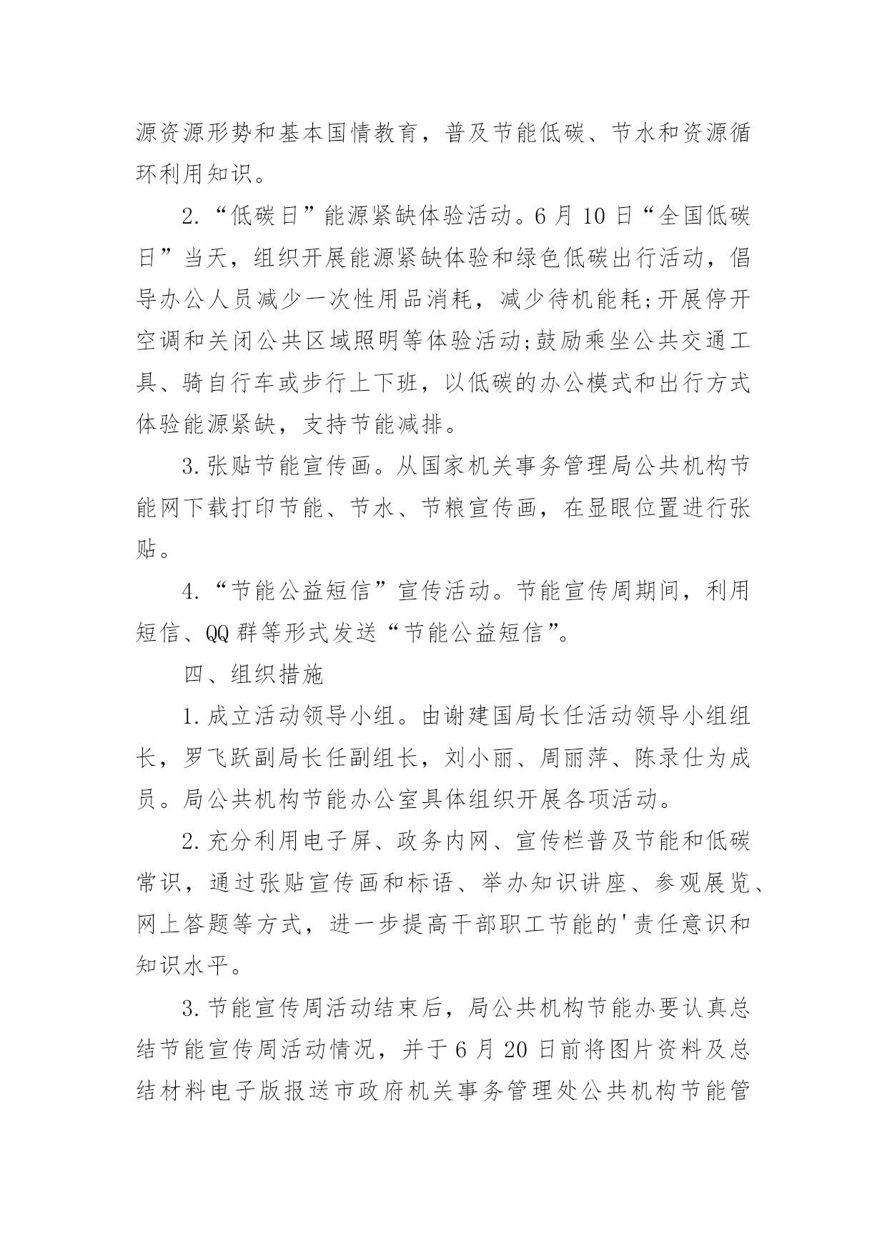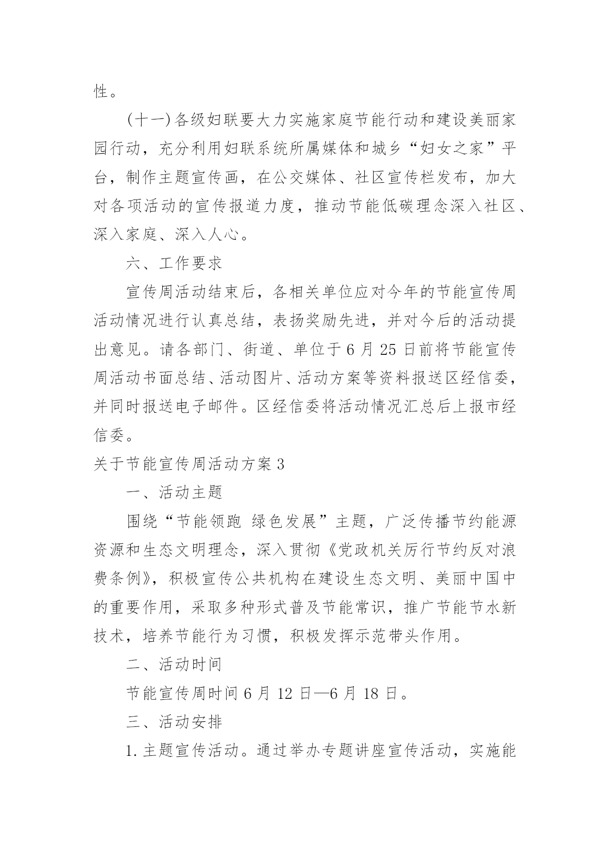 节能宣传周活动方案关于节能宣传周活动方案为了确保我们的努力取得实效,我们需要事先制定方案,方案是综合考量事情或问题相关的因素后所制定的书面计划。写方案需要注意哪些格式呢?以下是小编为大家整理的关于节能宣传周活动方案,欢迎大家分享。关于节能宣传周活动方案1节约能源、保护环境是实施国家可持续发展战略的重要措施,必须加大宣传、贯彻力度;为宣传并实现“绿色奥运”的主题,6月份的“节能宣传周”是一次极好的宣传机会。为办好20xx年北京节能宣传周,使其活动内容有创新,形式有特色,组织有水平,实际有效果,实现“政府宣传与市民参与”、“集中宣传与日常宣传”两个相结合,特提出北京节能宣传周活动方案。一、宣传周主题:绿色奥运、依法节能、持续发展二、宣传周时间:x月4日-9日三、XX市组织机构:主办单位:XX市经济委员会XX市委宣传部、XX市发展计划委员会、XX市科学技术委员会、XX市财政局2.承办单位:XX节能环保服务中心四、主要活动:1.XX电视台“北京热线”访谈节目时间:6月3日下午BTV-115:50分-16:40分地点:XX电视台演播室参加人:政府官员、学者、现场观众。2.第二届“中国国际能源与环保展览会”展览会由国家经贸委、国家计委、科技部和北京市人民政府联合举办。时间:6月5日~8日地点:XX农业展览馆规模:XX市展位100个,其中:一号馆北京展区展位35个,三号馆展位30个,五号馆展位35个3.典型企业系列宣传节能宣传周重要内容之一是政府借此机会大力宣传节能环保先进企业的经验、科技成果,发挥先进典型的带动作用,同时也为节能环保先进典型企业搭建平台,为其开拓更加广阔的市场空间。时间:x月4日-9日,北京电视台BTV-3“科技全方位栏目”每晚19:40-19:50分之间内容:分节能、节水、环保三个专题,每次宣传一个先进企业,时间5分钟,在北京电视台播出的.同时,陕西、内蒙古、辽宁、河南、浙江、大连、广东南方电视台同时播出4.社会宣传:“社会宣传”从两个层次入手,一个是形成氛围,使广大市民在社区、在单位都能感受到“节能宣传周”的气氛。另一个是要区别不同对象,突出重点,深入宣传。(1)社会宣传A、依照北京市有关规定,悬挂印有节能宣传周口号的横幅时间:6月3日~9日地点:机关、企事业单位、学校、社区B、印发宣传手册宣传手册是向市民宣传普及节能环保知识的重要载体。宣传周期间拟印制5万册向社会发放。C、印、发宣传品:纸杯、环保铅笔、宣传画(一套6张)时间:6月3日~9日地点:机关、企事业单位、学校、社区数量:纸杯10万个、环保铅笔2万支、宣传画1万套(2)深入宣传(三进活动)A、节能监测进企业由市节能办首批确定20家重点用能单位,要求取得CMA资质的节能监测机构执行并完成监测任务。节能宣传周期间召开现场会,以进一步加大节能执法的宣传力度。时间:监测任务5月18日以前完成,现场会6月6日地点:待定现场会内容:专家讲评、介绍先进经验、节能办领导总结讲话。B、节能环保科技产品进社区时间:6月3日地点:由市精神文明办提出、各区县节能办参与在各辖区内选定先进社区。四个城区各2个,另外14个区县各1个,共22个。内容:节能环保产品进行现场演示、宣讲、推广、展销C、百米长卷“节能环保”接力活动进校园时间:6月5日~6日地点:15所大、中、小学校园内规模:大学、中学、小学各5所1内容:签名横幅90米分成3份,各30米,由3个组各负责5所学校,横幅上印宣传周及迎奥运宣传口号5、评选“首都节能新闻奖”活动为使节能宣传周期间的集中宣传与日常宣传紧密结合,从今年节能宣传周开始到20xx年节能宣传周前开展第一届“首都节能新闻奖”活动,通过这项活动,一方面向记者们普及节能环保知识,提高记者对节能环保工作的认识;另一方面,可以使记者们切实了解节能工作的宣传十分薄弱,参与报道节能环保工作任重道远。拟在20xx年节能宣传周期间举行颁奖仪式。关于节能宣传周活动方案2根据国家发改委等14部委印发的《关于20xx年全国节能宣传周和全国低碳日活动安排的通知》(发改环资〔20xx〕827号)要求,结合我区实际,特制订本方案。一、活动时间:20xx年6月15日至21日二、活动内容:宣传节能低碳,在全区树立和普及生态文明理念,努力建设美丽渝中三、活动主题:“践行节能低碳,建设美丽家园”。四、总体要求各部门、街道和单位要认真贯彻落实国务院《“十二五”节能减排综合性工作方案》,全面推进《“十二五”节能减排全民行动实施方案》的实施。节能宣传周期间,各部门、各单位要围绕“节能低碳,绿色发展”主题,把倡导绿色、节能、低碳的生产方式、消费模式和生活习惯作为宣传的重点,通过举办展览展示、技术交流、现场体验等活动,采取典型示范、岗位创建、合理化建议等多种形式,引导广大群众积极参与节能减排。充分发挥广播、电