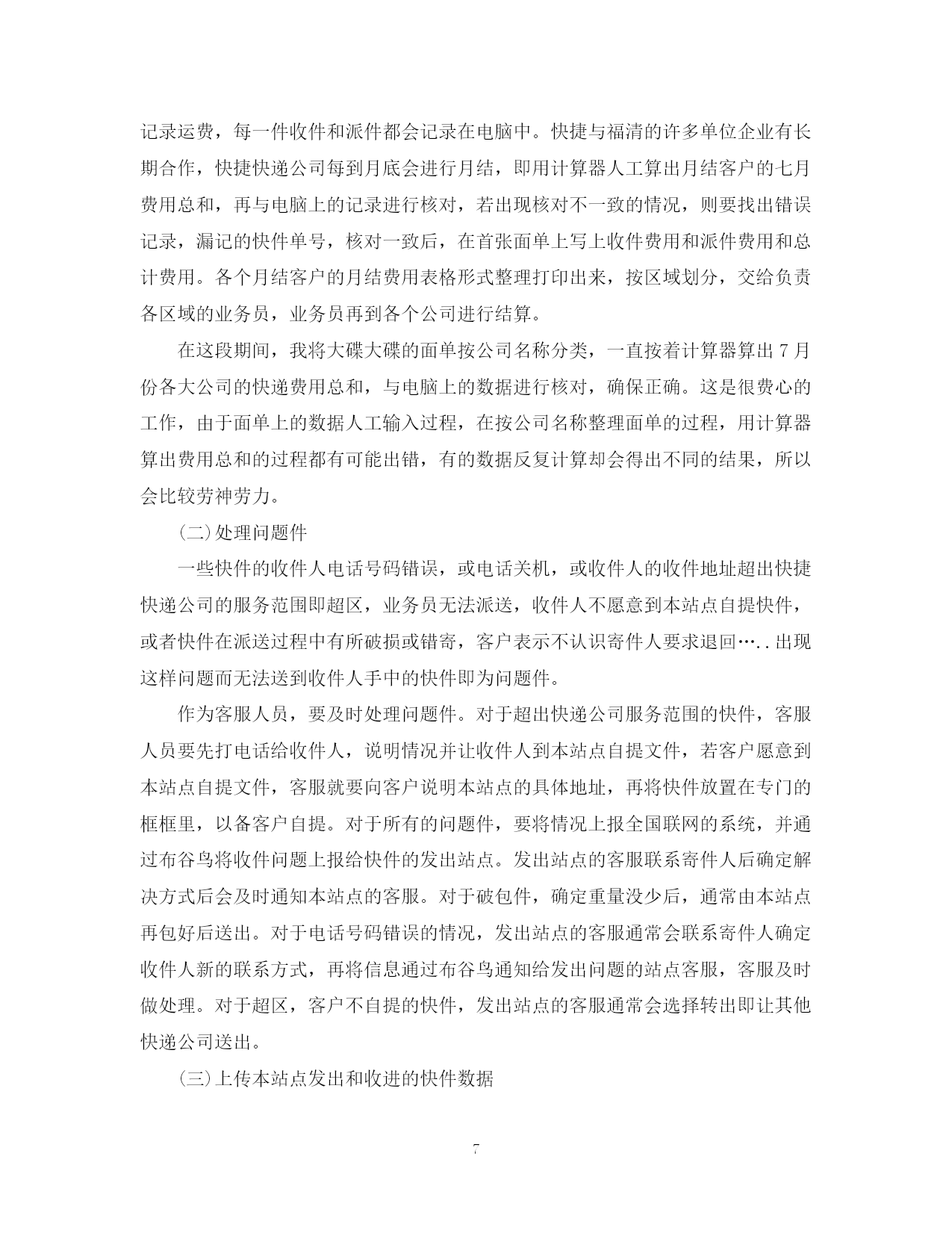 此资料由网络收集而来,如有侵权请告知上传者立即删除。资料共分享,我们负责传递知识。PAGEPAGE9物流客服服务小结物流公司客服是为客户服务.维护公司的客户,力求让你所维护的客户满意.下面范文网小编整理了物流客服服务小结,希望对你有帮助。物流客服服务小结篇一我叫关慧,于20xx年7月14日进入公司工作,光阴似箭,一晃一年多的外运生活快过去了,工作以来,在单位领导的精心培育和教导下,通过自身的不断努力,无论是思想上、学习上还是工作上,都取得了长足的发展和巨大的收获,思想上,自觉遵守我司的规章制度,坚持参加公司的每次的培训。以严谨的态度和积极的热情投身于学习和工作中,曾为自己的平凡而失落过,也曾为日子的日复一日而迷惘过,然而日益激烈的社会竟争也使我充分地认识到成为一名德智体全面发展的优秀工作者的重要性,同时也积极的向党组织进行靠拢,于20xx年的7月1日像党递交了申请书,并时时刻刻接受党的考查,希望早日加入中国共产党。学习上,严格要求自己,凭着对专业知识和技能的强烈追求,端正工作态度,作到了理论联系实际;除了专业知识的学习外,还注意各方面知识的扩展,广泛的涉猎其他部门、学科的知识,从而提高了自身的一专多能的长处及思想文化素质,包括生活中也学到了养成良好的生活习惯,生活充实而有条理,有严谨的生活态度和良好的生活作风,为人热情大方,诚实守信,乐于助人,拥有自己的良好做事原则,能与同事们和睦相处。由于我所学专业离物流行业不相关,从没有放弃学习理论知识和业务知识学习理论的同时,把工作中的实战联系到理论知识上,使理论水平变得更简单。工作上,本人自20xx年7月14日至20xx年11月4日,一直负责报关申报工作并协助各岗位同事工作。一直在操作中心工作,主要负责资料申报工作和单证客服工作,不管走到哪里,都严格要求自己,刻苦钻研业务,争当行家里手。就是凭着这样一种坚定的信念,我已熟练掌握报关申报、仓单统计等业务,成为资料组的全能的资料员。记得,刚进物流行,为了尽快掌握物流行业务,我每天都提前一个多小时到岗,除了在工作态度我尽心尽力,在公司组织的各项活动中我也积极响应,经常参加单位组织的各类活动以及同事聚会。在此,对所从事过的和现正从事的岗位工作作一小结。操作中心资料员主要负责报关资料的登记、整理、派发。具体内容主要包括四个方面:1、报关单的申报、打印。2、报关资料的派发,入仓单的修改、打印,入仓单的资料补充(商品编码及副计量),工作量的统计录入,经海关审核后的黄单和经补充资料后的绿单的派发。3、报关单的核销单跟踪签收(由受理状态转为申报状态),应客户后期办理退税、核销所须打印出报关单、入仓单和出仓单。4、转关司机本的登记、派发,手册的签收、派发。我主要负责第1方面的工作,期间因工作需要也从事过第3和第4方面的工作。总的来说,第2方面的工作较易出现差错,尤其是入仓单的资料补充方面。由于刚开始经验不足,我在工作过程中就曾经出现过这些差错。比如:报关单反复重报,开始工作时速度较慢等,总体来看,在为期一年多的资料员岗位工作中,我经过不懈努力取得了一些成绩和进步:熟悉掌握了相关岗位工作的操作程序并积累了一定的经验;对公司的流程有了更为全面更为具体的认识和了解;在工作中锻炼了发现单证问题的警觉性并及时加以解决的能力;认真细致地完成工作任务,协助单证加速流通,尽快通关。单证客服员主要负责接收客户递交的报关资料并完成报关资料的初审或填制工作,审核报关资料符合报关单的基本填制要求后,参照业务系统数据,对比无误后进行跟踪,再将单证交付审单员审核;对于报关中出现的任何问题,第一时间与客户进行沟通,迅速解决。在客服工作中,为了能更好的服务客户,针对不同层次、不同需求的客户,我给予不同的帮助和服务,这就要求着我不仅要有全面的专业知识和广泛的信息来源,与各部门也要保持紧密的联系。更重要的是传达信息的急时性、准确性。这些从前所学到的也就让我在客服的工作得心应手。于此同时加强与同事间的密切配合、团结协作、彼此之间相互体谅,形成一个团体力量,这样更能提高工作的效率和进度。由于刚到客服工作还有许多业务不够熟悉,从刚开始不敢接客户电话和不能够快速的独立操作,别人急自己更急。现在还在慢慢的熟悉、争取早日的在不用师傅带的情况下独立更好的完成一个优秀客服员的职责。最后,我想说的是,作为我司的一员,一直秉承小收获多奉献的理念。今后工作的努力方向:发扬吃苦耐劳精神。面对督查事务杂、任务重的工作性质,不怕吃苦,主动找事干,做到“眼勤、嘴勤、手勤、腿勤”,积极适应各种艰苦环境,在繁重的工作中磨练意志,增长才干;发扬孜孜不倦的进取精神。加强学习,勇于实践,博览群书,在向书本学习的同时注意收集各类信息,广泛吸取各种“营养”;同时,讲究学习方法,端正学习态度,提