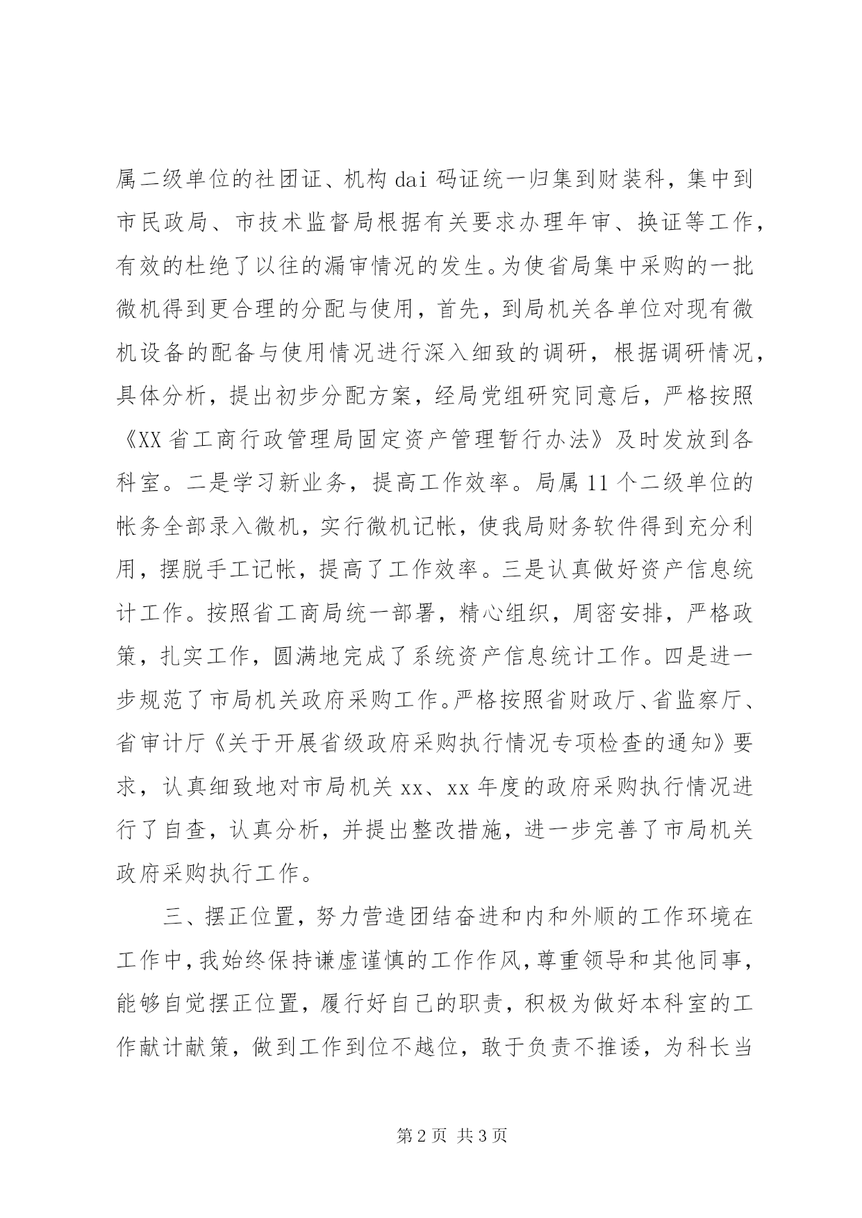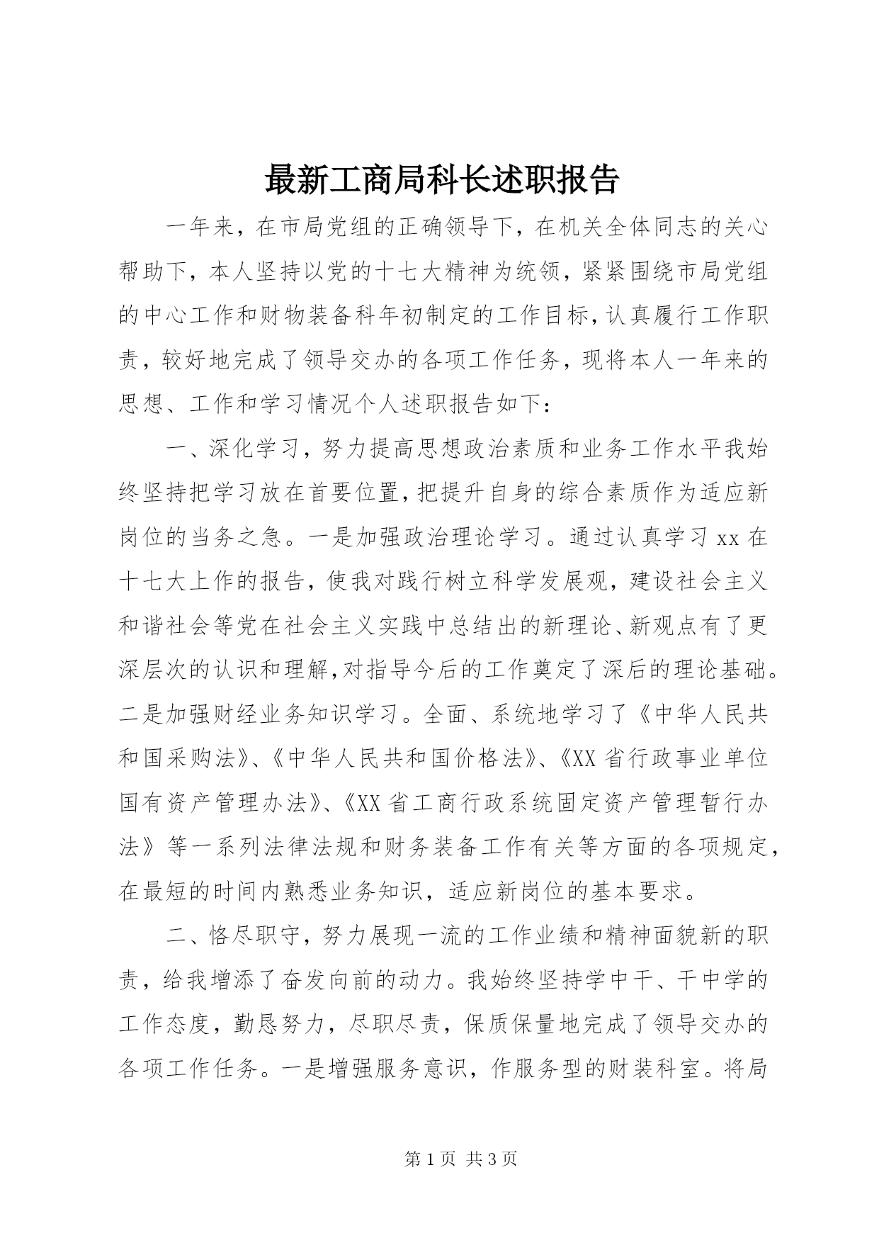 第PAGE\*Arabic\*MERGEFORMAT3页共NUMPAGES\*MERGEFORMAT3页最新工商局科长述职报告一年来,在市局党组的正确领导下,在机关全体同志的关心帮助下,本人坚持以党的十七大精神为统领,紧紧围绕市局党组的中心工作和财物装备科年初制定的工作目标,认真履行工作职责,较好地完成了领导交办的各项工作任务,现将本人一年来的思想、工作和学习情况个人述职报告如下:一、深化学习,努力提高思想政治素质和业务工作水平我始终坚持把学习放在首要位置,把提升自身的综合素质作为适应新岗位的当务之急。一是加强政治理论学习。通过认真学习xx在十七大上作的报告,使我对践行树立科学发展观,建设社会主义和谐社会等党在社会主义实践中总结出的新理论、新观点有了更深层次的认识和理解,对指导今后的工作奠定了深后的理论基础。二是加强财经业务知识学习。全面、系统地学习了《中华人民共和国采购法》、《中华人民共和国价格法》、《XX省行政事业单位国有资产管理办法》、《XX省工商行政系统固定资产管理暂行办法》等一系列法律法规和财务装备工作有关等方面的各项规定,在最短的时间内熟悉业务知识,适应新岗位的基本要求。二、恪尽职守,努力展现一流的工作业绩和精神面貌新的职责,给我增添了奋发向前的动力。我始终坚持学中干、干中学的工作态度,勤恳努力,尽职尽责,保质保量地完成了领导交办的各项工作任务。一是增强服务意识,作服务型的财装科室。将局属二级单位的社团证、机构dai码证统一归集到财装科,集中到市民政局、市技术监督局根据有关要求办理年审、换证等工作,有效的杜绝了以往的漏审情况的发生。为使省局集中采购的一批微机得到更合理的分配与使用,首先,到局机关各单位对现有微机设备的配备与使用情况进行深入细致的调研,根据调研情况,具体分析,提出初步分配方案,经局党组研究同意后,严格按照《XX省工商行政管理局固定资产管理暂行办法》及时发放到各科室。二是学习新业务,提高工作效率。局属11个二级单位的帐务全部录入微机,实行微机记帐,使我局财务软件得到充分利用,摆脱手工记帐,提高了工作效率。三是认真做好资产信息统计工作。按照省工商局统一部署,精心组织,周密安排,严格政策,扎实工作,圆满地完成了系统资产信息统计工作。四是进一步规范了市局机关政府采购工作。严格按照省财政厅、省监察厅、省审计厅《关于开展省级政府采购执行情况专项检查的通知》要求,认真细致地对市局机关xx、xx年度的政府采购执行情况进行了自查,认真分析,并提出整改措施,进一步完善了市局机关政府采购执行工作。三、摆正位置,努力营造团结奋进和内和外顺的工作环境在工作中,我始终保持谦虚谨慎的工作作风,尊重领导和其他同事,能够自觉摆正位置,履行好自己的职责,积极为做好本科室的工作献计献策,做到工作到位不越位,敢于负责不推诿,为科长当好参谋、做好配角,工作上与其他同志密切配合,分工不分家,互相支持,互相帮助,形成了一个相互支持、相互理解、相互补台的良好局面。在与机关其他科室配合上,能够始终从大局出发,主动进行协调,向有关科室领导回报好、沟通好,争取关心和帮助,共同把工作做好。四、清正廉洁,品行端正多年从事财务工作的经验使我深刻地认识到,廉政事关社会主义建设的成败。廉洁自律上更加不敢有丝毫的放松。一是更加牢固树立全心全意为人民服务的思想,不断增强群众观念和群众意识,真正做到情为民所系、权为民所用、利为民所谋。二更加牢固树立马克思主义的世界观、人生观、价值观和正确的权力观、利益观、地位观,模范遵守社会公德、职业道德,家庭美德,坚决地质****思想的侵蚀,保持一名共产党员的先进性。三是更加模范地遵守法律法规,严格执行党风廉政建设的各项规定,常怀律己之心,常思贪欲之害,时时刻刻做到自重、自省、自警、自励,用自己的实际行动维护财务工作人员良好的形象。
