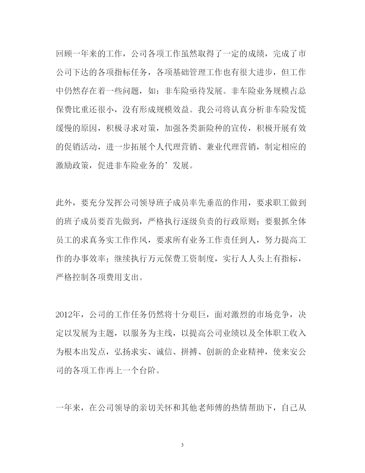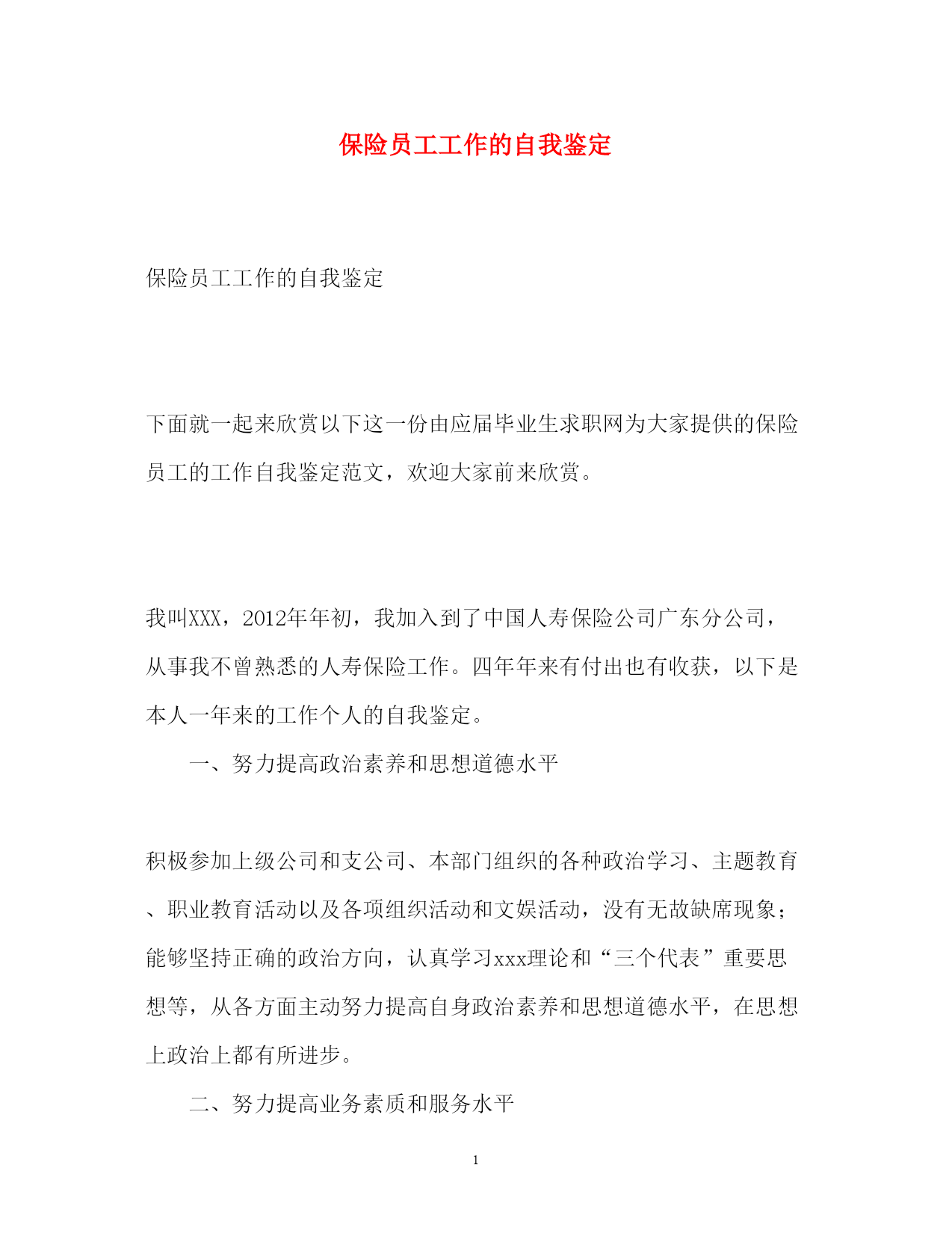 此资料由网络收集而来,如有侵权请告知上传者立即删除。资料共分享,我们负责传递知识。PAGEPAGE4保险员工工作的自我鉴定保险员工工作的自我鉴定下面就一起来欣赏以下这一份由应届毕业生求职网为大家提供的保险员工的工作自我鉴定范文,欢迎大家前来欣赏。我叫XXX,2012年年初,我加入到了中国人寿保险公司广东分公司,从事我不曾熟悉的人寿保险工作。四年年来有付出也有收获,以下是本人一年来的工作个人的自我鉴定。一、努力提高政治素养和思想道德水平积极参加上级公司和支公司、本部门组织的各种政治学习、主题教育、职业教育活动以及各项组织活动和文娱活动,没有无故缺席现象;能够坚持正确的政治方向,认真学习xxx理论和“三个代表”重要思想等,从各方面主动努力提高自身政治素养和思想道德水平,在思想上政治上都有所进步。二、努力提高业务素质和服务水平积极参加上级公司和支公司、本部门组织的各种业务学习培训和考试考核,勤于学习,善于创造,不断加强自身业务素质的训练,不断提高业务操作技能和为客户服务的基本功,掌握了应有的专业业务技能和服务技巧,能够熟练办理各种业务,知晓本公司经营的各项业务产品并能有针对性地开展宣传和促销。三、严格执行各项规章制度一年来,无论在办理业务还是其它的工作中,都能严格执行上级公司和支公司的各项规章制度、内控规定和服务规定,坚持使用文明用语,不越权办事,不以权力谋私,没有出现被客户投诉的行为以及其它违规违章行为。业余生活检点,不参与赌博、购买等不良行为。四、较好地完成支公司和本部门下达的各项工作任务一年来,能一直做到兢兢业业、勤勤恳恳地努力工作,上班早来晚走,立足岗位,默默奉献,积极完成支公司和本部门下达的各项工作任务。能够积极主支动关心本部门的各项营销工作和任务,积极营销电子银行业务和各种银行卡等及其它中介业务等。五、工作中存在的主要问题及今后的努力方向回顾一年来的工作,公司各项工作虽然取得了一定的成绩,完成了市公司下达的各项指标任务,各项基础管理工作也有很大进步,但工作中仍然存在着一些问题,如:非车险亟待发展。非车险业务规模占总保费比重还很小,没有形成规模效益。我公司将认真分析非车险发慌缓慢的原因,积极寻求对策,加强各类新险种的宣传,积极开展有效的促销活动,进一步拓展个人代理营销、兼业代理营销,制定相应的激励政策,促进非车险业务的’发展。此外,要充分发挥公司领导班子成员率先垂范的作用,要求职工做到的班子成员要首先做到,严格执行逐级负责的行政原则;要狠抓全体员工的求真务实工作作风,要求所有业务工作责任到人,努力提高工作的办事效率;继续执行万元保费工资制度,实行人人头上有指标,严格控制各项费用支出。2012年,公司的工作任务仍然将十分艰巨,面对激烈的市场竞争,决定以发展为主题,以服务为主线,以提高公司业绩以及全体职工收入为根本出发点,弘扬求实、诚信、拼搏、创新的企业精神,使来安公司的各项工作再上一个台阶。一年来,在公司领导的亲切关怀和其他老师傅的热情帮助下,自己从一个保险门外汉到能够独立从事和开展保险营销业务,在自己的业务岗位上,做到了无违规行为,和全司员工一起共同努力,较好地完成了领导和上级布置的各项工作任务。在对取得成绩欣慰的同时,也发现自己与最优秀的员工比还存在一定的差距和不足。但我有信心在今后的工作中,我会表现得更出色!