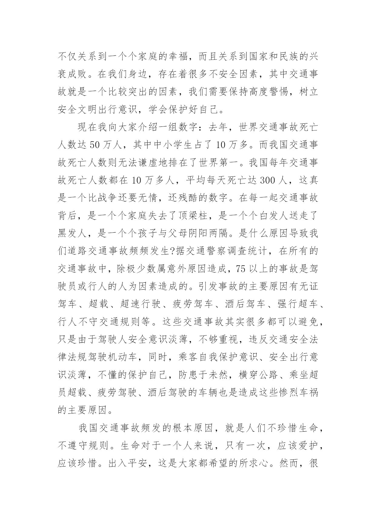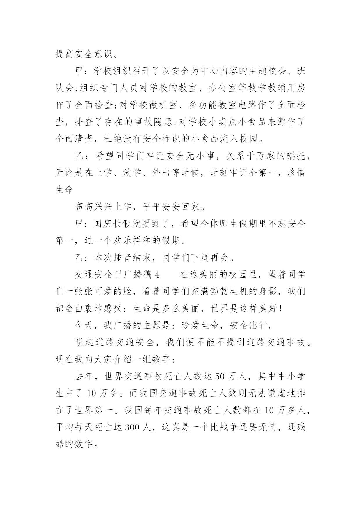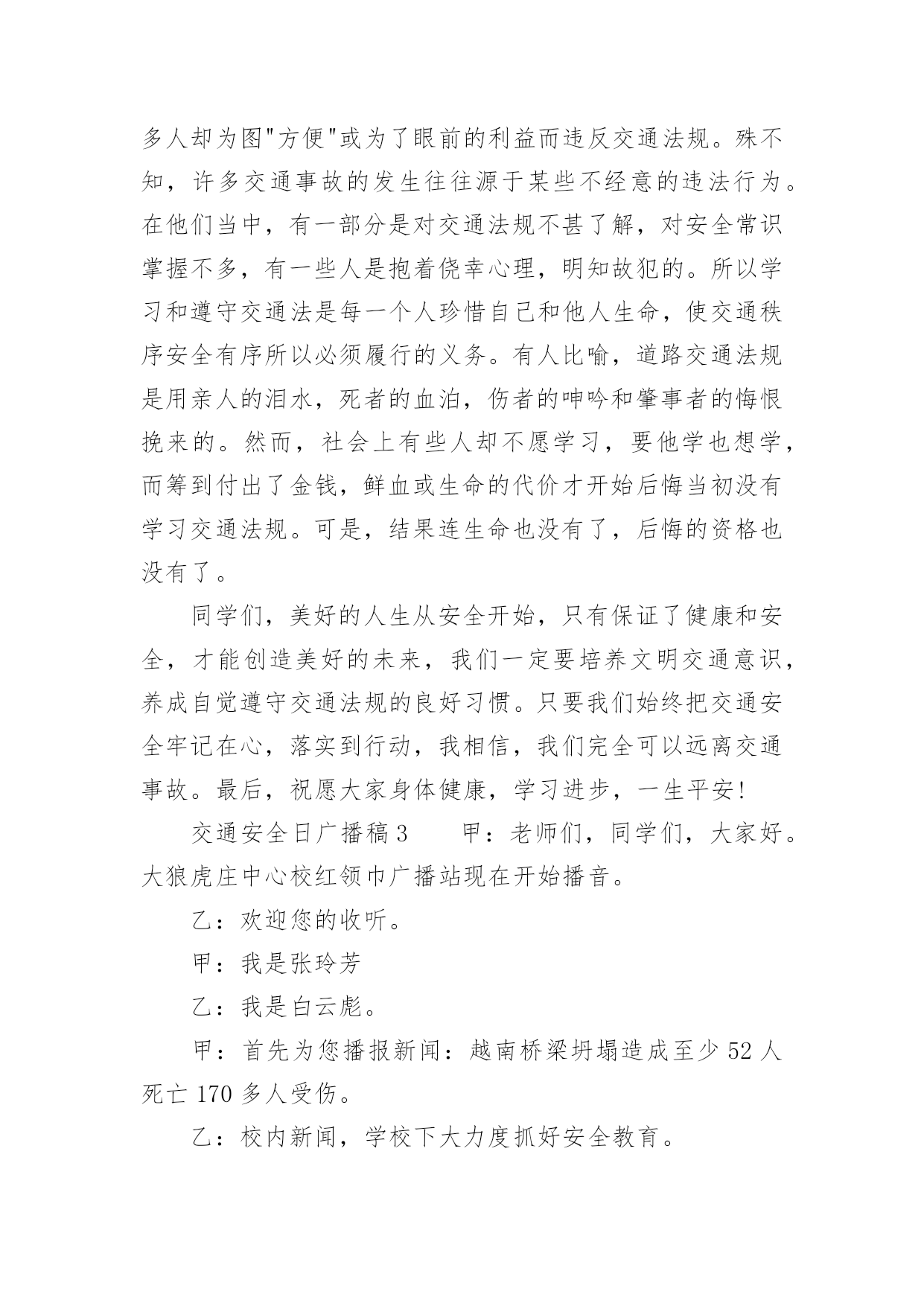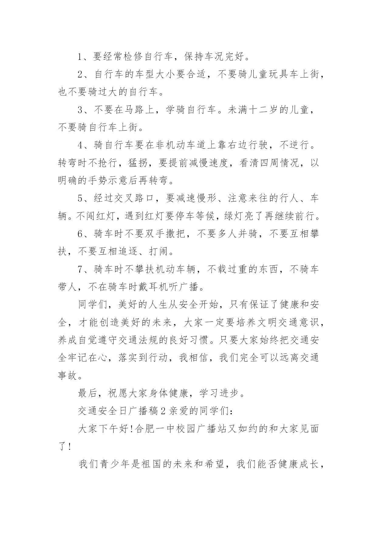 交通安全日广播稿交通安全日广播稿(通用5篇)在学校广播站锻炼的同学们,我们广播前都会提前准备好广播稿,一份一流的广播稿能提高节目效果,我们该怎么去写广播稿呢?以下是小编精心整理的交通安全日广播稿(通用5篇),希望对大家有所帮助。交通安全日广播稿1各位同学:大家下午好!每一个人的生命都是一朵花,而我们现在,是一朵含苞待放的花儿。她虽美丽,但她却娇脆、虚弱,她需要我们自己的安全意识,否则,这朵生命之花就会面临死亡之魔的迫害。谈到生命,我们就会理所当然地想起安全,因为有了安全,人类的生命才能得到保障。谈起安全,我们就会联想到交通安全。交通安全,也是我们学生应该重视的安全问题。下面,我给大家讲一讲交通安全知识。一、指挥灯信号的含义:绿灯亮时,准许车辆、行人通行。红灯亮时,不准车辆、行人通行。黄灯亮时,不准行人、车辆通行,但已超过停止线的车辆和已进入人行横道的行人,可以继续通行。黄灯闪烁时,车辆,行人须在确保安全的原则下通行。二、行人必须遵守的规定:须在人行横道内行走,没有人行道的,须靠边行走。横过车行道,须走人行横道。不准穿越,倚坐道口护栏。不准在道上扒车、追车、强行拦车或抛物击车。列队通过道路时,每横列不准超过2人。儿童的队列,须在人行道上行走。三、横穿马路注意事项:横穿马路,可能遇到的危险因素会大大增加,应特别注意安全。穿越马路时,要遵守交通规则,做到“绿灯形,红灯停”。要走人行横道线。要走直线,不可迂回穿行。在没有人行横道的道路,应先看左边,再看右边,早确认没有机动车通过时才可以穿越马路。同时,不要翻越道路中央的安全护栏和隔离墩。不要突然横穿马路。四、乘车人应该遵守下列规定:1、乘坐公共汽车,要排队候车,按先后顺序上车,不要拥挤。上下车均要等车停稳以后,先下后上,不要争抢。2、不要把汽油、爆竹等易燃的危险品带入车内。3、乘车时不要把头、手伸出窗外,以免被对面来车或路边树木等刮伤。也不要向车窗外乱扔杂物,以免伤及他人。4、乘车时要坐稳扶好,没有座位时,要双脚自然分开,侧向战立,手应握紧扶手,以免车辆紧急刹车时摔倒受伤。5、乘坐小轿车、微型客车时,在前排乘坐应系好安全带。6、尽量避免乘坐卡车、拖拉机。必须乘坐时,千万不要站立在车厢中央或坐在车厢板上。7、不要在机动车道上招呼出租汽车。五、骑自行车要注意的安全事项:1、要经常检修自行车,保持车况完好。2、自行车的车型大小要合适,不要骑儿童玩具车上街,也不要骑过大的自行车。3、不要在马路上,学骑自行车。未满十二岁的儿童,不要骑自行车上街。4、骑自行车要在非机动车道上靠右边行驶,不逆行。转弯时不抢行,猛拐,要提前减慢速度,看清四周情况,以明确的手势示意后再转弯。5、经过交叉路口,要减速慢形、注意来往的行人、车辆。不闯红灯,遇到红灯要停车等候,绿灯亮了再继续前行。6、骑车时不要双手撒把,不要多人并骑,不要互相攀扶,不要互相追逐、打闹。7、骑车时不攀扶机动车辆,不载过重的东西,不骑车带人,不在骑车时戴耳机听广播。同学们,美好的人生从安全开始,只有保证了健康和安全,才能创造美好的未来,大家一定要培养文明交通意识,养成自觉遵守交通法规的良好习惯。只要大家始终把交通安全牢记在心,落实到行动,我相信,我们完全可以远离交通事故。最后,祝愿大家身体健康,学习进步。交通安全日广播稿2亲爱的同学们:大家下午好!合肥一中校园广播站又如约的和大家见面了!我们青少年是祖国的未来和希望,我们能否健康成长,不仅关系到一个个家庭的幸福,而且关系到国家和民族的兴衰成败。在我们身边,存在着很多不安全因素,其中交通事故就是一个比较突出的因素,我们需要保持高度警惕,树立安全文明出行意识,学会保护好自己。现在我向大家介绍一组数字:去年,世界交通事故死亡人数达50万人,其中中小学生占了10万多。而我国交通事故死亡人数则无法谦虚地排在了世界第一。我国每年交通事故死亡人数都在10万多人,平均每天死亡达300人,这真是一个比战争还要无情,还残酷的数字。在每一起交通事故背后,是一个个家庭失去了顶梁柱,是一个个白发人送走了黑发人,是一个个孩子与父母阴阳两隔。是什么原因导致我们道路交通事故频频发生?据交通警察调查统计,在所有的交通事故中,除极少数属意外原因造成,75以上的事故是驾驶员或行人的人为因素造成的。引发事故的主要原因有无证驾车、超载、超速行驶、疲劳驾车、酒后驾车、强行超车、行人不守交通规则等。这些交通事故其实很多都可以避免,只是由于驾驶人安全意识淡薄,不够重视,违反交通安全法律法规驾驶机动车,同时,乘客自我保护意识、安全出行意识淡薄,不懂的保护自己,防患于未然,横穿公路、乘坐超员超载、疲劳驾驶、酒后驾驶的车辆也是造成这些惨烈车祸的主要原因。我国交通事故频发的根本原因,就是人们不珍惜生命,不遵守规则。生命对于一个人来说,只有一次,应该