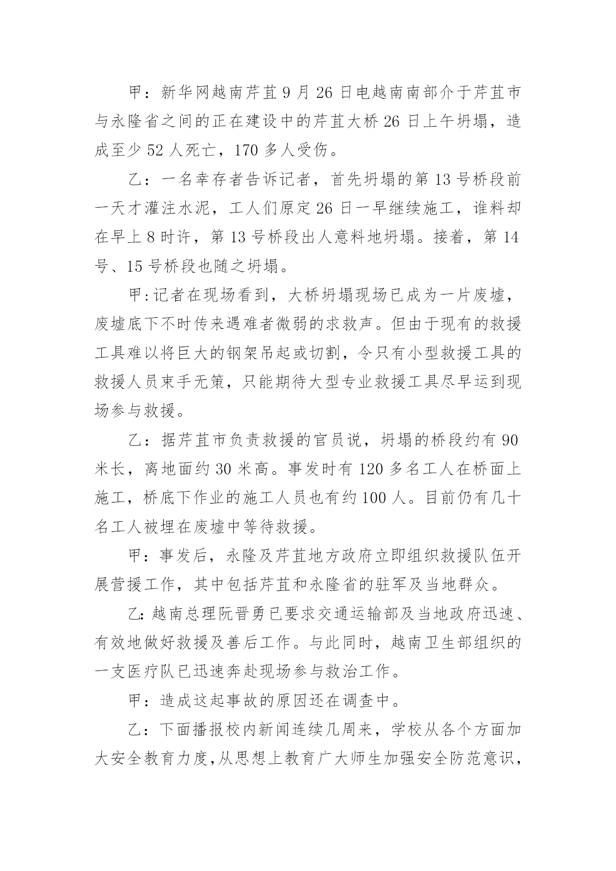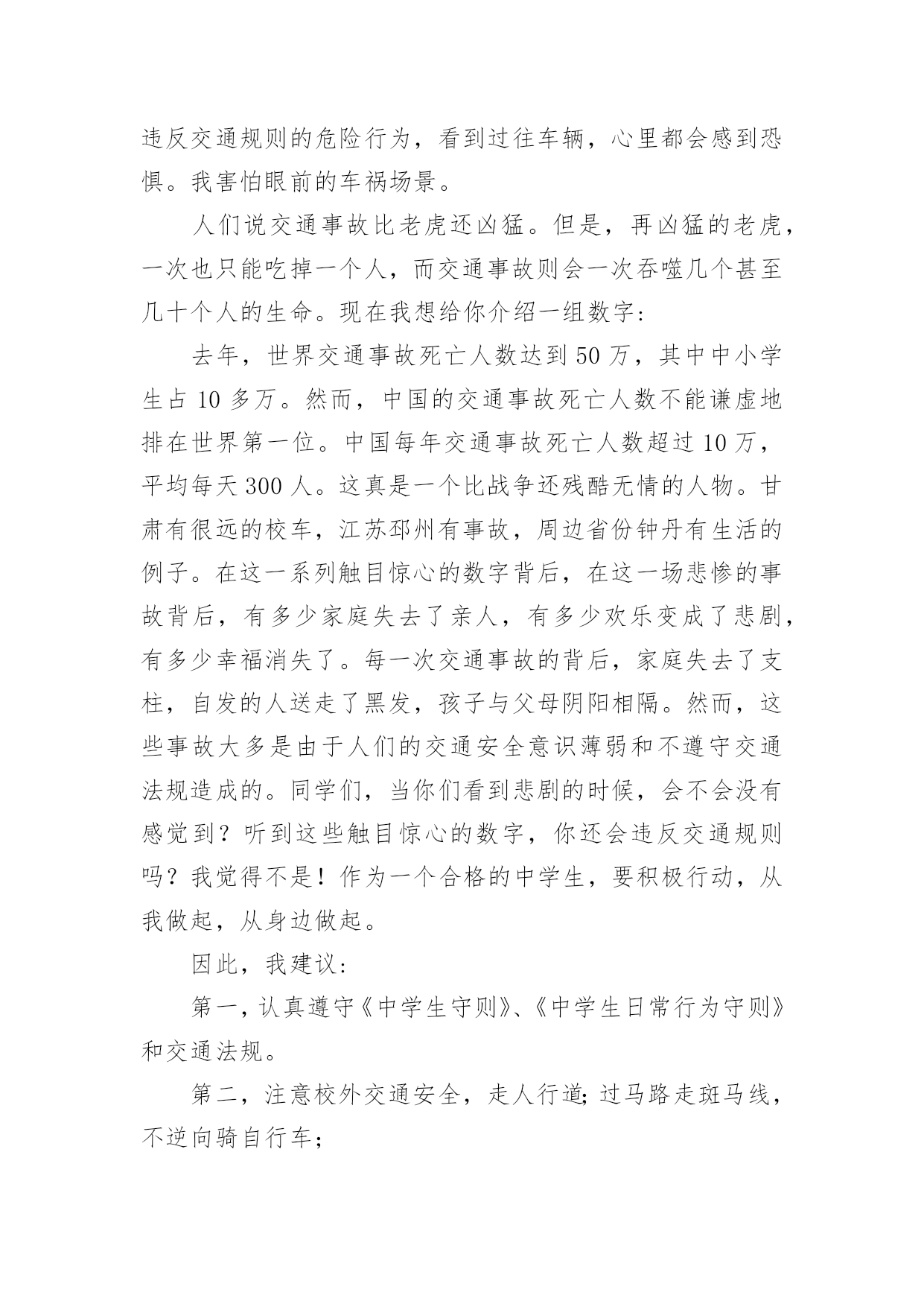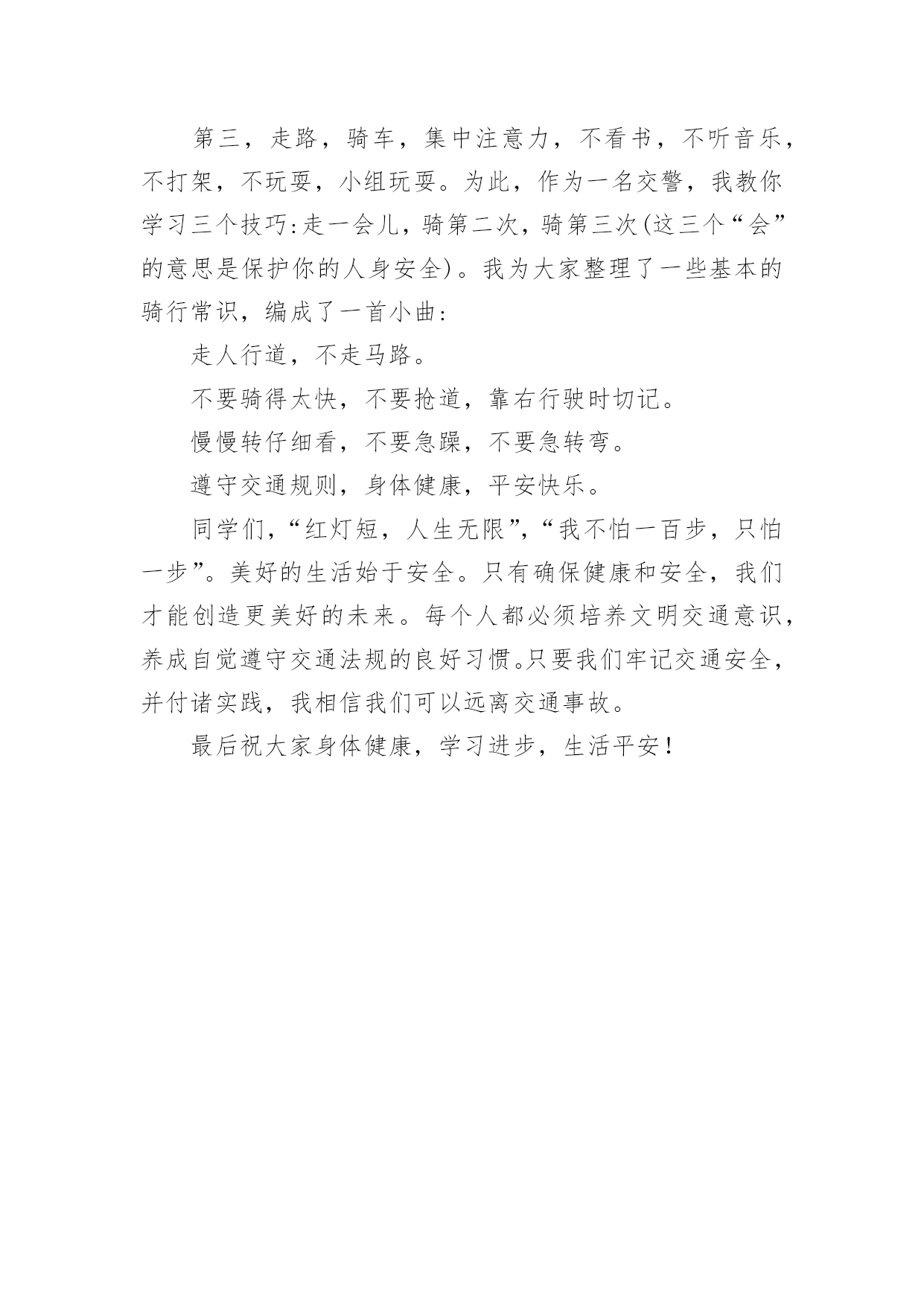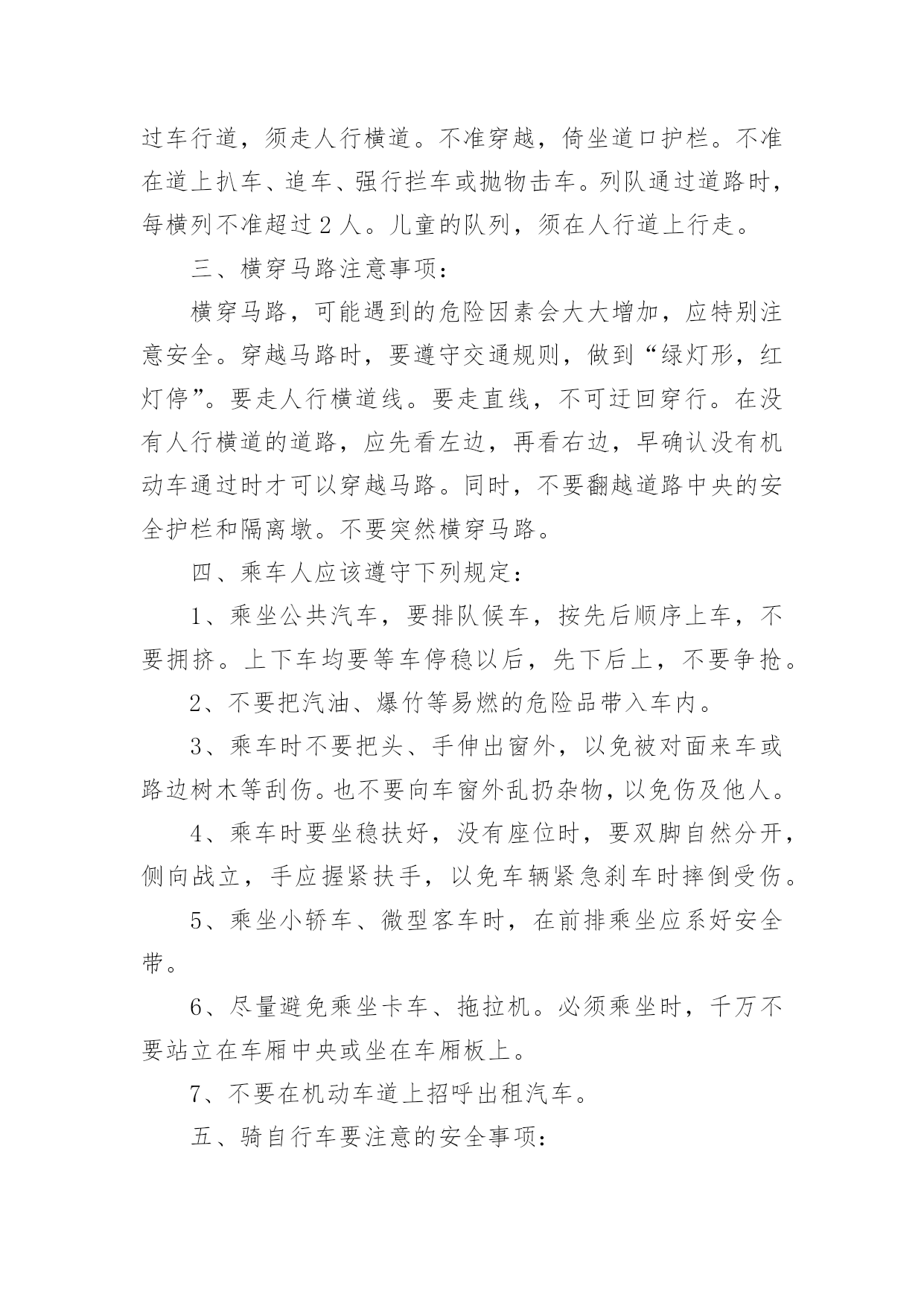 交通安全日广播稿交通安全日广播稿(通用5篇)在学校广播站锻炼的同学们,我们广播前都会提前准备好广播稿,一份一流的广播稿能提高节目效果,我们该怎么去写广播稿呢?以下是小编精心整理的交通安全日广播稿(通用5篇),希望对大家有所帮助。交通安全日广播稿1各位同学:大家下午好!每一个人的生命都是一朵花,而我们现在,是一朵含苞待放的花儿。她虽美丽,但她却娇脆、虚弱,她需要我们自己的安全意识,否则,这朵生命之花就会面临死亡之魔的迫害。谈到生命,我们就会理所当然地想起安全,因为有了安全,人类的生命才能得到保障。谈起安全,我们就会联想到交通安全。交通安全,也是我们学生应该重视的安全问题。下面,我给大家讲一讲交通安全知识。一、指挥灯信号的含义:绿灯亮时,准许车辆、行人通行。红灯亮时,不准车辆、行人通行。黄灯亮时,不准行人、车辆通行,但已超过停止线的车辆和已进入人行横道的行人,可以继续通行。黄灯闪烁时,车辆,行人须在确保安全的原则下通行。二、行人必须遵守的规定:须在人行横道内行走,没有人行道的,须靠边行走。横过车行道,须走人行横道。不准穿越,倚坐道口护栏。不准在道上扒车、追车、强行拦车或抛物击车。列队通过道路时,每横列不准超过2人。儿童的队列,须在人行道上行走。三、横穿马路注意事项:横穿马路,可能遇到的危险因素会大大增加,应特别注意安全。穿越马路时,要遵守交通规则,做到“绿灯形,红灯停”。要走人行横道线。要走直线,不可迂回穿行。在没有人行横道的道路,应先看左边,再看右边,早确认没有机动车通过时才可以穿越马路。同时,不要翻越道路中央的安全护栏和隔离墩。不要突然横穿马路。四、乘车人应该遵守下列规定:1、乘坐公共汽车,要排队候车,按先后顺序上车,不要拥挤。上下车均要等车停稳以后,先下后上,不要争抢。2、不要把汽油、爆竹等易燃的危险品带入车内。3、乘车时不要把头、手伸出窗外,以免被对面来车或路边树木等刮伤。也不要向车窗外乱扔杂物,以免伤及他人。4、乘车时要坐稳扶好,没有座位时,要双脚自然分开,侧向战立,手应握紧扶手,以免车辆紧急刹车时摔倒受伤。5、乘坐小轿车、微型客车时,在前排乘坐应系好安全带。6、尽量避免乘坐卡车、拖拉机。必须乘坐时,千万不要站立在车厢中央或坐在车厢板上。7、不要在机动车道上招呼出租汽车。五、骑自行车要注意的安全事项:1、要经常检修自行车,保持车况完好。2、自行车的车型大小要合适,不要骑儿童玩具车上街,也不要骑过大的自行车。3、不要在马路上,学骑自行车。未满十二岁的儿童,不要骑自行车上街。4、骑自行车要在非机动车道上靠右边行驶,不逆行。转弯时不抢行,猛拐,要提前减慢速度,看清四周情况,以明确的手势示意后再转弯。5、经过交叉路口,要减速慢形、注意来往的行人、车辆。不闯红灯,遇到红灯要停车等候,绿灯亮了再继续前行。6、骑车时不要双手撒把,不要多人并骑,不要互相攀扶,不要互相追逐、打闹。7、骑车时不攀扶机动车辆,不载过重的东西,不骑车带人,不在骑车时戴耳机听广播。同学们,美好的人生从安全开始,只有保证了健康和安全,才能创造美好的未来,大家一定要培养文明交通意识,养成自觉遵守交通法规的良好习惯。只要大家始终把交通安全牢记在心,落实到行动,我相信,我们完全可以远离交通事故。最后,祝愿大家身体健康,学习进步。交通安全日广播稿2亲爱的同学们:大家下午好!合肥一中校园广播站又如约的和大家见面了!我们青少年是祖国的未来和希望,我们能否健康成长,不仅关系到一个个家庭的幸福,而且关系到国家和民族的兴衰成败。在我们身边,存在着很多不安全因素,其中交通事故就是一个比较突出的因素,我们需要保持高度警惕,树立安全文明出行意识,学会保护好自己。现在我向大家介绍一组数字:去年,世界交通事故死亡人数达50万人,其中中小学生占了10万多。而我国交通事故死亡人数则无法谦虚地排在了世界第一。我国每年交通事故死亡人数都在10万多人,平均每天死亡达300人,这真是一个比战争还要无情,还残酷的数字。在每一起交通事故背后,是一个个家庭失去了顶梁柱,是一个个白发人送走了黑发人,是一个个孩子与父母阴阳两隔。是什么原因导致我们道路交通事故频频发生?据交通警察调查统计,在所有的交通事故中,除极少数属意外原因造成,75以上的事故是驾驶员或行人的人为因素造成的。引发事故的主要原因有无证驾车、超载、超速行驶、疲劳驾车、酒后驾车、强行超车、行人不守交通规则等。这些交通事故其实很多都可以避免,只是由于驾驶人安全意识淡薄,不够重视,违反交通安全法律法规驾驶机动车,同时,乘客自我保护意识、安全出行意识淡薄,不懂的保护自己,防患于未然,横穿公路、乘坐超员超载、疲劳驾驶、酒后驾驶的车辆也是造成这些惨烈车祸的主要原因。我国交通事故频发的根本原因,就是人们不珍惜生命,不遵守规则。生命对于一个人来说,只有一次,应该