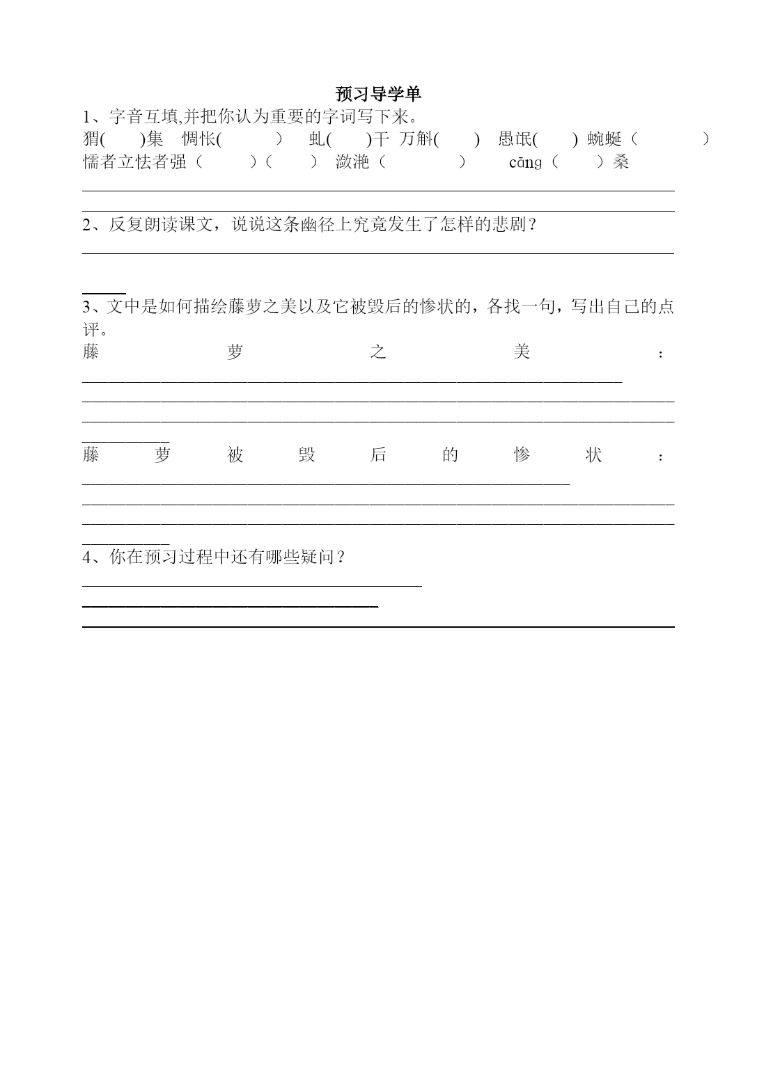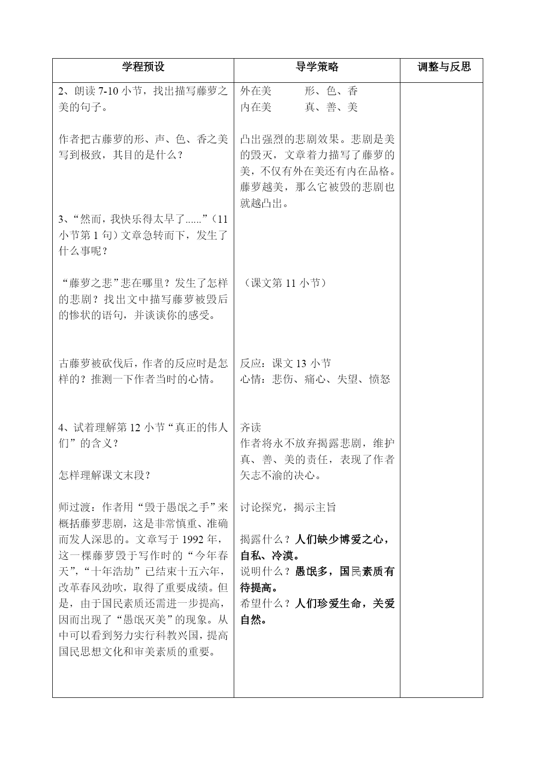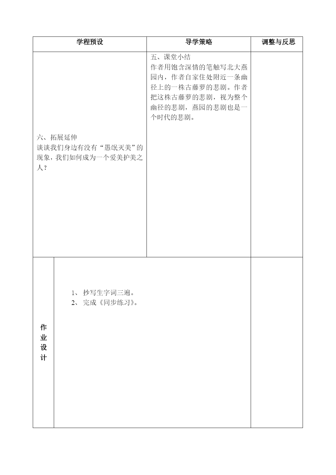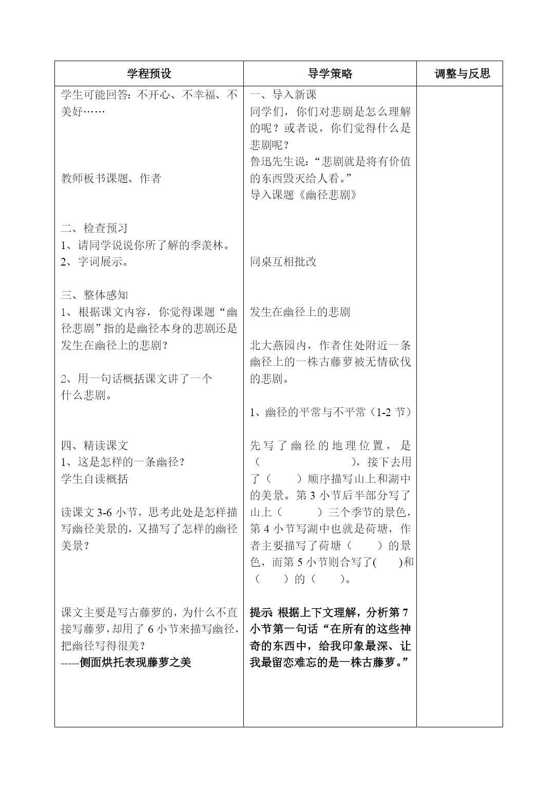 “学程导航”课时教学计划教学内容《幽径悲剧》共几课时2课型新授第几课时1教学目标1、感受古藤的美和悲,理解作者矢志维护真、善、美的思想感情与决心。2、培养学生欣赏美、保护美的意识。教学重难点体会“幽径悲剧”强烈的悲剧效果,反思悲剧根源。教学资源本文主要写了北大燕园内,作者自家住处附近一条幽径上的一株古藤萝的悲剧。作者视它为整个幽径的悲剧,燕园的悲剧也是一个时代的悲剧,以此来震憾人们,反思悲剧根源,呼吁人们关注一切生灵,尊重生命,善待生命。预习设计幽径悲剧季羡林古藤萝的悲剧美惨形、色、香吊死鬼、孤儿真、善、美哭泣、灵魂、显灵幽径的悲剧、校园的悲剧、时代的悲剧施教日期年月日学程预设导学策略调整与反思学生可能回答:不开心、不幸福、不美好……教师板书课题、作者二、检查预习1、请同学说说你所了解的季羡林。2、字词展示。三、整体感知1、根据课文内容,你觉得课题“幽径悲剧”指的是幽径本身的悲剧还是发生在幽径上的悲剧?2、用一句话概括课文讲了一个什么悲剧。四、精读课文1、这是怎样的一条幽径?学生自读概括读课文3-6小节,思考此处是怎样描写幽径美景的,又描写了怎样的幽径美景?课文主要是写古藤萝的,为什么不直接写藤萝,却用了6小节来描写幽径,把幽径写得很美?-----侧面烘托表现藤萝之美导入新课同学们,你们对悲剧是怎么理解的呢?或者说,你们觉得什么是悲剧呢?鲁迅先生说:“悲剧就是将有价值的东西毁灭给人看。”导入课题《幽径悲剧》同桌互相批改发生在幽径上的悲剧北大燕园内,作者住处附近一条幽径上的一株古藤萝被无情砍伐的悲剧。1、幽径的平常与不平常(1-2节)先写了幽径的地理位置,是(),接下去用了()顺序描写山上和湖中的美景。第3小节后半部分写了山上()三个季节的景色,第4小节写湖中也就是荷塘,作者主要描写了荷塘()的景色,而第5小节则合写了()和()的()。提示:根据上下文理解,分析第7小节第一句话“在所有的这些神奇的东西中,给我印象最深、让我最留恋难忘的是一株古藤萝。”学程预设导学策略调整与反思2、朗读7-10小节,找出描写藤萝之美的句子。作者把古藤萝的形、声、色、香之美写到极致,其目的是什么?3、“然而,我快乐得太早了......”(11小节第1句)文章急转而下,发生了什么事呢?“藤萝之悲”悲在哪里?发生了怎样的悲剧?找出文中描写藤萝被毁后的惨状的语句,并谈谈你的感受。古藤萝被砍伐后,作者的反应时是怎样的?推测一下作者当时的心情。4、试着理解第12小节“真正的伟人们”的含义?怎样理解课文末段?师过渡:作者用“毁于愚氓之手”来概括藤萝悲剧,这是非常慎重、准确而发人深思的。文章写于1992年,这一棵藤萝毁于写作时的“今年春天”,“十年浩劫”已结束十五六年,改革春风劲吹,取得了重要成绩。但是,由于国民素质还需进一步提高,因而出现了“愚氓灭美”的现象。从中可以看到努力实行科教兴国,提高国民思想文化和审美素质的重要。外在美形、色、香内在美真、善、美凸出强烈的悲剧效果。悲剧是美的毁灭,文章着力描写了藤萝的美,不仅有外在美还有内在品格。藤萝越美,那么它被毁的悲剧也就越凸出。(课文第11小节)反应:课文13小节心情:悲伤、痛心、失望、愤怒齐读作者将永不放弃揭露悲剧,维护真、善、美的责任,表现了作者矢志不渝的决心。讨论探究,揭示主旨揭露什么?人们缺少博爱之心,自私、冷漠。说明什么?愚氓多,国民素质有待提高。希望什么?人们珍爱生命,关爱自然。学程预设导学策略调整与反思六、拓展延伸谈谈我们身边有没有“愚氓灭美”的现象,我们如何成为一个爱美护美之人?五、课堂小结作者用饱含深情的笔触写北大燕园内,作者自家住处附近一条幽径上的一株古藤萝的悲剧。作者把这株古藤萝的悲剧,视为整个幽径的悲剧,燕园的悲剧也是一个时代的悲剧。作业设计抄写生字词三遍。完成《同步练习》。预习导学单1、字音互填,并把你认为重要的字词写下来。猬()集惆怅()虬()干万斛()愚氓()蜿蜒()懦者立怯者强()()潋滟()cānɡ()桑2、反复朗读课文,说说这条幽径上究竟发生了怎样的悲剧?3、文中是如何描绘藤萝之美以及它被毁后的惨状的,各找一句,写出自己的点评。藤萝之美:_______________________________________________________________________________________________________________________________