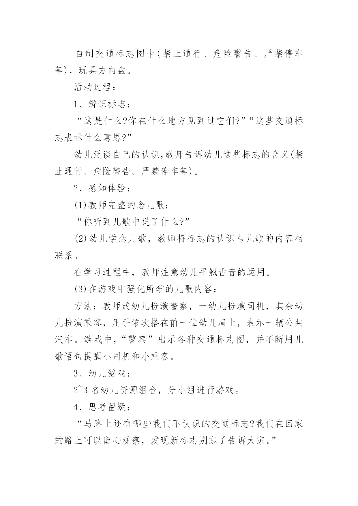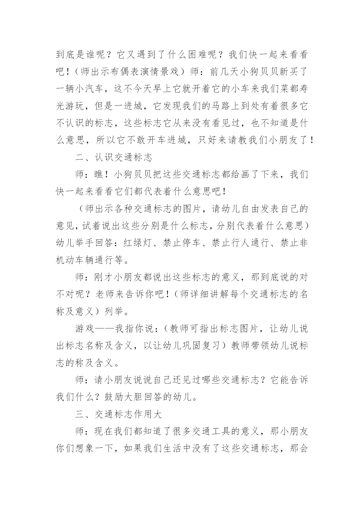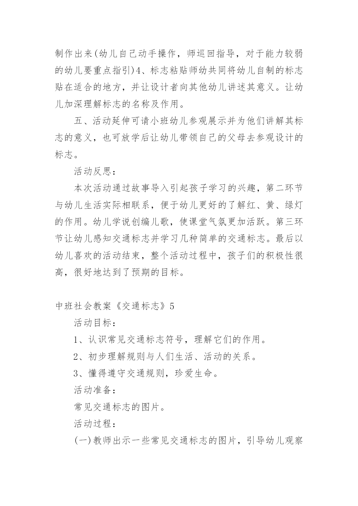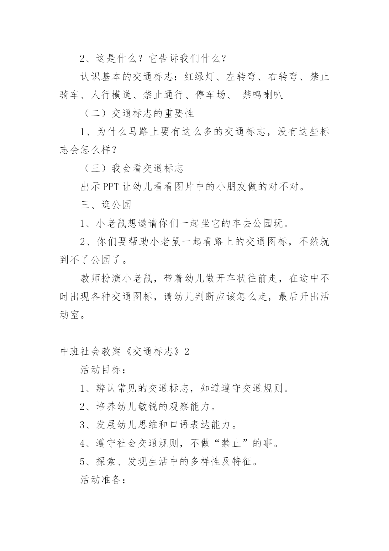 中班社会教案《交通标志》作为一位无私奉献的人民教师,常常要根据教学需要编写教案,教案是备课向课堂教学转化的关节点。来参考自己需要的教案吧!以下是小编收集整理的中班社会教案《交通标志》,仅供参考,希望能够帮助到大家。中班社会教案《交通标志》1活动目标:1、认识常见的交通标志,知道标志是社会生活环境中不可缺少的一种符号。2、学会看着标志进行游戏。3、培养幼儿的规则意识,激发幼儿对交通标志的兴趣。活动准备:PPT、标志图片活动过程:一、故事导入今天,乡下来的小老鼠想到城里来做游玩。它开着车子刚来到城里,就看到了很多不认识的标志,它就不敢再开了。它想请你们来帮它一起认识这些标志。二、认识交通标志(一)通过课件认识各种交通标志1、看,小老鼠把路上的标志都放到这里了,我们来看看它们都是什么。2、这是什么?它告诉我们什么?认识基本的交通标志:红绿灯、左转弯、右转弯、禁止骑车、人行横道、禁止通行、停车场、禁鸣喇叭(二)交通标志的重要性1、为什么马路上要有这么多的交通标志,没有这些标志会怎么样?(三)我会看交通标志出示PPT让幼儿看看图片中的小朋友做的对不对。三、逛公园1、小老鼠想邀请你们一起坐它的车去公园玩。2、你们要帮助小老鼠一起看路上的交通图标,不然就到不了公园了。教师扮演小老鼠,带着幼儿做开车状往前走,在途中不时出现各种交通图标,请幼儿判断应该怎么走,最后开出活动室。中班社会教案《交通标志》2活动目标:1、辨认常见的交通标志,知道遵守交通规则。2、培养幼儿敏锐的观察能力。3、发展幼儿思维和口语表达能力。4、遵守社会交通规则,不做“禁止”的事。5、探索、发现生活中的多样性及特征。活动准备:自制交通标志图卡(禁止通行、危险警告、严禁停车等),玩具方向盘。活动过程:1、辨识标志:“这是什么?你在什么地方见到过它们?”“这些交通标志表示什么意思?”幼儿泛谈自己的认识,教师告诉幼儿这些标志的含义(禁止通行、危险警告、严禁停车等)。2、感知体验:(1)教师完整的念儿歌:“你听到儿歌中说了什么?”(2)幼儿学念儿歌,教师将标志的认识与儿歌的内容相联系。在学习过程中,教师注意幼儿平翘舌音的运用。(3)在游戏中强化所学的儿歌内容:方法:教师或幼儿扮演警察,一幼儿扮演司机,其余幼儿扮演乘客,用手依次搭在前一位幼儿肩上,表示一辆公共汽车。游戏中,“警察”出示各种交通标志图,并不断用儿歌语句提醒小司机和小乘客。3、幼儿游戏:2~3名幼儿资源组合,分小组进行游戏。4、思考留疑:“马路上还有哪些我们不认识的交通标志?我们在回家的路上可以留心观察,发现新标志别忘了告诉大家。”活动反思:活动开始就引起了幼儿的兴趣,激发了幼儿的思考。在幼儿听老师念儿歌时,幼儿的注意力很集中,但也有部分幼儿注意力分散。在游戏过程中,刚开始时幼儿只集中玩游戏而对儿歌并不是很很兴趣,记得的就含含糊糊的说几句,不记得的就只听见一片小声。在反复练习并在不断的提醒之下,幼儿已能边念儿歌边玩游戏了,以后还需多多巩固学习。中班社会教案《交通标志》3活动目标:1、让幼儿认识常见的交通标志,知道标志是社会生活环境中不可缺少的一种符号;2、让幼儿了解标志的作用和特征;3、培养幼儿的规则意识,激发幼儿对交通标志的兴趣。4、激发幼儿的想象创造标志,培养幼儿的创造能力。5、使幼儿学会按标志行动活动准备:1。准备各种交通标志图片、书籍若干。2。准备自制标志所需要的各种材料。卡纸、铅笔、彩笔等。3。小狗贝贝布偶一个活动过程:一、故事导入:师:小朋友,今天早上有个小动物委托我们帮他一个忙。到底是谁呢?它又遇到了什么困难呢?我们快一起来看看吧!(师出示布偶表演情景戏)师:前几天小狗贝贝新买了一辆小汽车,这不今天早上它就开着它的小车来我们菜都寿光游玩,但是一进城,它发现我们的马路上到处有着很多它不认识的标志,这些标志它从来没有看见过,也不知道是什么意思,所以它不敢开车进城,只好来请教我们小朋友了!二、认识交通标志师:瞧!小狗贝贝把这些交通标志都给画了下来,我们快一起来看看它们都代表着什么意思吧!(师出示各种交通标志的图片,请幼儿自由发表自己的意见,试着说出这些分别是什么标志,分别代表着什么意思)幼儿举手回答:红绿灯、禁止停车、禁止行人通行、禁止非机动车辆通行等。师:刚才小朋友都说出这些标志的意义,那到底说的对不对呢?老师来告诉你吧!(师详细讲解每个交通标志的名称及意义)列举。游戏——我指你说:(教师可指出标志图片,让幼儿说出标志名称及含义,以让幼儿巩固复习)教师带领幼儿说标志的称及含义。师:请小朋友说说自己还见过哪些交通标志?它能告诉我们什么?鼓励大胆回答的幼儿。三、交通标志作用大师:现在我们都知道了很多交通工具的意义,那小朋友你们想象一下,如果我们生活中没有了这些交通标志,那会变成什么样子呢?(幼儿自由想象回答,幼儿