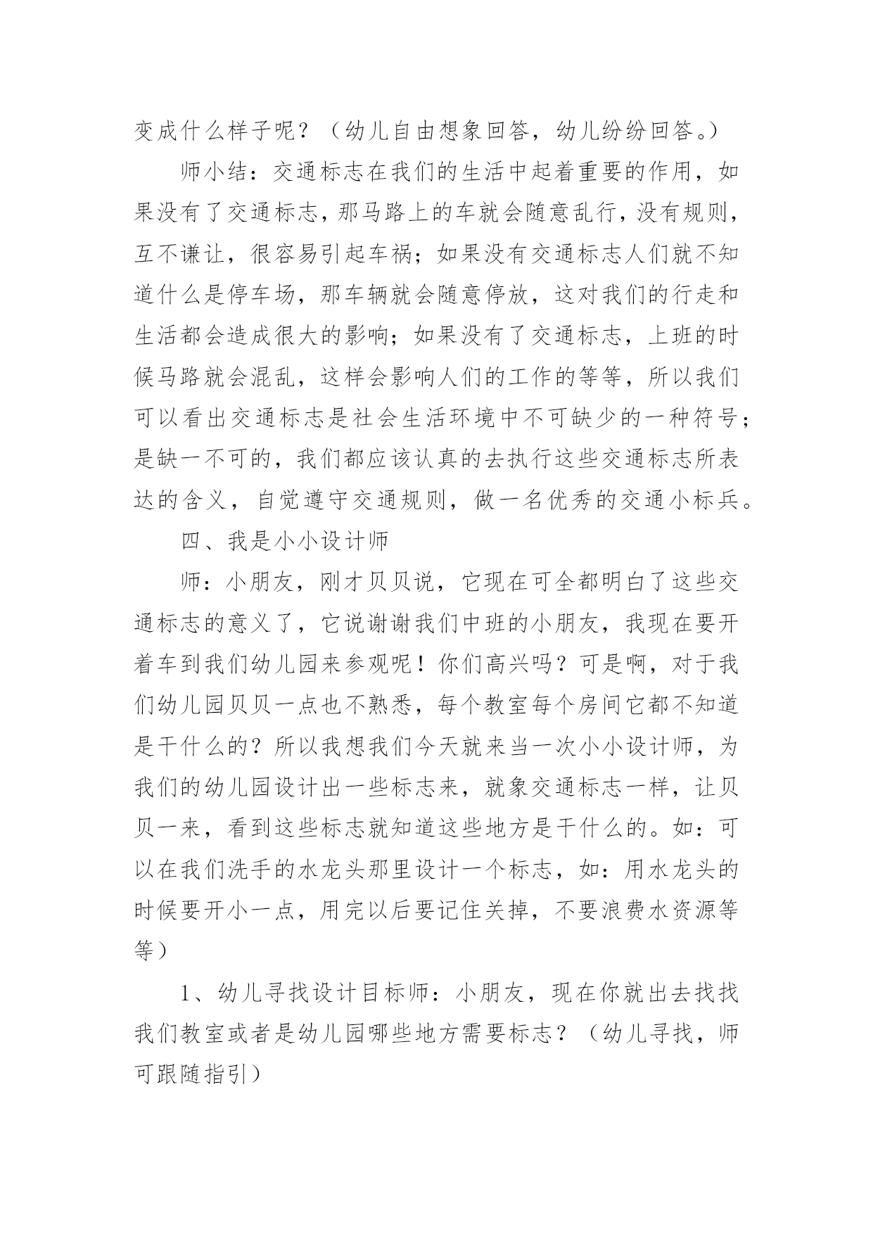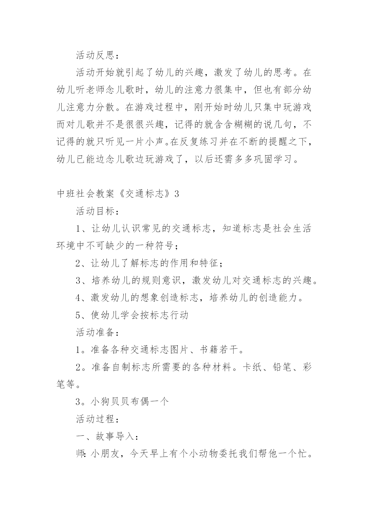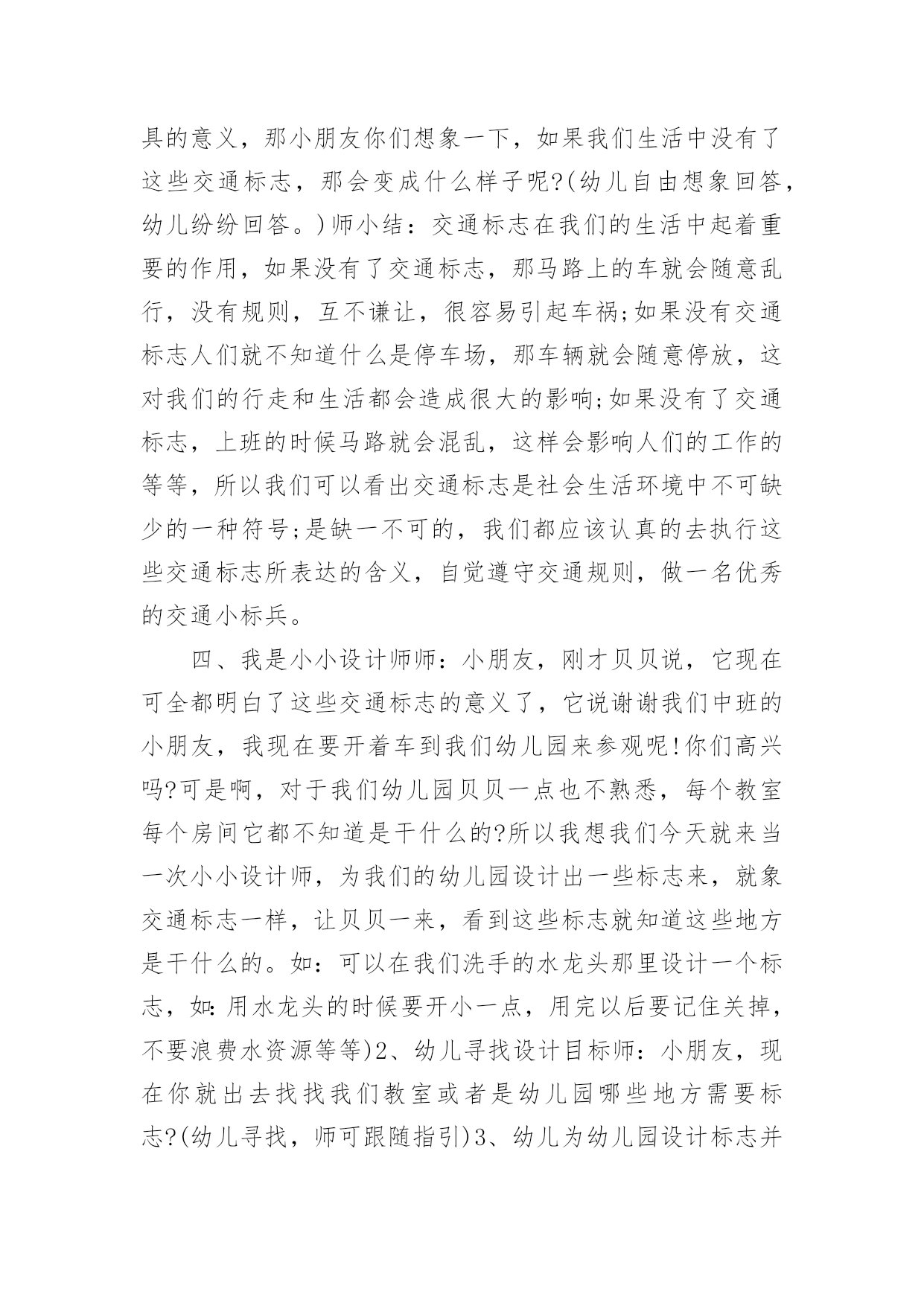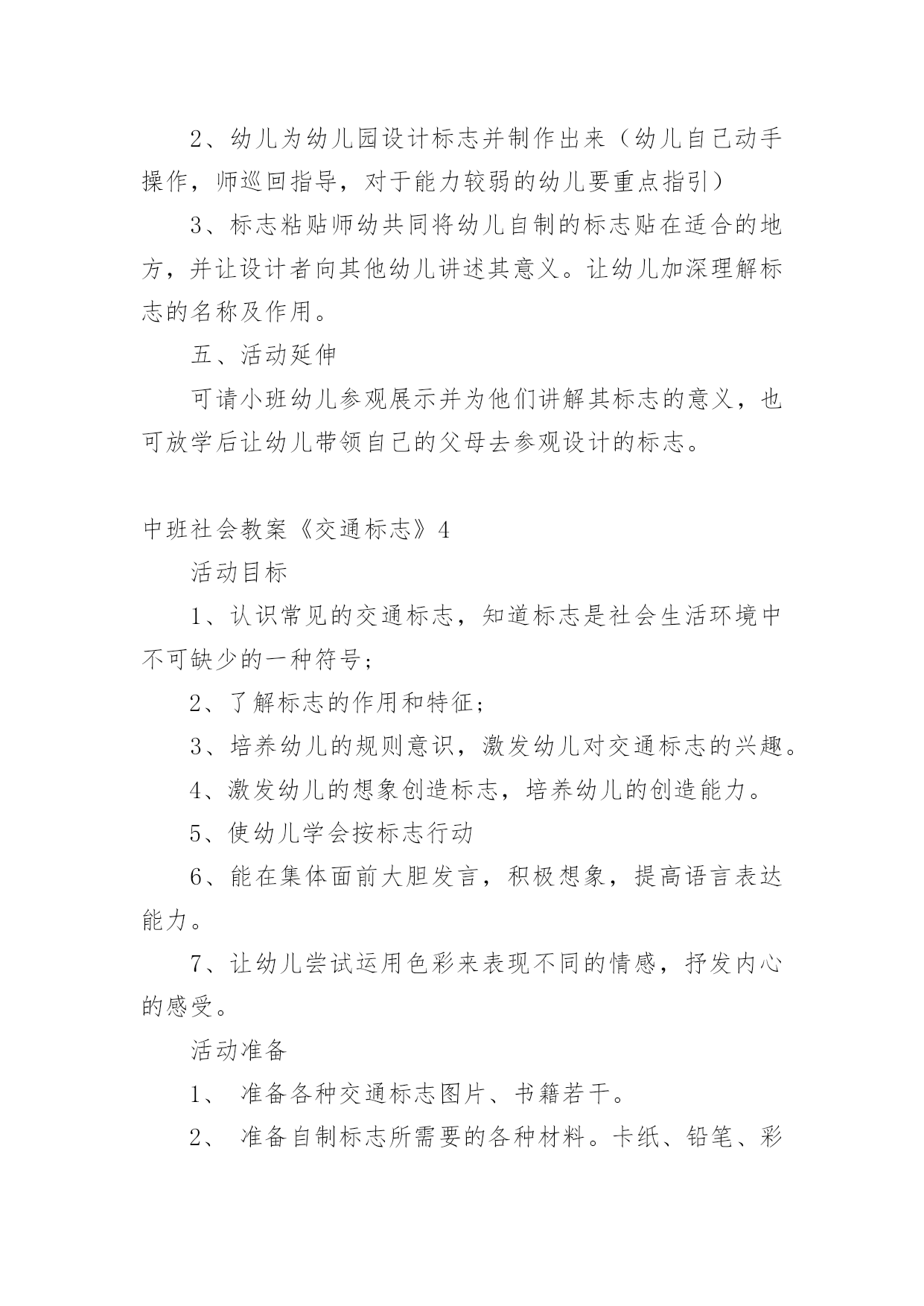 中班社会教案《交通标志》作为一位无私奉献的人民教师,常常要根据教学需要编写教案,教案是备课向课堂教学转化的关节点。来参考自己需要的教案吧!以下是小编收集整理的中班社会教案《交通标志》,仅供参考,希望能够帮助到大家。中班社会教案《交通标志》1活动目标:1、认识常见的交通标志,知道标志是社会生活环境中不可缺少的一种符号。2、学会看着标志进行游戏。3、培养幼儿的规则意识,激发幼儿对交通标志的兴趣。活动准备:PPT、标志图片活动过程:一、故事导入今天,乡下来的小老鼠想到城里来做游玩。它开着车子刚来到城里,就看到了很多不认识的标志,它就不敢再开了。它想请你们来帮它一起认识这些标志。二、认识交通标志(一)通过课件认识各种交通标志1、看,小老鼠把路上的标志都放到这里了,我们来看看它们都是什么。2、这是什么?它告诉我们什么?认识基本的交通标志:红绿灯、左转弯、右转弯、禁止骑车、人行横道、禁止通行、停车场、禁鸣喇叭(二)交通标志的重要性1、为什么马路上要有这么多的交通标志,没有这些标志会怎么样?(三)我会看交通标志出示PPT让幼儿看看图片中的小朋友做的对不对。三、逛公园1、小老鼠想邀请你们一起坐它的车去公园玩。2、你们要帮助小老鼠一起看路上的交通图标,不然就到不了公园了。教师扮演小老鼠,带着幼儿做开车状往前走,在途中不时出现各种交通图标,请幼儿判断应该怎么走,最后开出活动室。中班社会教案《交通标志》2活动目标:1、辨认常见的交通标志,知道遵守交通规则。2、培养幼儿敏锐的观察能力。3、发展幼儿思维和口语表达能力。4、遵守社会交通规则,不做“禁止”的事。5、探索、发现生活中的多样性及特征。活动准备:自制交通标志图卡(禁止通行、危险警告、严禁停车等),玩具方向盘。活动过程:1、辨识标志:“这是什么?你在什么地方见到过它们?”“这些交通标志表示什么意思?”幼儿泛谈自己的认识,教师告诉幼儿这些标志的含义(禁止通行、危险警告、严禁停车等)。2、感知体验:(1)教师完整的念儿歌:“你听到儿歌中说了什么?”(2)幼儿学念儿歌,教师将标志的认识与儿歌的内容相联系。在学习过程中,教师注意幼儿平翘舌音的运用。(3)在游戏中强化所学的儿歌内容:方法:教师或幼儿扮演警察,一幼儿扮演司机,其余幼儿扮演乘客,用手依次搭在前一位幼儿肩上,表示一辆公共汽车。游戏中,“警察”出示各种交通标志图,并不断用儿歌语句提醒小司机和小乘客。3、幼儿游戏:2~3名幼儿资源组合,分小组进行游戏。4、思考留疑:“马路上还有哪些我们不认识的交通标志?我们在回家的路上可以留心观察,发现新标志别忘了告诉大家。”活动反思:活动开始就引起了幼儿的兴趣,激发了幼儿的思考。在幼儿听老师念儿歌时,幼儿的注意力很集中,但也有部分幼儿注意力分散。在游戏过程中,刚开始时幼儿只集中玩游戏而对儿歌并不是很很兴趣,记得的就含含糊糊的说几句,不记得的就只听见一片小声。在反复练习并在不断的提醒之下,幼儿已能边念儿歌边玩游戏了,以后还需多多巩固学习。中班社会教案《交通标志》3活动目标:1、让幼儿认识常见的交通标志,知道标志是社会生活环境中不可缺少的一种符号;2、让幼儿了解标志的作用和特征;3、培养幼儿的规则意识,激发幼儿对交通标志的兴趣。4、激发幼儿的想象创造标志,培养幼儿的创造能力。5、使幼儿学会按标志行动活动准备:1。准备各种交通标志图片、书籍若干。2。准备自制标志所需要的各种材料。卡纸、铅笔、彩笔等。3。小狗贝贝布偶一个活动过程:一、故事导入:师:小朋友,今天早上有个小动物委托我们帮他一个忙。到底是谁呢?它又遇到了什么困难呢?我们快一起来看看吧!(师出示布偶表演情景戏)师:前几天小狗贝贝新买了一辆小汽车,这不今天早上它就开着它的小车来我们菜都寿光游玩,但是一进城,它发现我们的马路上到处有着很多它不认识的标志,这些标志它从来没有看见过,也不知道是什么意思,所以它不敢开车进城,只好来请教我们小朋友了!二、认识交通标志师:瞧!小狗贝贝把这些交通标志都给画了下来,我们快一起来看看它们都代表着什么意思吧!(师出示各种交通标志的图片,请幼儿自由发表自己的意见,试着说出这些分别是什么标志,分别代表着什么意思)幼儿举手回答:红绿灯、禁止停车、禁止行人通行、禁止非机动车辆通行等。师:刚才小朋友都说出这些标志的意义,那到底说的对不对呢?老师来告诉你吧!(师详细讲解每个交通标志的名称及意义)列举。游戏——我指你说:(教师可指出标志图片,让幼儿说出标志名称及含义,以让幼儿巩固复习)教师带领幼儿说标志的称及含义。师:请小朋友说说自己还见过哪些交通标志?它能告诉我们什么?鼓励大胆回答的幼儿。三、交通标志作用大师:现在我们都知道了很多交通工具的意义,那小朋友你们想象一下,如果我们生活中没有了这些交通标志,那会变成什么样子呢?(幼儿自由想象回答,幼儿