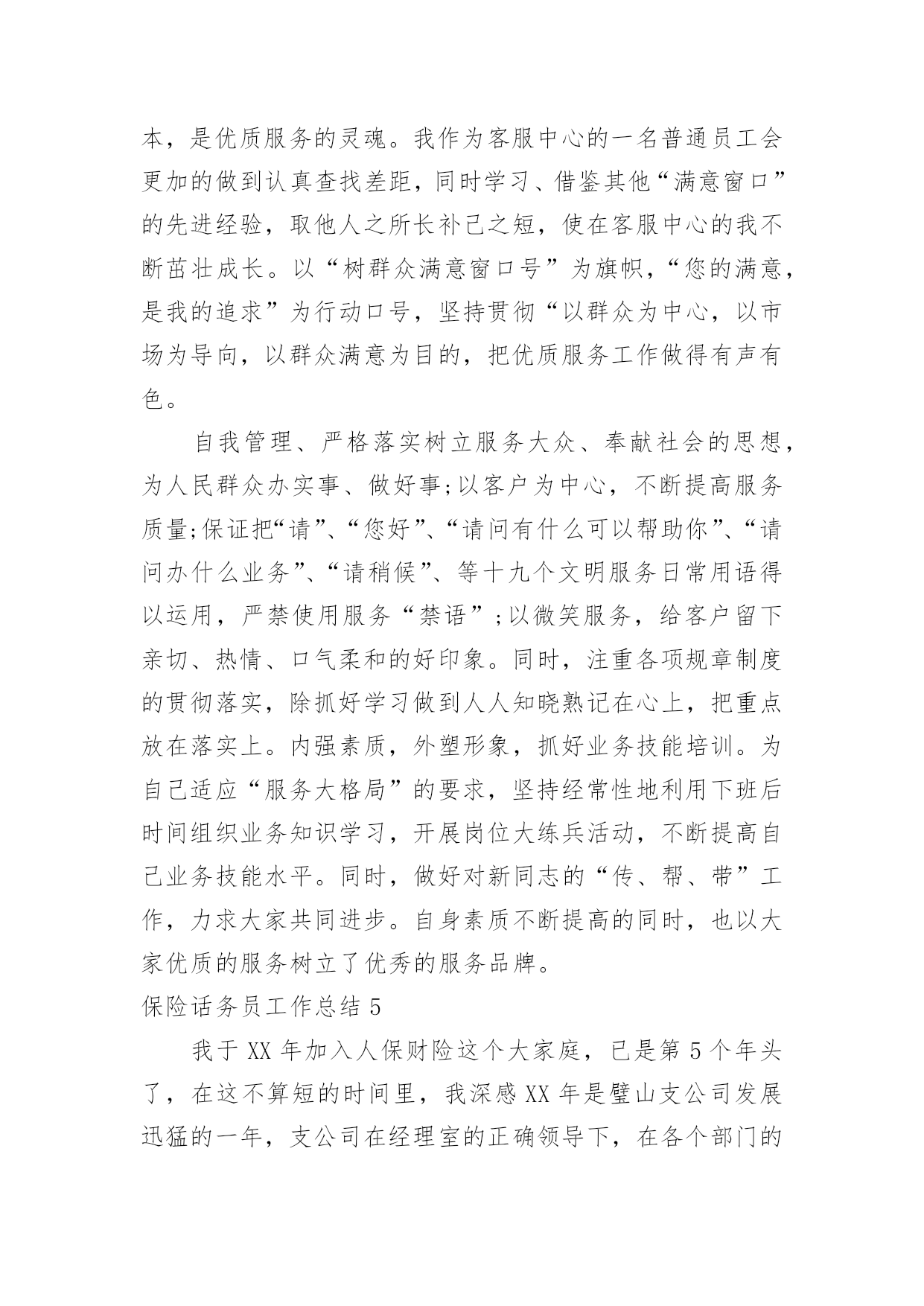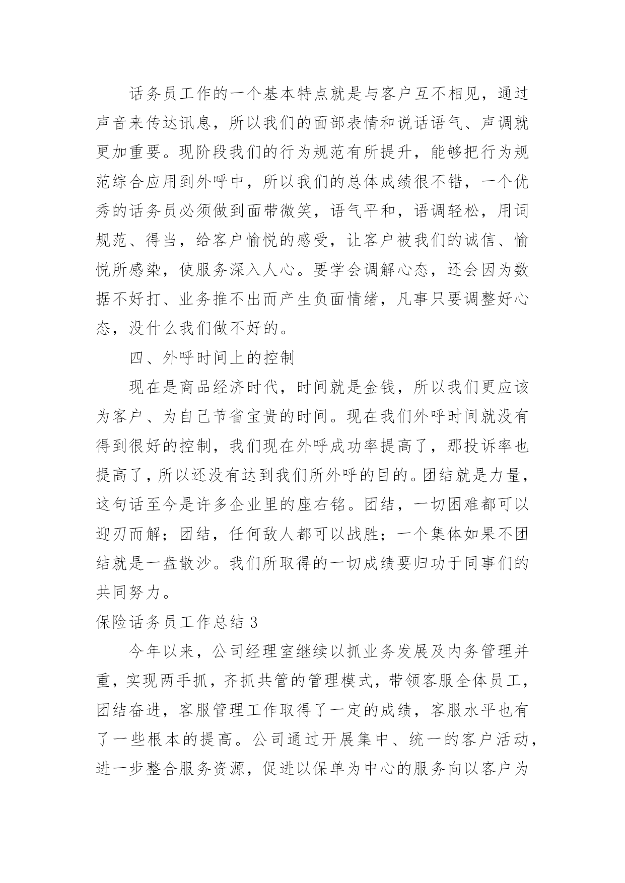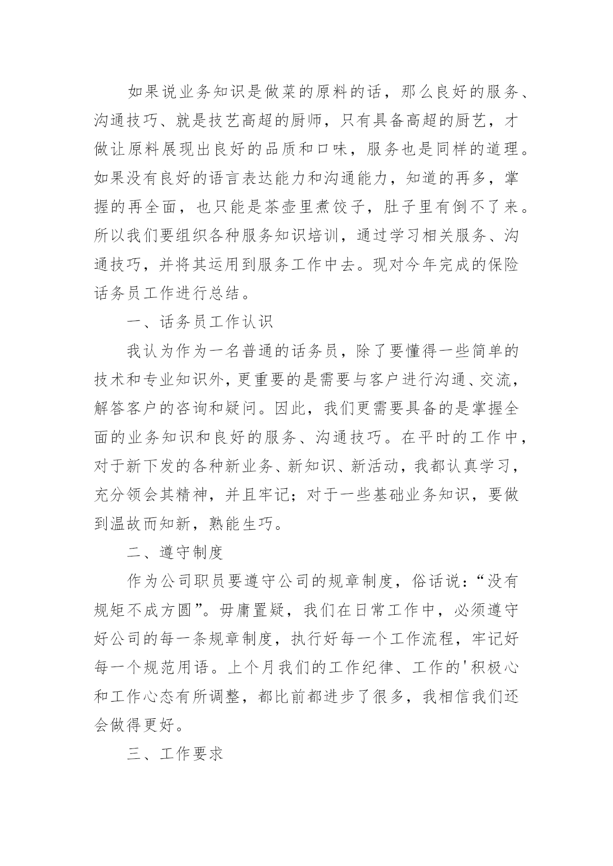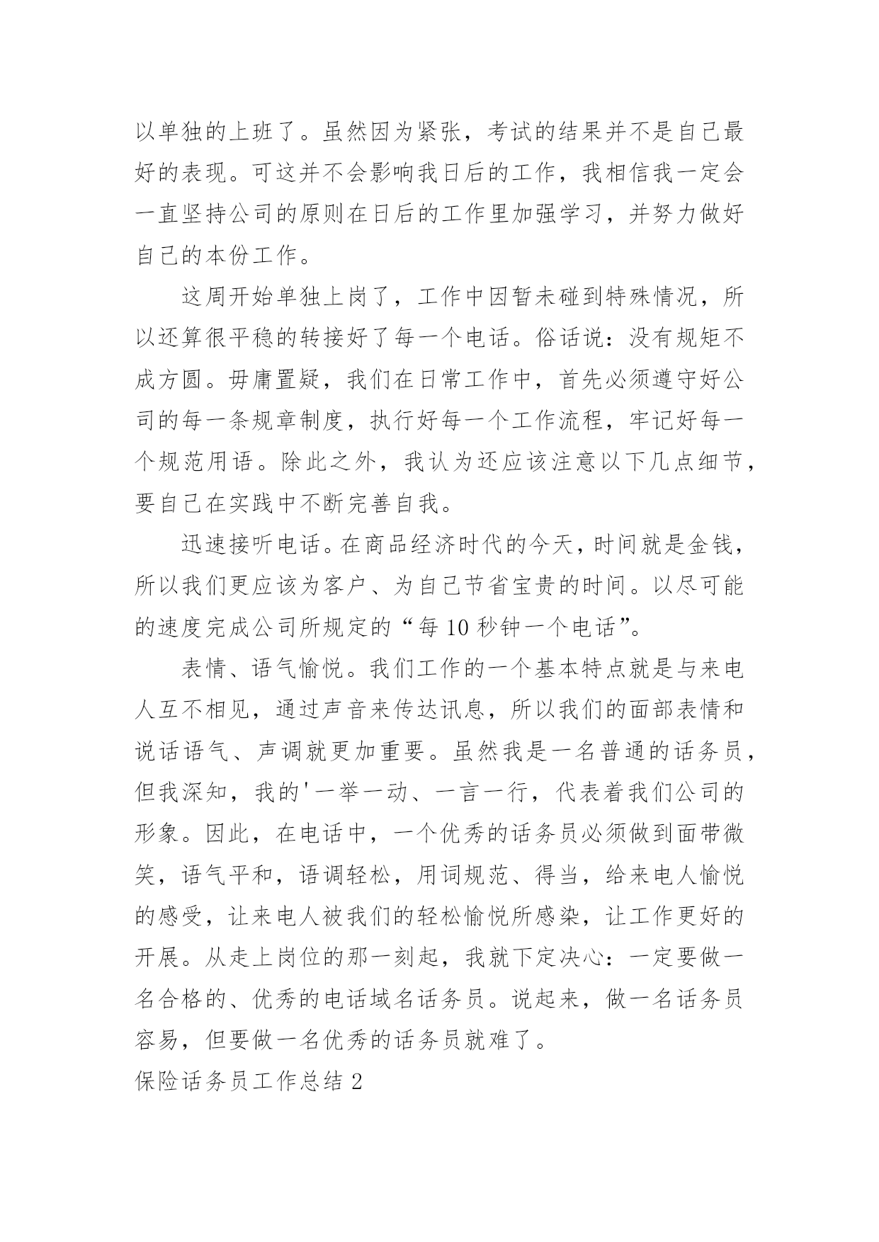 保险话务员工作总结保险话务员工作总结总结在一个时期、一个年度、一个阶段对学习和工作生活等情况加以回顾和分析的一种书面材料,通过它可以正确认识以往学习和工作中的优缺点,不妨坐下来好好写写总结吧。但是却发现不知道该写些什么,下面是小编为大家整理的保险话务员工作总结,欢迎大家分享。保险话务员工作总结1平时几个新同事一起模拟练习的时候,都觉的可以了,不会有问题了。刚开始一坐到电脑前面,一听到电话声响就或多或少的有些许紧张,而一紧张就会有时忘记了及时按下应答主叫,有时候会忘记了及时看下面的温馨提示。还好服务用语及操作没什么问题,不过也因为前面的紧张而影响了操作速度。后面跟新来的同事们交流和老同事们请教时才知道,原来多数同事都有过这样的过渡期,或多或少都会有些紧张的。就像我们班长陈超说的那样,凡事只要调整好心态,没什么我们做不好的。是的,我绝对不会允许自己这么简单的事情都不能做好,相信自己一定能行!后来我试着每次坐电脑前面的时候就深呼一口气,然后调整好心态,慢慢的次数多了,就感觉一切都习惯了,工作程序也就自然而然了。8月1号经过紧张的全体话务员的考试后,我们终于可以单独的上班了。虽然因为紧张,考试的结果并不是自己最好的表现。可这并不会影响我日后的工作,我相信我一定会一直坚持公司的原则在日后的工作里加强学习,并努力做好自己的本份工作。这周开始单独上岗了,工作中因暂未碰到特殊情况,所以还算很平稳的转接好了每一个电话。俗话说:没有规矩不成方圆。毋庸置疑,我们在日常工作中,首先必须遵守好公司的每一条规章制度,执行好每一个工作流程,牢记好每一个规范用语。除此之外,我认为还应该注意以下几点细节,要自己在实践中不断完善自我。迅速接听电话。在商品经济时代的今天,时间就是金钱,所以我们更应该为客户、为自己节省宝贵的时间。以尽可能的速度完成公司所规定的“每10秒钟一个电话”。表情、语气愉悦。我们工作的一个基本特点就是与来电人互不相见,通过声音来传达讯息,所以我们的面部表情和说话语气、声调就更加重要。虽然我是一名普通的话务员,但我深知,我的'一举一动、一言一行,代表着我们公司的形象。因此,在电话中,一个优秀的话务员必须做到面带微笑,语气平和,语调轻松,用词规范、得当,给来电人愉悦的感受,让来电人被我们的轻松愉悦所感染,让工作更好的开展。从走上岗位的那一刻起,我就下定决心:一定要做一名合格的、优秀的电话域名话务员。说起来,做一名话务员容易,但要做一名优秀的话务员就难了。保险话务员工作总结2如果说业务知识是做菜的原料的话,那么良好的服务、沟通技巧、就是技艺高超的厨师,只有具备高超的厨艺,才做让原料展现出良好的品质和口味,服务也是同样的道理。如果没有良好的语言表达能力和沟通能力,知道的再多,掌握的再全面,也只能是茶壶里煮饺子,肚子里有倒不了来。所以我们要组织各种服务知识培训,通过学习相关服务、沟通技巧,并将其运用到服务工作中去。现对今年完成的保险话务员工作进行总结。一、话务员工作认识我认为作为一名普通的话务员,除了要懂得一些简单的技术和专业知识外,更重要的是需要与客户进行沟通、交流,解答客户的咨询和疑问。因此,我们更需要具备的是掌握全面的业务知识和良好的服务、沟通技巧。在平时的工作中,对于新下发的各种新业务、新知识、新活动,我都认真学习,充分领会其精神,并且牢记;对于一些基础业务知识,要做到温故而知新,熟能生巧。二、遵守制度作为公司职员要遵守公司的规章制度,俗话说:“没有规矩不成方圆”。毋庸置疑,我们在日常工作中,必须遵守好公司的每一条规章制度,执行好每一个工作流程,牢记好每一个规范用语。上个月我们的工作纪律、工作的'积极心和工作心态有所调整,都比前都进步了很多,我相信我们还会做得更好。三、工作要求话务员工作的一个基本特点就是与客户互不相见,通过声音来传达讯息,所以我们的面部表情和说话语气、声调就更加重要。现阶段我们的行为规范有所提升,能够把行为规范综合应用到外呼中,所以我们的总体成绩很不错,一个优秀的话务员必须做到面带微笑,语气平和,语调轻松,用词规范、得当,给客户愉悦的感受,让客户被我们的诚信、愉悦所感染,使服务深入人心。要学会调解心态,还会因为数据不好打、业务推不出而产生负面情绪,凡事只要调整好心态,没什么我们做不好的。四、外呼时间上的控制现在是商品经济时代,时间就是金钱,所以我们更应该为客户、为自己节省宝贵的时间。现在我们外呼时间就没有得到很好的控制,我们现在外呼成功率提高了,那投诉率也提高了,所以还没有达到我们所外呼的目的。团结就是力量,这句话至今是许多企业里的座右铭。团结,一切困难都可以迎刃而解;团结,任何敌人都可以战胜;一个集体如果不团结就是一盘散沙。我们所取得的一切成绩要归功于同事们的共同努力。保险话务员工作总结3今年以来,公司经理室继续以抓业务