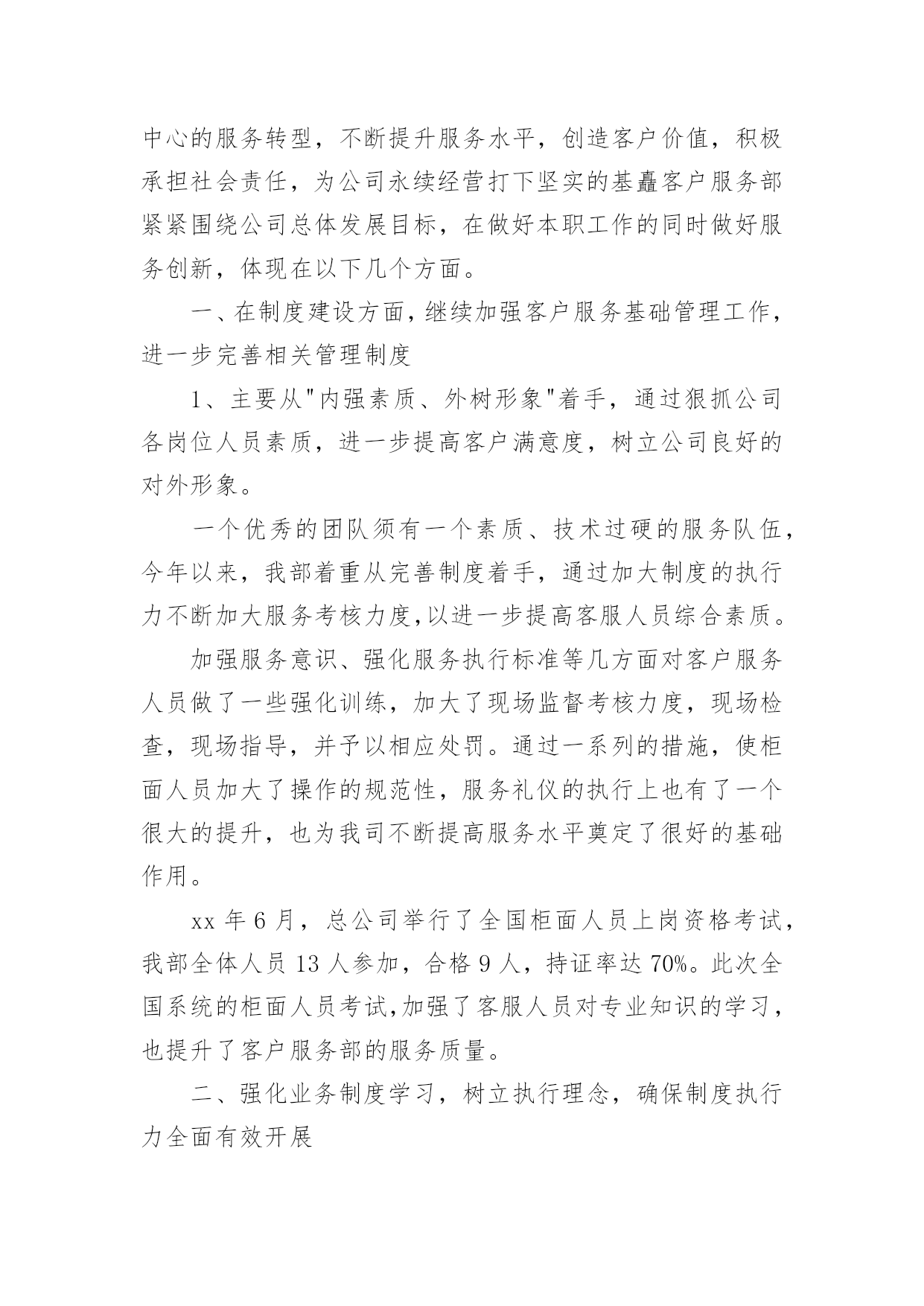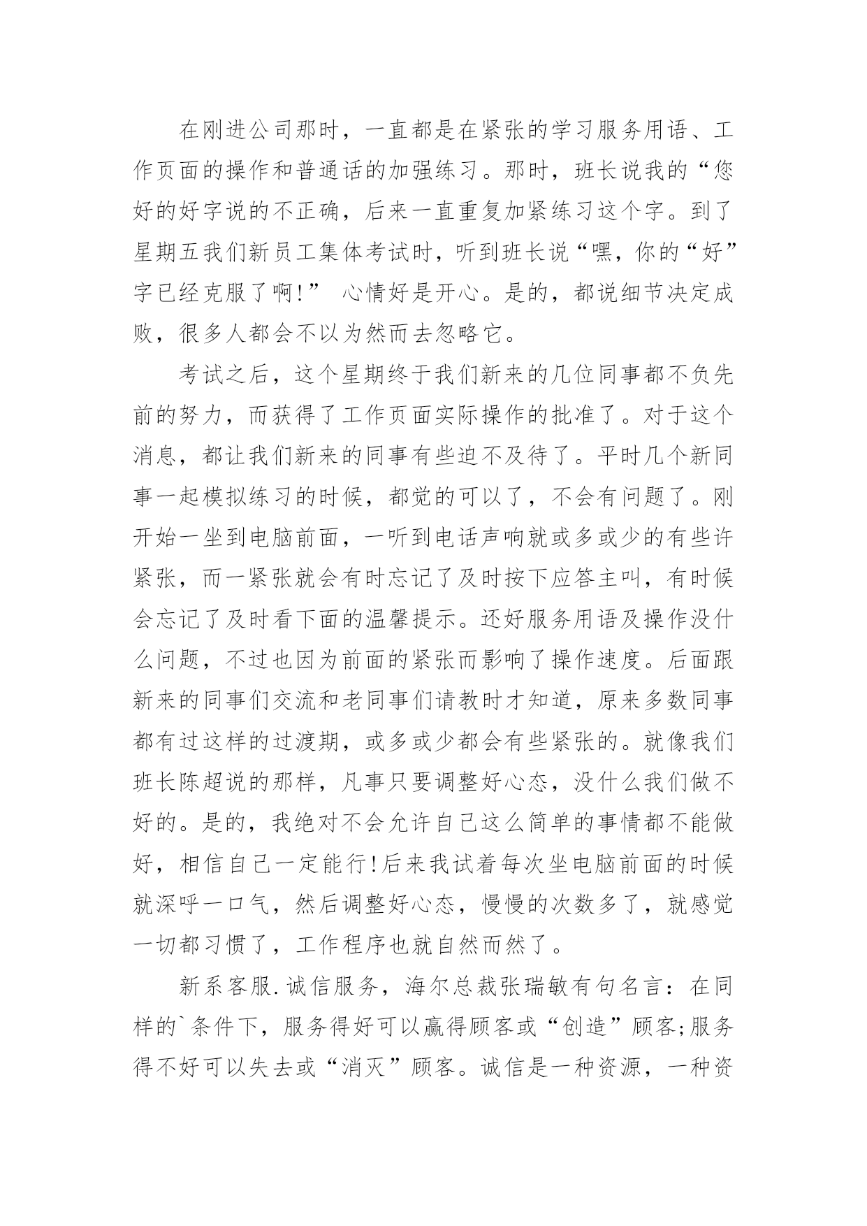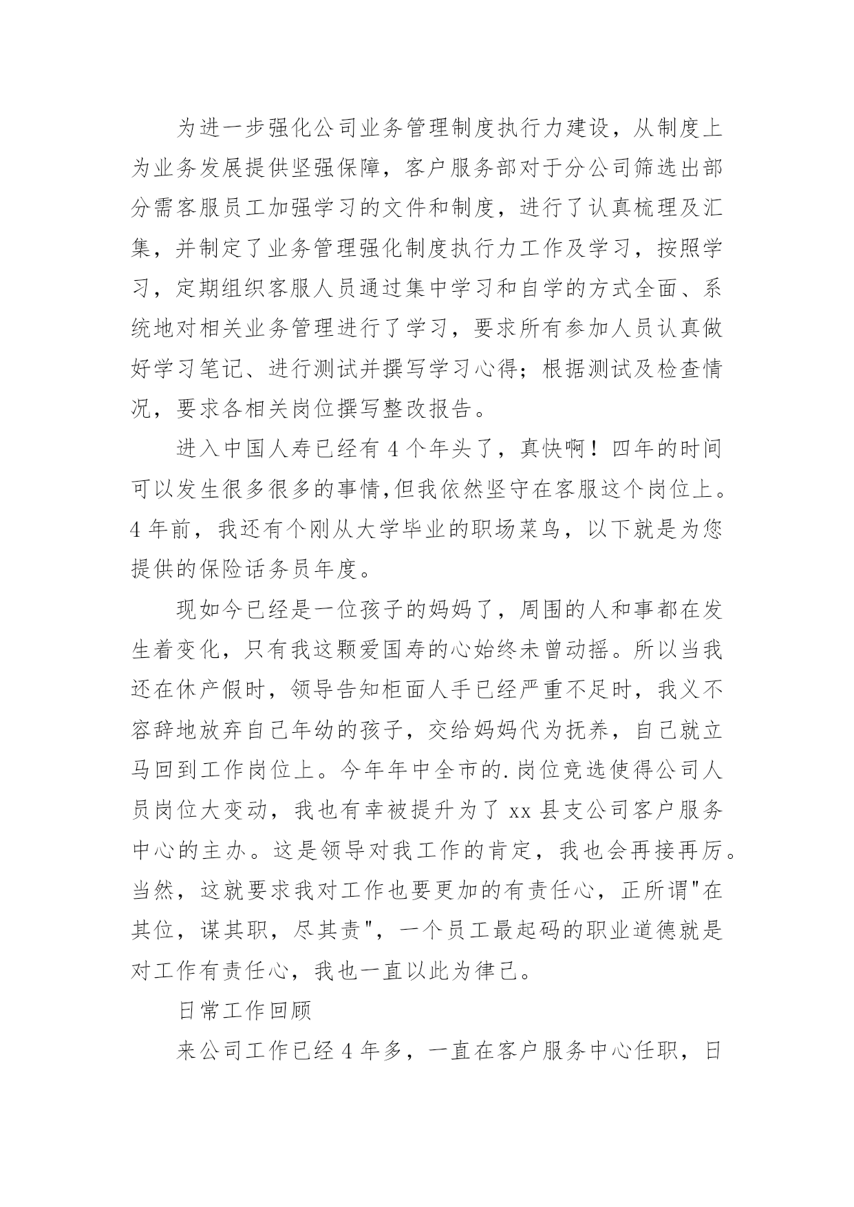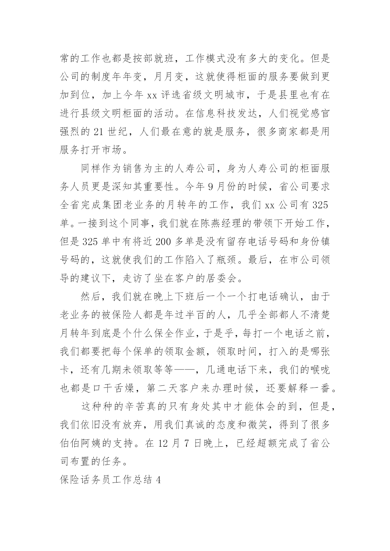 保险话务员工作总结保险话务员工作总结总结在一个时期、一个年度、一个阶段对学习和工作生活等情况加以回顾和分析的一种书面材料,通过它可以正确认识以往学习和工作中的优缺点,不妨坐下来好好写写总结吧。但是却发现不知道该写些什么,下面是小编为大家整理的保险话务员工作总结,欢迎大家分享。保险话务员工作总结1平时几个新同事一起模拟练习的时候,都觉的可以了,不会有问题了。刚开始一坐到电脑前面,一听到电话声响就或多或少的有些许紧张,而一紧张就会有时忘记了及时按下应答主叫,有时候会忘记了及时看下面的温馨提示。还好服务用语及操作没什么问题,不过也因为前面的紧张而影响了操作速度。后面跟新来的同事们交流和老同事们请教时才知道,原来多数同事都有过这样的过渡期,或多或少都会有些紧张的。就像我们班长陈超说的那样,凡事只要调整好心态,没什么我们做不好的。是的,我绝对不会允许自己这么简单的事情都不能做好,相信自己一定能行!后来我试着每次坐电脑前面的时候就深呼一口气,然后调整好心态,慢慢的次数多了,就感觉一切都习惯了,工作程序也就自然而然了。8月1号经过紧张的全体话务员的考试后,我们终于可以单独的上班了。虽然因为紧张,考试的结果并不是自己最好的表现。可这并不会影响我日后的工作,我相信我一定会一直坚持公司的原则在日后的工作里加强学习,并努力做好自己的本份工作。这周开始单独上岗了,工作中因暂未碰到特殊情况,所以还算很平稳的转接好了每一个电话。俗话说:没有规矩不成方圆。毋庸置疑,我们在日常工作中,首先必须遵守好公司的每一条规章制度,执行好每一个工作流程,牢记好每一个规范用语。除此之外,我认为还应该注意以下几点细节,要自己在实践中不断完善自我。迅速接听电话。在商品经济时代的今天,时间就是金钱,所以我们更应该为客户、为自己节省宝贵的时间。以尽可能的速度完成公司所规定的“每10秒钟一个电话”。表情、语气愉悦。我们工作的一个基本特点就是与来电人互不相见,通过声音来传达讯息,所以我们的面部表情和说话语气、声调就更加重要。虽然我是一名普通的话务员,但我深知,我的'一举一动、一言一行,代表着我们公司的形象。因此,在电话中,一个优秀的话务员必须做到面带微笑,语气平和,语调轻松,用词规范、得当,给来电人愉悦的感受,让来电人被我们的轻松愉悦所感染,让工作更好的开展。从走上岗位的那一刻起,我就下定决心:一定要做一名合格的、优秀的电话域名话务员。说起来,做一名话务员容易,但要做一名优秀的话务员就难了。保险话务员工作总结2如果说业务知识是做菜的原料的话,那么良好的服务、沟通技巧、就是技艺高超的厨师,只有具备高超的厨艺,才做让原料展现出良好的品质和口味,服务也是同样的道理。如果没有良好的语言表达能力和沟通能力,知道的再多,掌握的再全面,也只能是茶壶里煮饺子,肚子里有倒不了来。所以我们要组织各种服务知识培训,通过学习相关服务、沟通技巧,并将其运用到服务工作中去。现对今年完成的保险话务员工作进行总结。一、话务员工作认识我认为作为一名普通的话务员,除了要懂得一些简单的技术和专业知识外,更重要的是需要与客户进行沟通、交流,解答客户的咨询和疑问。因此,我们更需要具备的是掌握全面的业务知识和良好的服务、沟通技巧。在平时的工作中,对于新下发的各种新业务、新知识、新活动,我都认真学习,充分领会其精神,并且牢记;对于一些基础业务知识,要做到温故而知新,熟能生巧。二、遵守制度作为公司职员要遵守公司的规章制度,俗话说:“没有规矩不成方圆”。毋庸置疑,我们在日常工作中,必须遵守好公司的每一条规章制度,执行好每一个工作流程,牢记好每一个规范用语。上个月我们的工作纪律、工作的'积极心和工作心态有所调整,都比前都进步了很多,我相信我们还会做得更好。三、工作要求话务员工作的一个基本特点就是与客户互不相见,通过声音来传达讯息,所以我们的面部表情和说话语气、声调就更加重要。现阶段我们的行为规范有所提升,能够把行为规范综合应用到外呼中,所以我们的总体成绩很不错,一个优秀的话务员必须做到面带微笑,语气平和,语调轻松,用词规范、得当,给客户愉悦的感受,让客户被我们的诚信、愉悦所感染,使服务深入人心。要学会调解心态,还会因为数据不好打、业务推不出而产生负面情绪,凡事只要调整好心态,没什么我们做不好的。四、外呼时间上的控制现在是商品经济时代,时间就是金钱,所以我们更应该为客户、为自己节省宝贵的时间。现在我们外呼时间就没有得到很好的控制,我们现在外呼成功率提高了,那投诉率也提高了,所以还没有达到我们所外呼的目的。团结就是力量,这句话至今是许多企业里的座右铭。团结,一切困难都可以迎刃而解;团结,任何敌人都可以战胜;一个集体如果不团结就是一盘散沙。我们所取得的一切成绩要归功于同事们的共同努力。保险话务员工作总结3今年以来,公司经理室继续以抓业务