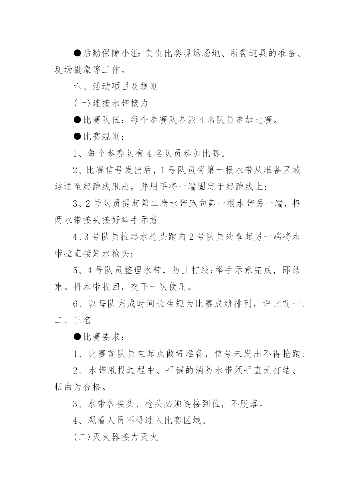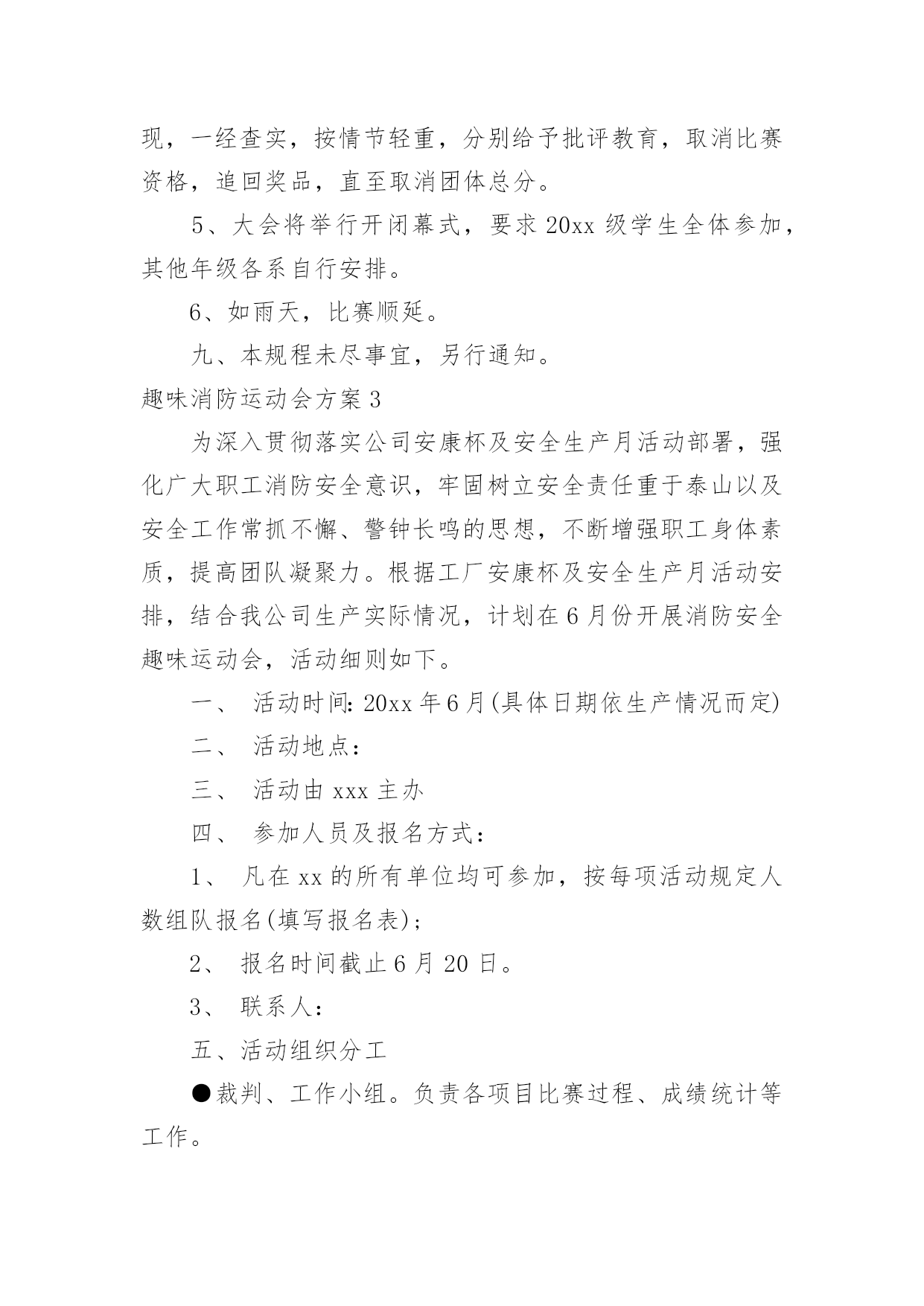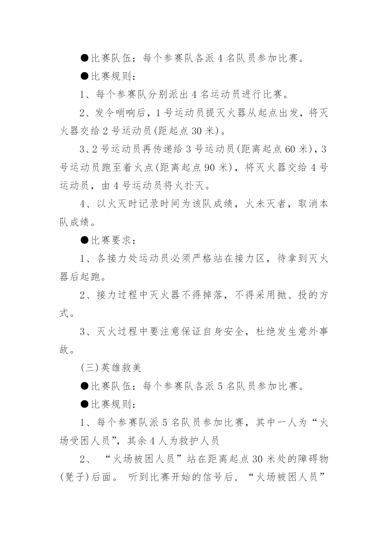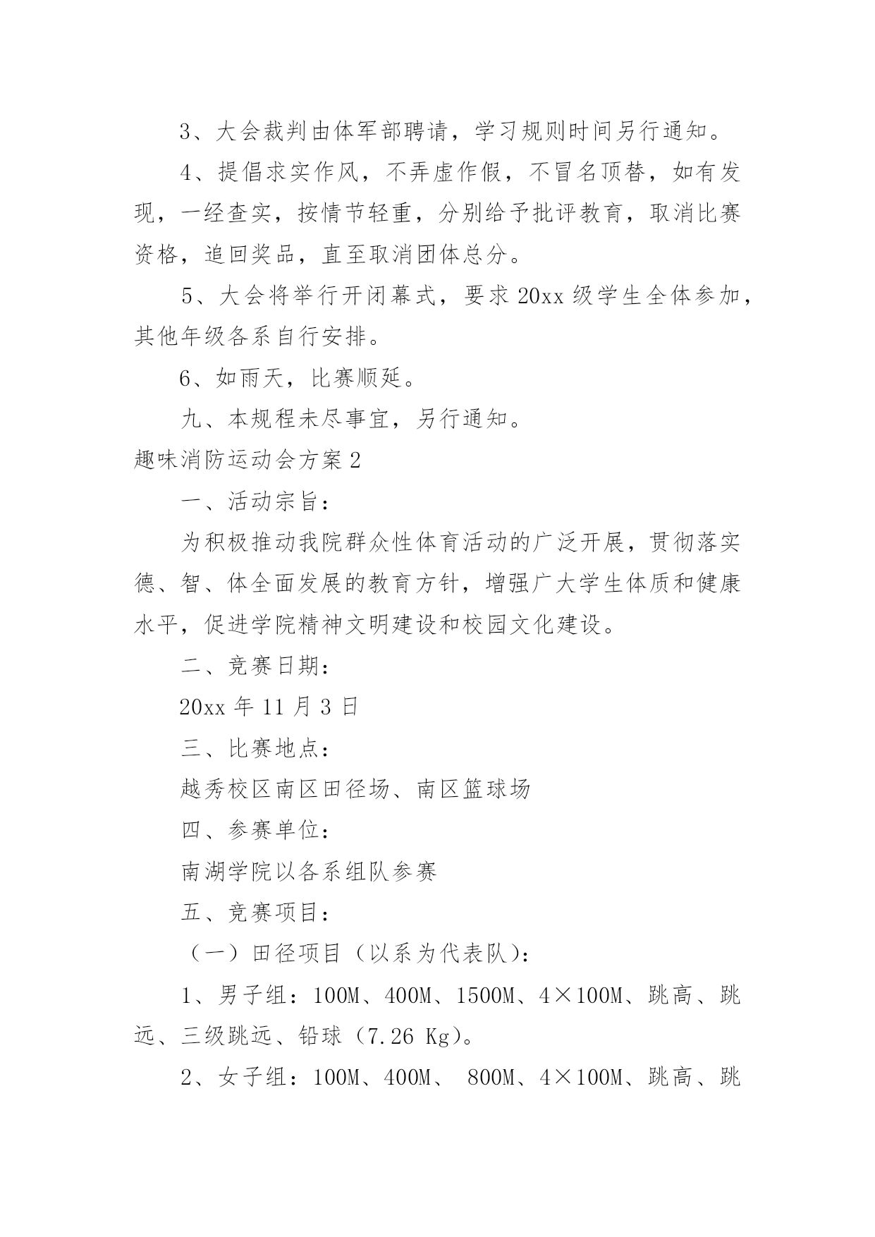 趣味消防运动会方案趣味消防运动会方案为了确定工作或事情顺利开展,预先制定方案是必不可少的,方案一般包括指导思想、主要目标、工作重点、实施步骤、政策措施、具体要求等项目。那么大家知道方案怎么写才规范吗?下面是小编收集整理的趣味消防运动会方案,仅供参考,希望能够帮助到大家。趣味消防运动会方案1一、活动宗旨:为积极推动我院群众性体育活动的广泛开展,贯彻落实德、智、体全面发展的教育方针,增强广大学生体质和健康水平,促进学院精神文明建设和校园文化建设。二、竞赛日期:20xx年11月3日三、比赛地点:越秀校区南区田径场、南区篮球场四、参赛单位:南湖学院以各系组队参赛五、竞赛项目:(一)田径项目(以系为代表队):1、男子组:100M、400M、1500M、4×100M、跳高、跳远、三级跳远、铅球(7.26Kg)。2、女子组:100M、400M、800M、4×100M、跳高、跳远、铅球(4Kg)。(二)集体项目(以班级组队参加):1、广播操比赛2、限时绕八字跳绳3、抱球接力六、竞赛办法及有关规定:(一)田径项目比赛:1、学生以系组成代表队报名参赛。男、女各组每项限报八人,其中20xx级必报五人,每人限报二项(接力项目除外)。2、参加1500米及以上项目,须经过校医院体检,开具健康证明方能报名参赛。3、4×100M接力,由各系组队。4、田径比赛采用国家田径协会最新审定的比赛规则。(二)集体项目比赛:1、学生广播操比赛(第八套),20xx级全体学生参加,以班级为单位参赛。2、限时绕八字跳绳(八人,男女性别不限,以班级为单位参赛)。3、抱球接力(三男三女,以班级为单位参赛)。七、录取名次和奖励办法:1、田径比赛男、女组各单项均取前八名,给予物质奖励。只有八名或不足八名报名参赛,录取时则减少一名,只有一名参赛,只计成绩不计名次,破记录承认。2、田径比赛各组各单项名次按9、7、6、5、4、3、2、1计分;4×100M各系组队取前四名,加倍计分,名次并列得分平分。破校最高记录加10分,破院田径运动会记录加3分。一名运动员或一个队无论破几次记录,只加破最高记录分,不重复加分。3、田径比赛均取男子组团体总分前三名,女子组团体总分前三名和男女团体总分前三名。如遇两队或两队以上总分相等,按破校最高记录多者名次列前,如再相等,按破校运动会记录多者名次列前;再相等,按第一名多者名次列前,以此类推。4、集体项目以班级为单位参赛,均取前八名,广播操比赛成绩和平时做操成绩综合评定。5、获体育道德风尚奖两名、集体项目比赛前八名的单位均给予奖励,破校最高记录另行奖励。6、以各系为单位设立体育道德风尚奖(评比条件另附)。八、报名日期及要求:1、报名表一式二份,一份交纸质表,另一份交电子表,纸质报名表务必于10月23日12:00—13:30分交至南湖学院科工楼一楼大厅。2、报名表按格式填写,字迹端正清楚,一经上报不得更改,号码由大会统一编制。3、大会裁判由体军部聘请,学习规则时间另行通知。4、提倡求实作风,不弄虚作假,不冒名顶替,如有发现,一经查实,按情节轻重,分别给予批评教育,取消比赛资格,追回奖品,直至取消团体总分。5、大会将举行开闭幕式,要求20xx级学生全体参加,其他年级各系自行安排。6、如雨天,比赛顺延。九、本规程未尽事宜,另行通知。趣味消防运动会方案2一、活动宗旨:为积极推动我院群众性体育活动的广泛开展,贯彻落实德、智、体全面发展的教育方针,增强广大学生体质和健康水平,促进学院精神文明建设和校园文化建设。二、竞赛日期:20xx年11月3日三、比赛地点:越秀校区南区田径场、南区篮球场四、参赛单位:南湖学院以各系组队参赛五、竞赛项目:(一)田径项目(以系为代表队):1、男子组:100M、400M、1500M、4×100M、跳高、跳远、三级跳远、铅球(7.26Kg)。2、女子组:100M、400M、800M、4×100M、跳高、跳远、铅球(4Kg)。(二)集体项目(以班级组队参加):1、广播操比赛2、限时绕八字跳绳3、抱球接力六、竞赛办法及有关规定:(一)田径项目比赛:1、学生以系组成代表队报名参赛。男、女各组每项限报八人,其中20xx级必报五人,每人限报二项(接力项目除外)。2、参加1500米及以上项目,须经过校医院体检,开具健康证明方能报名参赛。3、4×100M接力,由各系组队。4、田径比赛采用国家田径协会最新审定的比赛规则。(二)集体项目比赛:1、学生广播操比赛(第八套),20xx级全体学生参加,以班级为单位参赛。2、限时绕八字跳绳(八人,男女性别不限,以班级为单位参赛)。3、抱球接力(三男三女,以班级为单位参赛)。七、录取名次和奖励办法:1、田径比赛男、女组各单项均取前八名,给予物质奖励。只有八名或不足八名报名参赛,录取时则减少一名,只有一名参赛,只计成绩不计名