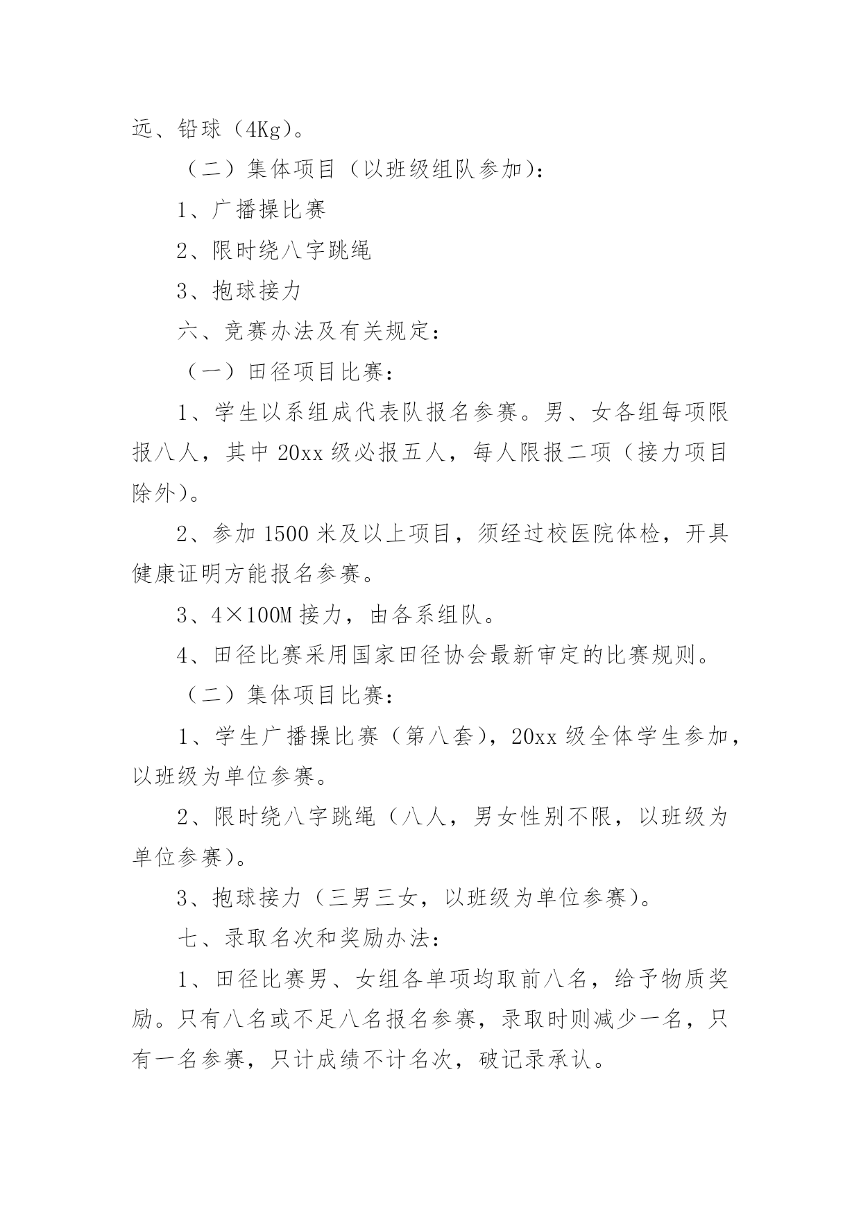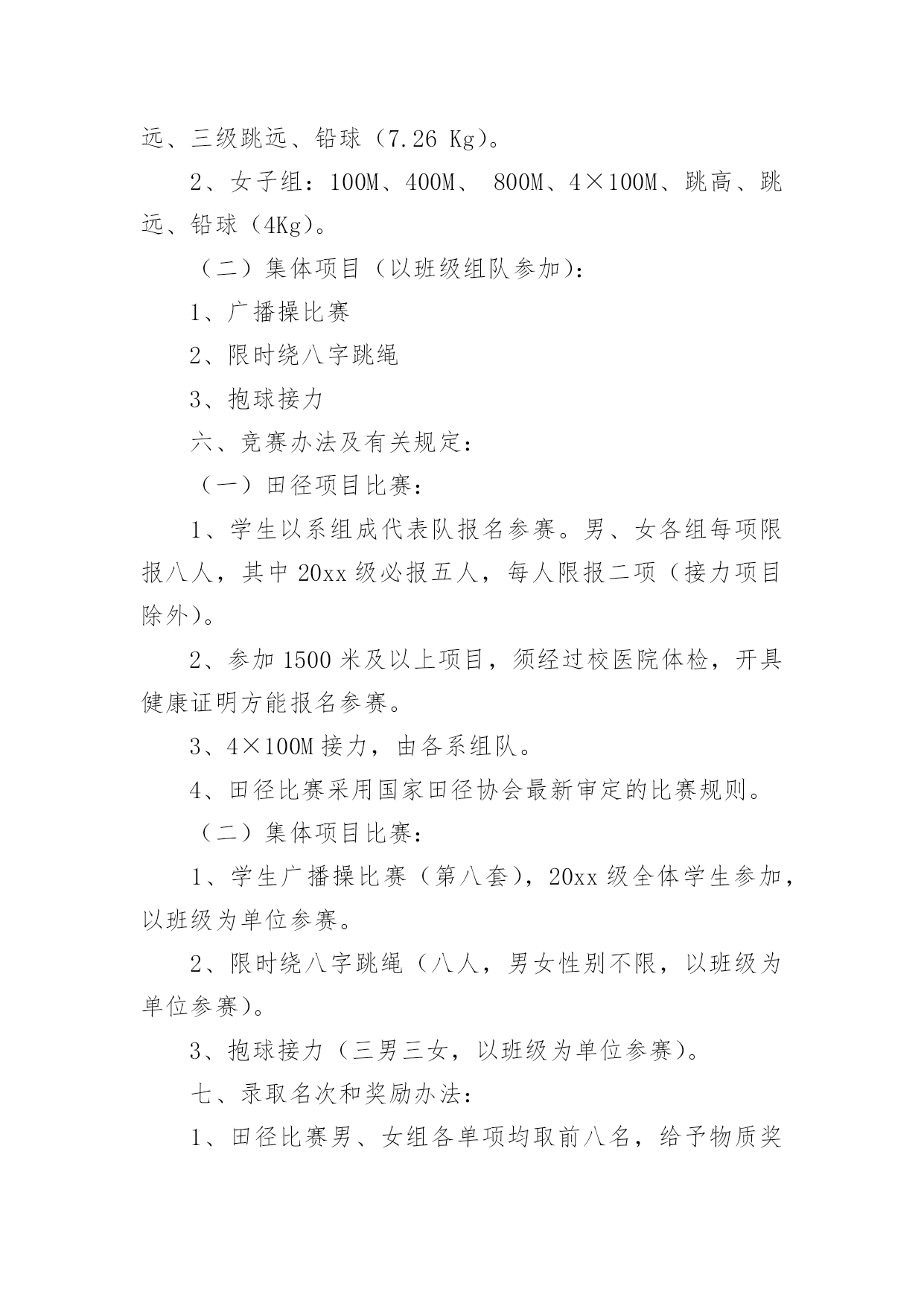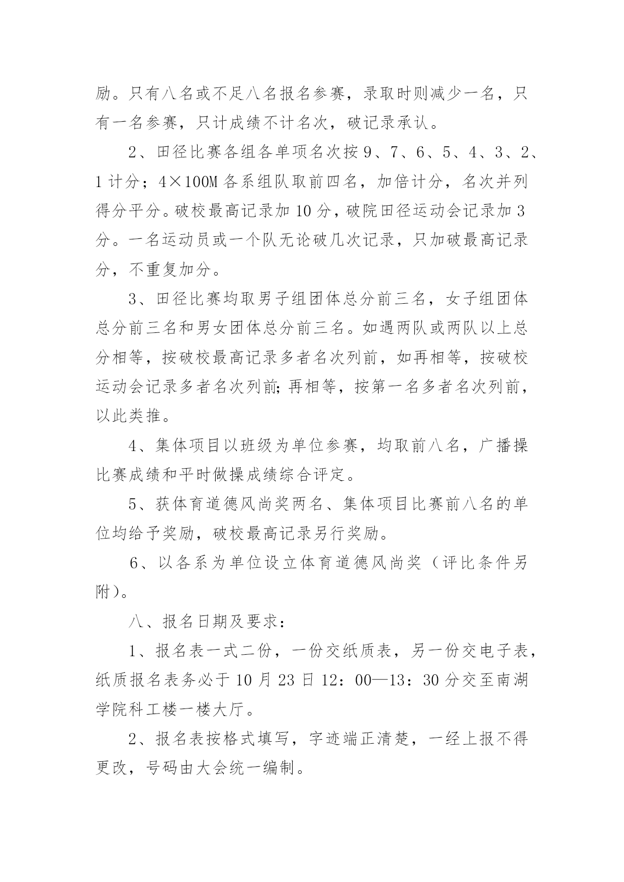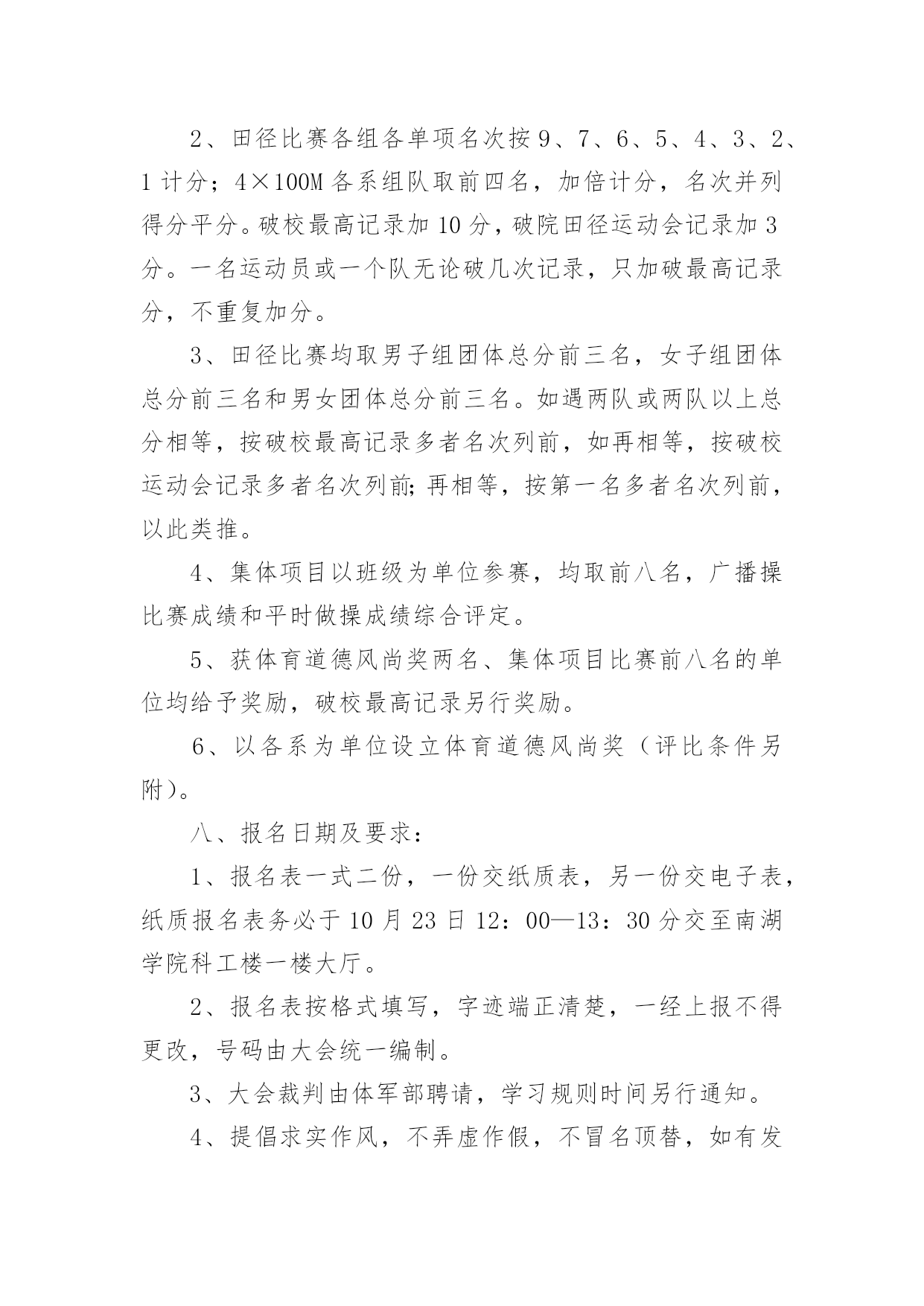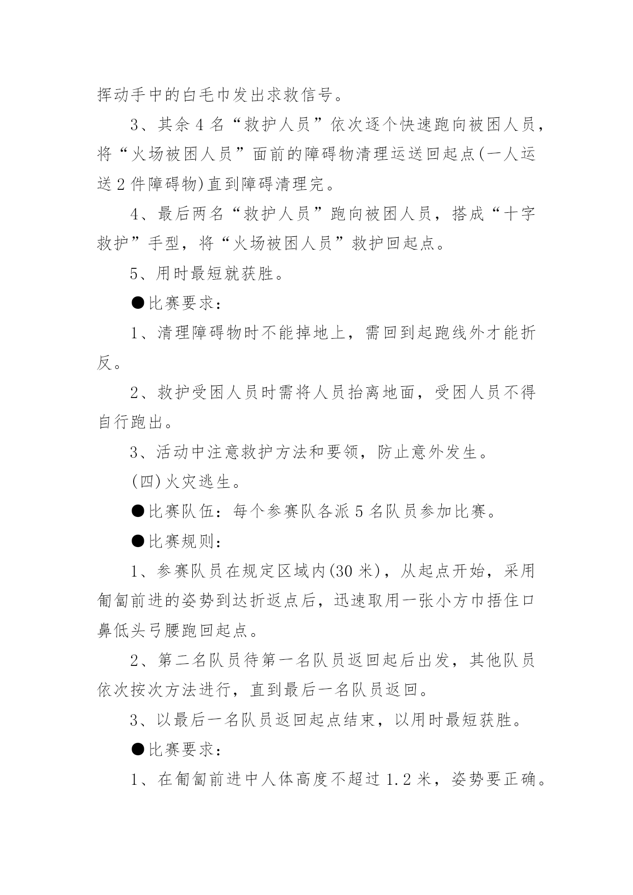 趣味消防运动会方案趣味消防运动会方案为了确定工作或事情顺利开展,预先制定方案是必不可少的,方案一般包括指导思想、主要目标、工作重点、实施步骤、政策措施、具体要求等项目。那么大家知道方案怎么写才规范吗?下面是小编收集整理的趣味消防运动会方案,仅供参考,希望能够帮助到大家。趣味消防运动会方案1一、活动宗旨:为积极推动我院群众性体育活动的广泛开展,贯彻落实德、智、体全面发展的教育方针,增强广大学生体质和健康水平,促进学院精神文明建设和校园文化建设。二、竞赛日期:20xx年11月3日三、比赛地点:越秀校区南区田径场、南区篮球场四、参赛单位:南湖学院以各系组队参赛五、竞赛项目:(一)田径项目(以系为代表队):1、男子组:100M、400M、1500M、4×100M、跳高、跳远、三级跳远、铅球(7.26Kg)。2、女子组:100M、400M、800M、4×100M、跳高、跳远、铅球(4Kg)。(二)集体项目(以班级组队参加):1、广播操比赛2、限时绕八字跳绳3、抱球接力六、竞赛办法及有关规定:(一)田径项目比赛:1、学生以系组成代表队报名参赛。男、女各组每项限报八人,其中20xx级必报五人,每人限报二项(接力项目除外)。2、参加1500米及以上项目,须经过校医院体检,开具健康证明方能报名参赛。3、4×100M接力,由各系组队。4、田径比赛采用国家田径协会最新审定的比赛规则。(二)集体项目比赛:1、学生广播操比赛(第八套),20xx级全体学生参加,以班级为单位参赛。2、限时绕八字跳绳(八人,男女性别不限,以班级为单位参赛)。3、抱球接力(三男三女,以班级为单位参赛)。七、录取名次和奖励办法:1、田径比赛男、女组各单项均取前八名,给予物质奖励。只有八名或不足八名报名参赛,录取时则减少一名,只有一名参赛,只计成绩不计名次,破记录承认。2、田径比赛各组各单项名次按9、7、6、5、4、3、2、1计分;4×100M各系组队取前四名,加倍计分,名次并列得分平分。破校最高记录加10分,破院田径运动会记录加3分。一名运动员或一个队无论破几次记录,只加破最高记录分,不重复加分。3、田径比赛均取男子组团体总分前三名,女子组团体总分前三名和男女团体总分前三名。如遇两队或两队以上总分相等,按破校最高记录多者名次列前,如再相等,按破校运动会记录多者名次列前;再相等,按第一名多者名次列前,以此类推。4、集体项目以班级为单位参赛,均取前八名,广播操比赛成绩和平时做操成绩综合评定。5、获体育道德风尚奖两名、集体项目比赛前八名的单位均给予奖励,破校最高记录另行奖励。6、以各系为单位设立体育道德风尚奖(评比条件另附)。八、报名日期及要求:1、报名表一式二份,一份交纸质表,另一份交电子表,纸质报名表务必于10月23日12:00—13:30分交至南湖学院科工楼一楼大厅。2、报名表按格式填写,字迹端正清楚,一经上报不得更改,号码由大会统一编制。3、大会裁判由体军部聘请,学习规则时间另行通知。4、提倡求实作风,不弄虚作假,不冒名顶替,如有发现,一经查实,按情节轻重,分别给予批评教育,取消比赛资格,追回奖品,直至取消团体总分。5、大会将举行开闭幕式,要求20xx级学生全体参加,其他年级各系自行安排。6、如雨天,比赛顺延。九、本规程未尽事宜,另行通知。趣味消防运动会方案2一、活动宗旨:为积极推动我院群众性体育活动的广泛开展,贯彻落实德、智、体全面发展的教育方针,增强广大学生体质和健康水平,促进学院精神文明建设和校园文化建设。二、竞赛日期:20xx年11月3日三、比赛地点:越秀校区南区田径场、南区篮球场四、参赛单位:南湖学院以各系组队参赛五、竞赛项目:(一)田径项目(以系为代表队):1、男子组:100M、400M、1500M、4×100M、跳高、跳远、三级跳远、铅球(7.26Kg)。2、女子组:100M、400M、800M、4×100M、跳高、跳远、铅球(4Kg)。(二)集体项目(以班级组队参加):1、广播操比赛2、限时绕八字跳绳3、抱球接力六、竞赛办法及有关规定:(一)田径项目比赛:1、学生以系组成代表队报名参赛。男、女各组每项限报八人,其中20xx级必报五人,每人限报二项(接力项目除外)。2、参加1500米及以上项目,须经过校医院体检,开具健康证明方能报名参赛。3、4×100M接力,由各系组队。4、田径比赛采用国家田径协会最新审定的比赛规则。(二)集体项目比赛:1、学生广播操比赛(第八套),20xx级全体学生参加,以班级为单位参赛。2、限时绕八字跳绳(八人,男女性别不限,以班级为单位参赛)。3、抱球接力(三男三女,以班级为单位参赛)。七、录取名次和奖励办法:1、田径比赛男、女组各单项均取前八名,给予物质奖励。只有八名或不足八名报名参赛,录取时则减少一名,只有一名参赛,只计成绩不计名