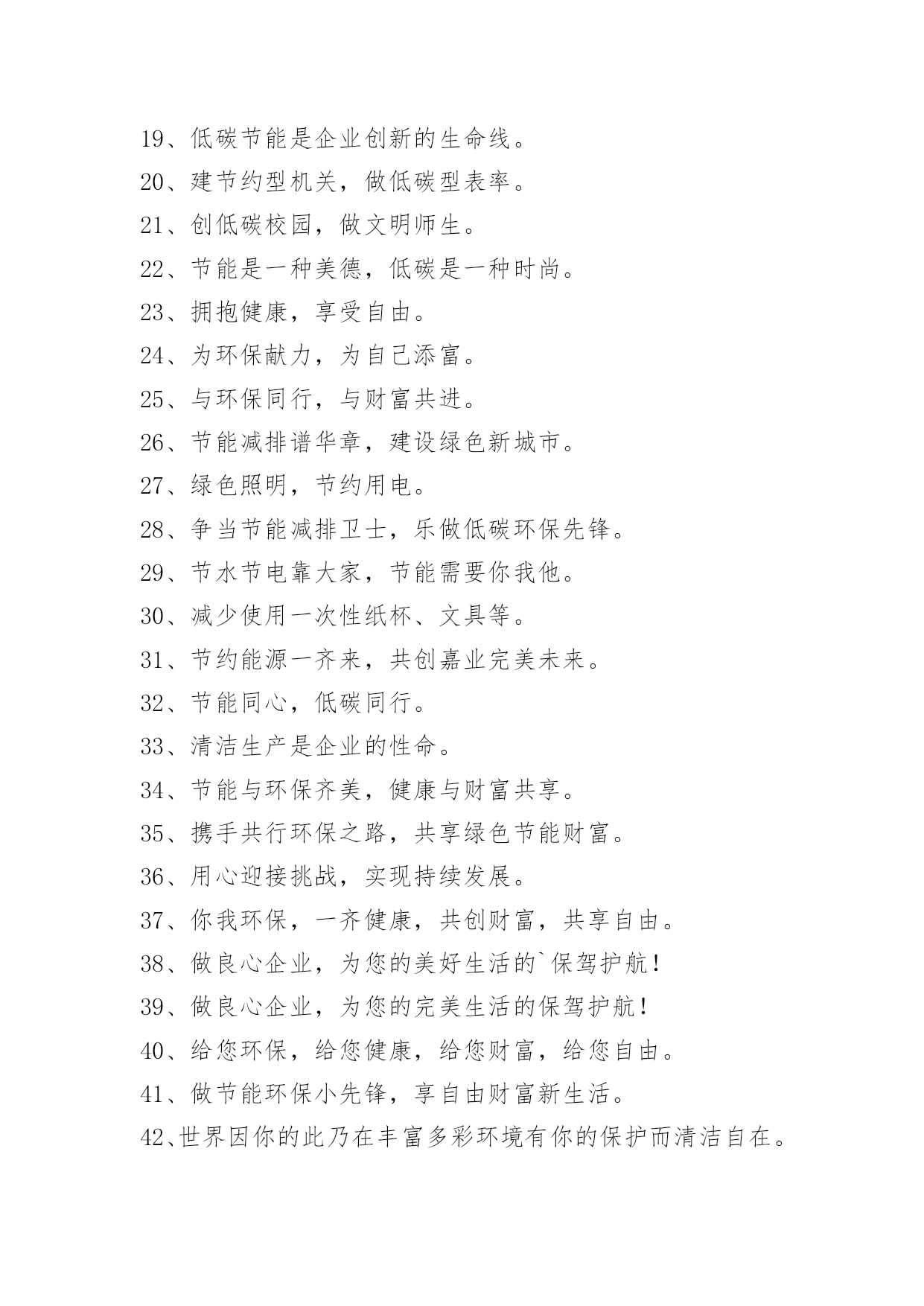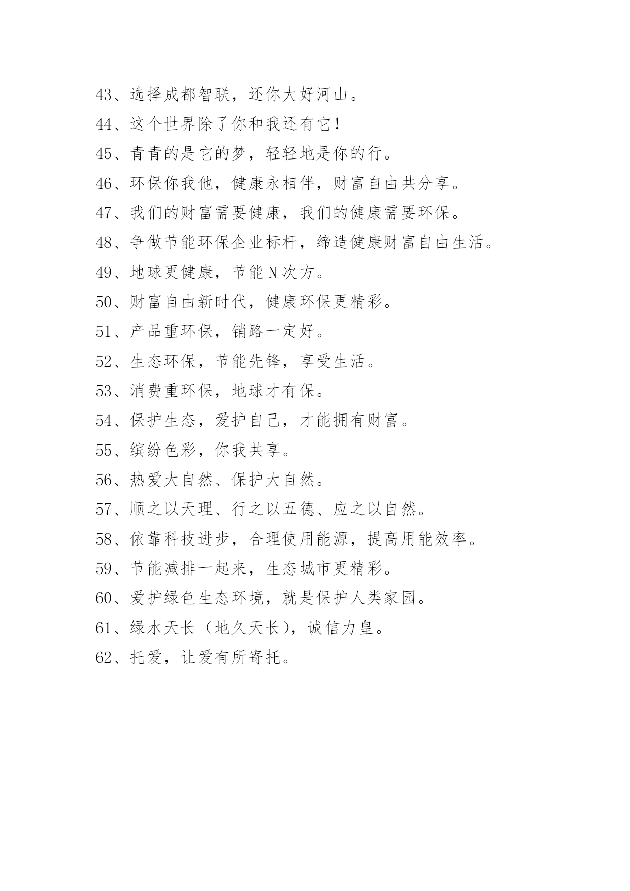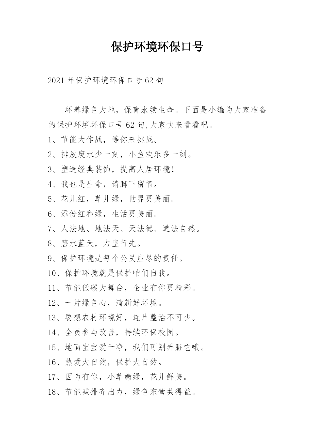 保护环境环保口号2021年保护环境环保口号62句环养绿色大地,保育永续生命。下面是小编为大家准备的保护环境环保口号62句,大家快来看看吧。1、节能大作战,等你来挑战。2、排放废水少一刻,小鱼欢乐多一刻。3、塑造经典装饰,提高人居环境!4、我也是生命,请脚下留情。5、花儿红,草儿绿,世界更美丽。6、添份红和绿,生活更美丽。7、人法地、地法天、天法德、道法自然。8、碧水蓝天,力皇行先。9、保护环境是每个公民应尽的责任。10、保护环境就是保护咱们自我。11、节能低碳大舞台,企业有你更精彩。12、一片绿色心,清新好环境。13、要想农村环境好,连片整治不可少。14、全员参与改善,持续环保校园。15、地面宝宝爱干净,我们可别弄脏它哦。16、热爱大自然,保护大自然。17、因为有你,小草嫩绿,花儿鲜美。18、节能减排齐出力,绿色东营共得益。19、低碳节能是企业创新的生命线。20、建节约型机关,做低碳型表率。21、创低碳校园,做文明师生。22、节能是一种美德,低碳是一种时尚。23、拥抱健康,享受自由。24、为环保献力,为自己添富。25、与环保同行,与财富共进。26、节能减排谱华章,建设绿色新城市。27、绿色照明,节约用电。28、争当节能减排卫士,乐做低碳环保先锋。29、节水节电靠大家,节能需要你我他。30、减少使用一次性纸杯、文具等。31、节约能源一齐来,共创嘉业完美未来。32、节能同心,低碳同行。33、清洁生产是企业的性命。34、节能与环保齐美,健康与财富共享。35、携手共行环保之路,共享绿色节能财富。36、用心迎接挑战,实现持续发展。37、你我环保,一齐健康,共创财富,共享自由。38、做良心企业,为您的美好生活的`保驾护航!39、做良心企业,为您的完美生活的保驾护航!40、给您环保,给您健康,给您财富,给您自由。41、做节能环保小先锋,享自由财富新生活。42、世界因你的此乃在丰富多彩环境有你的保护而清洁自在。43、选择成都智联,还你大好河山。44、这个世界除了你和我还有它!45、青青的是它的梦,轻轻地是你的行。46、环保你我他,健康永相伴,财富自由共分享。47、我们的财富需要健康,我们的健康需要环保。48、争做节能环保企业标杆,缔造健康财富自由生活。49、地球更健康,节能N次方。50、财富自由新时代,健康环保更精彩。51、产品重环保,销路一定好。52、生态环保,节能先锋,享受生活。53、消费重环保,地球才有保。54、保护生态,爱护自己,才能拥有财富。55、缤纷色彩,你我共享。56、热爱大自然、保护大自然。57、顺之以天理、行之以五德、应之以自然。58、依靠科技进步,合理使用能源,提高用能效率。59、节能减排一起来,生态城市更精彩。60、爱护绿色生态环境,就是保护人类家园。61、绿水天长(地久天长),诚信力皇。62、托爱,让爱有所寄托。