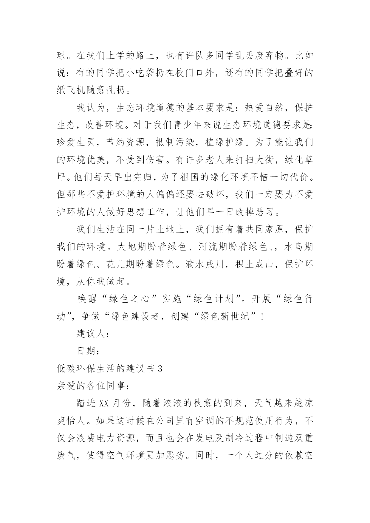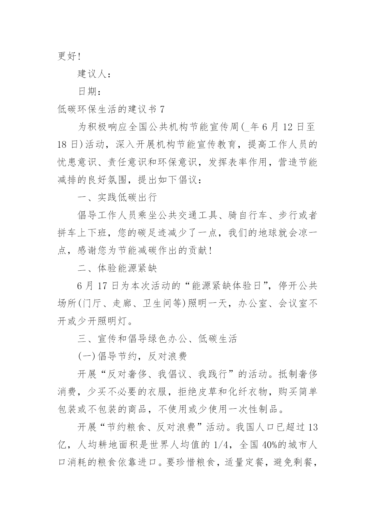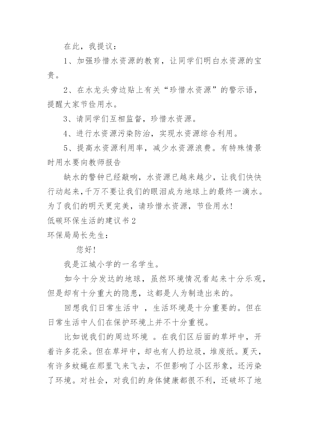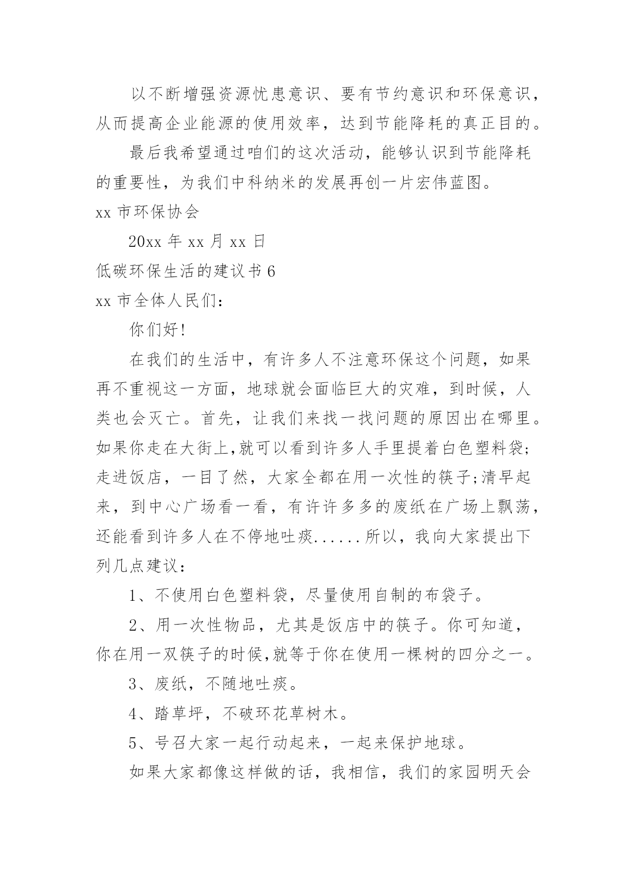 低碳环保生活的建议书低碳环保生活的建议书10篇在我们平凡的日常里,建议书与我们的生活息息相关,我们在写建议书时要分条列出建议的具体内容。来参考自己需要的建议书吧!下面是小编为大家收集的低碳环保生活的建议书,欢迎大家分享。低碳环保生活的建议书1尊敬的陈校长:您好!我们的学校美丽和谐,可是也有一些不良行为存在,浪费水就是其中一个。水是生命之源,生命之本。正是因为有了水,世上万物才能生存,世界才丰富多彩,千姿百态。水是多么重要啊!可是有些同学却随意浪费。经过观察,我发现了一些现象:有些同学经常大开水龙头,让水白花花地往外流;用完水后也不关紧水龙头,任由水龙头“哭泣”;有时上卫生间,常常能看到有些同学开着水玩耍,像过泼水节似的,把水乱泼,不仅仅使卫生间里一团糟,还浪费了宝贵的水资源。据统计,全国660座城市中有400多座城市缺水,三分之二的城市存在供水不足,全国城市年缺水量为60亿立方米左右,其中缺水比较严重的城市有110个。节水为荣——随时关上水龙头,别让水空流。在此,我提议:1、加强珍惜水资源的教育,让同学们明白水资源的宝贵。2、在水龙头旁边贴上有关“珍惜水资源”的警示语,提醒大家节俭用水。3、请同学们互相监督,珍惜水资源。4、进行水资源污染防治,实现水资源综合利用。5、提高水资源利用率,减少水资源浪费。有特殊情景时用水要向教师报告缺水的警钟已经敲响,水资源已越来越少,让我们快快行动起来,千万不要让我们的眼泪成为地球上的最终一滴水。为了我们的明天更完美,请珍惜水资源,节俭用水!低碳环保生活的建议书2环保局局长先生:您好!我是江城小学的一名学生。如今十分发达的地球,虽然环境情况看起来十分乐观,但是却有十分重大的隐患,这都是人为制造出来的。回想我们日常生活中,生活环境是十分重要的。但在日常生活中人们在保护环境上并不十分重视。比如说我们的周边环境。在我们区后面的草坪中,开着许多花朵。但在草坪中,却也有人扔垃圾,堆废纸。夏天,有许多蚊蝇在那里飞来飞去,不但影响了小区形象,还污染了环境。对社会,对我们的身体健康都很不利,还破坏了地球。在我们上学的路上,也有许队多同学乱丢废弃物。比如说:有的同学把小吃袋扔在校门口外,还有的同学把叠好的纸飞机随意乱扔。我认为,生态环境道德的基本要求是:热爱自然,保护生态,改善环境。对于我们青少年来说生态环境道德要求是:珍爱生灵,节约资源,抵制污染,植绿护绿。为了能让我们的环境优美,不受到伤害。有许多老人来打扫大街,绿化草坪。他们每天早出完归,为了祖国的绿化环境不惜一切代价。但那些不爱护环境的人偏偏还要去破坏,我们一定要为不爱护环境的人做好思想工作,让他们早一日改掉恶习。我们生活在同一片土地上,我们拥有着共同家原,保护我们的环境。大地期盼着绿色、河流期盼着绿色、,水鸟期盼着绿色、花儿期盼着绿色。滴水成川,积土成山,保护环境,从你我做起。唤醒“绿色之心”实施“绿色计划”。开展“绿色行动”,争做“绿色建设者,创建“绿色新世纪”!建议人:日期:低碳环保生活的建议书3亲爱的各位同事:踏进XX月份,随着浓浓的秋意的到来,天气越来越凉爽怡人。如果这时候在公司里有空调的不规范使用行为,不仅会浪费电力资源,而且也会在发电及制冷过程中制造双重废气,使得空气环境更加恶劣。同时,一个人过分的依赖空调抗热,而且又在干燥的气温环境下,不仅会降低自身的环境适应能力,也会降低自身的免疫力及身体素质,容易引起呼吸道感染方面的疾病(感冒、发烧等)。我们作为新时代的领先者,要切实担负起节约能源与环境保护的责任,要培养良好的社会公德,同时也要提高自身身体素质。国家出台的环保标准中空调使用的温度范围应该为0度及0度以下、30度及30度以上。鉴于现时天气已经比较适宜,我们提倡从XX月XX日开始,公司空调制冷功能严格停止使用。客服部办公室由于没有窗户,可以开启空调的换气功能,其他办公区域全部停止使用空调。办公期间,大家都把窗户打开,呼吸新鲜空气,充分与大自然接触!勤俭节约是中华民族的传统美德,节约能源、节约用电是每一位公民的社会责任。在创建节约型社会的今天,我们真诚的希望每一位员工积极行动起来,齐心协力、统一思想,从身边小事做起,提倡节能环保,低碳新生活,节约每一度电,共同为公司的建设发展尽最大努力!行政人事部20xx年XX月XX日低碳环保生活的建议书4生活作息时所耗用的能量要力减少,从而减低碳,特别是二氧化碳的排放量,从而减少对大大气的污染,减缓生态恶化的生活就是我们常说的“低碳生活”。换句话说,低碳生活就是更低能量、更低消耗的生活方式,还原其淳朴的进行人与自然的交流。真正做到低碳生活其实很简单,只要注意4个节:节电、节水、节油、节气就可以了。我们要养成低碳生活习惯,下面我给大家介绍几点:1.每天的淘米水可以用来洗手、洗脸、洗去含油污的餐具、擦家具、