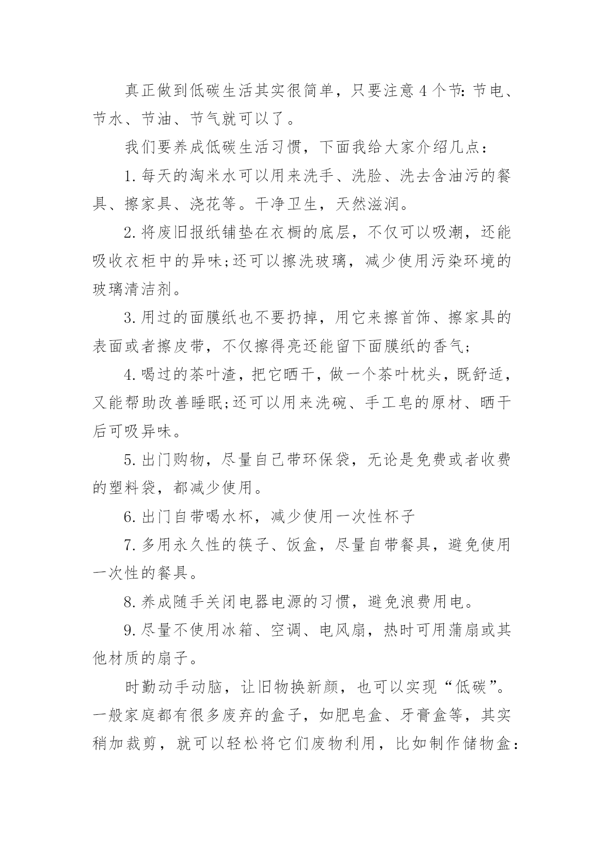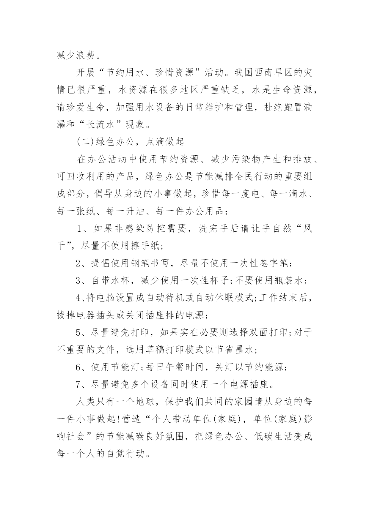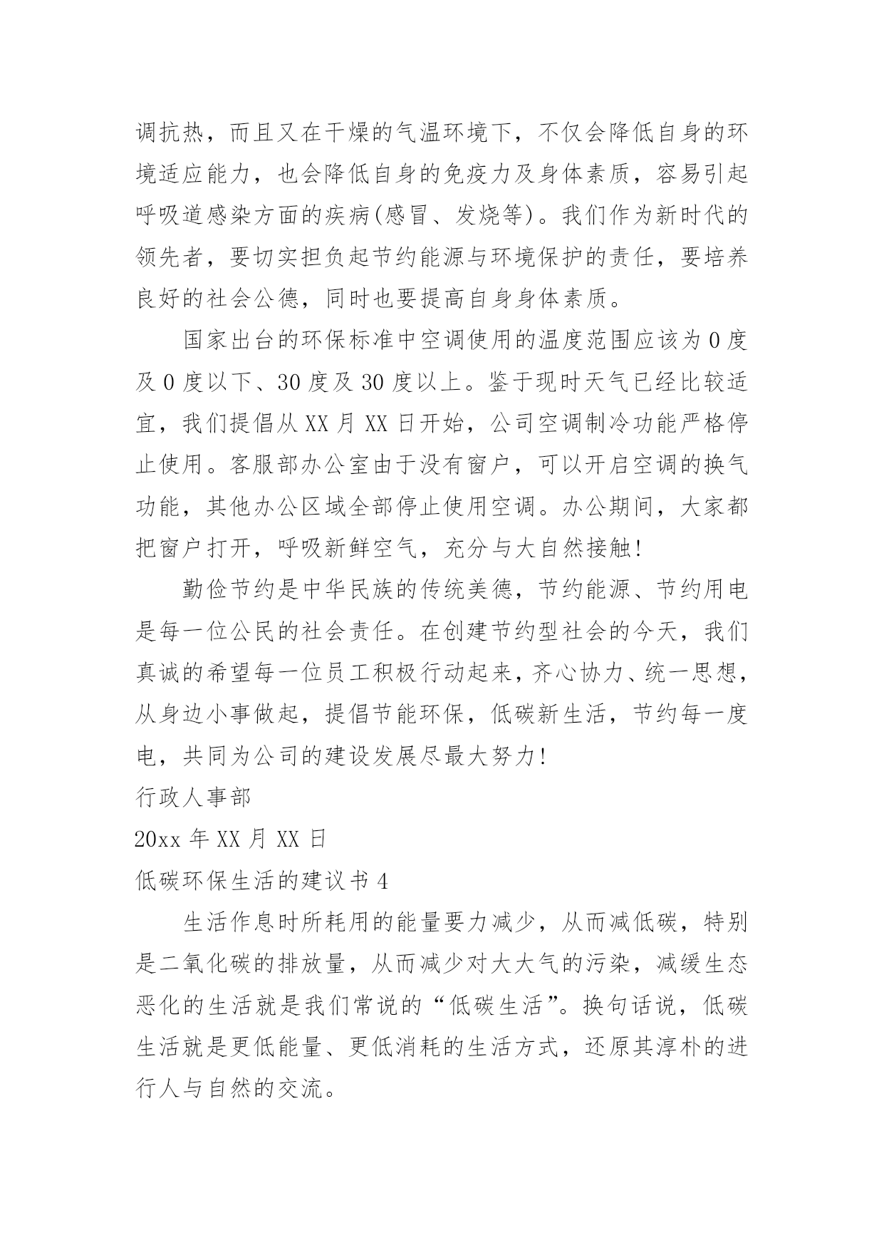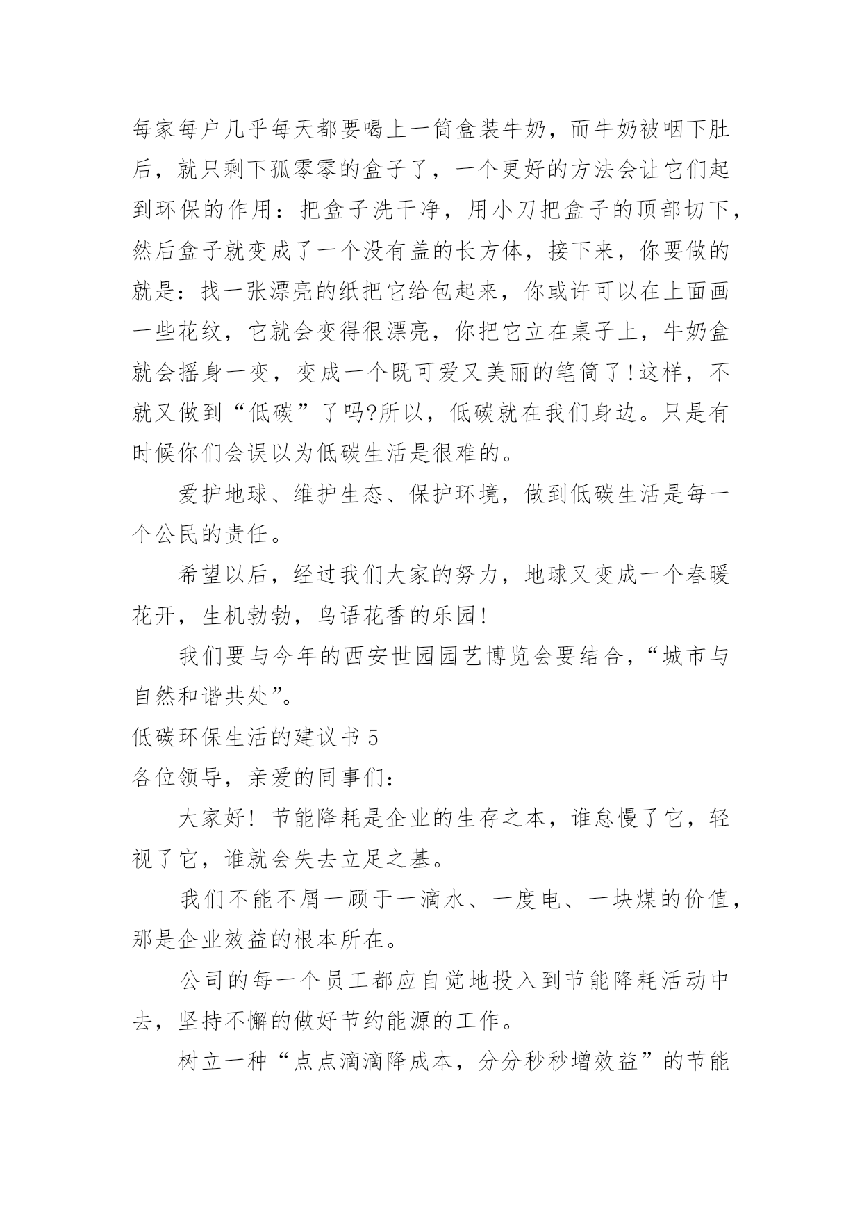 低碳环保生活的建议书低碳环保生活的建议书10篇在我们平凡的日常里,建议书与我们的生活息息相关,我们在写建议书时要分条列出建议的具体内容。来参考自己需要的建议书吧!下面是小编为大家收集的低碳环保生活的建议书,欢迎大家分享。低碳环保生活的建议书1尊敬的陈校长:您好!我们的学校美丽和谐,可是也有一些不良行为存在,浪费水就是其中一个。水是生命之源,生命之本。正是因为有了水,世上万物才能生存,世界才丰富多彩,千姿百态。水是多么重要啊!可是有些同学却随意浪费。经过观察,我发现了一些现象:有些同学经常大开水龙头,让水白花花地往外流;用完水后也不关紧水龙头,任由水龙头“哭泣”;有时上卫生间,常常能看到有些同学开着水玩耍,像过泼水节似的,把水乱泼,不仅仅使卫生间里一团糟,还浪费了宝贵的水资源。据统计,全国660座城市中有400多座城市缺水,三分之二的城市存在供水不足,全国城市年缺水量为60亿立方米左右,其中缺水比较严重的城市有110个。节水为荣——随时关上水龙头,别让水空流。在此,我提议:1、加强珍惜水资源的教育,让同学们明白水资源的宝贵。2、在水龙头旁边贴上有关“珍惜水资源”的警示语,提醒大家节俭用水。3、请同学们互相监督,珍惜水资源。4、进行水资源污染防治,实现水资源综合利用。5、提高水资源利用率,减少水资源浪费。有特殊情景时用水要向教师报告缺水的警钟已经敲响,水资源已越来越少,让我们快快行动起来,千万不要让我们的眼泪成为地球上的最终一滴水。为了我们的明天更完美,请珍惜水资源,节俭用水!低碳环保生活的建议书2环保局局长先生:您好!我是江城小学的一名学生。如今十分发达的地球,虽然环境情况看起来十分乐观,但是却有十分重大的隐患,这都是人为制造出来的。回想我们日常生活中,生活环境是十分重要的。但在日常生活中人们在保护环境上并不十分重视。比如说我们的周边环境。在我们区后面的草坪中,开着许多花朵。但在草坪中,却也有人扔垃圾,堆废纸。夏天,有许多蚊蝇在那里飞来飞去,不但影响了小区形象,还污染了环境。对社会,对我们的身体健康都很不利,还破坏了地球。在我们上学的路上,也有许队多同学乱丢废弃物。比如说:有的同学把小吃袋扔在校门口外,还有的同学把叠好的纸飞机随意乱扔。我认为,生态环境道德的基本要求是:热爱自然,保护生态,改善环境。对于我们青少年来说生态环境道德要求是:珍爱生灵,节约资源,抵制污染,植绿护绿。为了能让我们的环境优美,不受到伤害。有许多老人来打扫大街,绿化草坪。他们每天早出完归,为了祖国的绿化环境不惜一切代价。但那些不爱护环境的人偏偏还要去破坏,我们一定要为不爱护环境的人做好思想工作,让他们早一日改掉恶习。我们生活在同一片土地上,我们拥有着共同家原,保护我们的环境。大地期盼着绿色、河流期盼着绿色、,水鸟期盼着绿色、花儿期盼着绿色。滴水成川,积土成山,保护环境,从你我做起。唤醒“绿色之心”实施“绿色计划”。开展“绿色行动”,争做“绿色建设者,创建“绿色新世纪”!建议人:日期:低碳环保生活的建议书3亲爱的各位同事:踏进XX月份,随着浓浓的秋意的到来,天气越来越凉爽怡人。如果这时候在公司里有空调的不规范使用行为,不仅会浪费电力资源,而且也会在发电及制冷过程中制造双重废气,使得空气环境更加恶劣。同时,一个人过分的依赖空调抗热,而且又在干燥的气温环境下,不仅会降低自身的环境适应能力,也会降低自身的免疫力及身体素质,容易引起呼吸道感染方面的疾病(感冒、发烧等)。我们作为新时代的领先者,要切实担负起节约能源与环境保护的责任,要培养良好的社会公德,同时也要提高自身身体素质。国家出台的环保标准中空调使用的温度范围应该为0度及0度以下、30度及30度以上。鉴于现时天气已经比较适宜,我们提倡从XX月XX日开始,公司空调制冷功能严格停止使用。客服部办公室由于没有窗户,可以开启空调的换气功能,其他办公区域全部停止使用空调。办公期间,大家都把窗户打开,呼吸新鲜空气,充分与大自然接触!勤俭节约是中华民族的传统美德,节约能源、节约用电是每一位公民的社会责任。在创建节约型社会的今天,我们真诚的希望每一位员工积极行动起来,齐心协力、统一思想,从身边小事做起,提倡节能环保,低碳新生活,节约每一度电,共同为公司的建设发展尽最大努力!行政人事部20xx年XX月XX日低碳环保生活的建议书4生活作息时所耗用的能量要力减少,从而减低碳,特别是二氧化碳的排放量,从而减少对大大气的污染,减缓生态恶化的生活就是我们常说的“低碳生活”。换句话说,低碳生活就是更低能量、更低消耗的生活方式,还原其淳朴的进行人与自然的交流。真正做到低碳生活其实很简单,只要注意4个节:节电、节水、节油、节气就可以了。我们要养成低碳生活习惯,下面我给大家介绍几点:1.每天的淘米水可以用来洗手、洗脸、洗去含油污的餐具、擦家具、