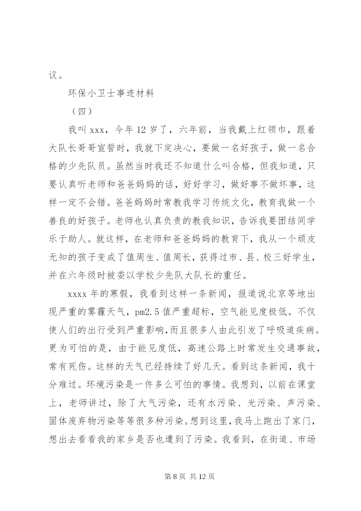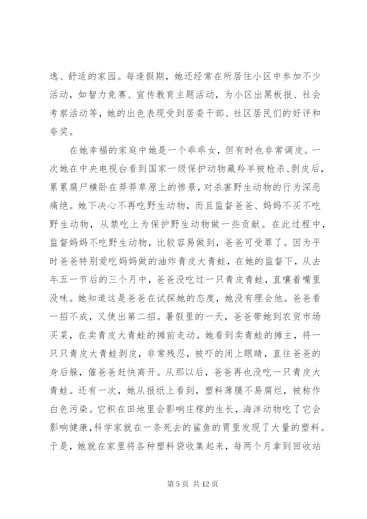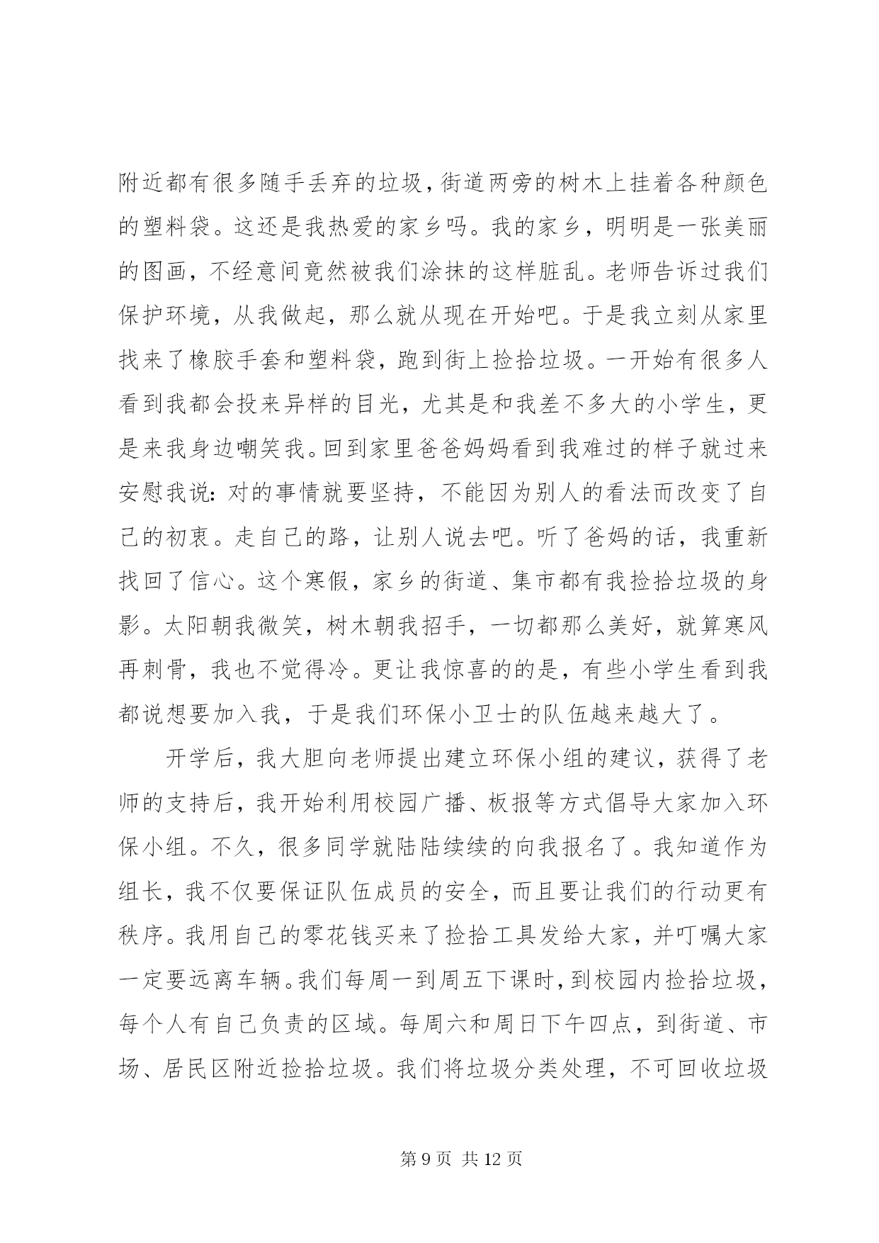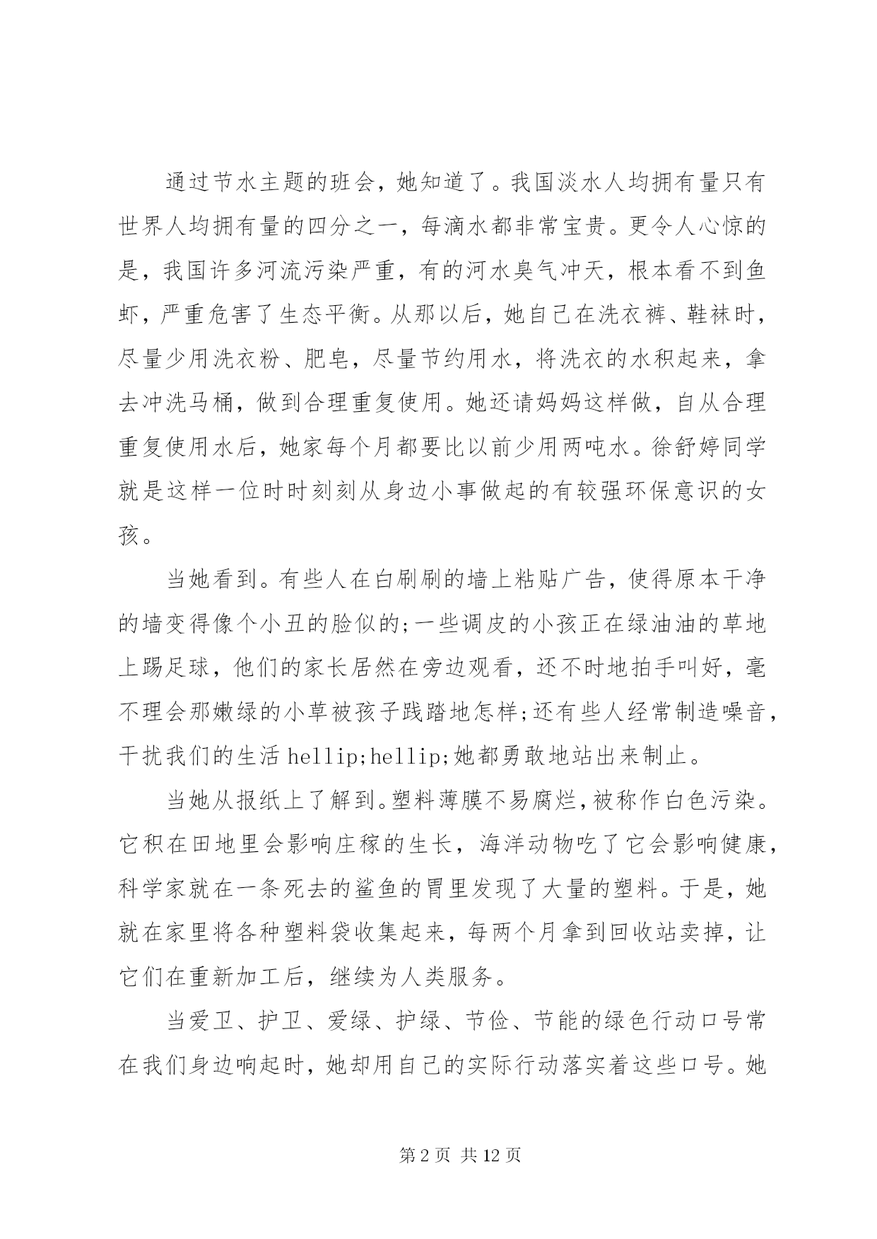 第PAGE\*Arabic\*MERGEFORMAT12页共NUMPAGES\*MERGEFORMAT12页环保小卫士事迹材料(一)她叫xxx,是我们四(3)班的副班长。认识她的人都说她是一个文静乖巧的女孩,是老师的得力小助手,是同学的好伙伴,同时也是我们班的的环保小卫士。每当她置身于美丽校园的时候,看见有同学从小卖部出来就将手上的包装纸随手乱扔,她会非常生气,非常难受。她生气的是个别同学不讲卫生,不讲文明;难受的是美丽的校园被污染了。她决心做环保小卫士。记得有一次,她看见一位小同学随地乱扔纸屑时,便走过去,严肃地制止了他,让他把纸屑捡起来丢在垃圾桶里。这时,有同学却认为她是多管闲事,可是做一个环保小卫士却在她心里扎了根。在她心目中,学校是她的家,保持学校的环境清洁就是她的责任和义务。心动不如行动,她一直做到时时严格要求自己。每天来到学校后,她会带领同学们一起打扫教室卫生。每次在清理教室前面的垃圾篓时,她告诉身边的小伙们这些纸片属可回收垃圾,可以把这些垃圾清理出来交给老师放到废纸袋里hellip;hellip;每次我们出去上体育课或去参加升旗仪式,她总会最后一个离开,因为她要检查一下教室的灯是不是已经关了。地上有了小纸片,她会弯下腰捡起;教室的窗户脏了,她会拿起抹布擦干净;身边的小伙们如果乱踩草坪,她会进行耐心地劝说hellip;hellip;通过节水主题的班会,她知道了。我国淡水人均拥有量只有世界人均拥有量的四分之一,每滴水都非常宝贵。更令人心惊的是,我国许多河流污染严重,有的河水臭气冲天,根本看不到鱼虾,严重危害了生态平衡。从那以后,她自己在洗衣裤、鞋袜时,尽量少用洗衣粉、肥皂,尽量节约用水,将洗衣的水积起来,拿去冲洗马桶,做到合理重复使用。她还请妈妈这样做,自从合理重复使用水后,她家每个月都要比以前少用两吨水。徐舒婷同学就是这样一位时时刻刻从身边小事做起的有较强环保意识的女孩。当她看到。有些人在白刷刷的墙上粘贴广告,使得原本干净的墙变得像个小丑的脸似的;一些调皮的小孩正在绿油油的草地上踢足球,他们的家长居然在旁边观看,还不时地拍手叫好,毫不理会那嫩绿的小草被孩子践踏地怎样;还有些人经常制造噪音,干扰我们的生活hellip;hellip;她都勇敢地站出来制止。当她从报纸上了解到。塑料薄膜不易腐烂,被称作白色污染。它积在田地里会影响庄稼的生长,海洋动物吃了它会影响健康,科学家就在一条死去的鲨鱼的胃里发现了大量的塑料。于是,她就在家里将各种塑料袋收集起来,每两个月拿到回收站卖掉,让它们在重新加工后,继续为人类服务。当爱卫、护卫、爱绿、护绿、节俭、节能的绿色行动口号常在我们身边响起时,她却用自己的实际行动落实着这些口号。她的行为也影响着我们班其他的同学,在她的带领下,越来越多的同学参与到环保行动中来了。相信在大家的努力下,我们的绿色家园会变得更加美好。环保小卫士事迹材料(二)我校于1999年被评为XX省绿色学校,在绿色学校建设中,每年我校开展我为校园增点绿添点美的活动。每班都有护绿区,有的学生种植花卉,美化教室和校园。有的学生把空易拉罐、雪碧瓶等做成花瓶、花篮等手工艺品来美化教室,在这些学生中你总是能够看到一个身影,那就是初一(1)班xx同学。每当她置身于美丽校园的时候,看见有同学从小卖部出来就将手上的包装纸随手乱扔,她会非常生气,非常难受。她生气的是个别同学不讲卫生,不讲文明;难受的是美丽的校园被污染了。她决心做环保小卫士。记得有一次,她看见一位小同学随地乱扔纸屑时,便走过去,严肃地制止了他,让他把纸屑捡起来丢在垃圾桶里。这时,有同学却认为她是多管闲事,可是做一个环保小卫士却在她心里扎了根。在她心目中,学校是她的家,保持学校的环境清洁就是她的责任和义务。心动不如行动,她一直做到时时严格要求自己,处处保持学校环境的清洁,不为学校的卫生检查而检查。我国淡水人均拥有量只有世界人均拥有量的四分之一,每滴水都非常宝贵。更令人心惊的是,我国许多河流污染严重,有的河水臭气冲天,根本看不到鱼虾,严重危害了生态平衡。当xx同学在地理课上、电视上知晓这些情况后,她自己在洗衣裤、鞋袜时,尽量少用洗衣粉、肥皂,尽量节约用水,将洗衣的水积起来,拿去冲洗马桶,做到合理重复使用。她还请妈妈这样做,自从合理重复使用水后,她家每个月都要比以前少用两吨水。xx同学就是这样一位时时刻刻从身边小事做起的有较强环保意识的女孩。如今的社会里,还有很多这样的人,瞧。有些人在白刷刷的墙上粘贴广告,使得原本干净的墙变得像个小丑的脸似的;一些调皮的小孩正在绿油油的草地上踢足球,他们的家长居然在旁边观看,还不时地拍手叫好,毫不理会那嫩绿的小草被孩子践踏地怎样;还有些人经常制造噪音,干扰我们的生活hellip;hellip;每每看到这些不讲文明的人,xx同