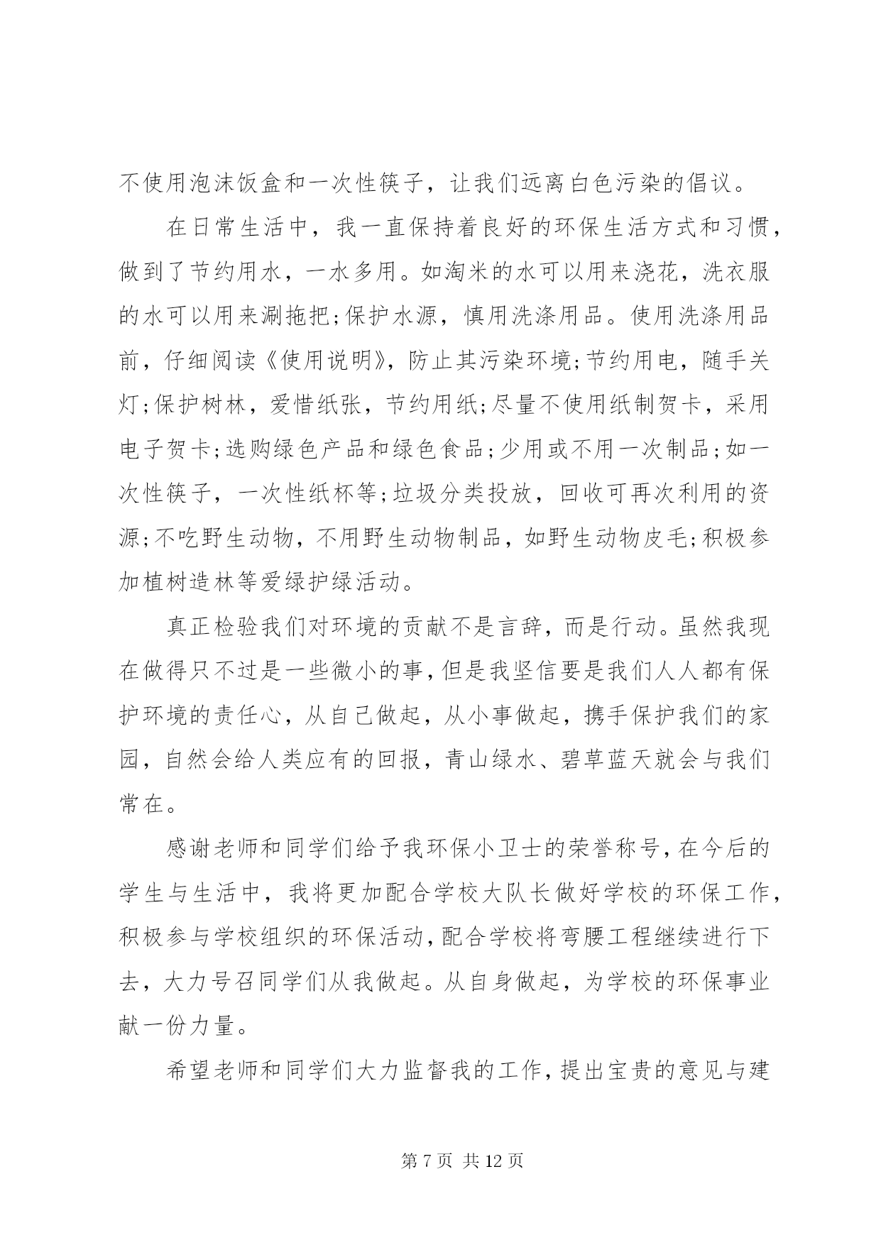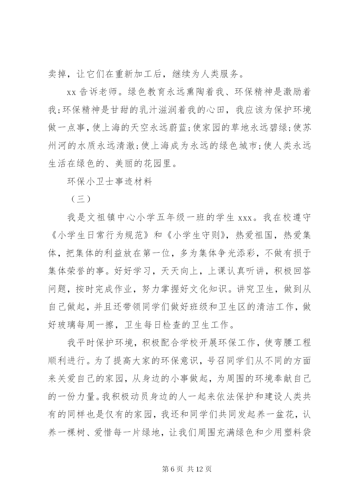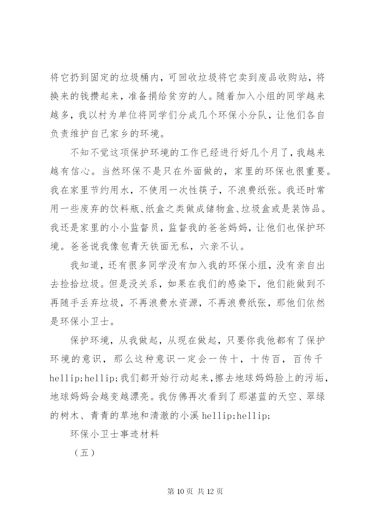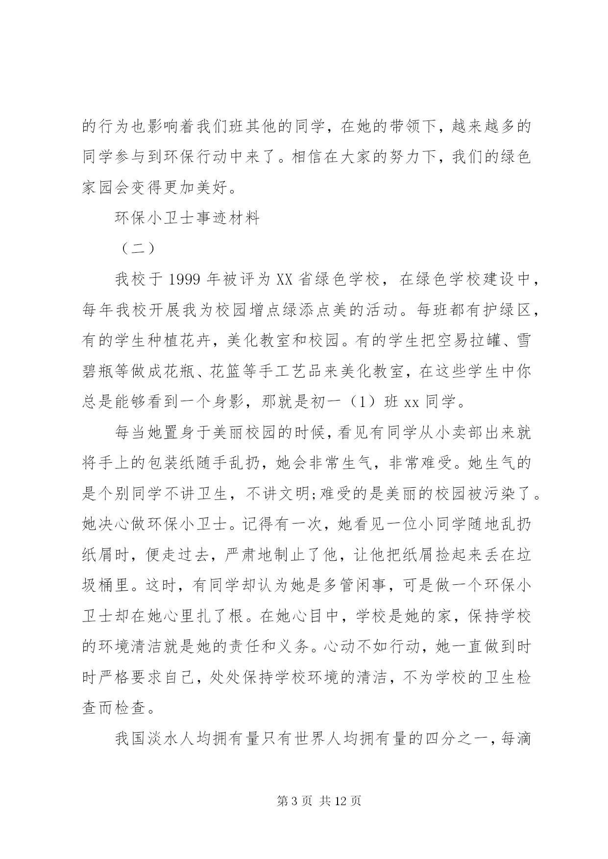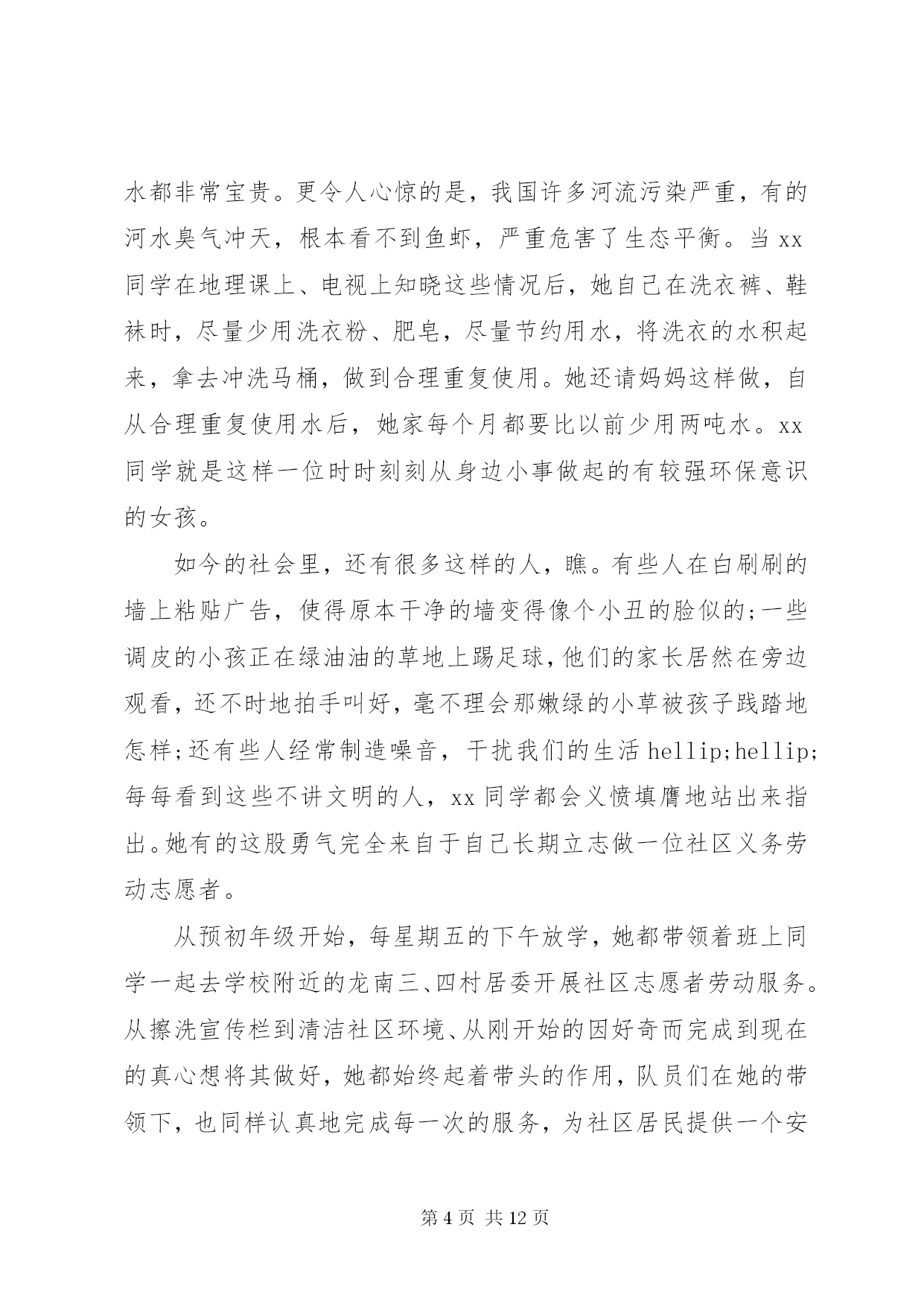 第PAGE\*Arabic\*MERGEFORMAT12页共NUMPAGES\*MERGEFORMAT12页环保小卫士事迹材料(一)她叫xxx,是我们四(3)班的副班长。认识她的人都说她是一个文静乖巧的女孩,是老师的得力小助手,是同学的好伙伴,同时也是我们班的的环保小卫士。每当她置身于美丽校园的时候,看见有同学从小卖部出来就将手上的包装纸随手乱扔,她会非常生气,非常难受。她生气的是个别同学不讲卫生,不讲文明;难受的是美丽的校园被污染了。她决心做环保小卫士。记得有一次,她看见一位小同学随地乱扔纸屑时,便走过去,严肃地制止了他,让他把纸屑捡起来丢在垃圾桶里。这时,有同学却认为她是多管闲事,可是做一个环保小卫士却在她心里扎了根。在她心目中,学校是她的家,保持学校的环境清洁就是她的责任和义务。心动不如行动,她一直做到时时严格要求自己。每天来到学校后,她会带领同学们一起打扫教室卫生。每次在清理教室前面的垃圾篓时,她告诉身边的小伙们这些纸片属可回收垃圾,可以把这些垃圾清理出来交给老师放到废纸袋里hellip;hellip;每次我们出去上体育课或去参加升旗仪式,她总会最后一个离开,因为她要检查一下教室的灯是不是已经关了。地上有了小纸片,她会弯下腰捡起;教室的窗户脏了,她会拿起抹布擦干净;身边的小伙们如果乱踩草坪,她会进行耐心地劝说hellip;hellip;通过节水主题的班会,她知道了。我国淡水人均拥有量只有世界人均拥有量的四分之一,每滴水都非常宝贵。更令人心惊的是,我国许多河流污染严重,有的河水臭气冲天,根本看不到鱼虾,严重危害了生态平衡。从那以后,她自己在洗衣裤、鞋袜时,尽量少用洗衣粉、肥皂,尽量节约用水,将洗衣的水积起来,拿去冲洗马桶,做到合理重复使用。她还请妈妈这样做,自从合理重复使用水后,她家每个月都要比以前少用两吨水。徐舒婷同学就是这样一位时时刻刻从身边小事做起的有较强环保意识的女孩。当她看到。有些人在白刷刷的墙上粘贴广告,使得原本干净的墙变得像个小丑的脸似的;一些调皮的小孩正在绿油油的草地上踢足球,他们的家长居然在旁边观看,还不时地拍手叫好,毫不理会那嫩绿的小草被孩子践踏地怎样;还有些人经常制造噪音,干扰我们的生活hellip;hellip;她都勇敢地站出来制止。当她从报纸上了解到。塑料薄膜不易腐烂,被称作白色污染。它积在田地里会影响庄稼的生长,海洋动物吃了它会影响健康,科学家就在一条死去的鲨鱼的胃里发现了大量的塑料。于是,她就在家里将各种塑料袋收集起来,每两个月拿到回收站卖掉,让它们在重新加工后,继续为人类服务。当爱卫、护卫、爱绿、护绿、节俭、节能的绿色行动口号常在我们身边响起时,她却用自己的实际行动落实着这些口号。她的行为也影响着我们班其他的同学,在她的带领下,越来越多的同学参与到环保行动中来了。相信在大家的努力下,我们的绿色家园会变得更加美好。环保小卫士事迹材料(二)我校于1999年被评为XX省绿色学校,在绿色学校建设中,每年我校开展我为校园增点绿添点美的活动。每班都有护绿区,有的学生种植花卉,美化教室和校园。有的学生把空易拉罐、雪碧瓶等做成花瓶、花篮等手工艺品来美化教室,在这些学生中你总是能够看到一个身影,那就是初一(1)班xx同学。每当她置身于美丽校园的时候,看见有同学从小卖部出来就将手上的包装纸随手乱扔,她会非常生气,非常难受。她生气的是个别同学不讲卫生,不讲文明;难受的是美丽的校园被污染了。她决心做环保小卫士。记得有一次,她看见一位小同学随地乱扔纸屑时,便走过去,严肃地制止了他,让他把纸屑捡起来丢在垃圾桶里。这时,有同学却认为她是多管闲事,可是做一个环保小卫士却在她心里扎了根。在她心目中,学校是她的家,保持学校的环境清洁就是她的责任和义务。心动不如行动,她一直做到时时严格要求自己,处处保持学校环境的清洁,不为学校的卫生检查而检查。我国淡水人均拥有量只有世界人均拥有量的四分之一,每滴水都非常宝贵。更令人心惊的是,我国许多河流污染严重,有的河水臭气冲天,根本看不到鱼虾,严重危害了生态平衡。当xx同学在地理课上、电视上知晓这些情况后,她自己在洗衣裤、鞋袜时,尽量少用洗衣粉、肥皂,尽量节约用水,将洗衣的水积起来,拿去冲洗马桶,做到合理重复使用。她还请妈妈这样做,自从合理重复使用水后,她家每个月都要比以前少用两吨水。xx同学就是这样一位时时刻刻从身边小事做起的有较强环保意识的女孩。如今的社会里,还有很多这样的人,瞧。有些人在白刷刷的墙上粘贴广告,使得原本干净的墙变得像个小丑的脸似的;一些调皮的小孩正在绿油油的草地上踢足球,他们的家长居然在旁边观看,还不时地拍手叫好,毫不理会那嫩绿的小草被孩子践踏地怎样;还有些人经常制造噪音,干扰我们的生活hellip;hellip;每每看到这些不讲文明的人,xx同
